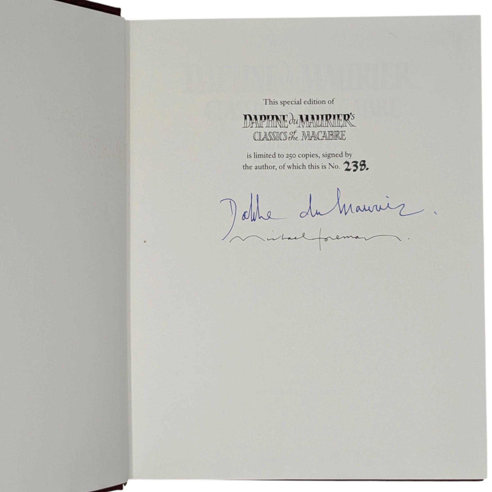 DU MAURIER, Daphne. Classics of the Macabre. London: Victor Gollancz, 1987. Illustrated with numerous colour plates by Michael Foreman. Special, limited, hand-numbered edition, one of 250 copies, this being copy number 238. Signed by both the author and illustrator.