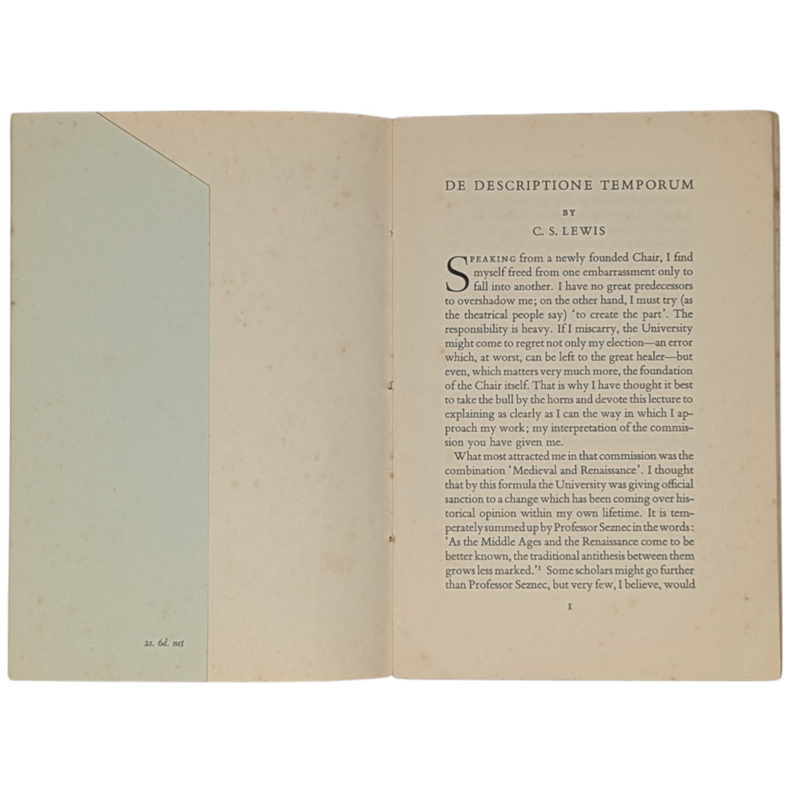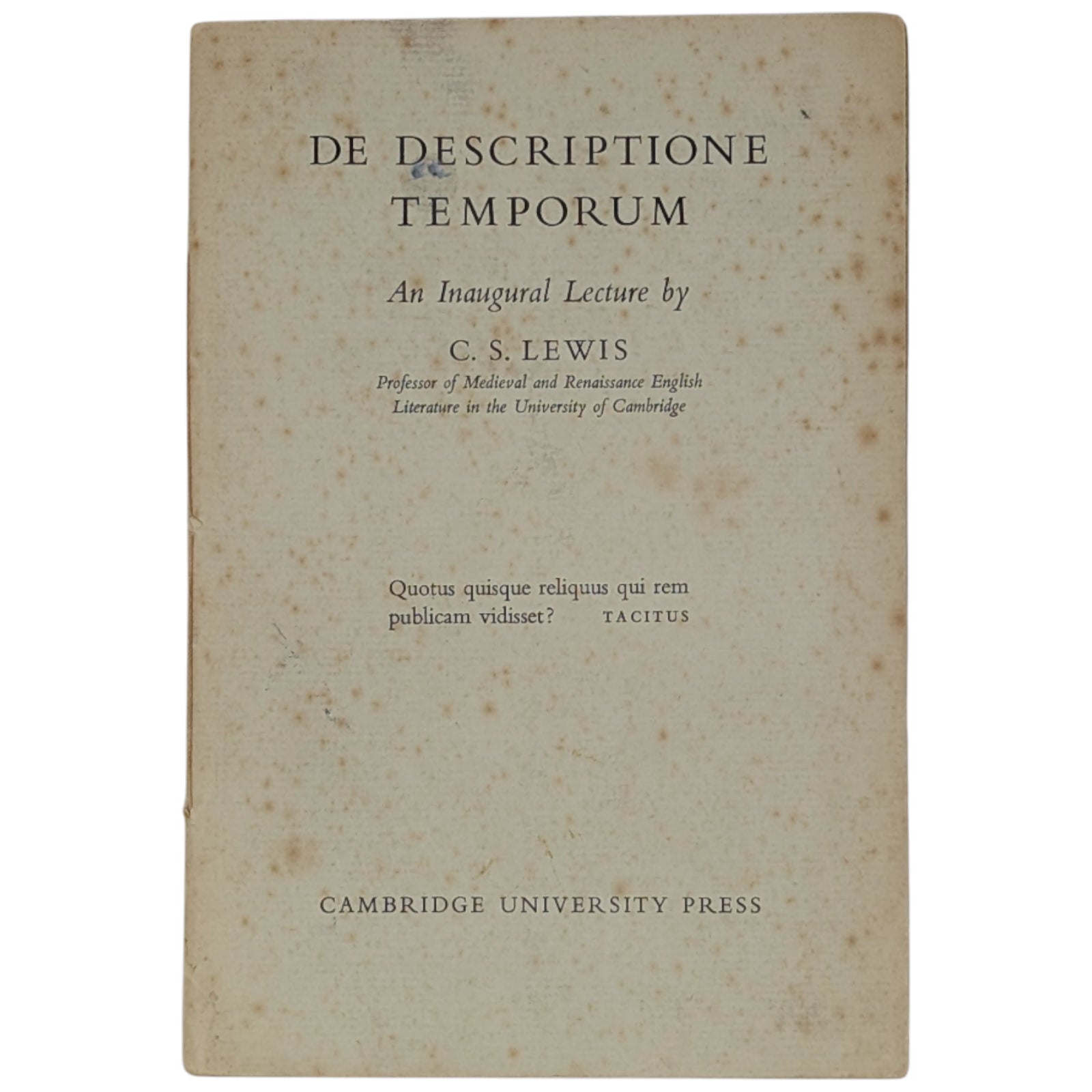 LEWIS, C. S. De Descriptione Temporum - An Inaugural Lecture. Cambridge: Cambridge University Press, 1955. First edition, first printing of the author's inaugural lecture delivered at Cambridge University on 29th November 1954 (his 56th birthday), following his award of the newly founded chair of Medieval and Renaissance Literature.