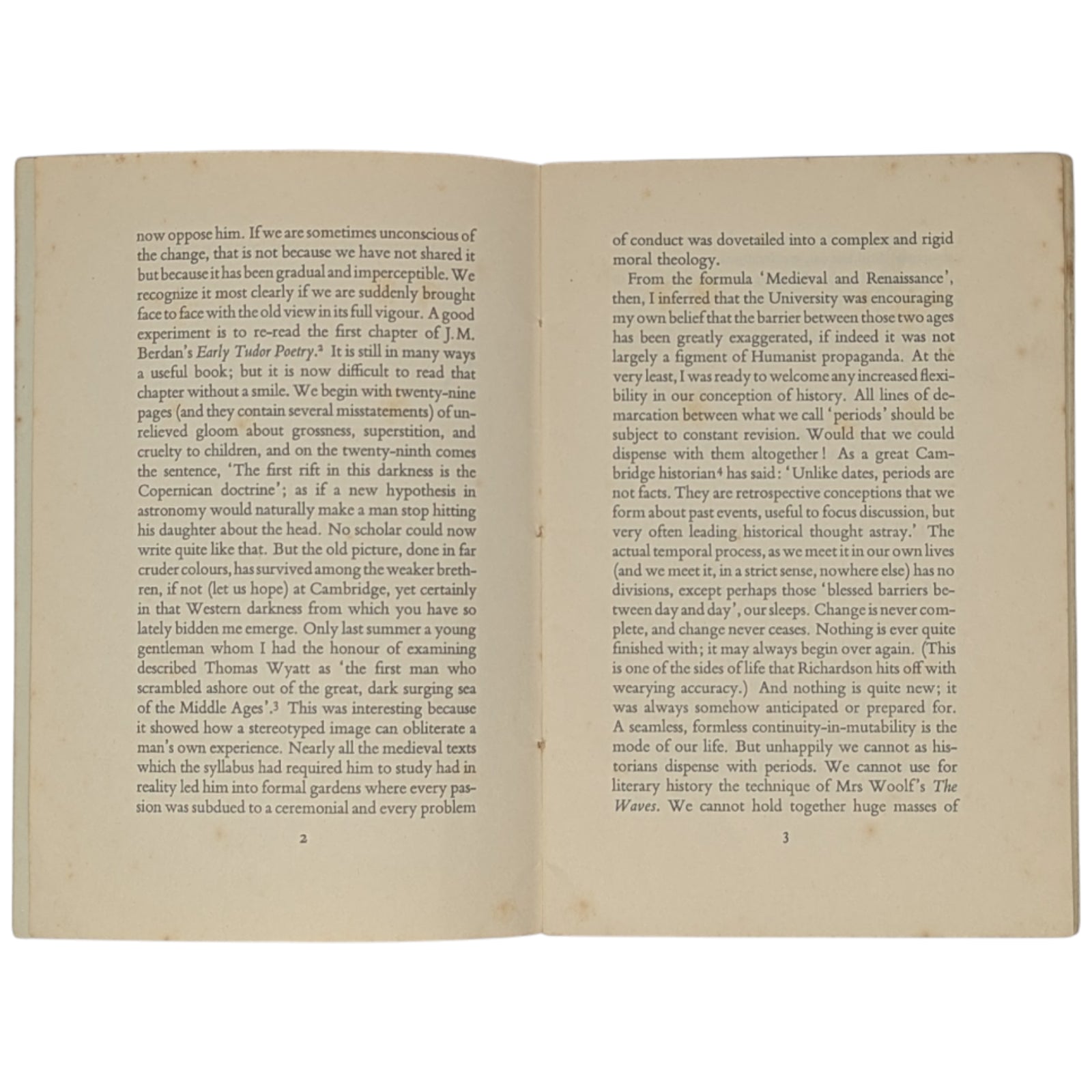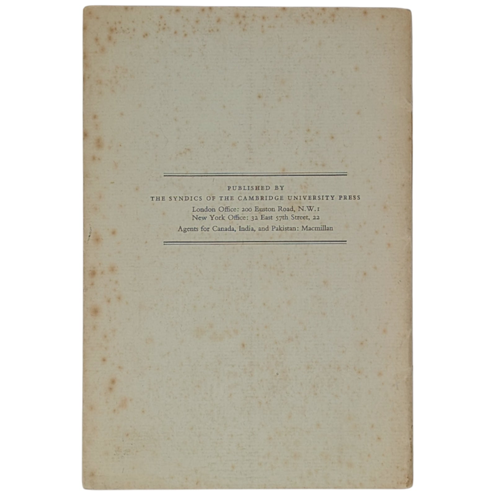 Soft cover pamphlet, 18.3 x 12.5 cm, 22 numbered pages sewn into plain wrappers with an integral, unclipped (2s. 6d. net) dust wrapper. Heavier foxing externally, particularly to outer wrapper, a few minor ink stains to front, a few ear marks and shallow creases; complete with text legible.