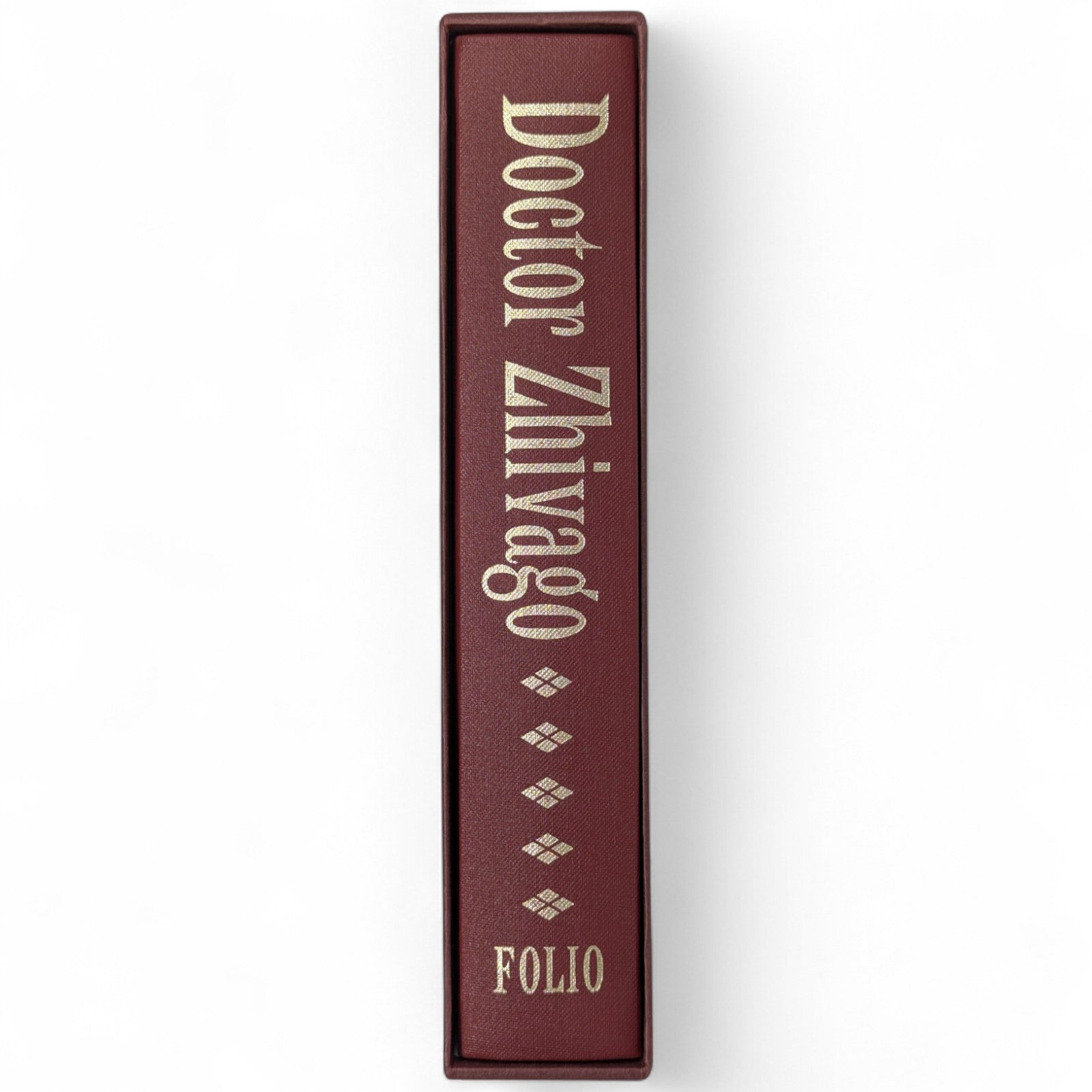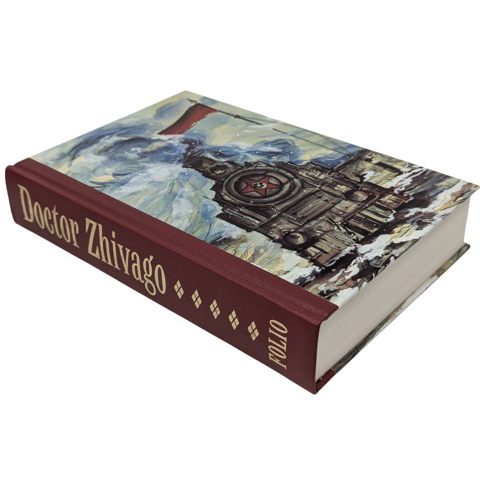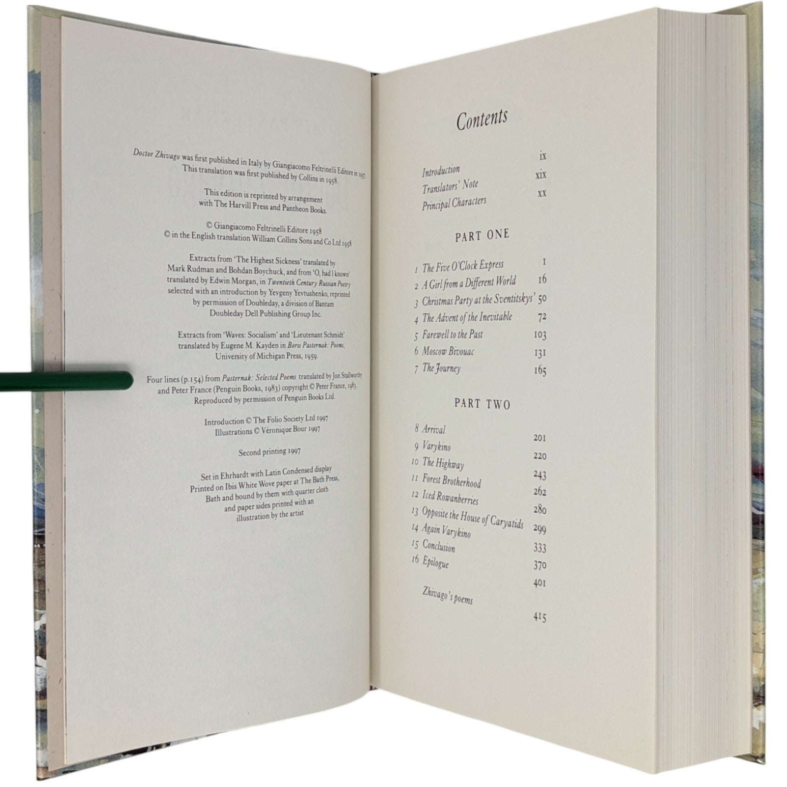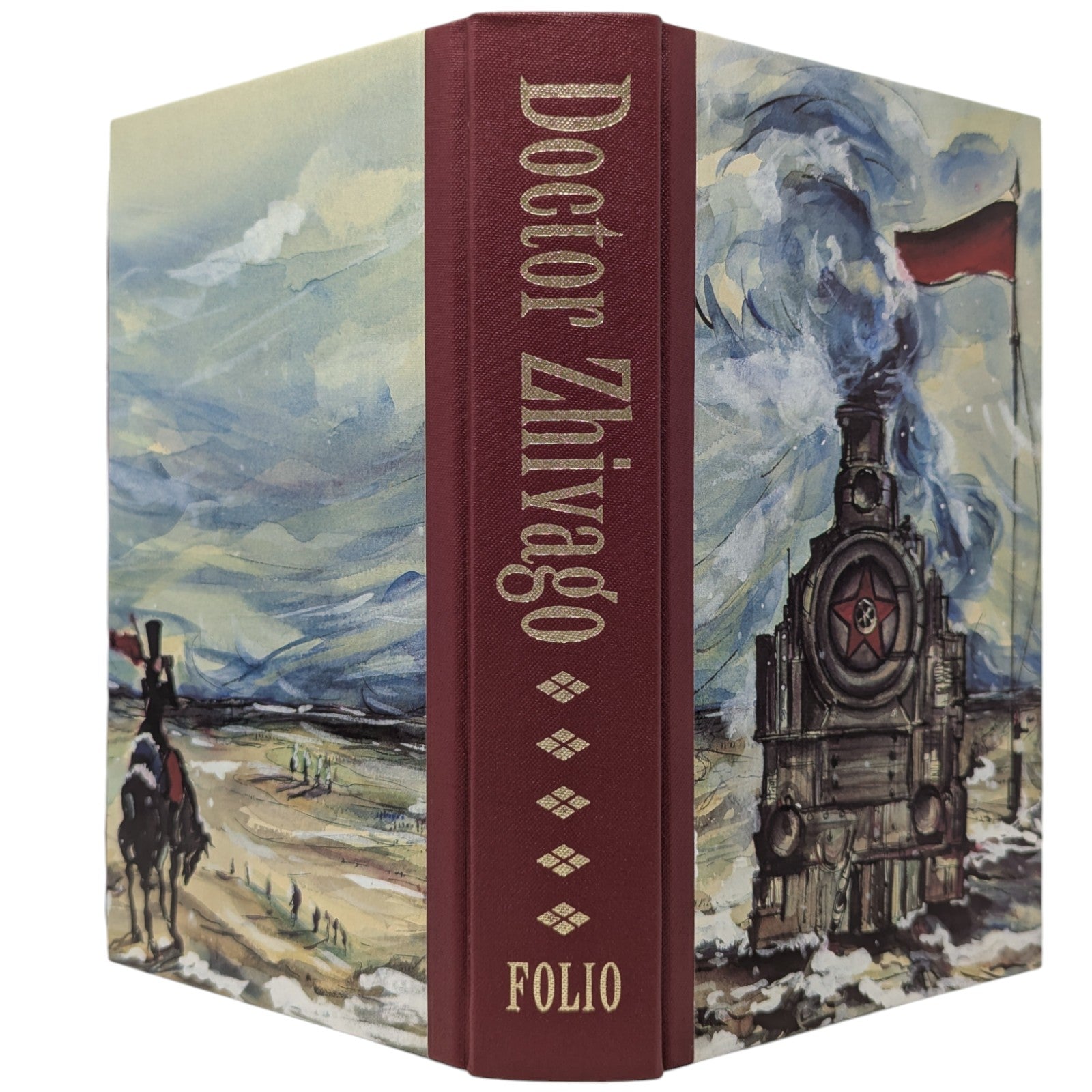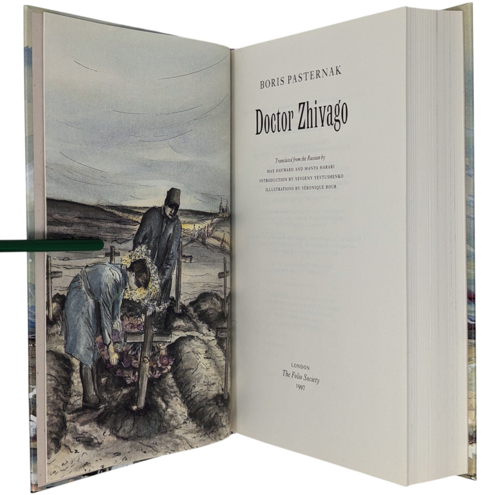 Boris Pasternak, Doctor Zhivago. London: The Folio Society, 1997. Second printing thus, 1997. Translated from the Russian by Max Hayward and Manya Harari, introduction by Yevgeny Yevtushenko, illustrations by Véronique Bour. 239 × 165 × 44 mm. Pp. [i–viii] ix–xx, 1–460: [9] leaves of colour plates (facing p. [iii] and between pp. 36–37, 68–69, 100–101, 180–181, 244–245, 292–293, 356–357 and 388–389). Type: Ehrhardt with Latin Condensed for display. Printed by the Saint Edmundsbury Press. Bound by Hunter and Foulis in quarter dark red cloth, embossed white paper boards with a design in colour by Bour; grey-brown flecked endleaves. Dark red slip case. All the plates except for the frontispiece are double-page. Part of the edition was later issued as one of the Great Russian novels.