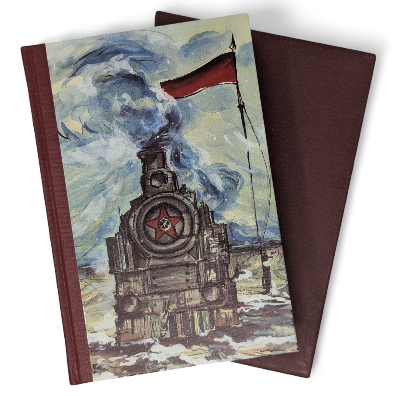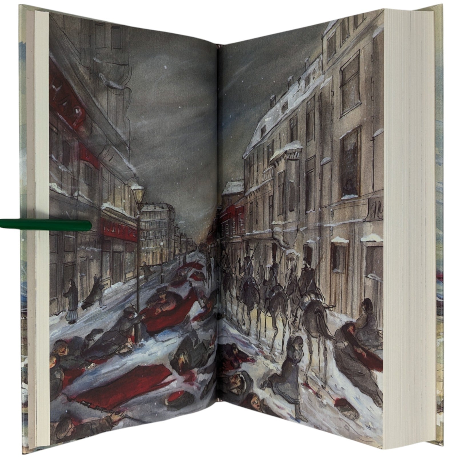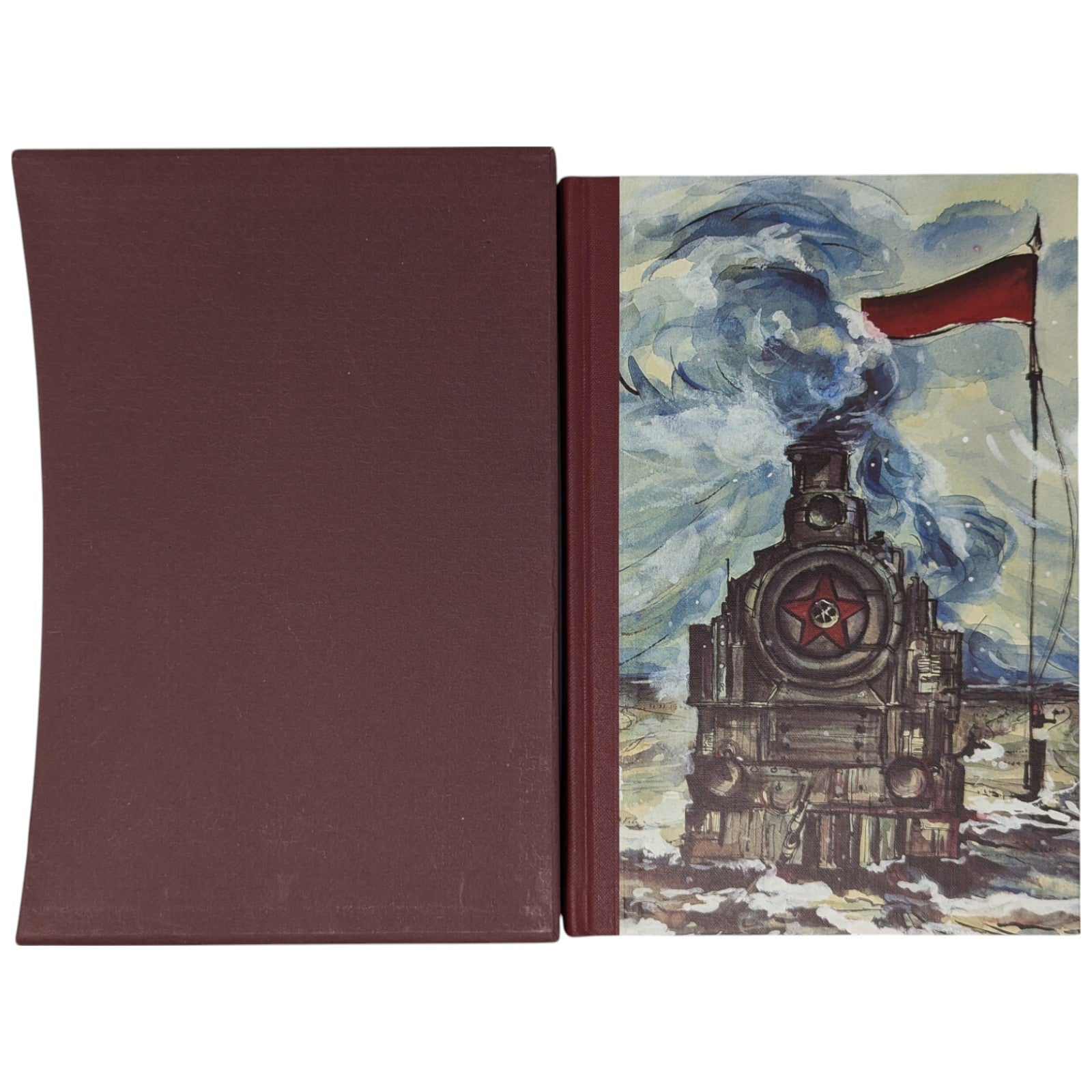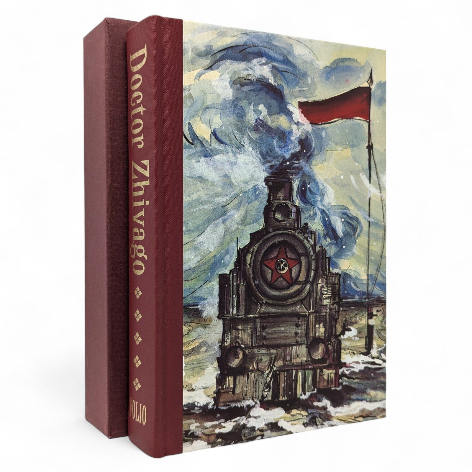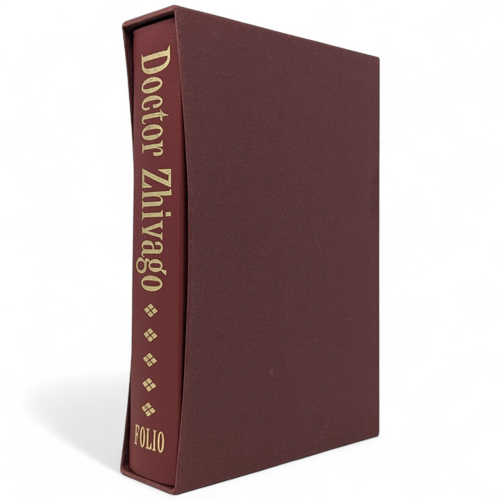 Boris Pasternak, Doctor Zhivago. London: The Folio Society, 1997. Second printing thus, 1997. Translated from the Russian by Max Hayward and Manya Harari, introduction by Yevgeny Yevtushenko, illustrations by Véronique Bour. 239 × 165 × 44 mm. Pp. [i–viii] ix–xx, 1–460: [9] leaves of colour plates (facing p. [iii] and between pp. 36–37, 68–69, 100–101, 180–181, 244–245, 292–293, 356–357 and 388–389). Type: Ehrhardt with Latin Condensed for display. Printed by the Saint Edmundsbury Press. Bound by Hunter and Foulis in quarter dark red cloth, embossed white paper boards with a design in colour by Bour; grey-brown flecked endleaves. Dark red slip case. All the plates except for the frontispiece are double-page. Part of the edition was later issued as one of the Great Russian novels.