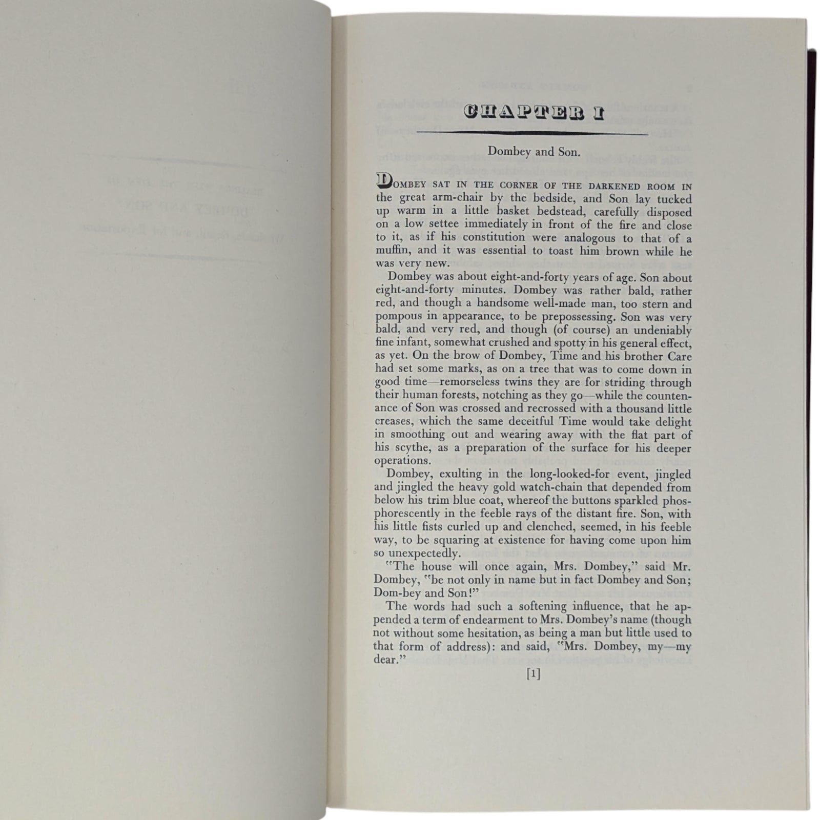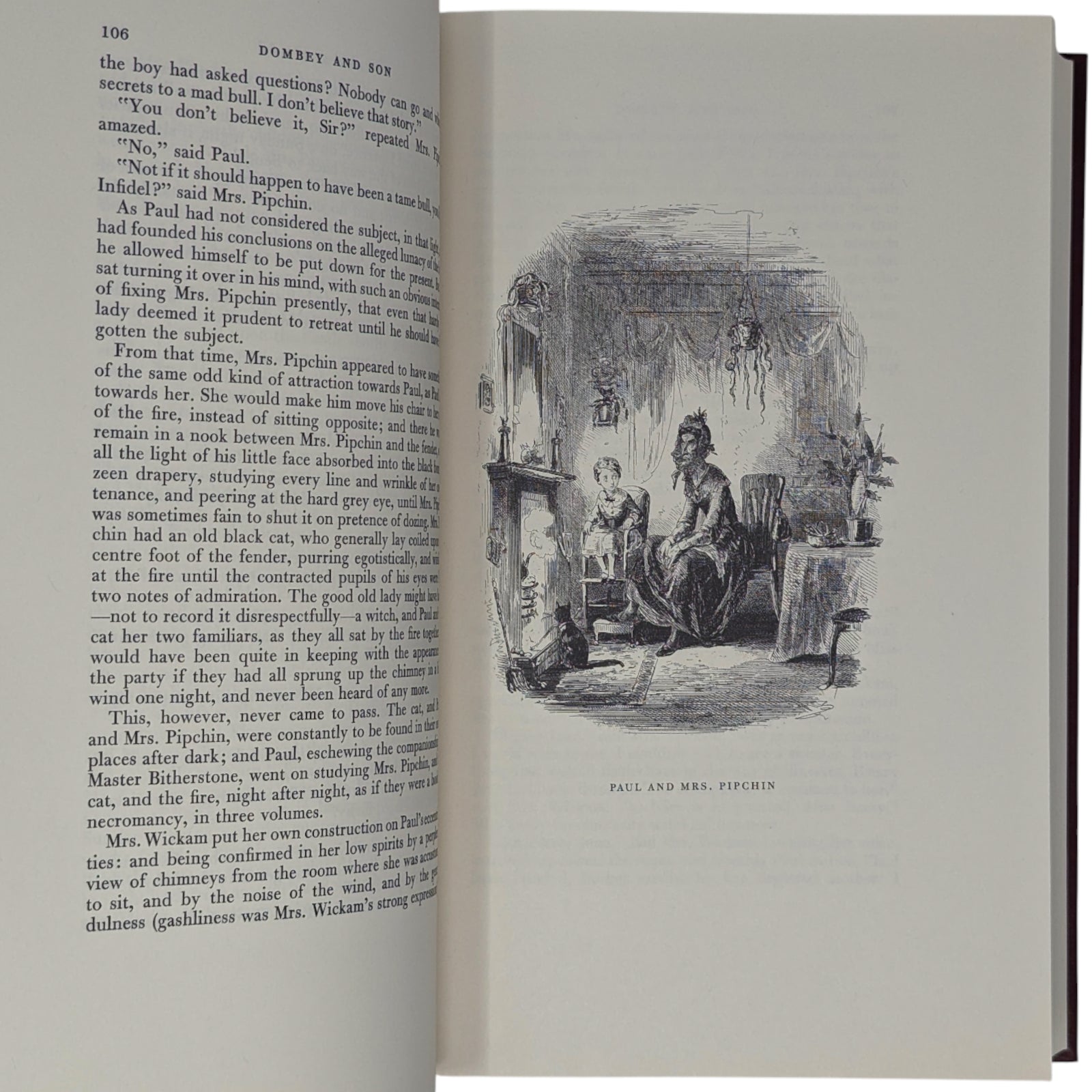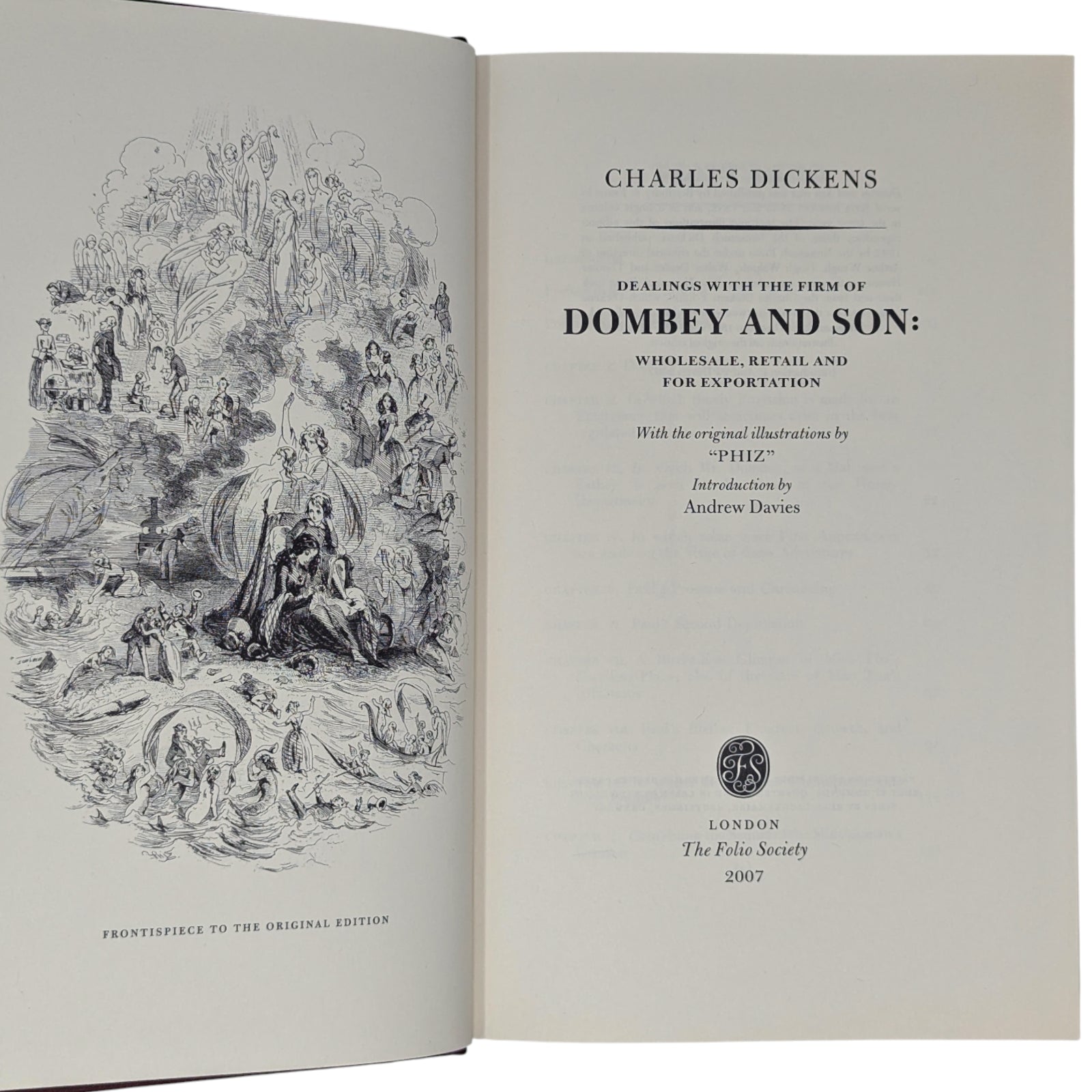 Charles Dickens, Dealings with the Firm of Dombey and Son: Wholesale, Retail and for Exportation. London: The Folio Society, [2007]. With the original illustrations by “Phiz” [Hablot K. Browne], introduction by Andrew Davies. 261 × 170 × 57 mm. Pp. [1–2], [i–iv] v–xxi [xxii–xxiv], 1–880 [881–882]: [38] leaves of ‘plates’. Type: Bulmer with Verdi for display. Typeset by R. and R. Clark for the Nonesuch Press in 1937 (the preliminaries by Folio), printed by the Saint Edmundsbury Press. Bound by Real Lachenmaier in series binding.