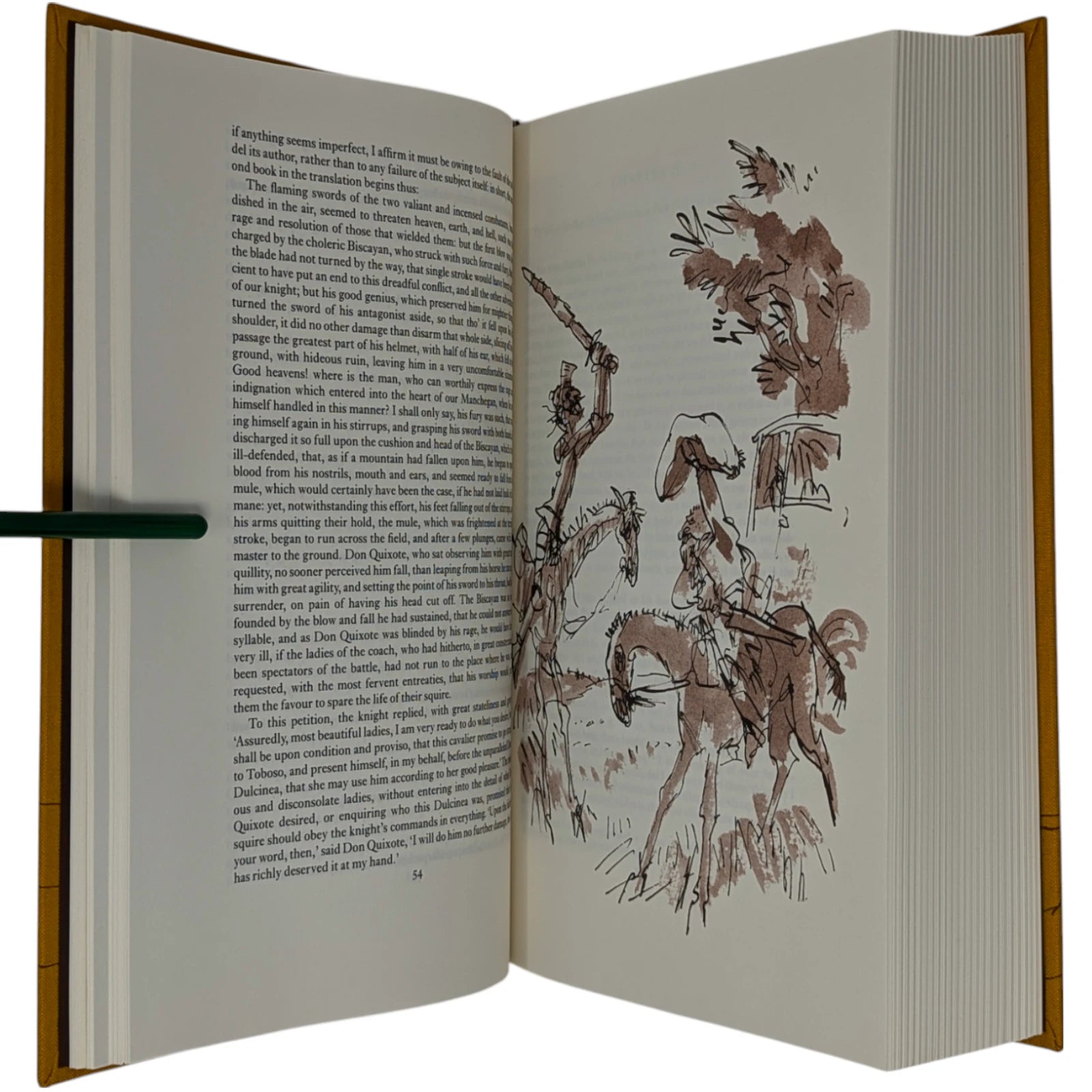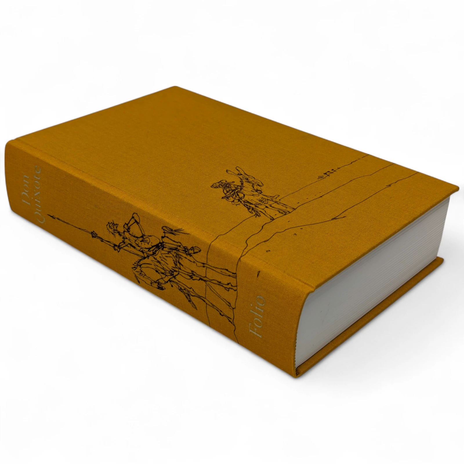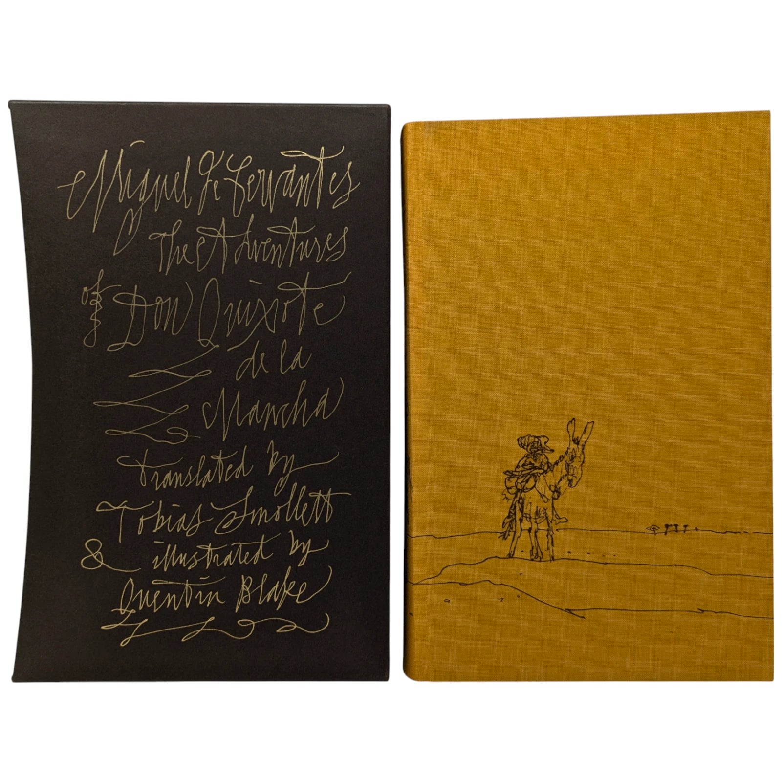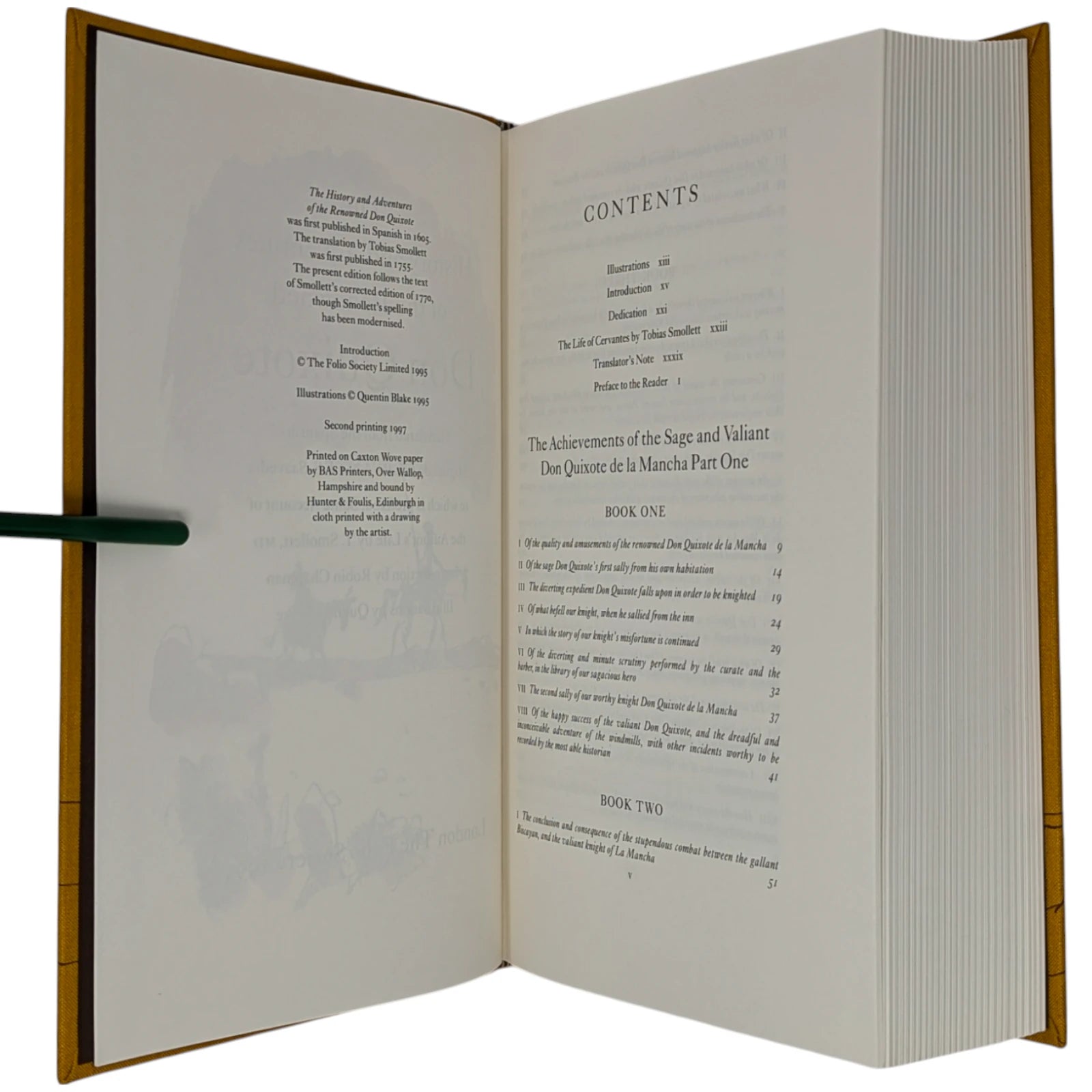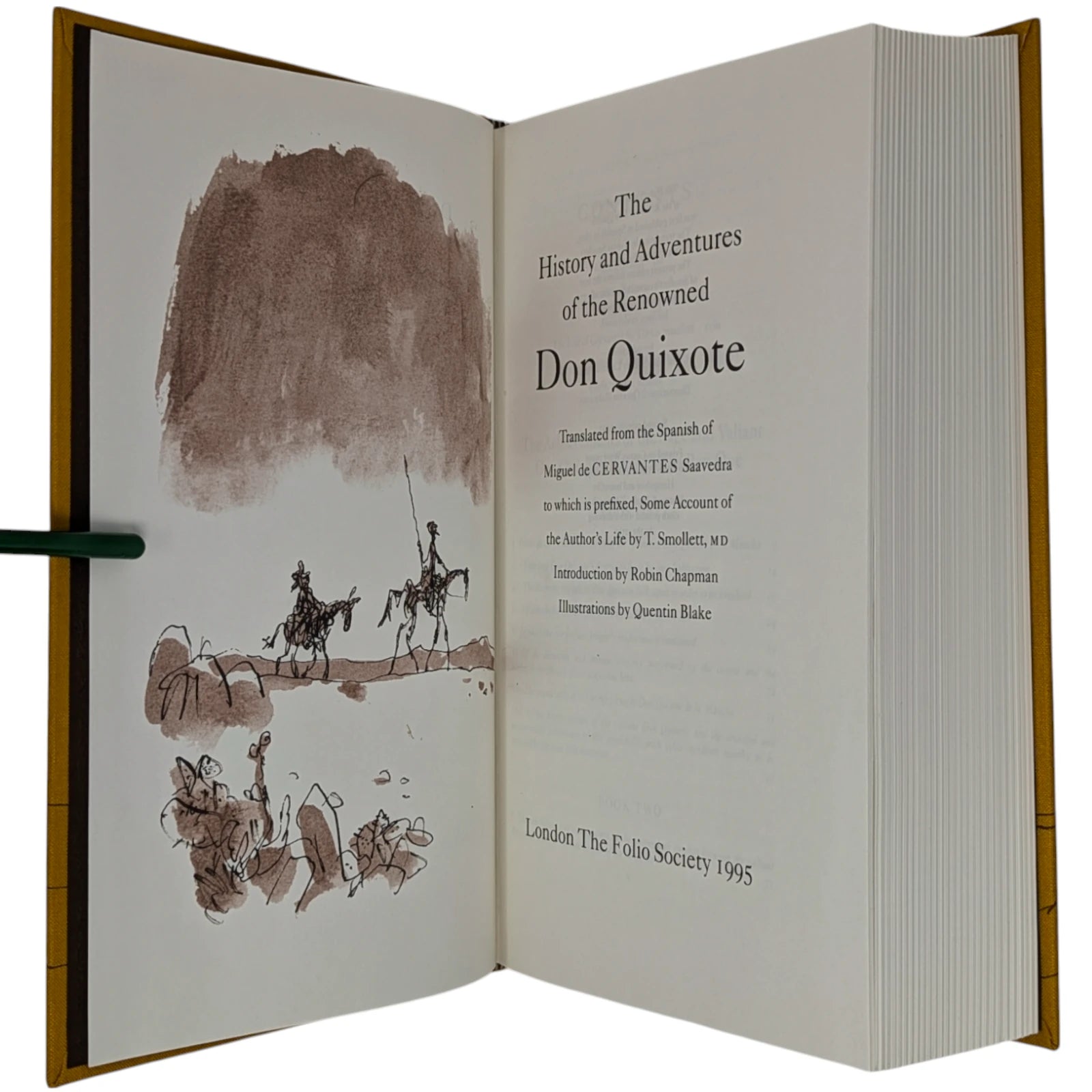 The History and Adventures of the Renowned Don Quixote, Miguel de Cervantes Saavedra. London: The Folio Society, 1995. Second printing, 1997. Translated from the Spanish of Miguel de Cervantes Saavedra, to which is prefixed, some account of the author’s life, by T. Smollett MD, introduction by Robin Chapman, illustrations by Quentin Blake. 252 × 162 × 52 mm. Pp. [1–2], [i–iv] v–xxxix [xl], 1–768 [769–774]: [16] leaves of two-colour ‘plates’. Type: Ehrhardt. Printed and bound by Cambridge University Press. Full yellow cloth with a design in dark brown by Blake; dark brown endleaves. Dark brown slip case with lettering in gold by Blake.