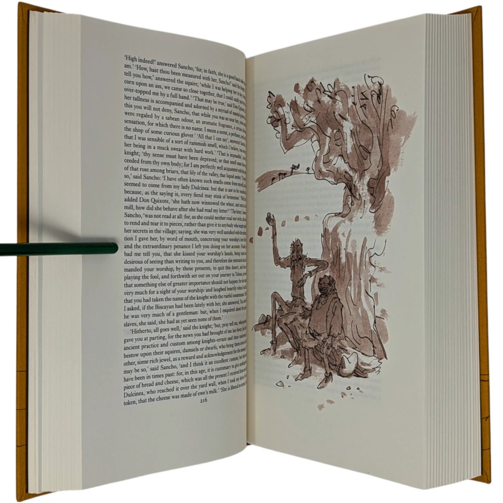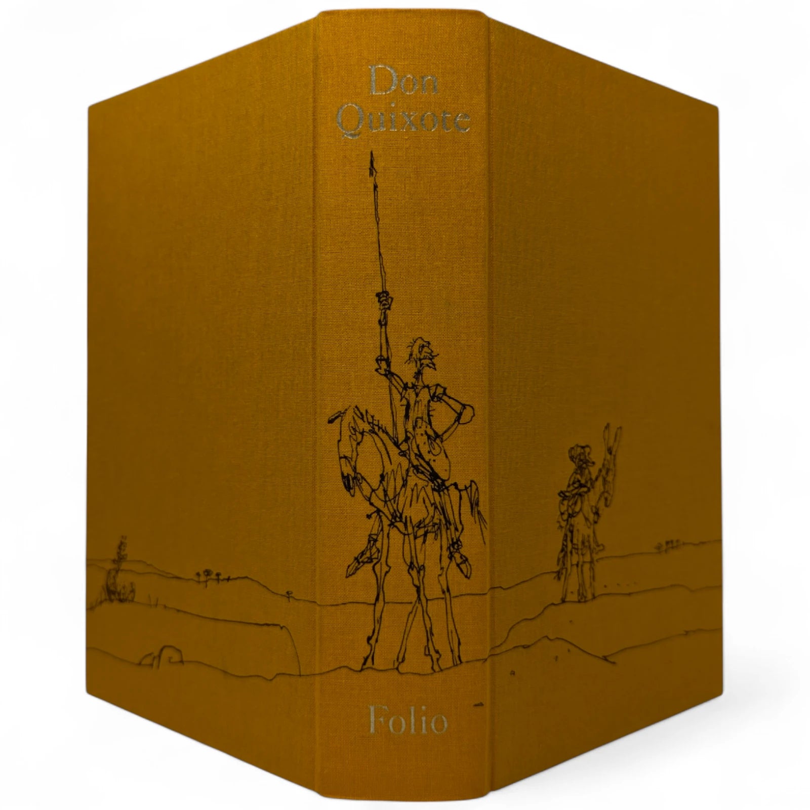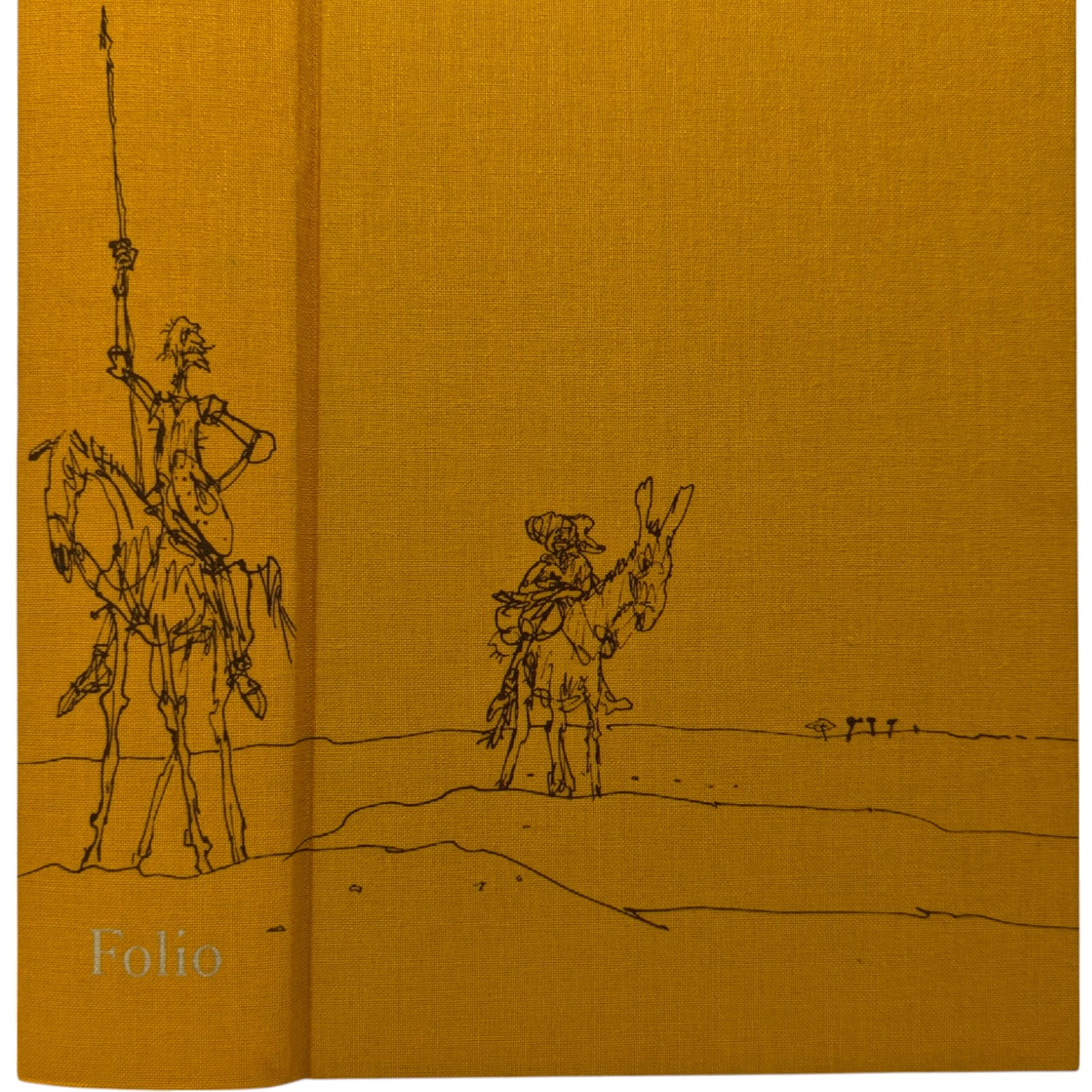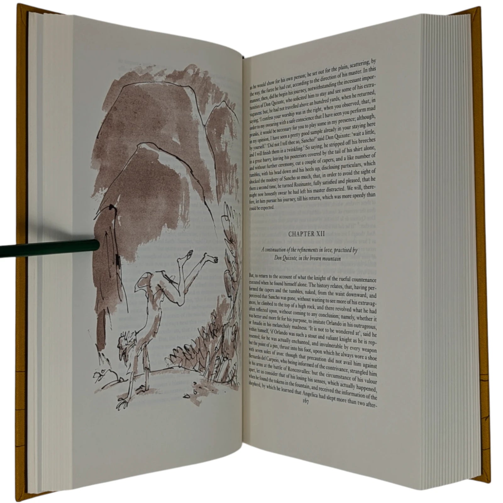 The History and Adventures of the Renowned Don Quixote, Miguel de Cervantes Saavedra. London: The Folio Society, 1995. Second printing, 1997. Translated from the Spanish of Miguel de Cervantes Saavedra, to which is prefixed, some account of the author’s life, by T. Smollett MD, introduction by Robin Chapman, illustrations by Quentin Blake. 252 × 162 × 52 mm. Pp. [1–2], [i–iv] v–xxxix [xl], 1–768 [769–774]: [16] leaves of two-colour ‘plates’. Type: Ehrhardt. Printed and bound by Cambridge University Press. Full yellow cloth with a design in dark brown by Blake; dark brown endleaves. Dark brown slip case with lettering in gold by Blake.