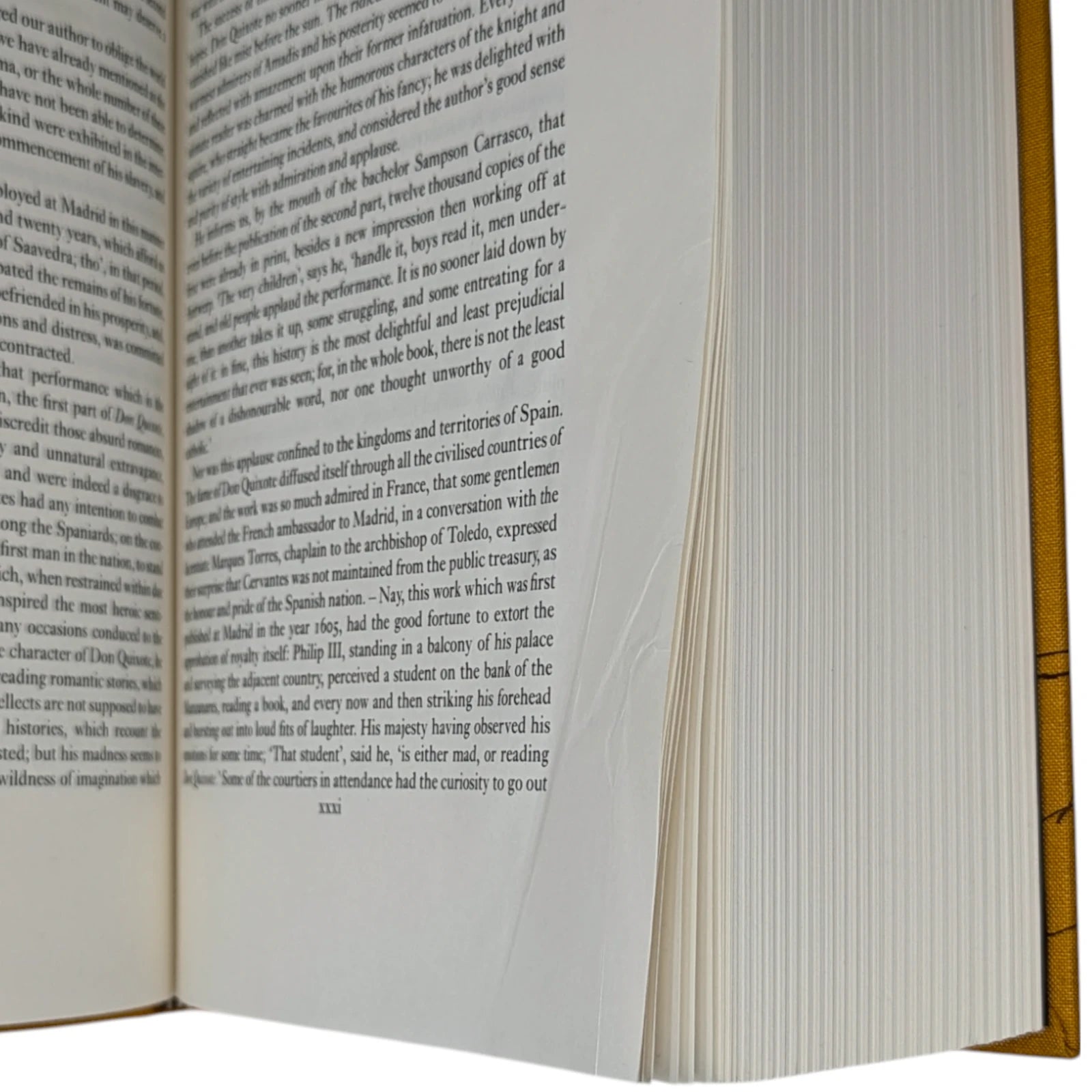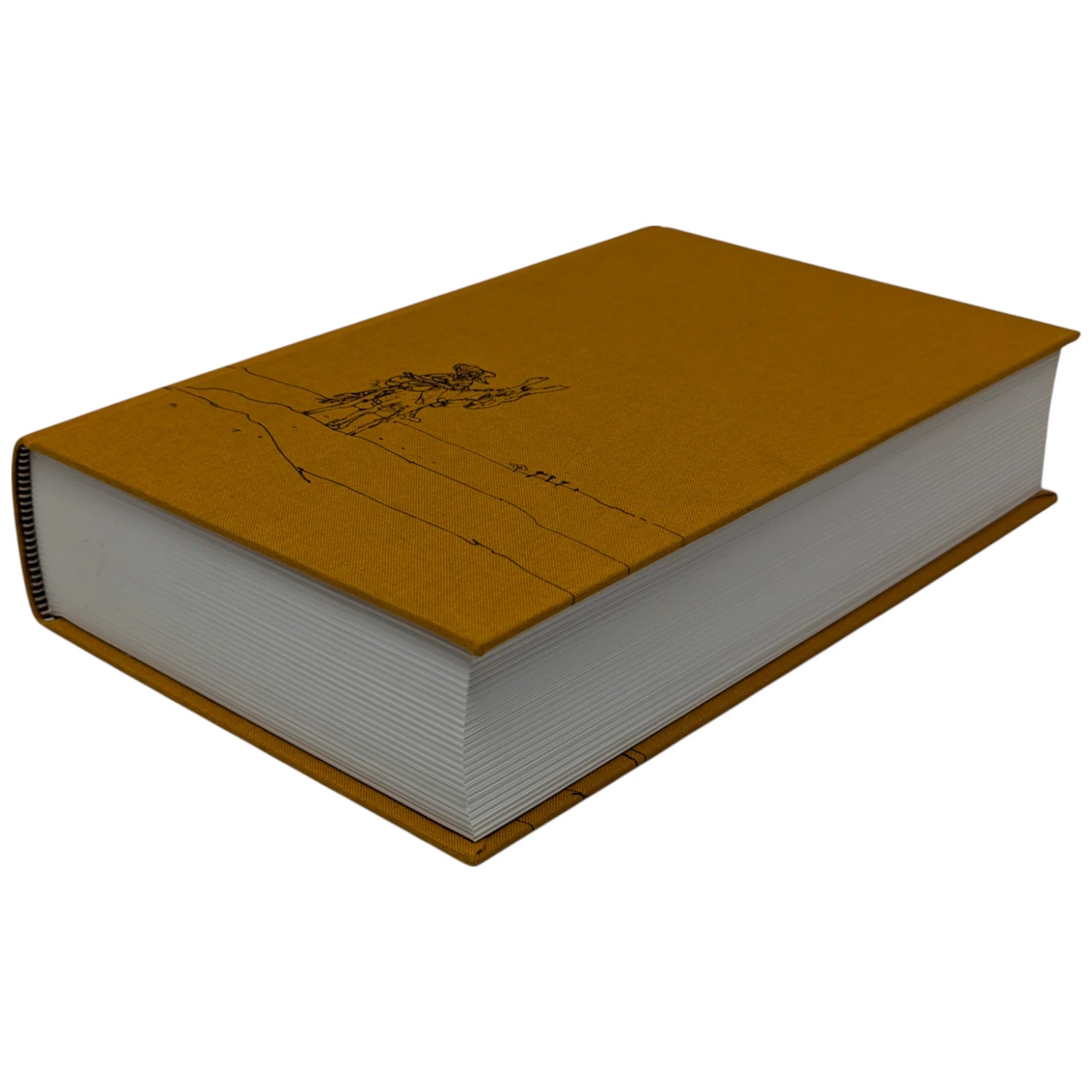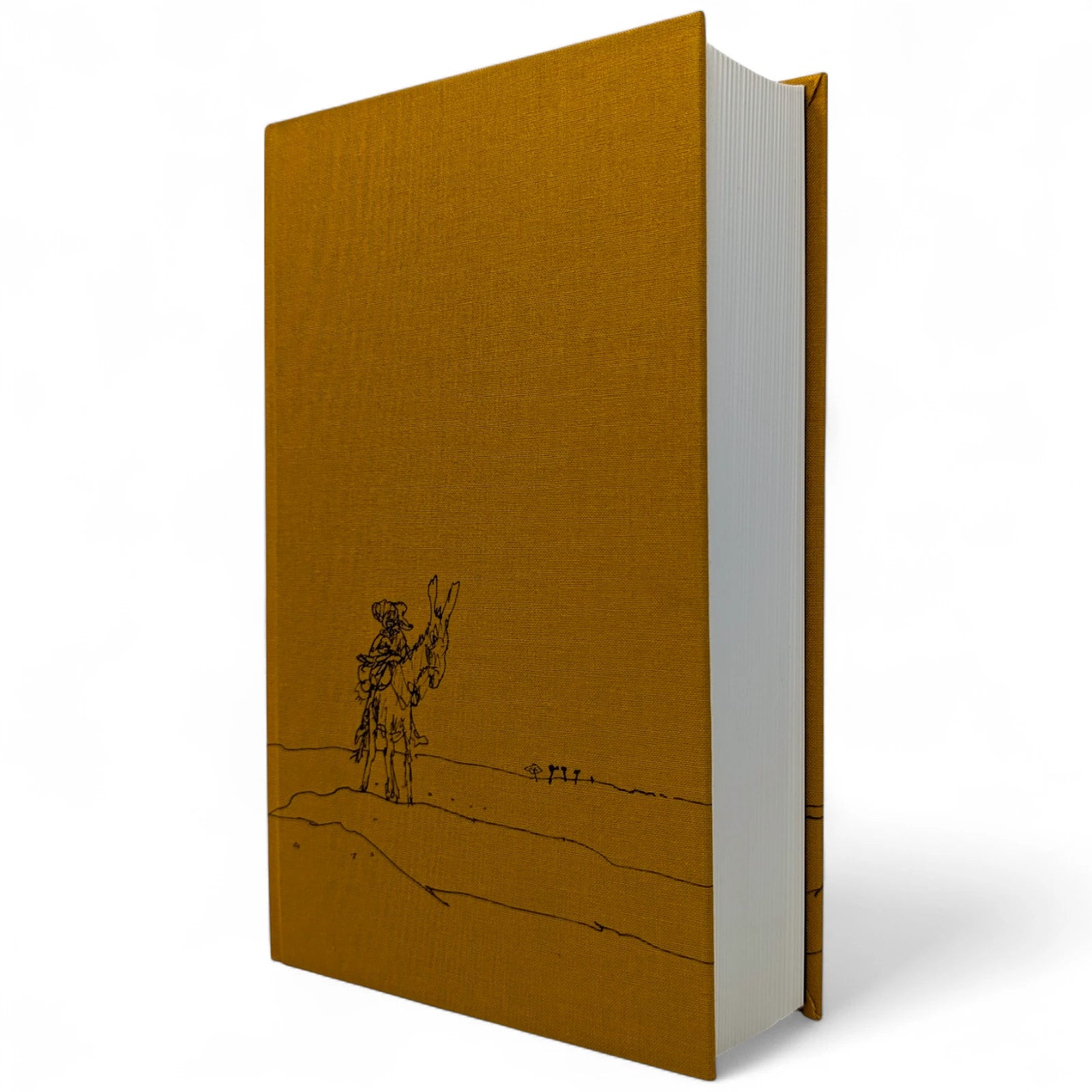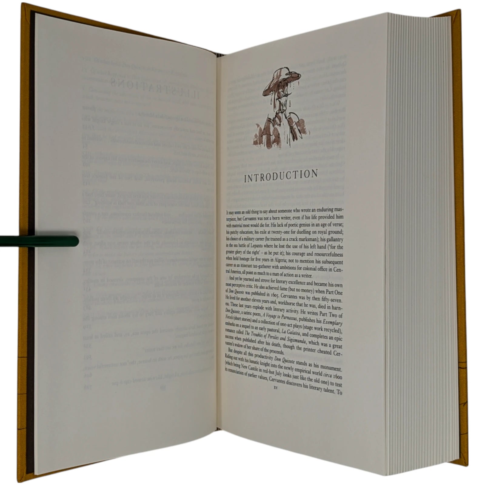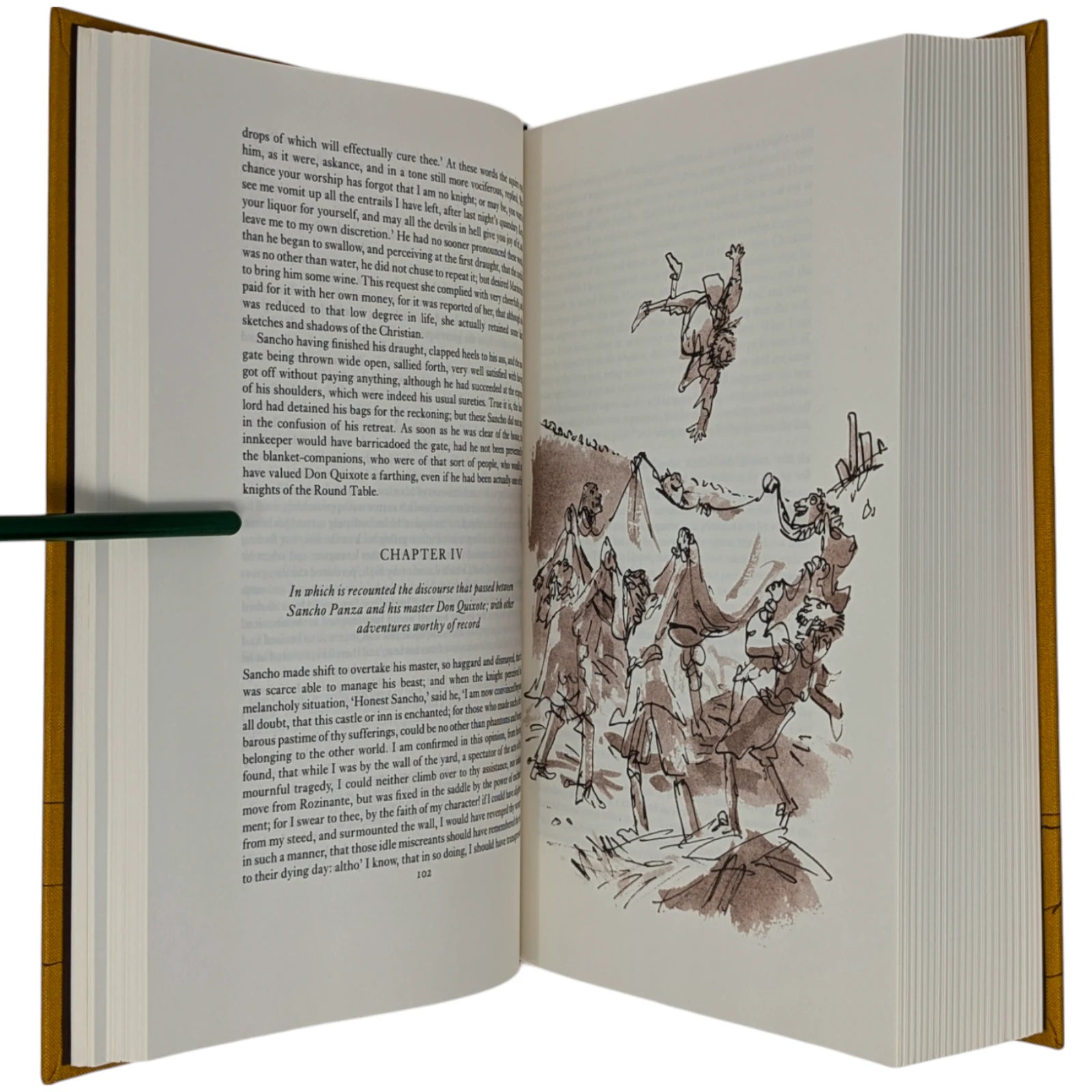 The History and Adventures of the Renowned Don Quixote, Miguel de Cervantes Saavedra. London: The Folio Society, 1995. Second printing, 1997. Translated from the Spanish of Miguel de Cervantes Saavedra, to which is prefixed, some account of the author’s life, by T. Smollett MD, introduction by Robin Chapman, illustrations by Quentin Blake. 252 × 162 × 52 mm. Pp. [1–2], [i–iv] v–xxxix [xl], 1–768 [769–774]: [16] leaves of two-colour ‘plates’. Type: Ehrhardt. Printed and bound by Cambridge University Press. Full yellow cloth with a design in dark brown by Blake; dark brown endleaves. Dark brown slip case with lettering in gold by Blake.