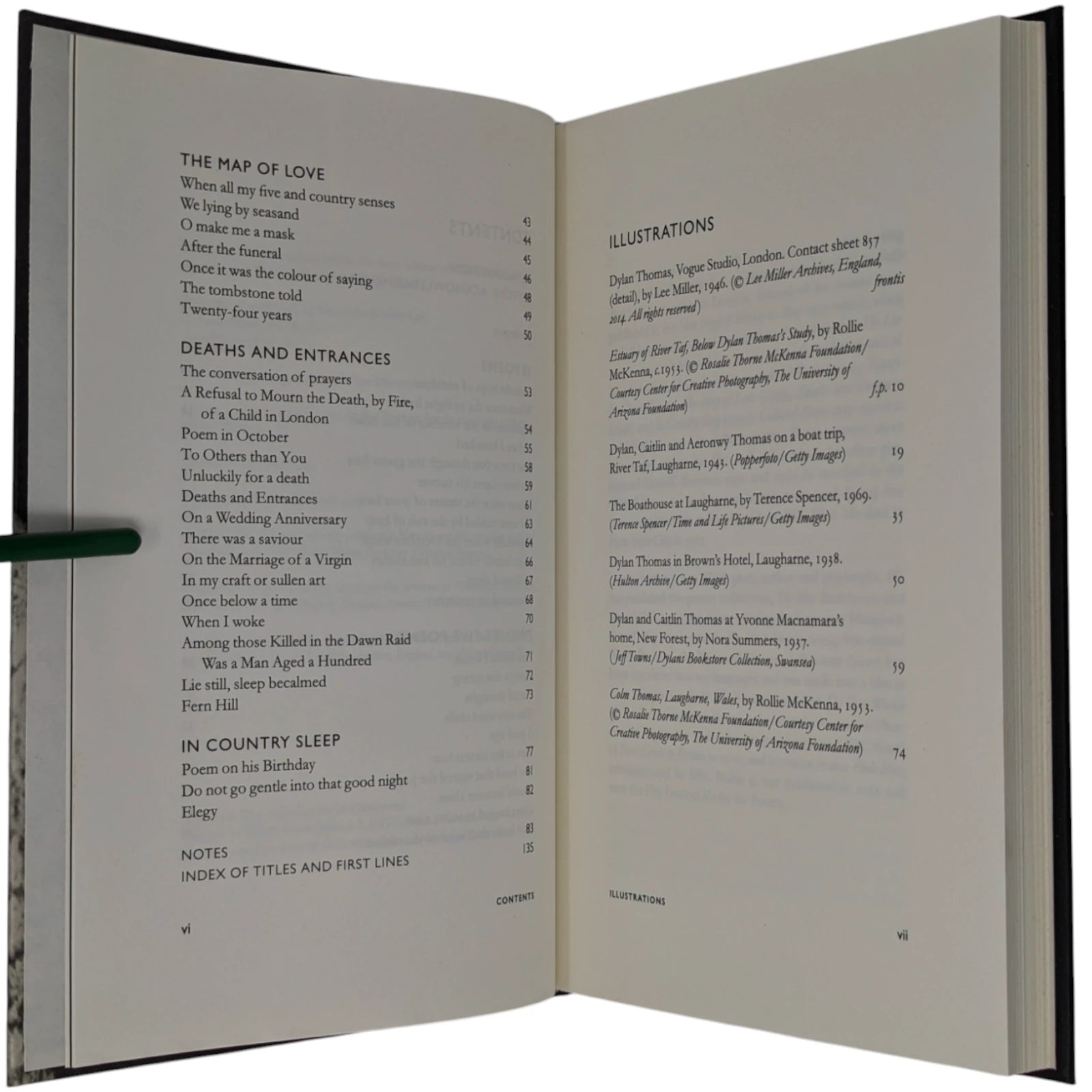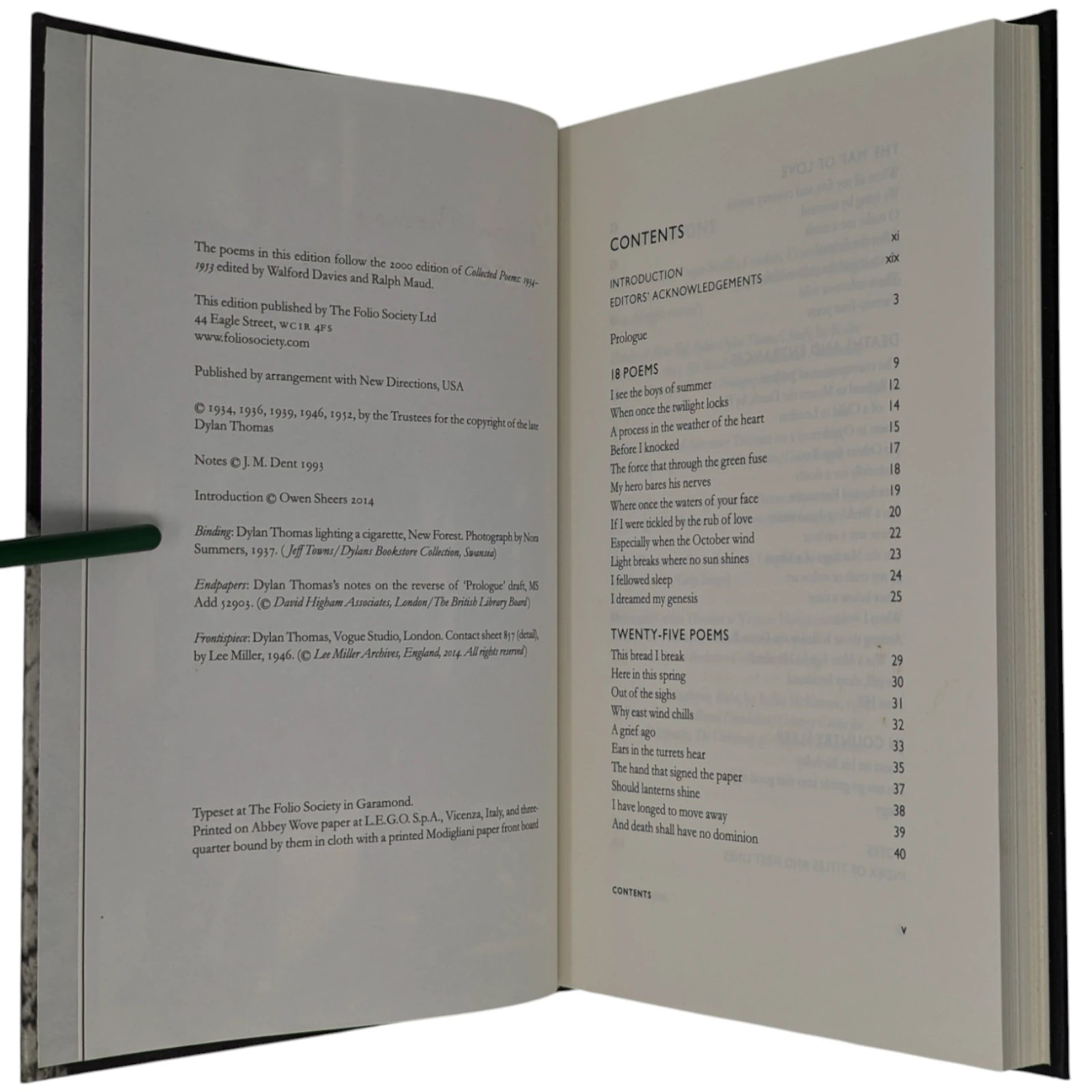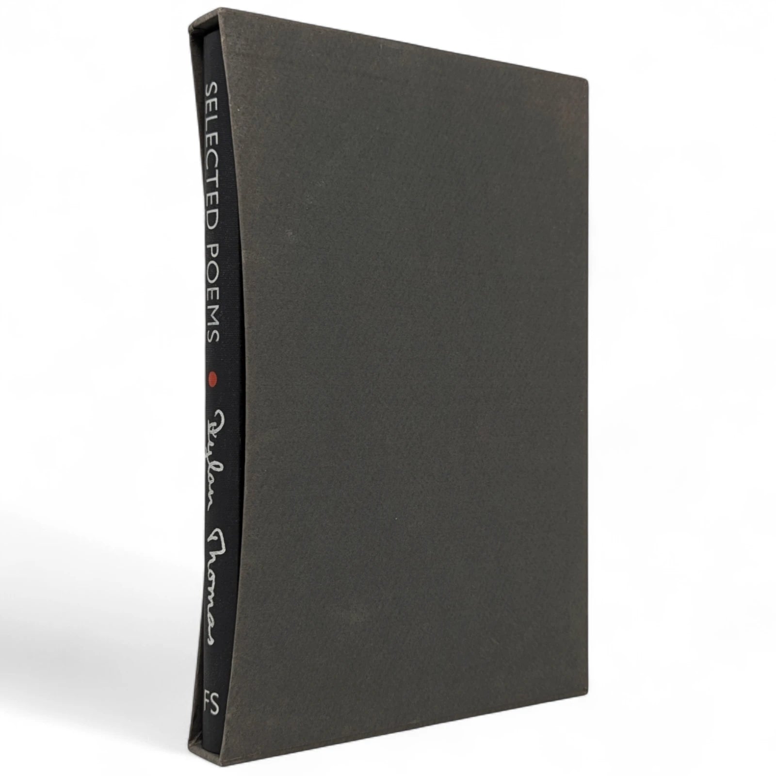 Dylan Thomas, Selected Poems. London: The Folio Society, 2014. First printing thus. Introduced by Owen Sheers, edited by Walford Davies and Ralph Maud. 240 × 162 × 20 mm. Pp. [1–2], [i–iv] v–xix [xx], [1–2] 3–137 [138]: [7] leaves of plates (facing pp. [iii], 10, 19, 35, 50, 59 and 74). Type: Garamond. Printed and bound by L.E.G.O. in three-quarter black cloth with paper front board printed with image of Thomas taken in 1937. Endleaves printed with images of notes made by the poet. Dark grey slip case. The plates reproduce photographs of Thomas, his family and the Welsh landscape, neatly captioned on the verso of each leaf.
