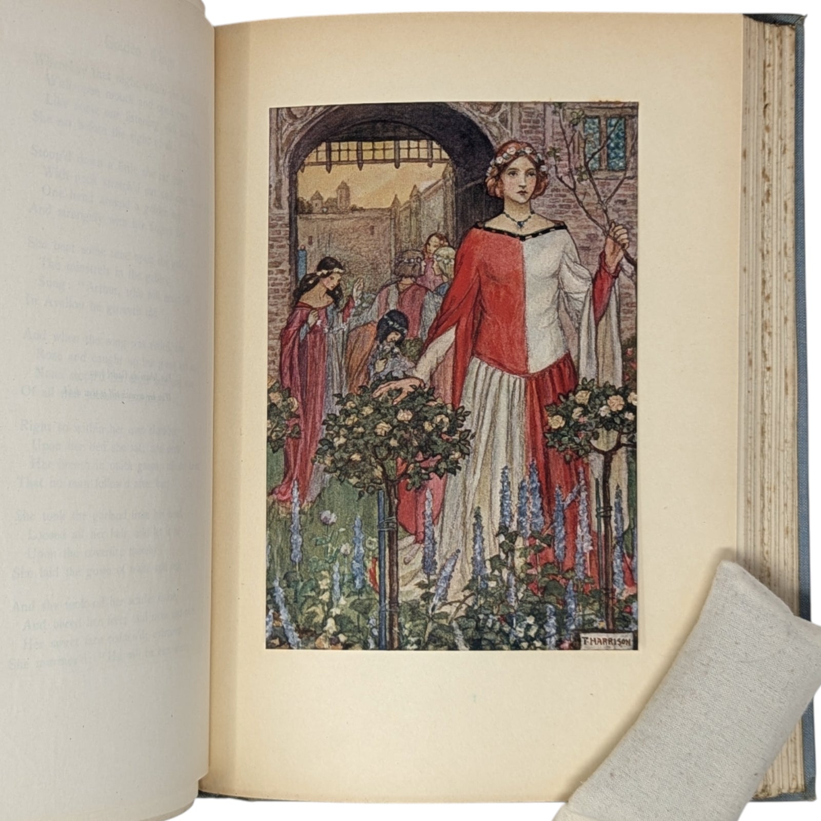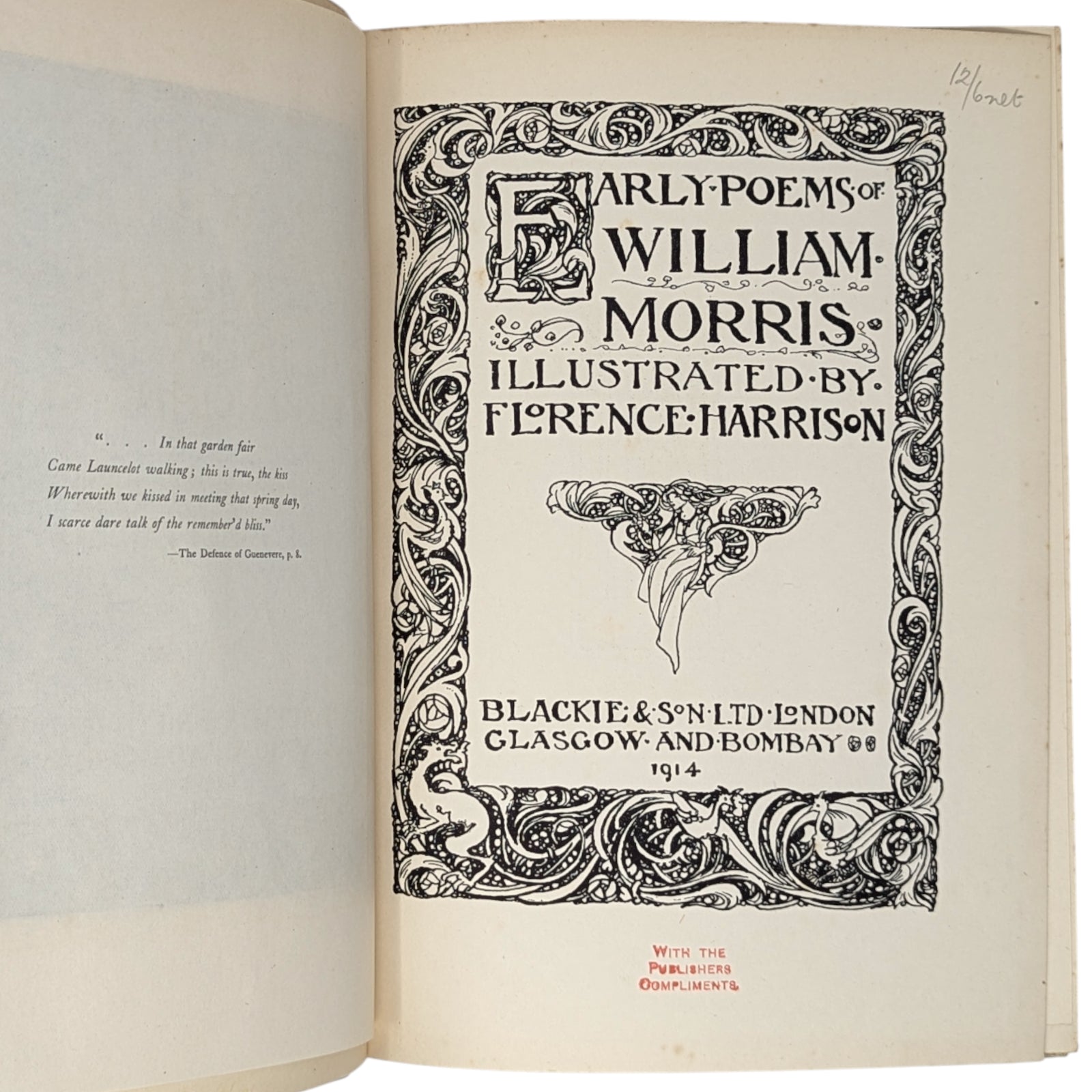 MORRIS, William. Early Poems of William Morris. London: Blackie and Son, 1914. First 'Florence Harrison' trade edition. Beautifully illustrated by Florence Harrison throughout with 16 tipped-in colour plates behind captioned tissue guards. Presentation copy, stamped 'With the publisher's compliments' to bottom of title page.