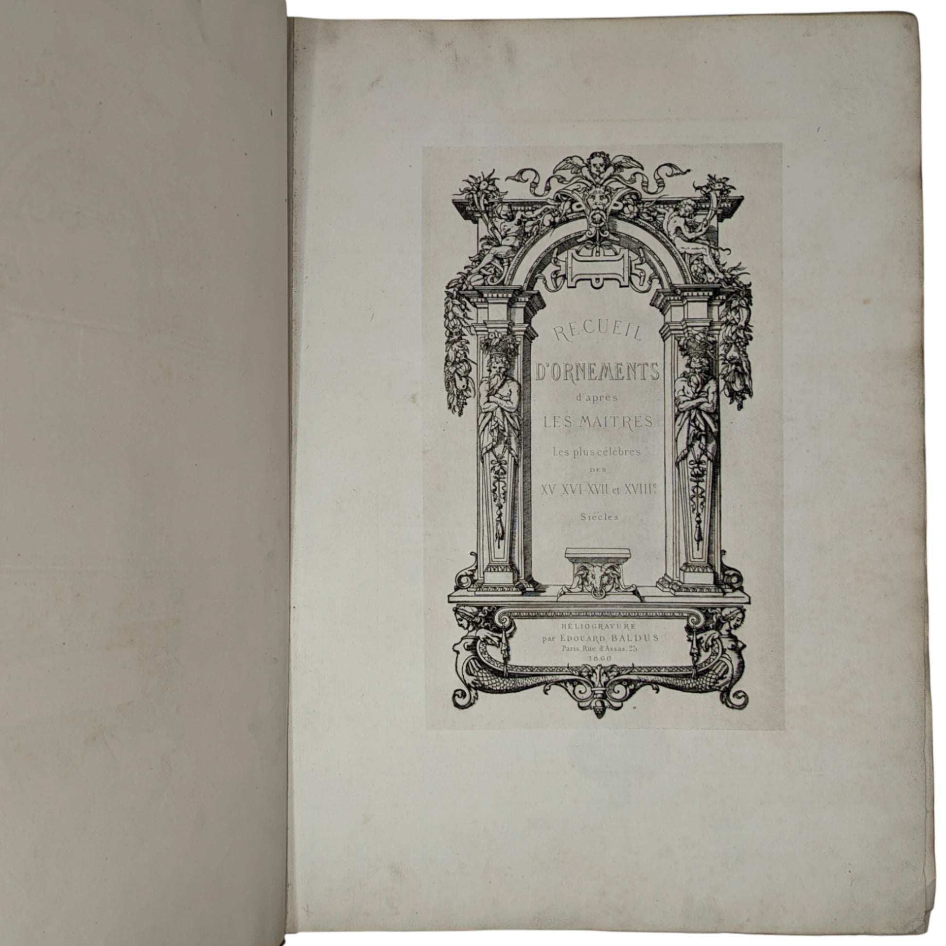 BALDUS, Édouard. Recueil d’Ornements d’après les Maîtres les Plus Célèbres des XV, XVI, XVII et XVIIIe Siècles, or, Collection of Ornaments after the most famous masters of the fifteenth, sixteenth, seventeenth, and eighteenth centuries. Paris: Heliogravure par Edouard Baldus, 1866.