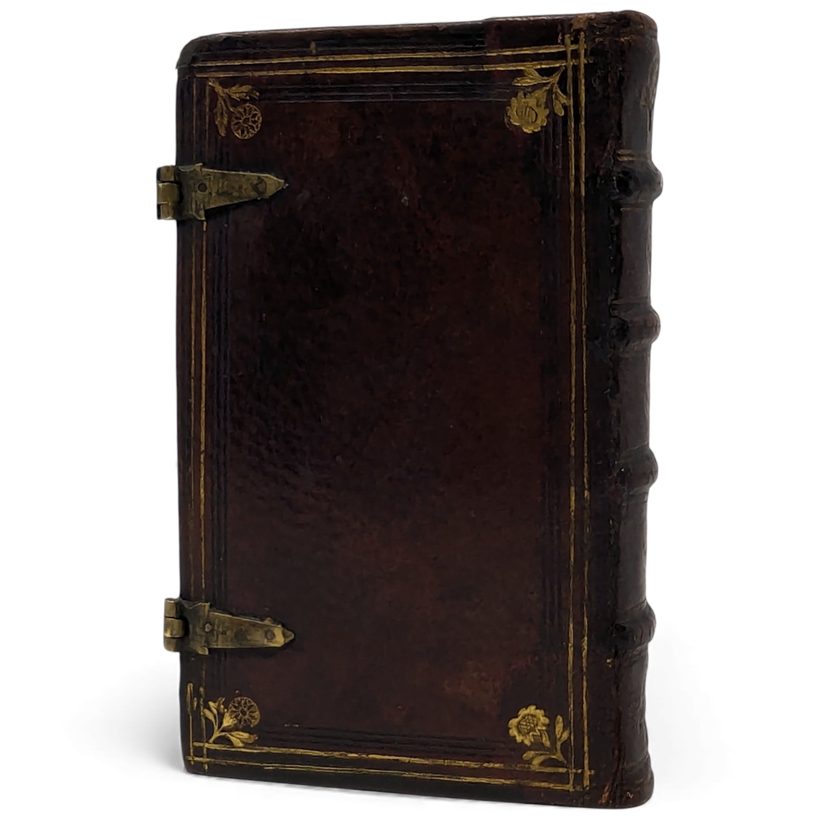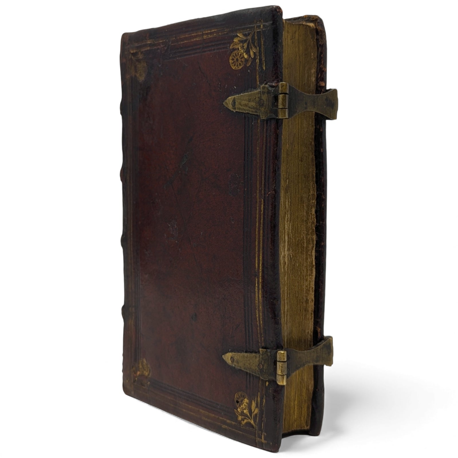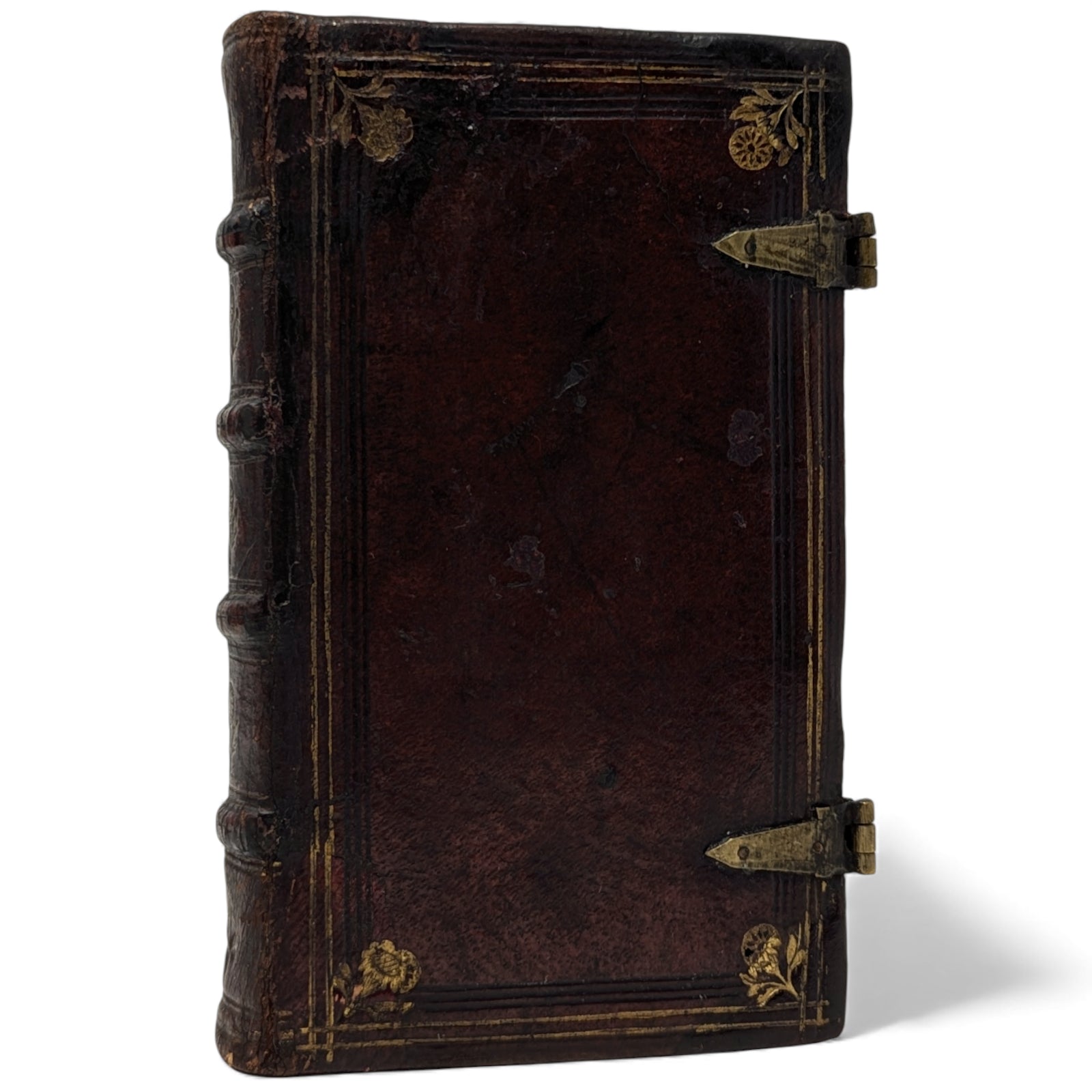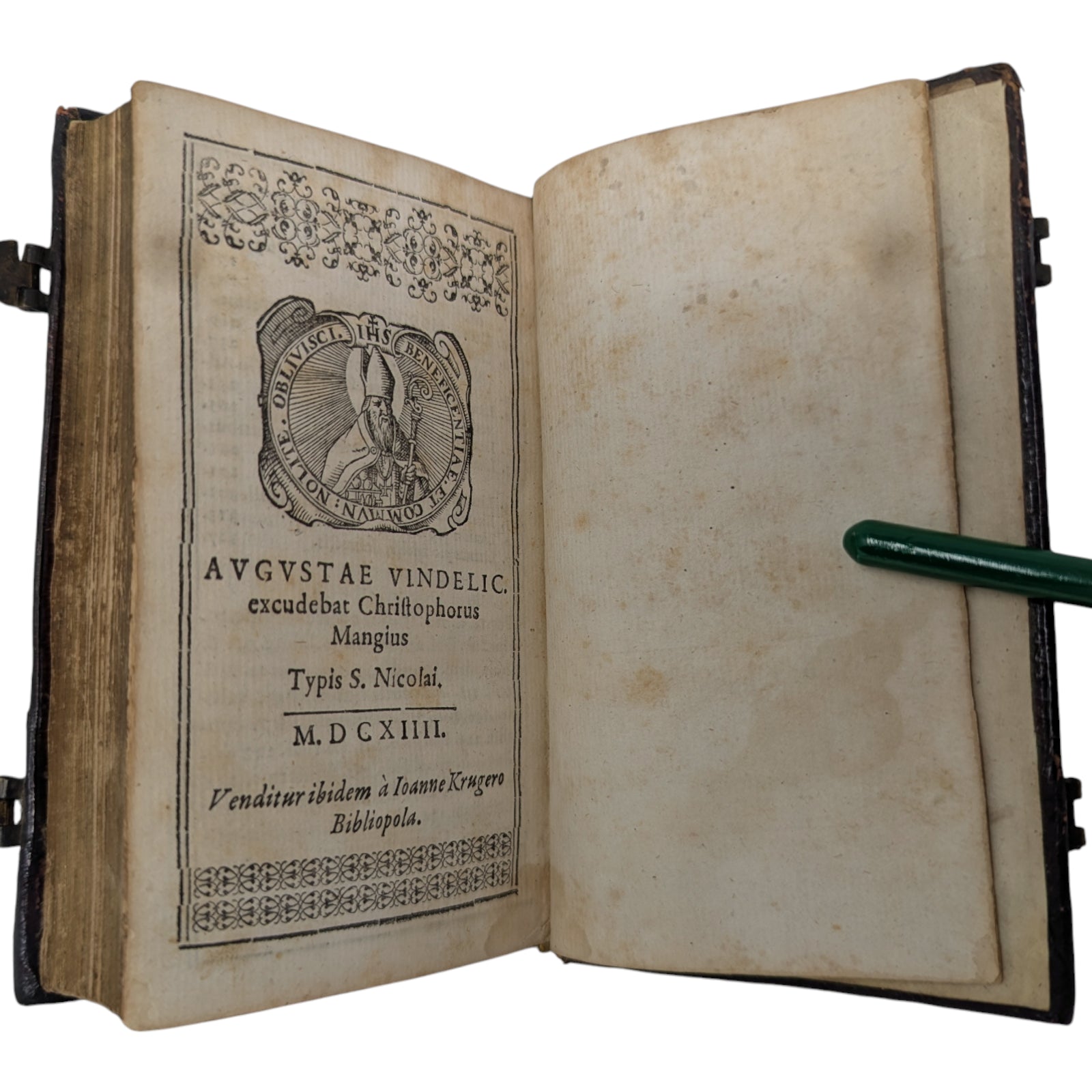 12.6 x 7.8 cm. (7), 342, (9) pp. Engraving. With a preface by Georg Mayr dated 30 April 1614. Contemporary full calf ornately embossed in gilt, four raised bands to spine, with metal clasps and all edges gilt. Sympathetically restored recently with a few small worm holes repaired and the leather polished. Previous owner's inscription on FFEP, some external wear, paper tanned and stained here and there with sporadic foxing throughout, small worm holes to the first seven leaves, a few small nibbles throughout (not affecting text, nor engraving).