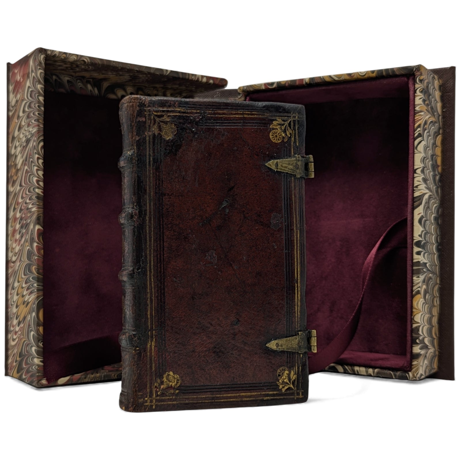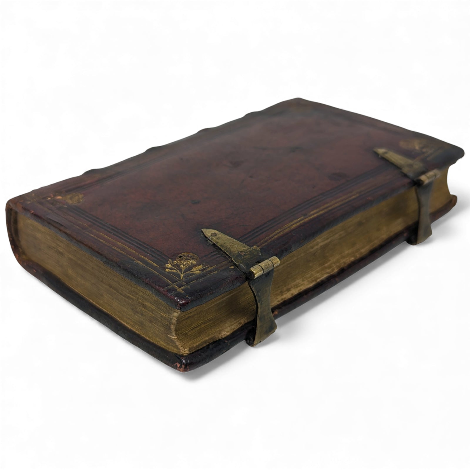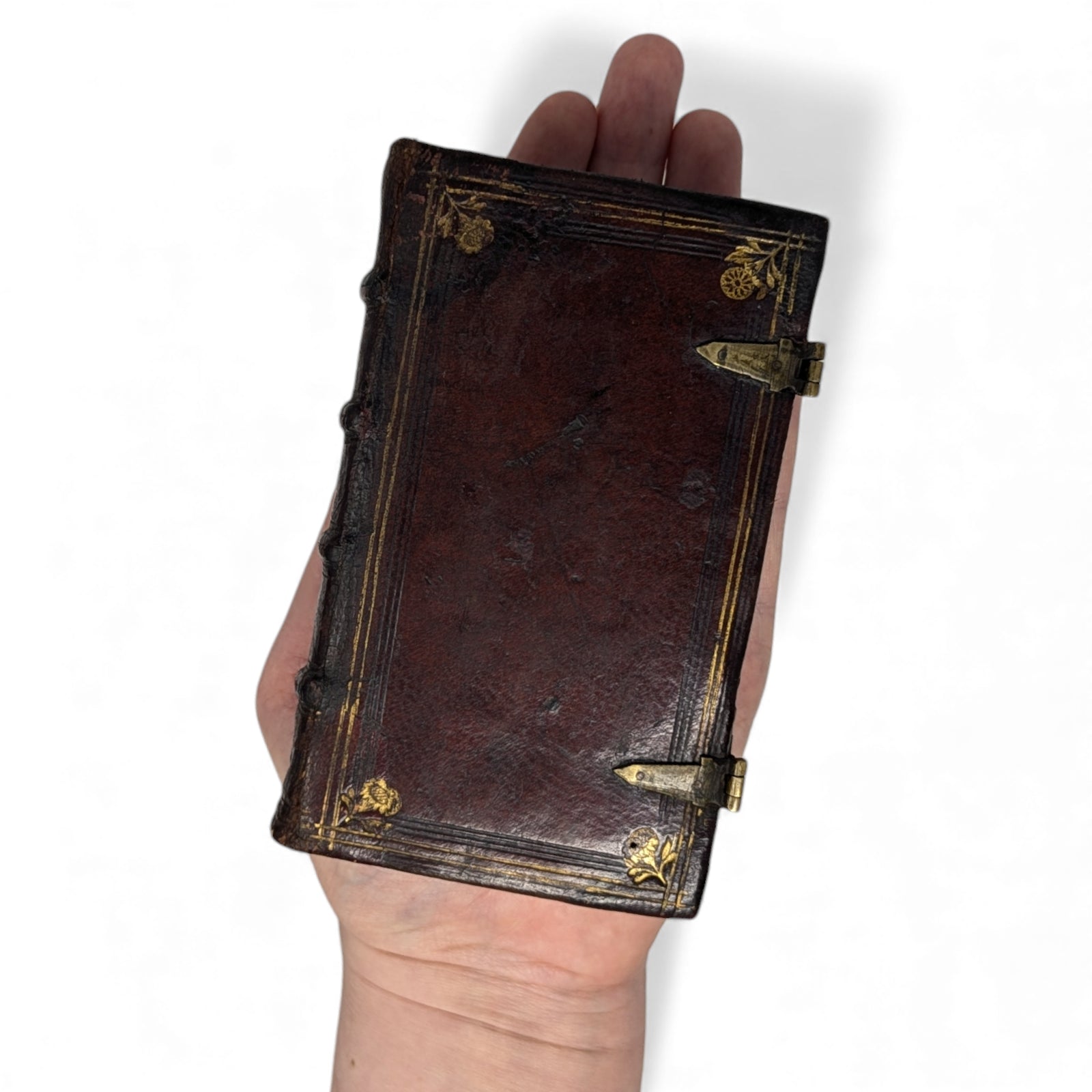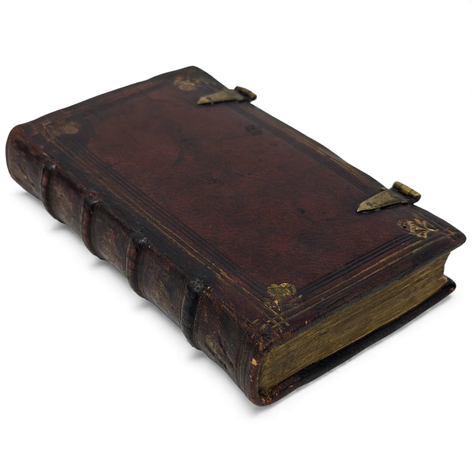 12.6 x 7.8 cm. (7), 342, (9) pp. Engraving. With a preface by Georg Mayr dated 30 April 1614. Contemporary full calf ornately embossed in gilt, four raised bands to spine, with metal clasps and all edges gilt. Sympathetically restored recently with a few small worm holes repaired and the leather polished. Previous owner's inscription on FFEP, some external wear, paper tanned and stained here and there with sporadic foxing throughout, small worm holes to the first seven leaves, a few small nibbles throughout (not affecting text, nor engraving).