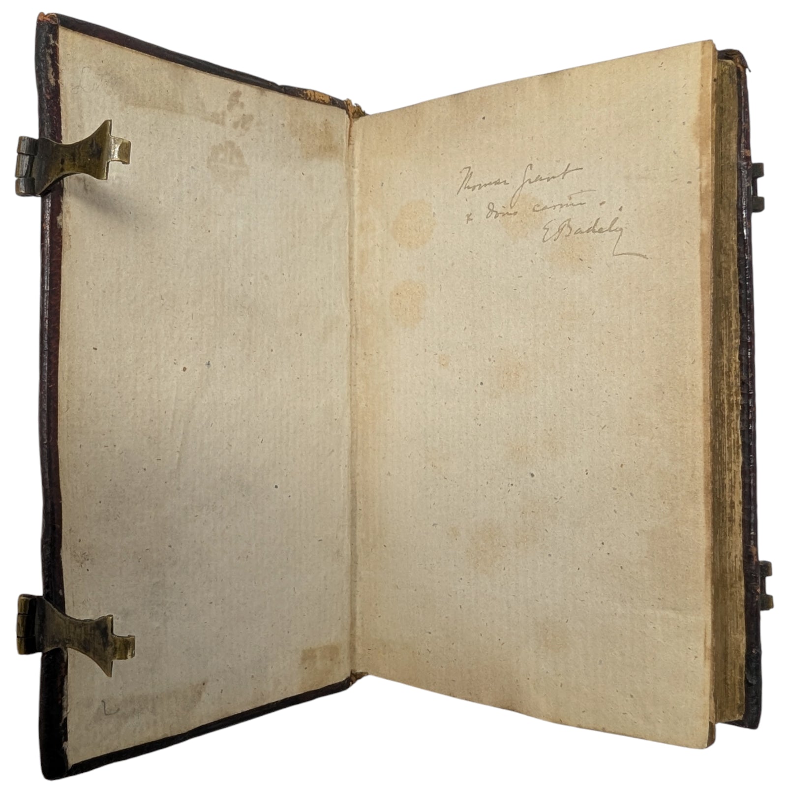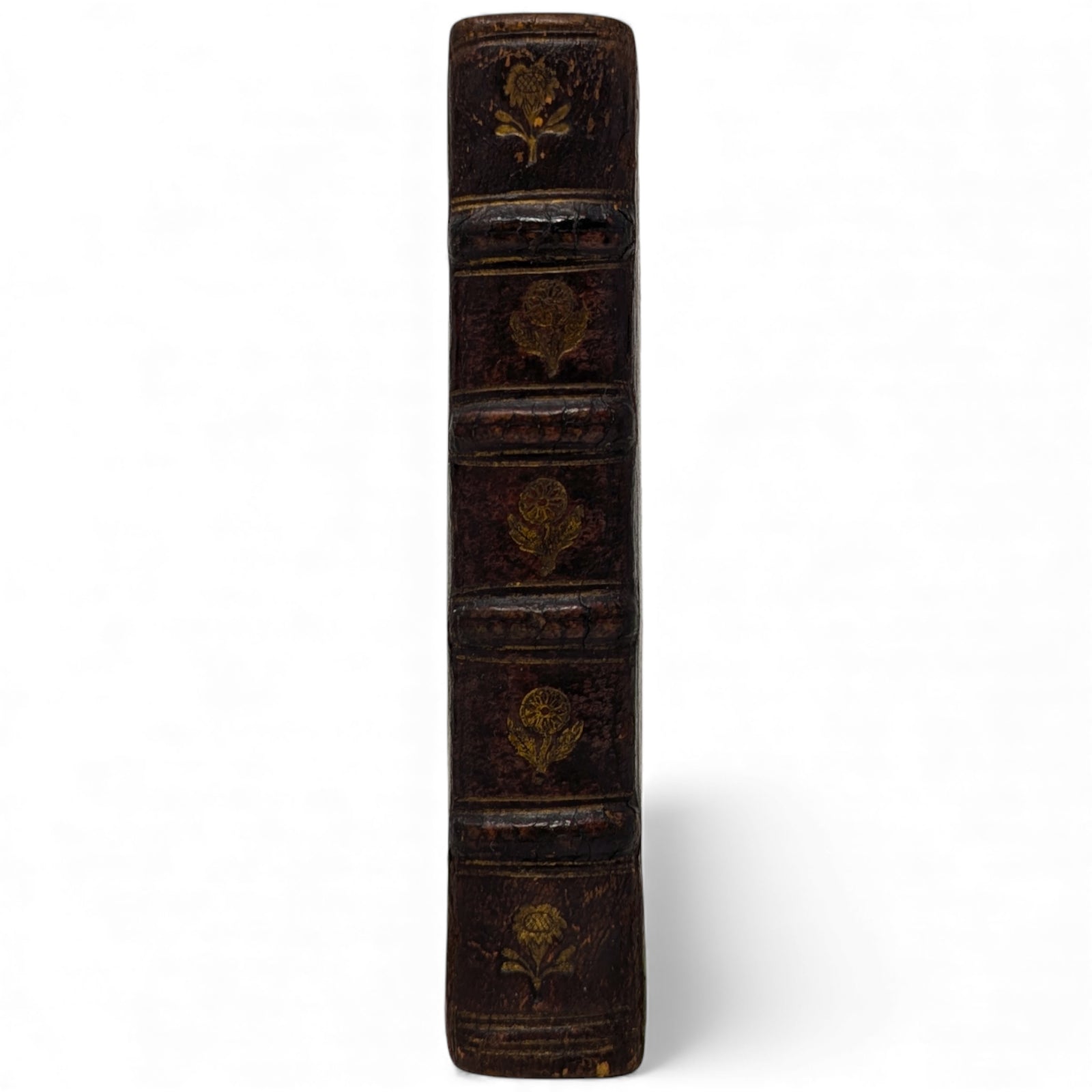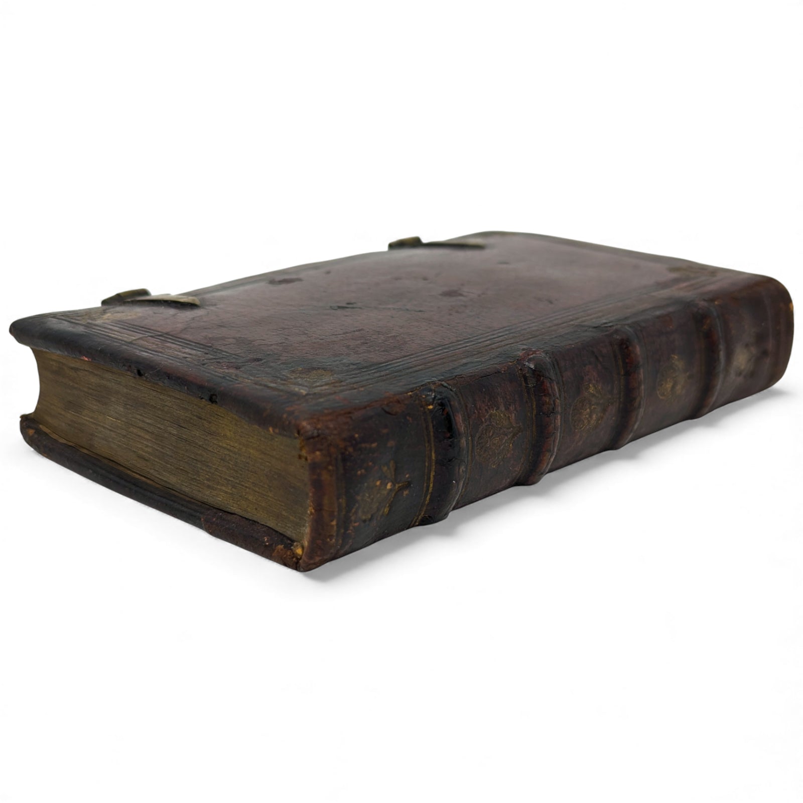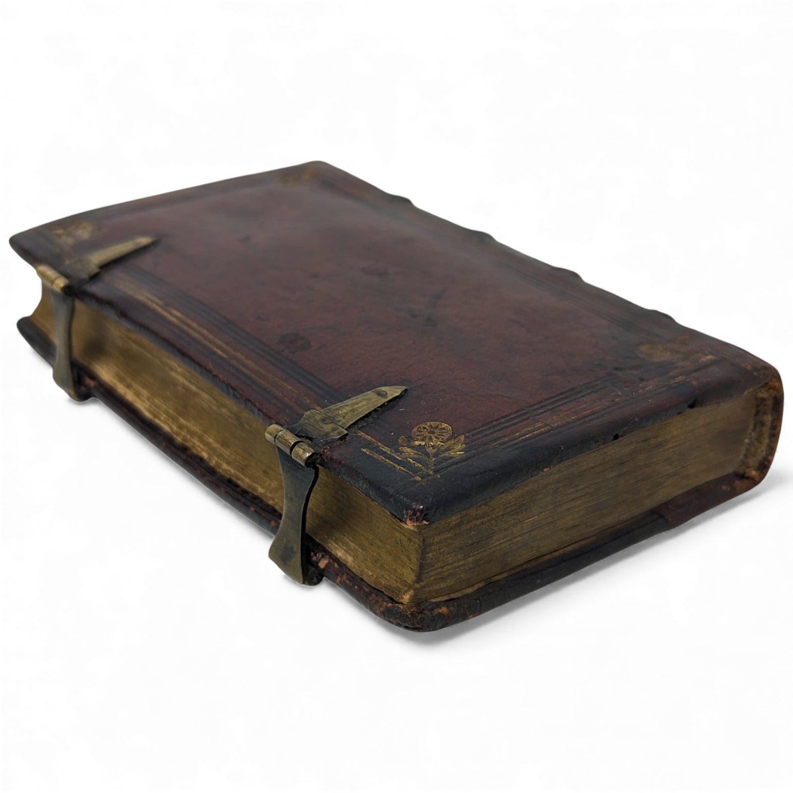 12.6 x 7.8 cm. (7), 342, (9) pp. Engraving. With a preface by Georg Mayr dated 30 April 1614. Contemporary full calf ornately embossed in gilt, four raised bands to spine, with metal clasps and all edges gilt. Sympathetically restored recently with a few small worm holes repaired and the leather polished. Previous owner's inscription on FFEP, some external wear, paper tanned and stained here and there with sporadic foxing throughout, small worm holes to the first seven leaves, a few small nibbles throughout (not affecting text, nor engraving).