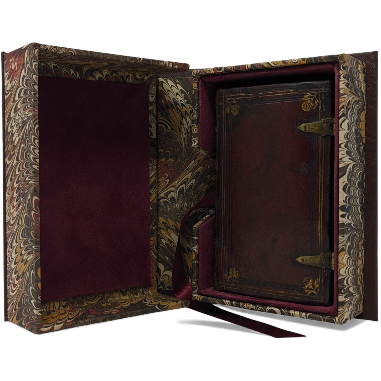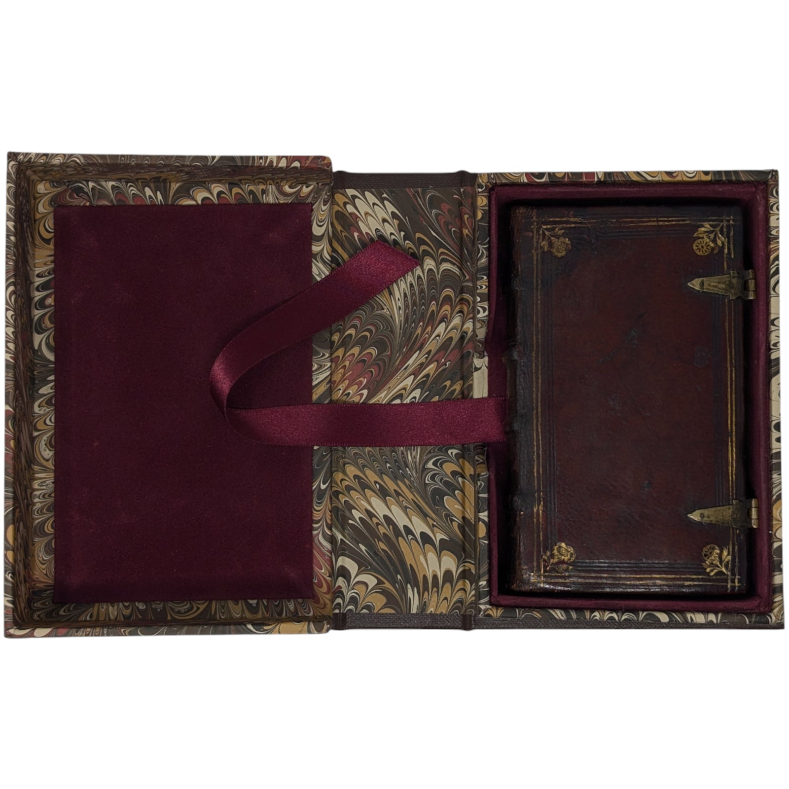 Now housed in a bespoke solander case hand-made by the Black Cat Bindery in Somerset, UK, bound in full brown buckram with gilt ruling to sides and titles and decoration in gilt to spine, with beautiful hand-marbled paper edges, and lined in soft burgundy suedel.