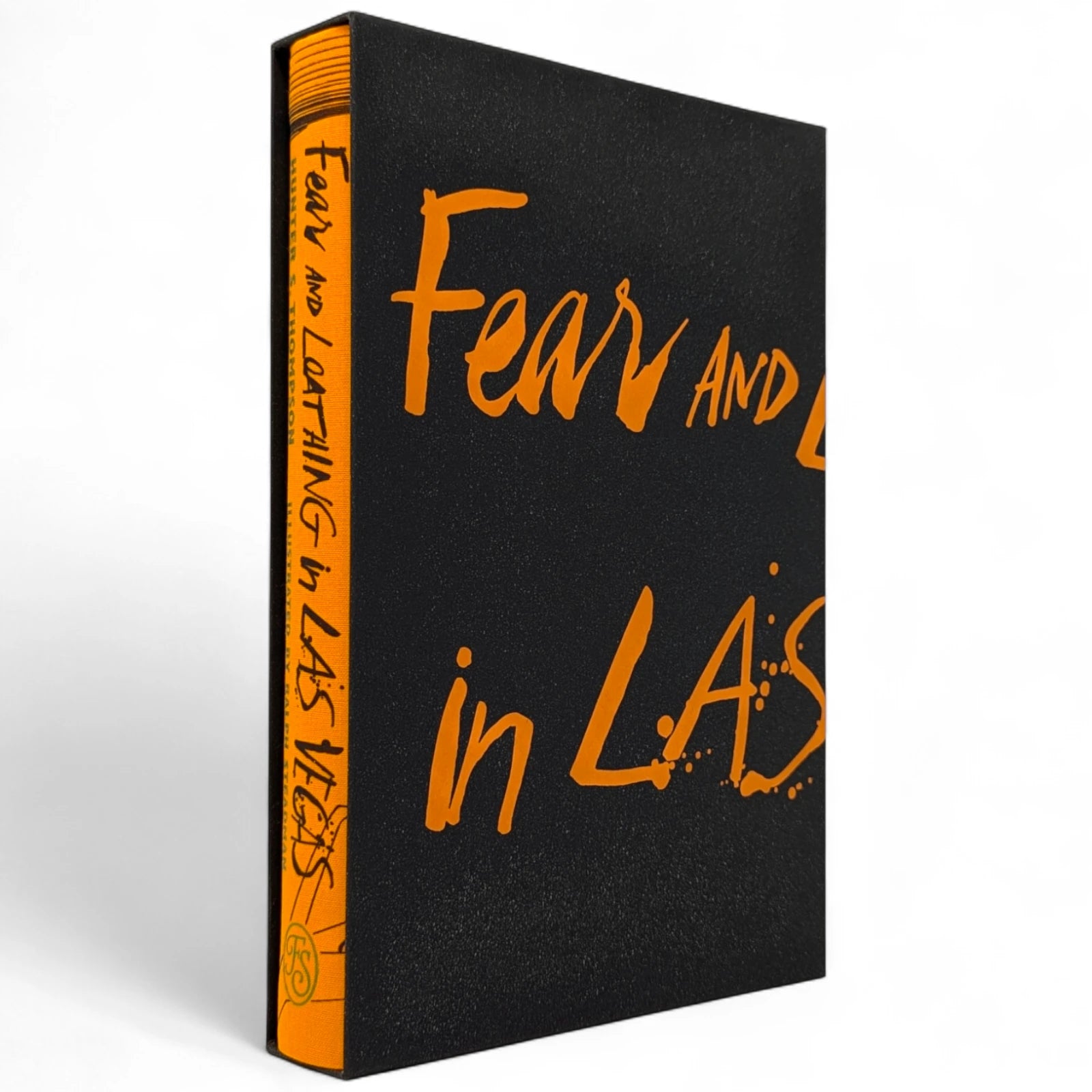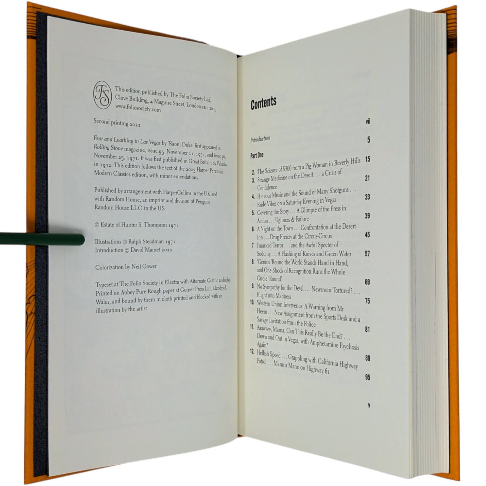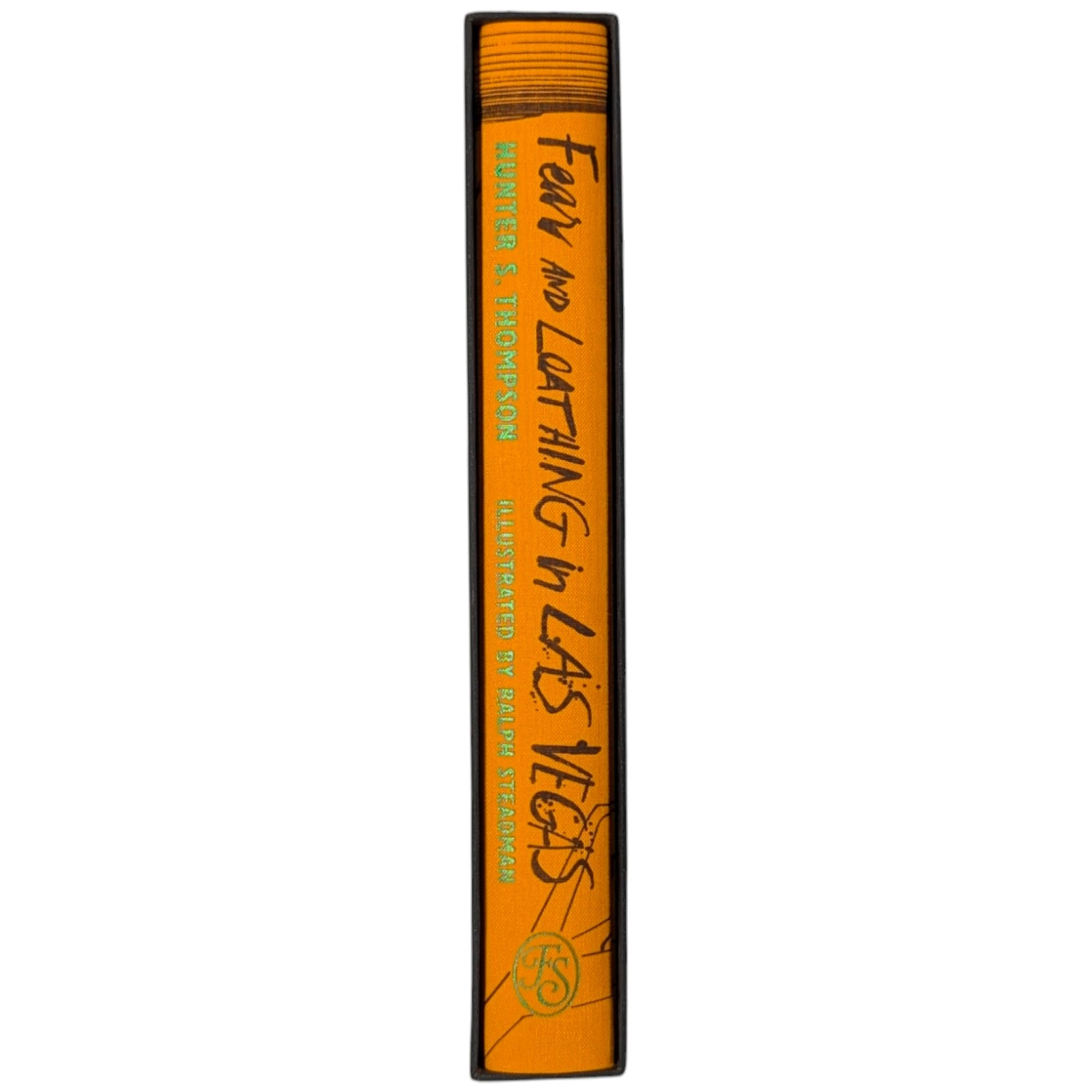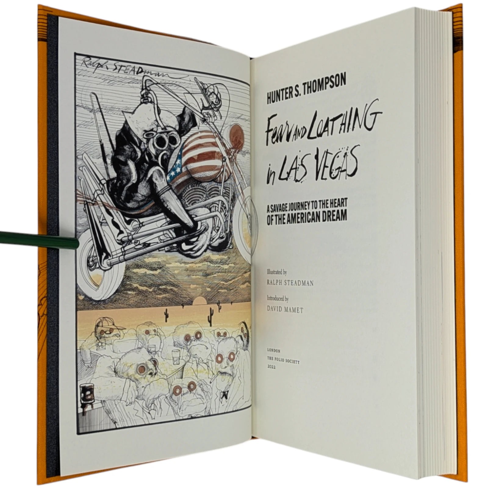 Hunter S. Thompson, Fear and Loathing in Las Vegas, a savage journey to the heart of the American dream. London: The Folio Society, 2022. Second printing thus, 2022. Illustrated by Ralph Steadman, introduced by David Mamet. 241 × 161 × 31 mm. Pp. [i–iv] v–xii [xiii–xiv], [1–6] 7–211 [212–218]. Type: Electra with hand-drawn lettering for the title and Alternate Gothic for display. Printed and bound by Gomer Press in full orange cloth printed in black and blocked in silver and metallic green with a design based on first U.S. book edition; dark silver endleaves. Printed slip case with title design. Adopting the pseudonym Raoul Duke, Thompson’s story (and Steadman’s illustrations) was originally published in two parts by Rolling stone magazine in 1971. Neil Gower coloured the illustrations for this edition.