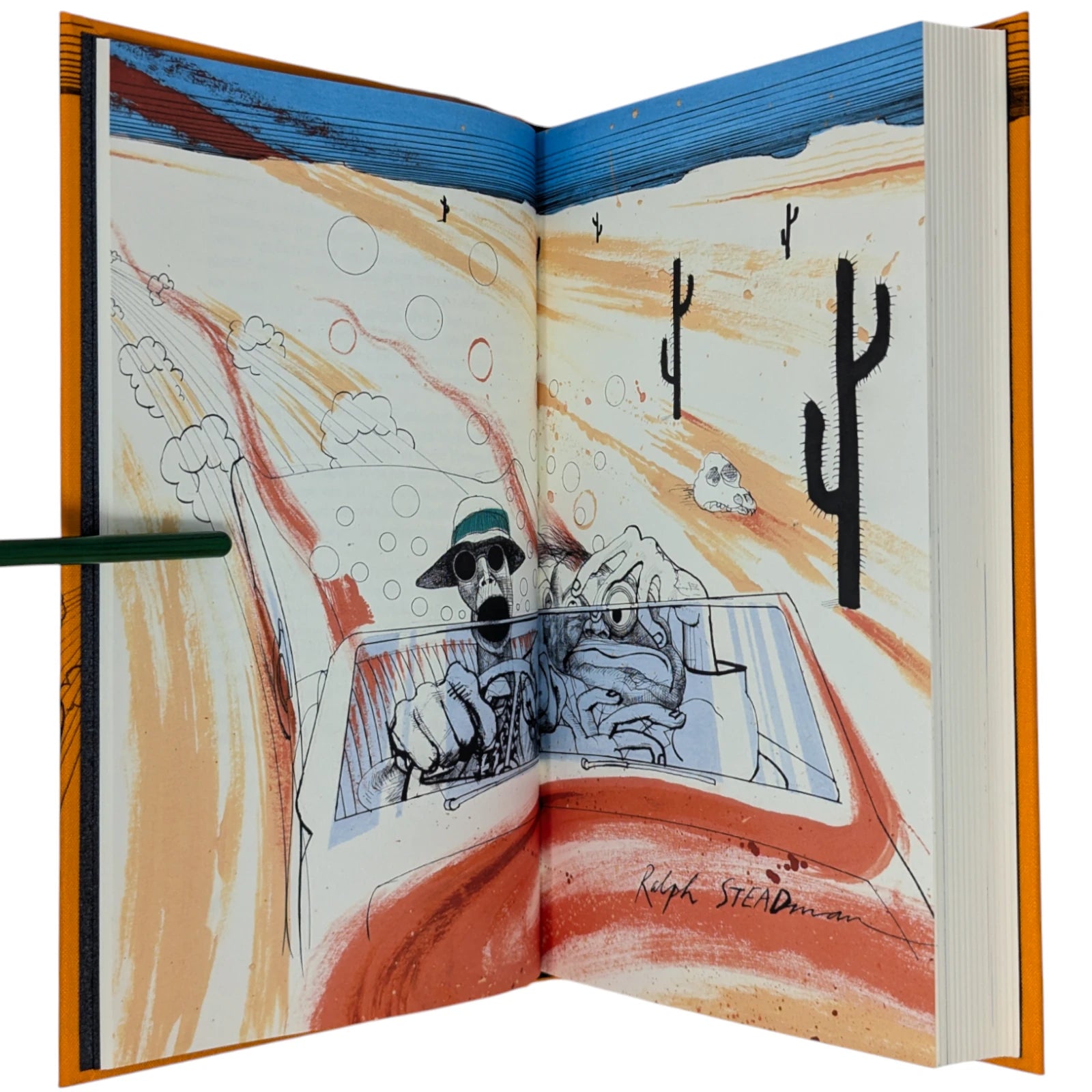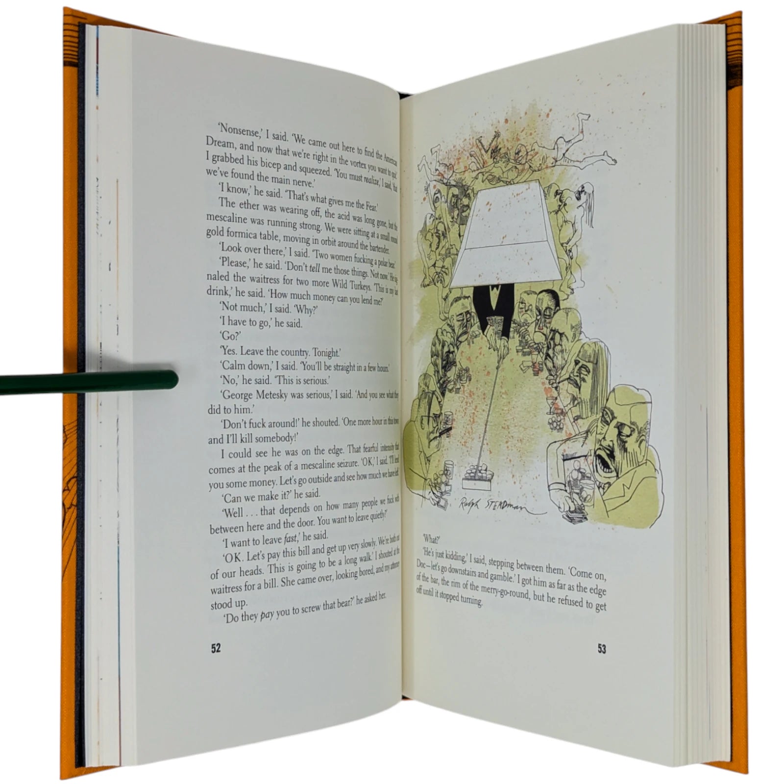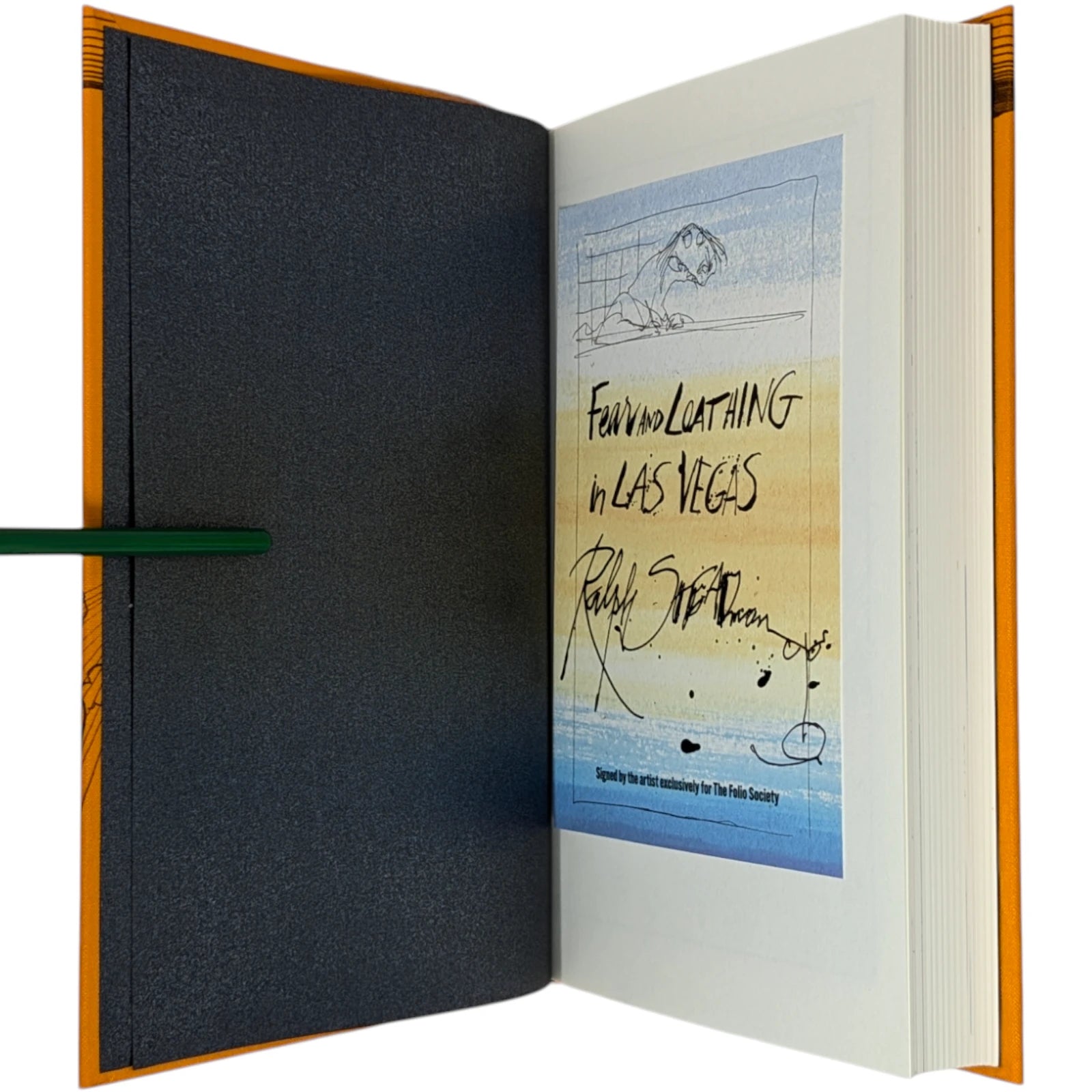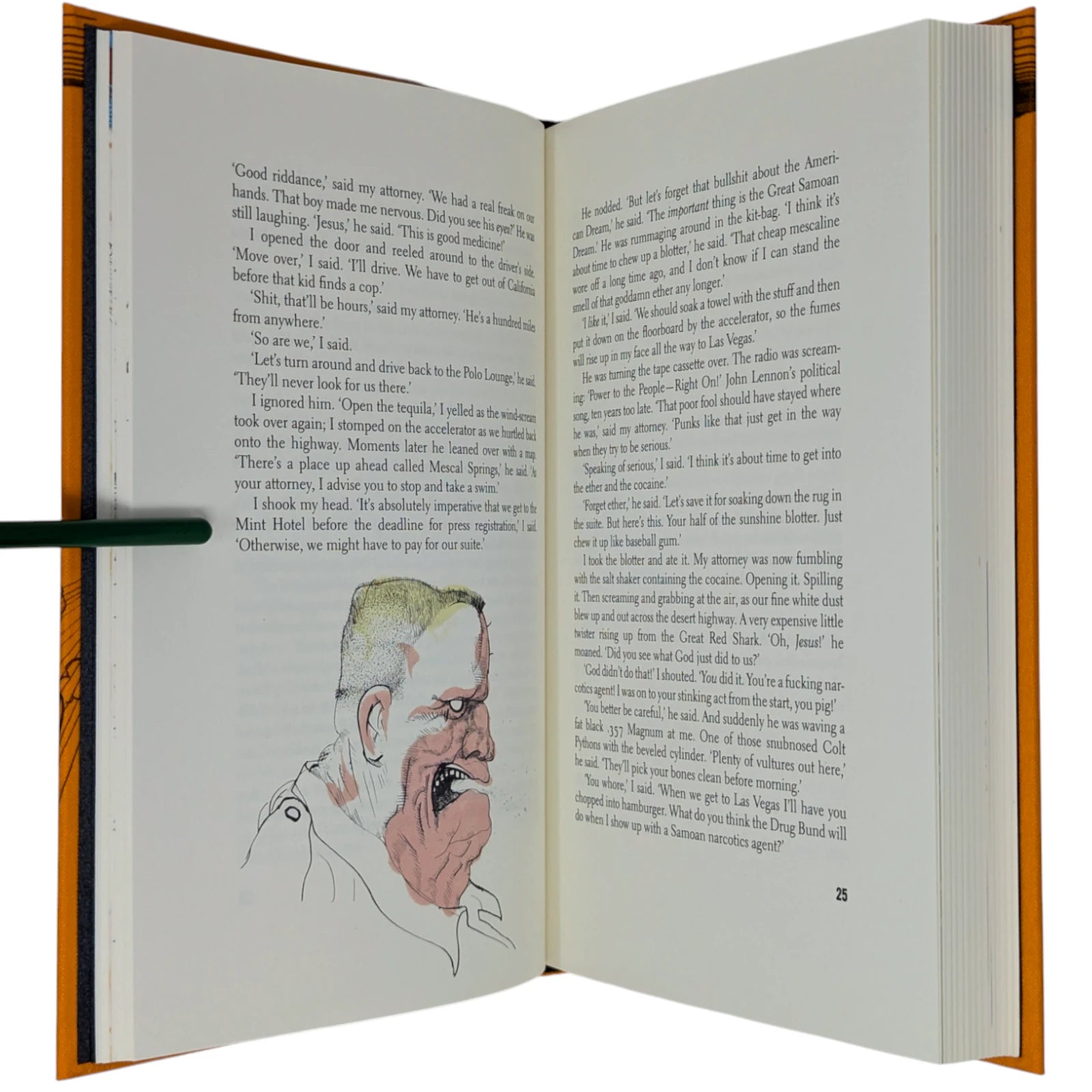 Hunter S. Thompson, Fear and Loathing in Las Vegas, a savage journey to the heart of the American dream. London: The Folio Society, 2022. Second printing thus, 2022. Illustrated by Ralph Steadman, introduced by David Mamet. 241 × 161 × 31 mm. Pp. [i–iv] v–xii [xiii–xiv], [1–6] 7–211 [212–218]. Type: Electra with hand-drawn lettering for the title and Alternate Gothic for display. Printed and bound by Gomer Press in full orange cloth printed in black and blocked in silver and metallic green with a design based on first U.S. book edition; dark silver endleaves. Printed slip case with title design. Adopting the pseudonym Raoul Duke, Thompson’s story (and Steadman’s illustrations) was originally published in two parts by Rolling stone magazine in 1971. Neil Gower coloured the illustrations for this edition.