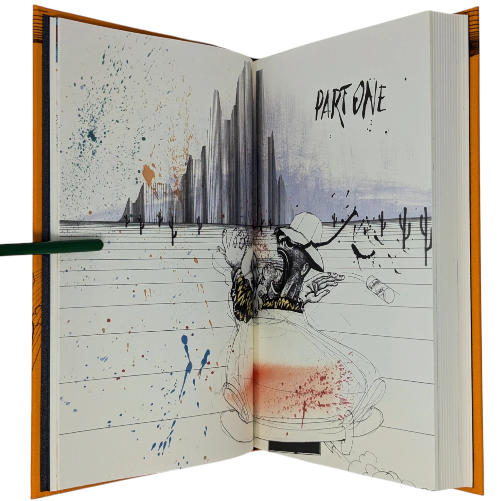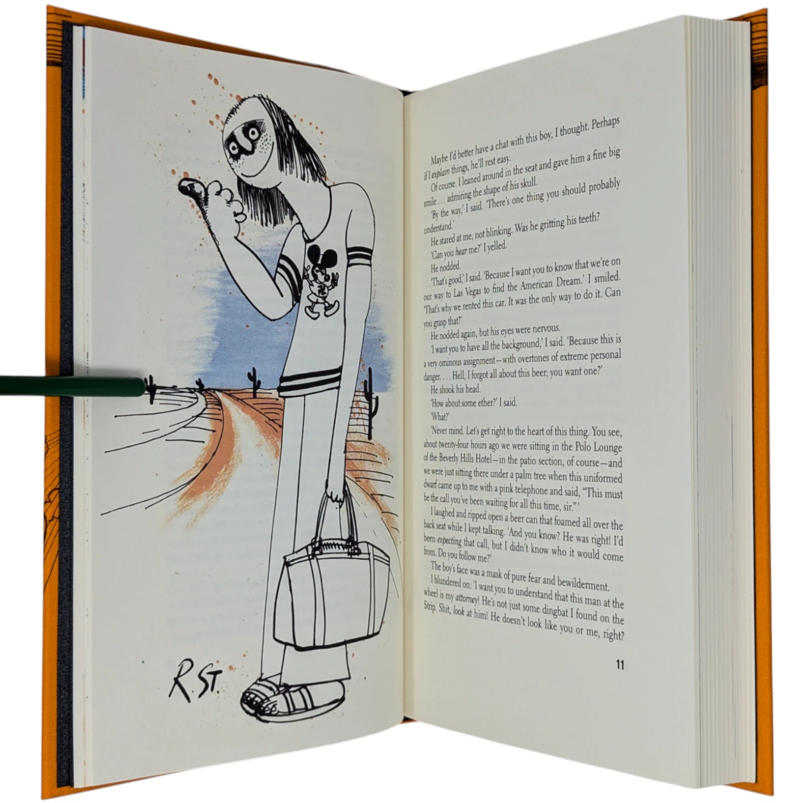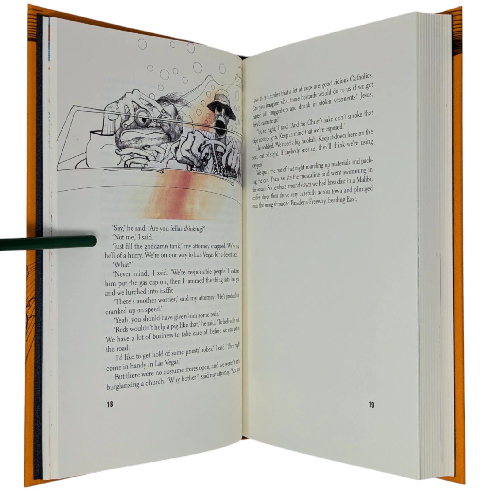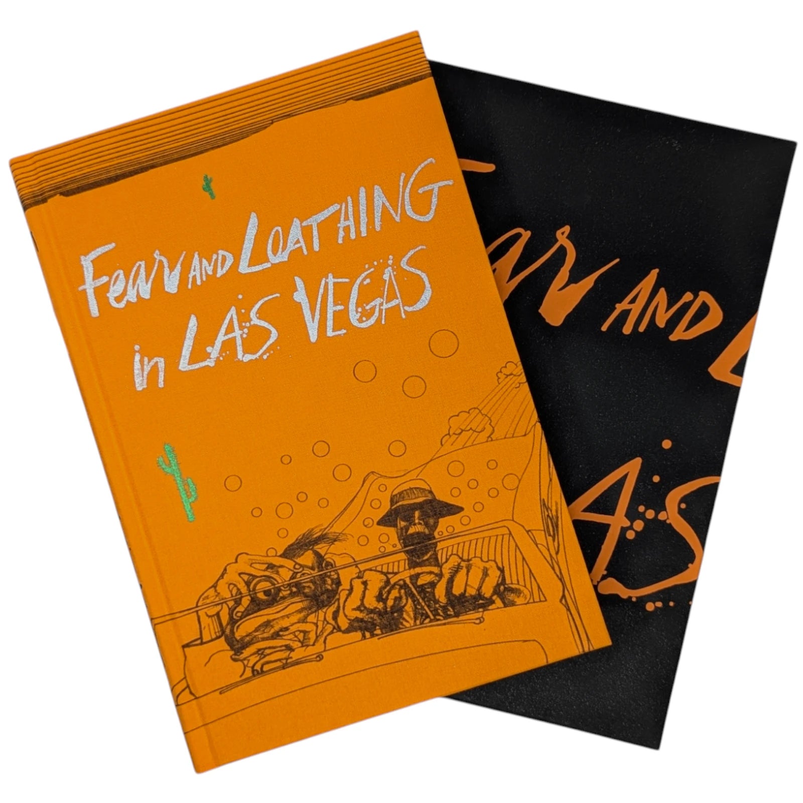 Hunter S. Thompson, Fear and Loathing in Las Vegas, a savage journey to the heart of the American dream. London: The Folio Society, 2022. Second printing thus, 2022. Illustrated by Ralph Steadman, introduced by David Mamet. 241 × 161 × 31 mm. Pp. [i–iv] v–xii [xiii–xiv], [1–6] 7–211 [212–218]. Type: Electra with hand-drawn lettering for the title and Alternate Gothic for display. Printed and bound by Gomer Press in full orange cloth printed in black and blocked in silver and metallic green with a design based on first U.S. book edition; dark silver endleaves. Printed slip case with title design. Adopting the pseudonym Raoul Duke, Thompson’s story (and Steadman’s illustrations) was originally published in two parts by Rolling stone magazine in 1971. Neil Gower coloured the illustrations for this edition.