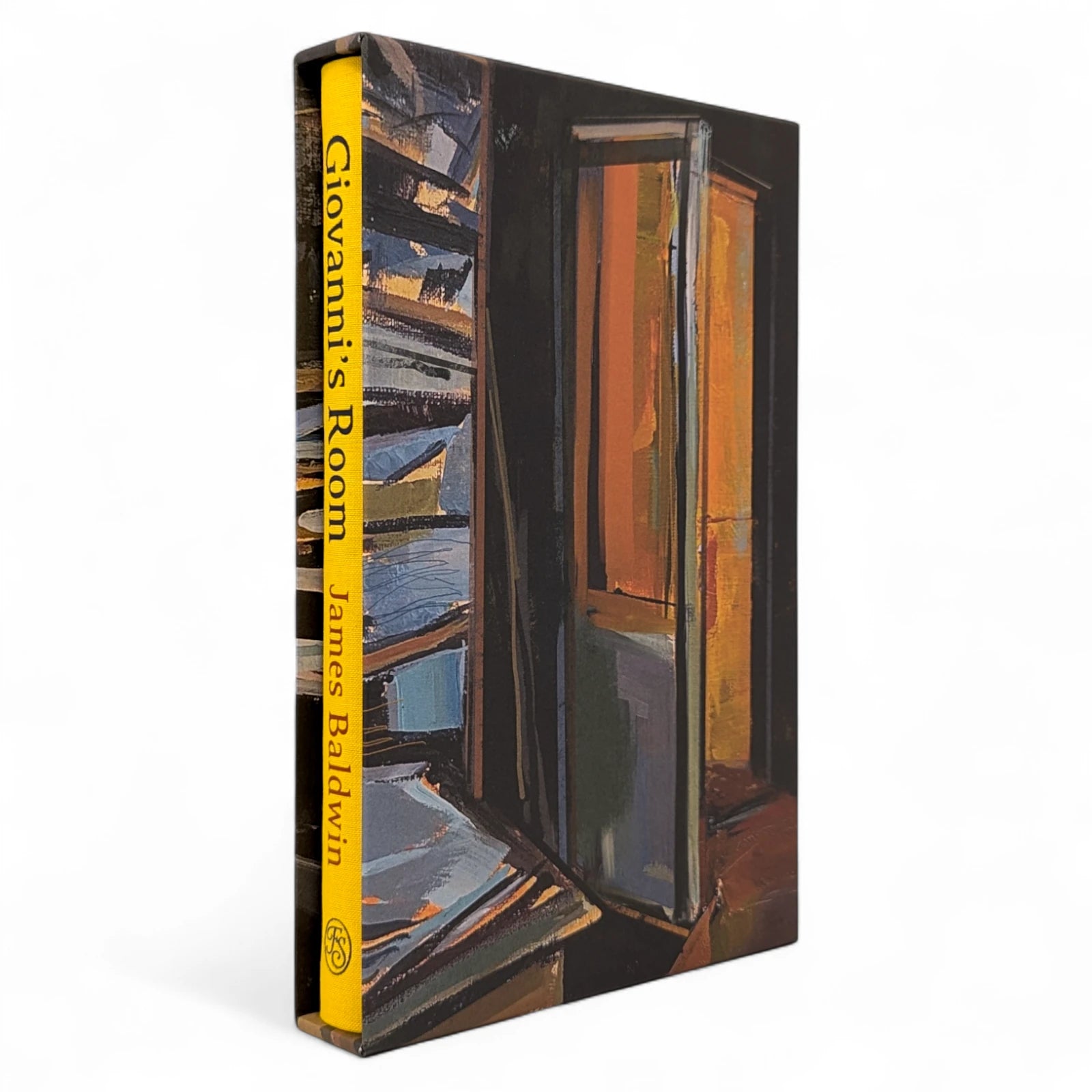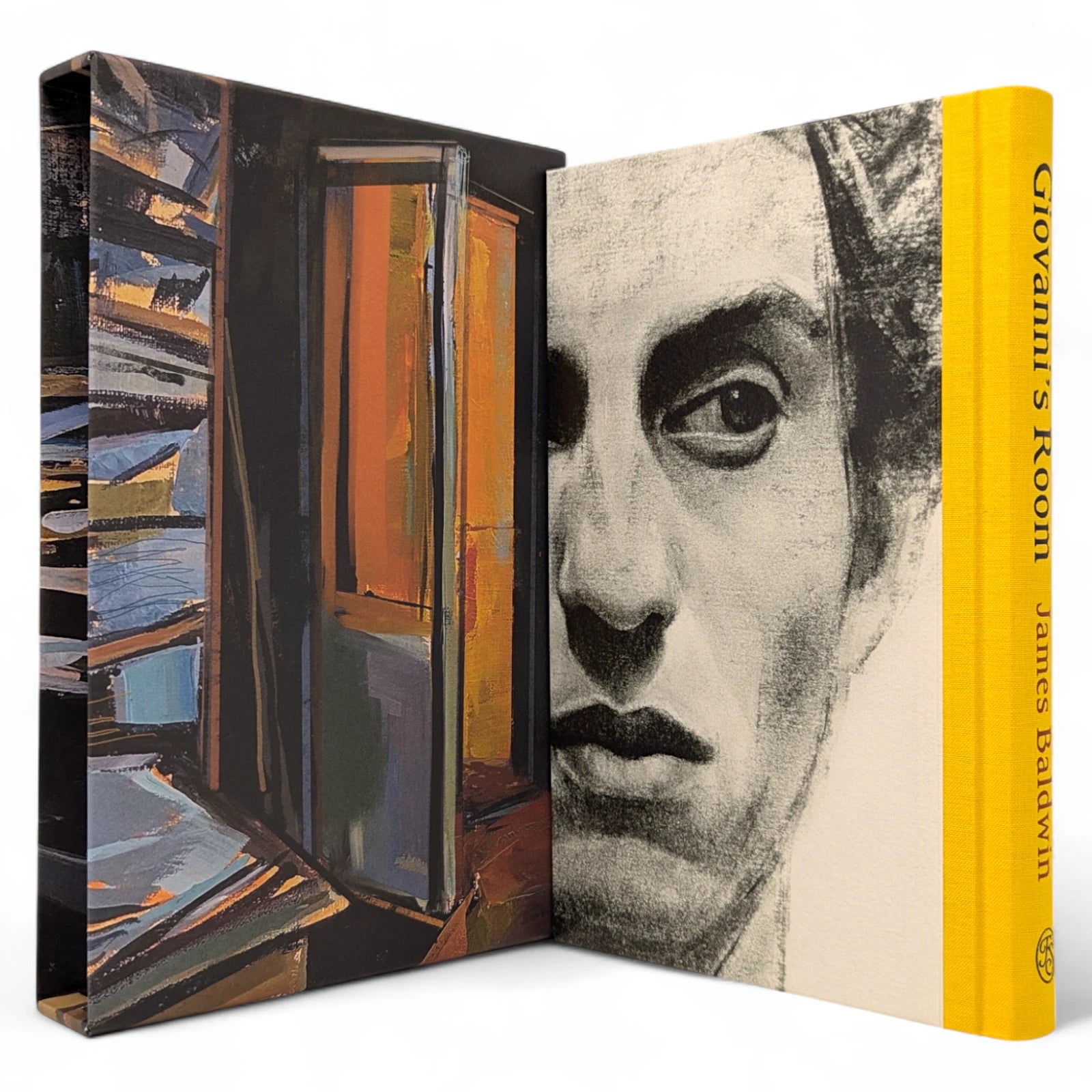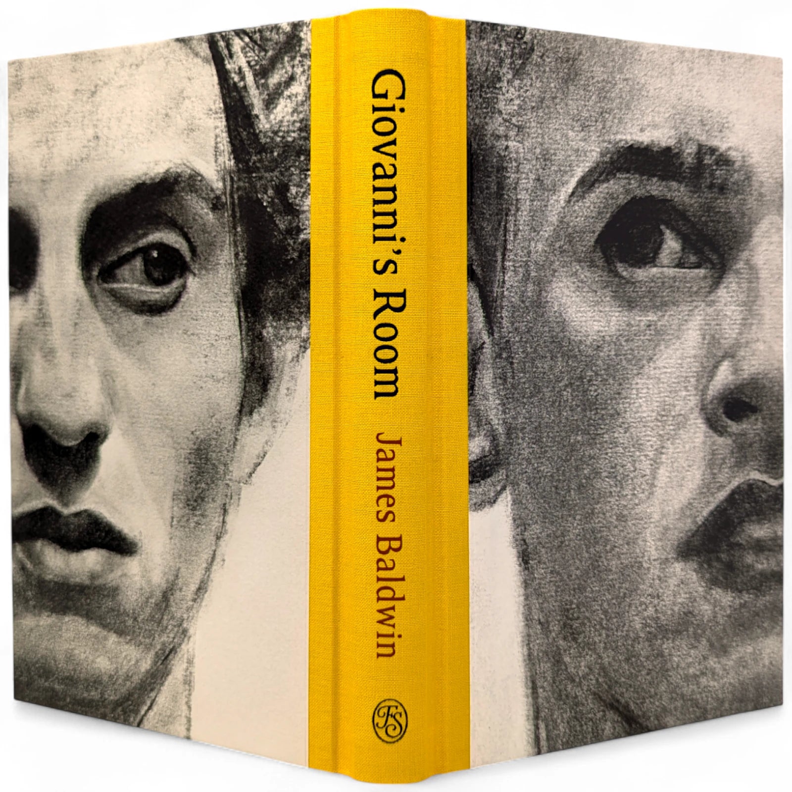 192 pages, sized 8¾˝ x 5½˝. Quarter-bound in blocked cloth with textured paper boards printed with intimate charcoal portraits of David and Giovanni. Typeset at The Folio Society in Garamond with Octavian as display. Printed on Abbey Pure Rough paper. Illustrated throughout with a frontispiece and 5 illustrations, including one double-page spread. With printed slipcase featuring a wrap-around illustration of Giovanni's Room.