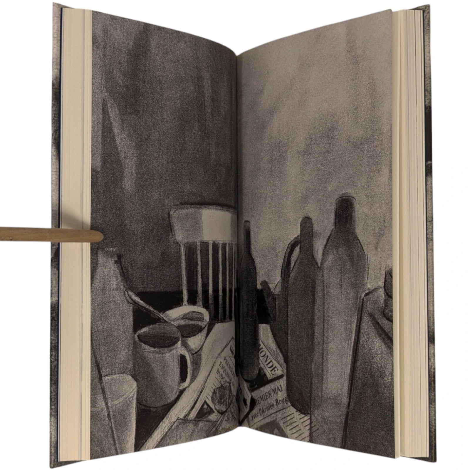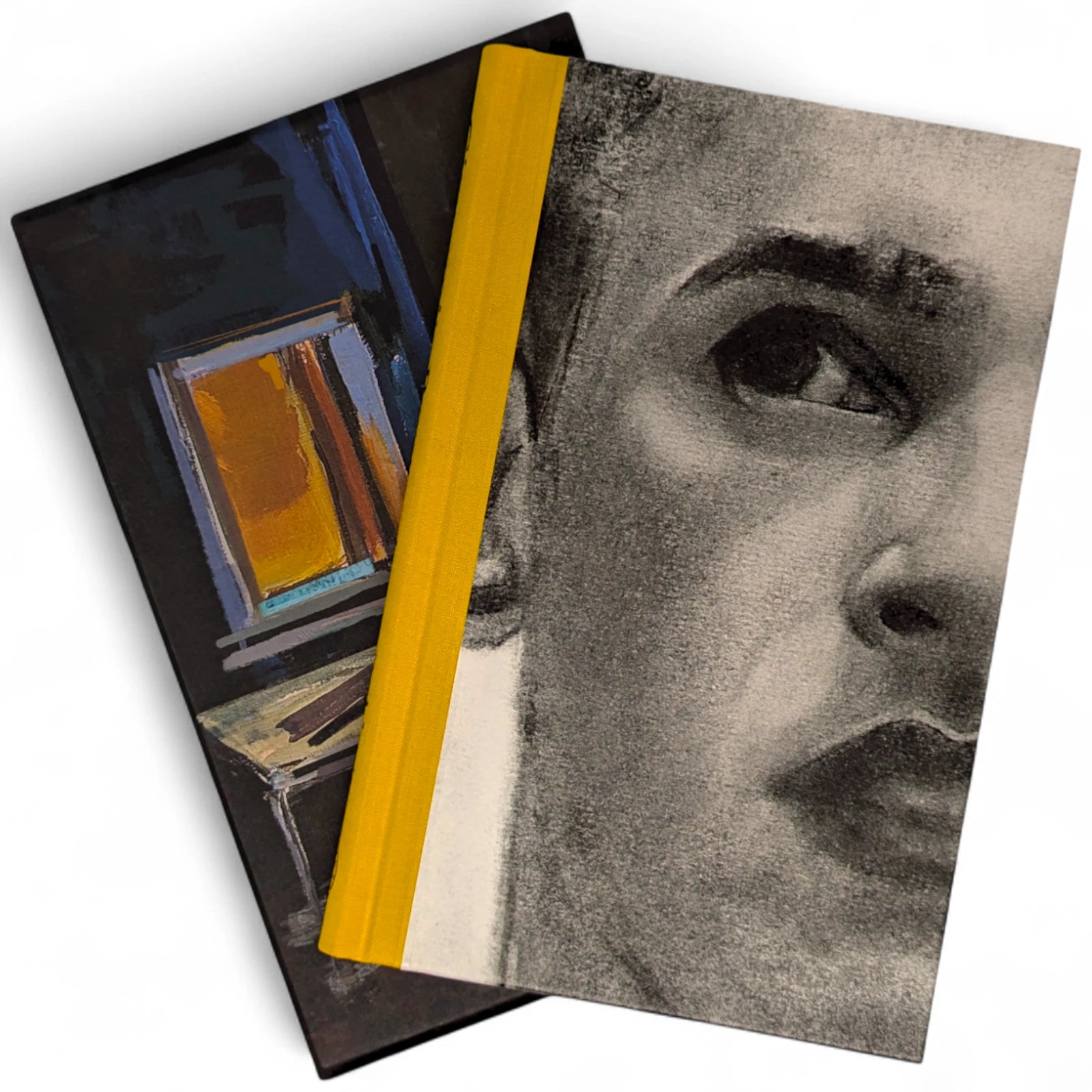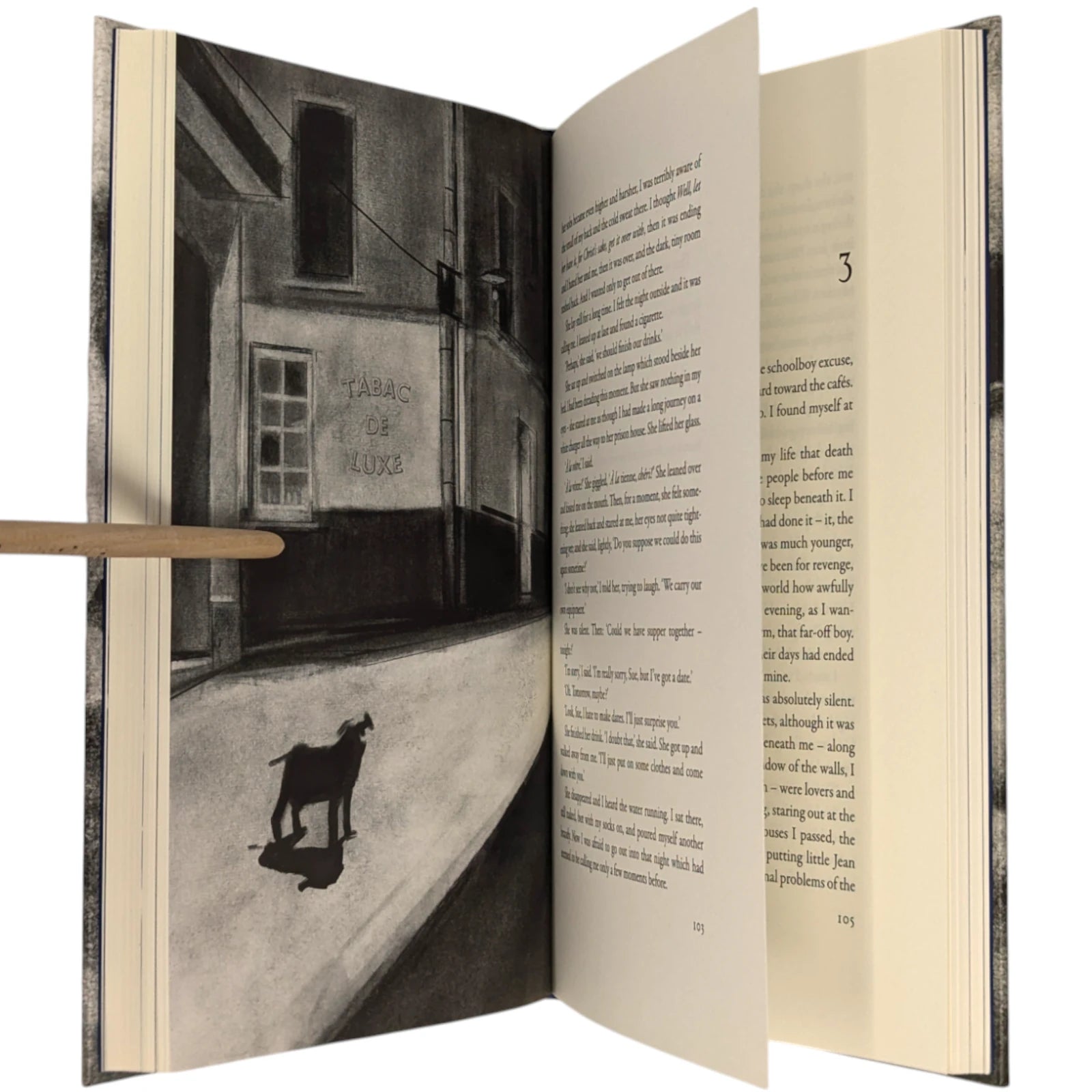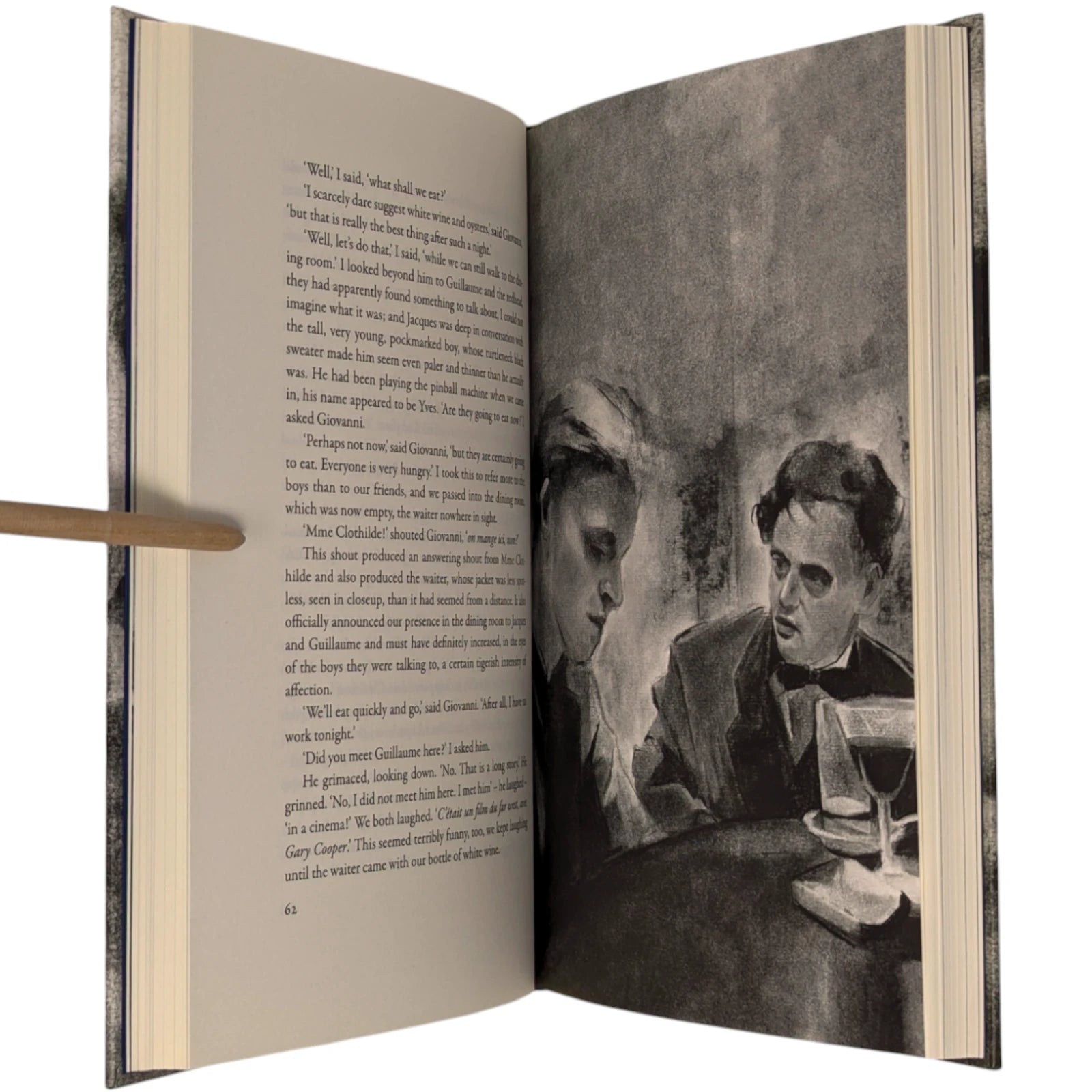 192 pages, sized 8¾˝ x 5½˝. Quarter-bound in blocked cloth with textured paper boards printed with intimate charcoal portraits of David and Giovanni. Typeset at The Folio Society in Garamond with Octavian as display. Printed on Abbey Pure Rough paper. Illustrated throughout with a frontispiece and 5 illustrations, including one double-page spread. With printed slipcase featuring a wrap-around illustration of Giovanni's Room.