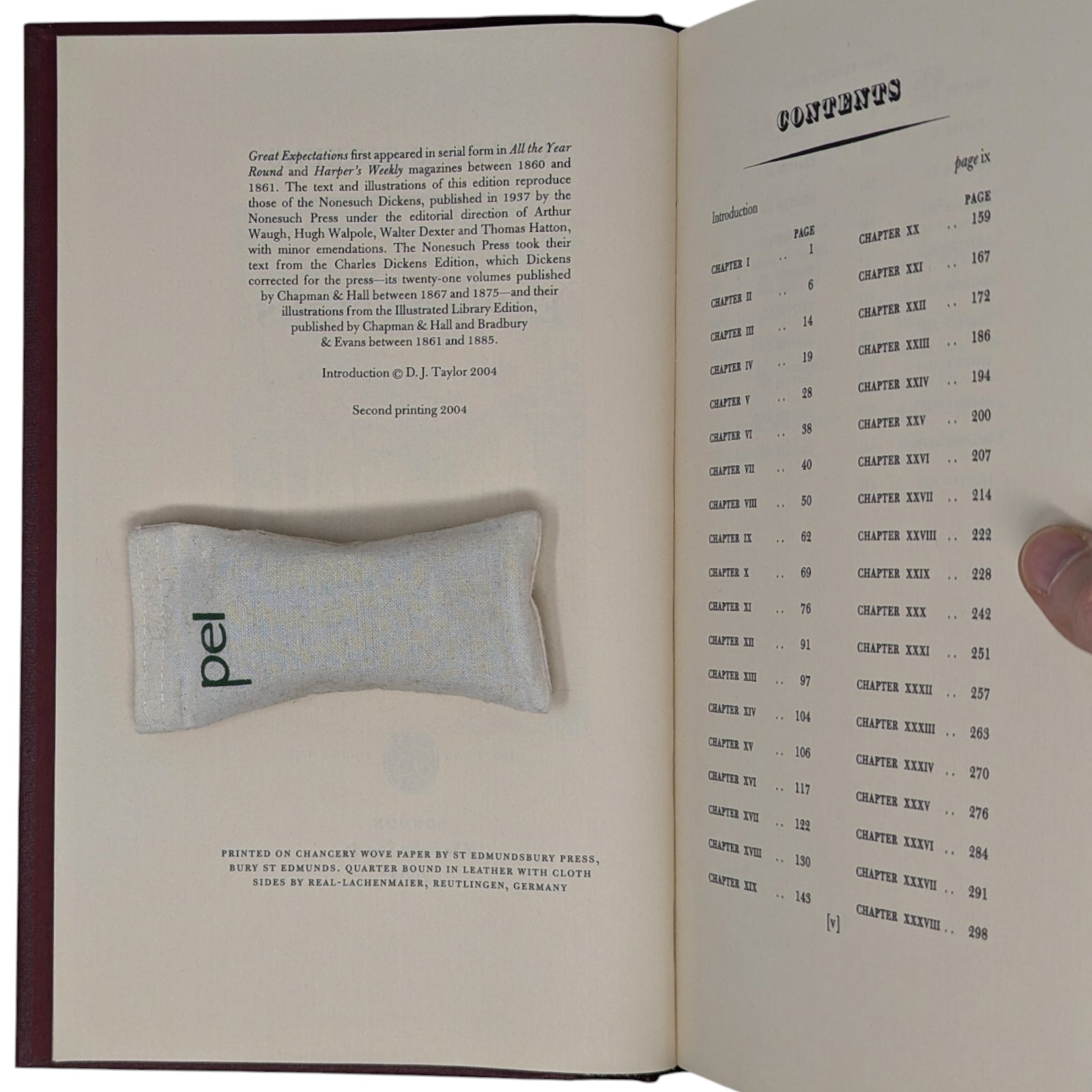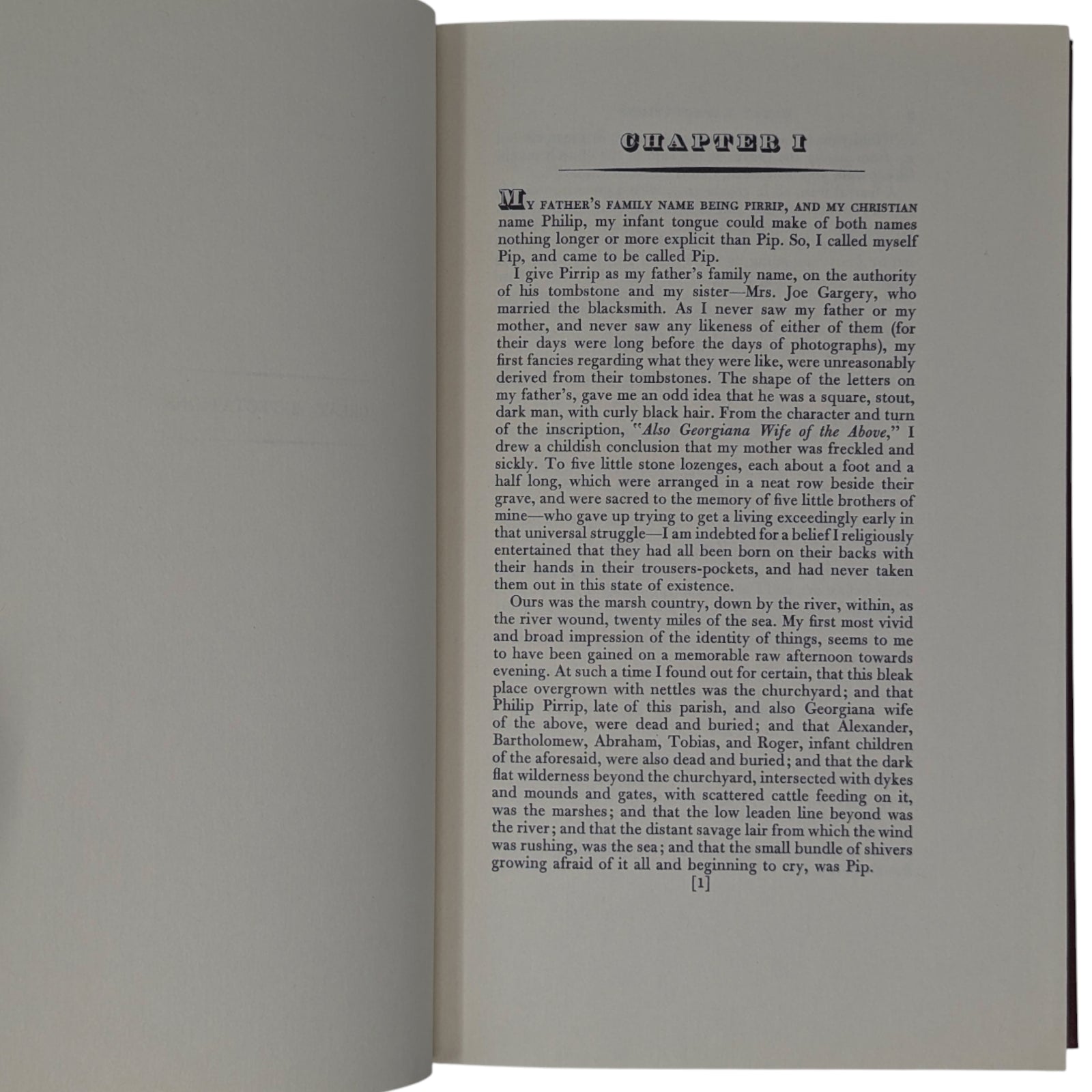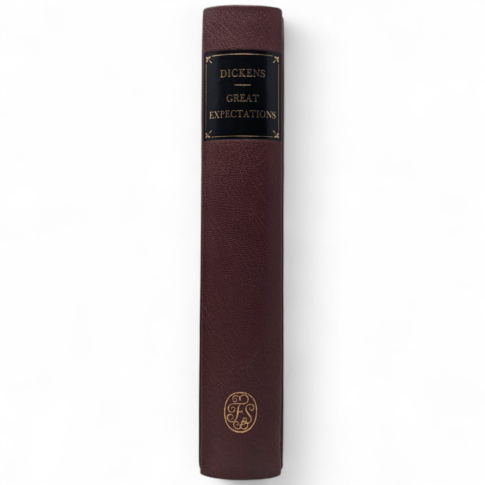 Great Expectations by Charles Dickens. London: The Folio Society, [2004]. With the original illustrations by Marcus Stone, introduction by D.J. Taylor. 262 × 170 × 45 mm. Pp. [i–iv] v–xv [xvi–xviii], 1–478. Type: Bulmer with Verdi for display. Typeset by R. and R. Clark for the Nonesuch Press in 1937 (the preliminaries by Folio), printed by the Saint Edmundsbury Press. Bound by Real Lachenmaier in series binding (see item 1197). The illustrations consist of eight full-page wood-engravings (on pages [iii], [81], [145], [179], [239], [359], [415] and [475]). This title was the ‘Castaway’s Choice’ of several celebrities.