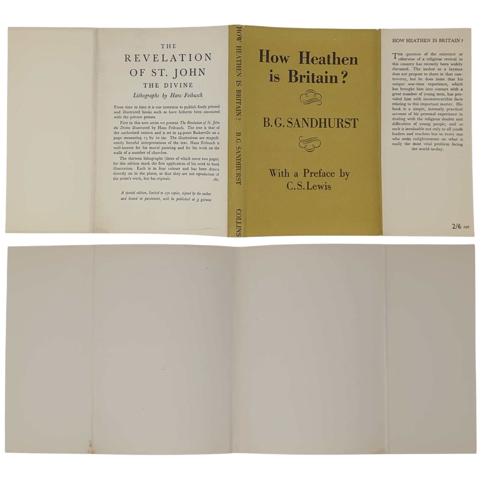 SANDHURST, B. G. (GREEN, Charles Henry). How Heathen is Britain? London: Collins, 1946. First edition, first printing of the author's examination of Britain's declining Christian faith through his unique war-time experiences that brought him into contact with a great number of young people. With an essay "On the Transmission of Christianity" written by C. S. Lewis and which was first published as a preface to this slim book.
