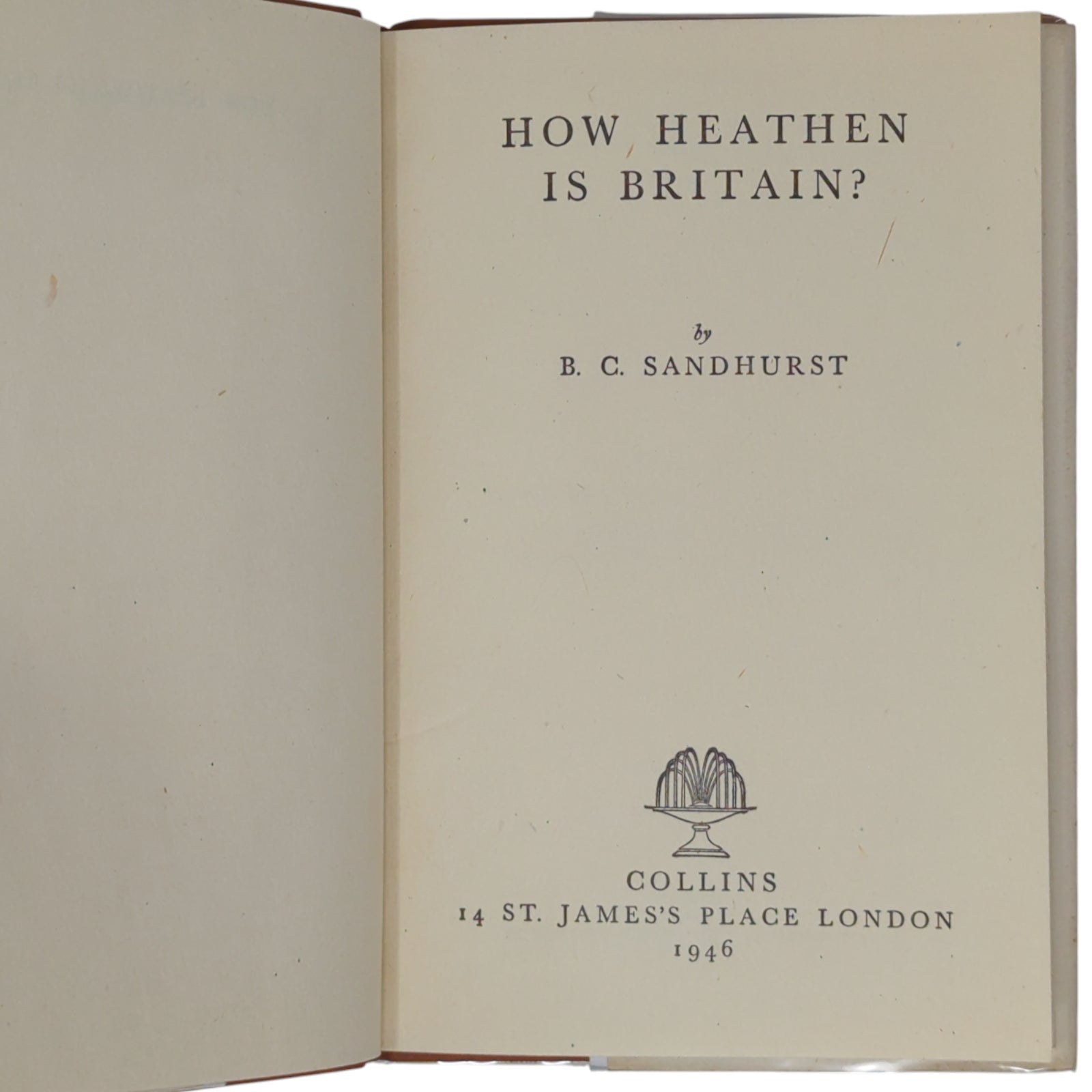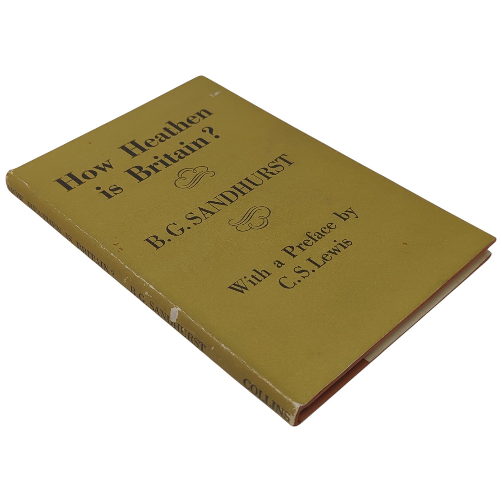 SANDHURST, B. G. (GREEN, Charles Henry). How Heathen is Britain? London: Collins, 1946. First edition, first printing of the author's examination of Britain's declining Christian faith through his unique war-time experiences that brought him into contact with a great number of young people. With an essay "On the Transmission of Christianity" written by C. S. Lewis and which was first published as a preface to this slim book.