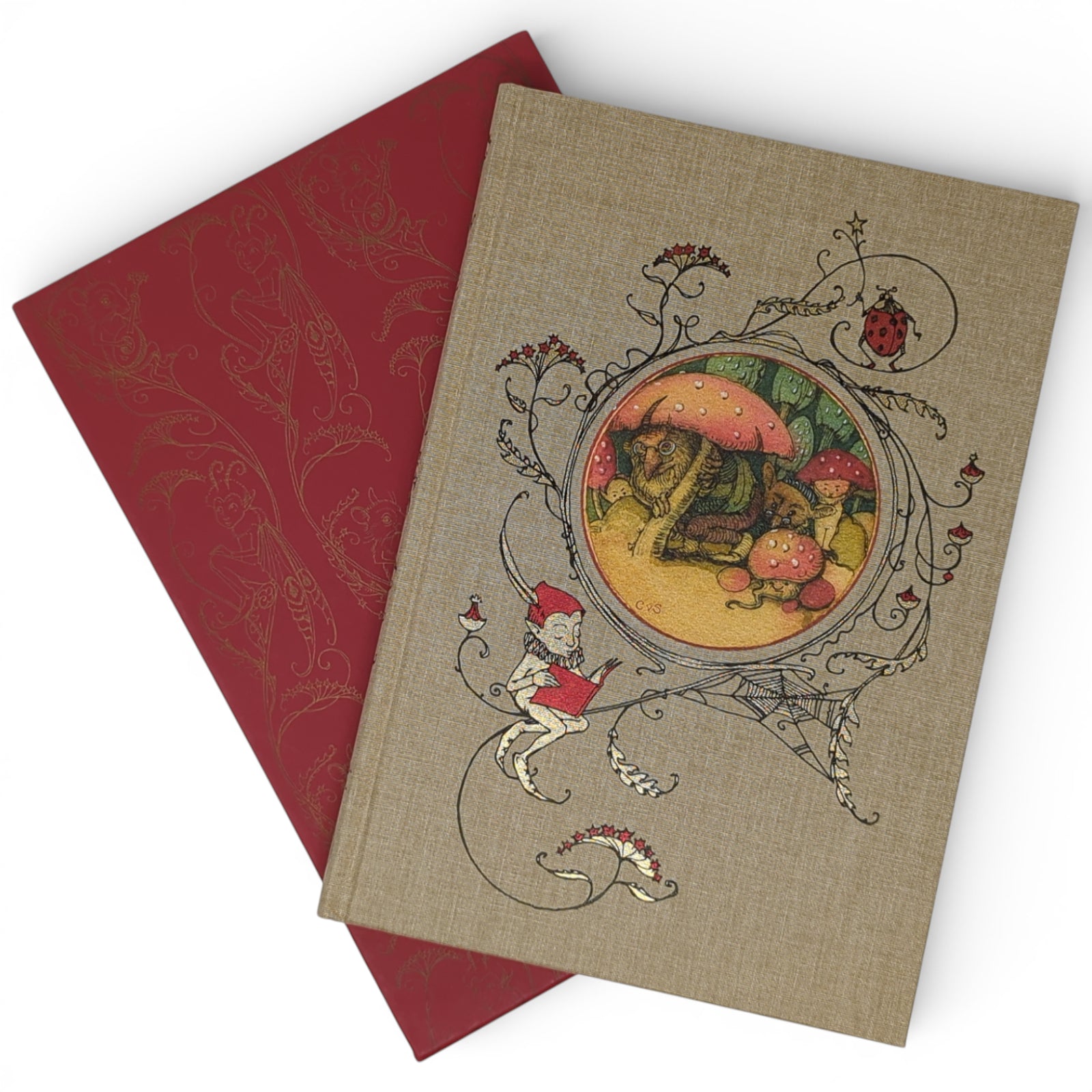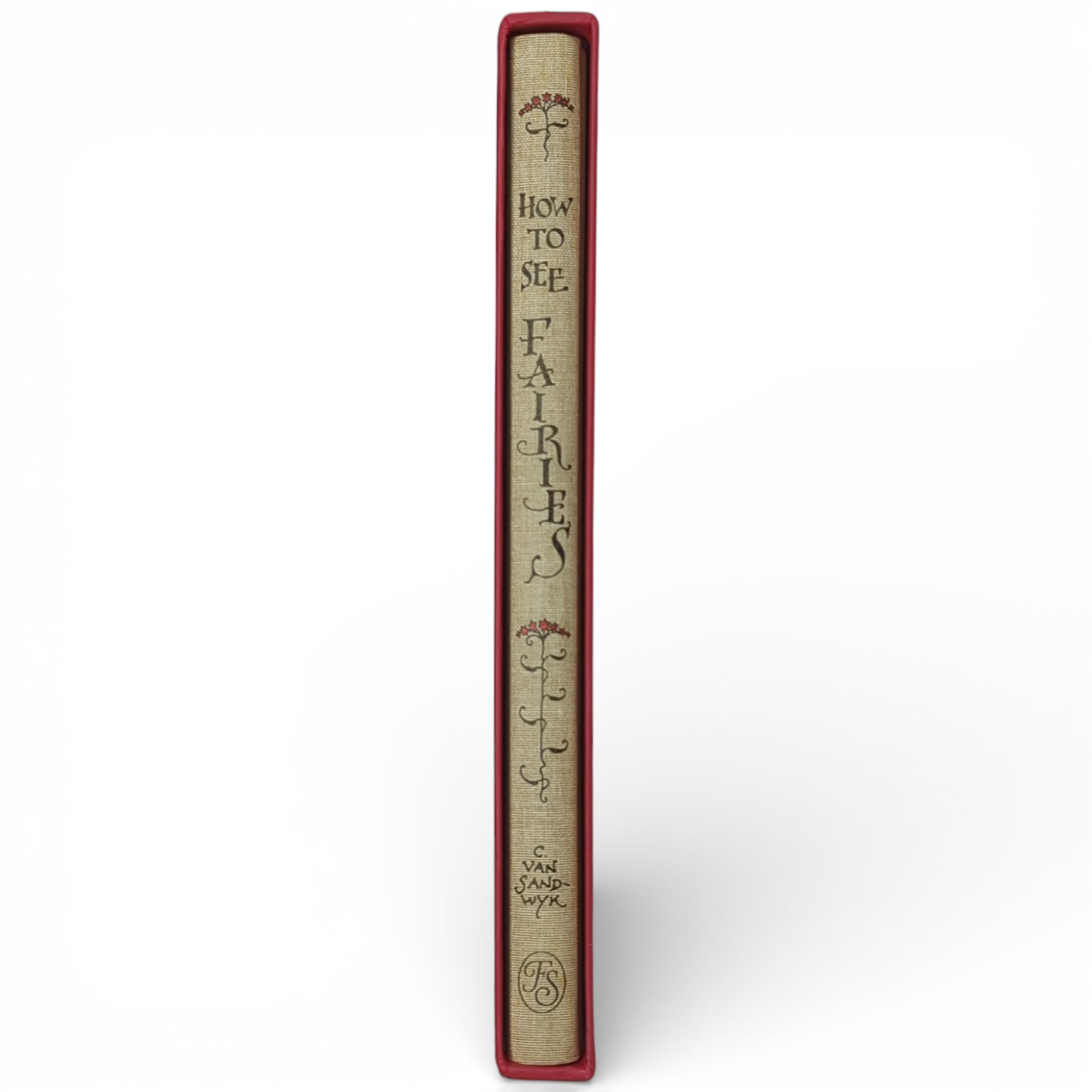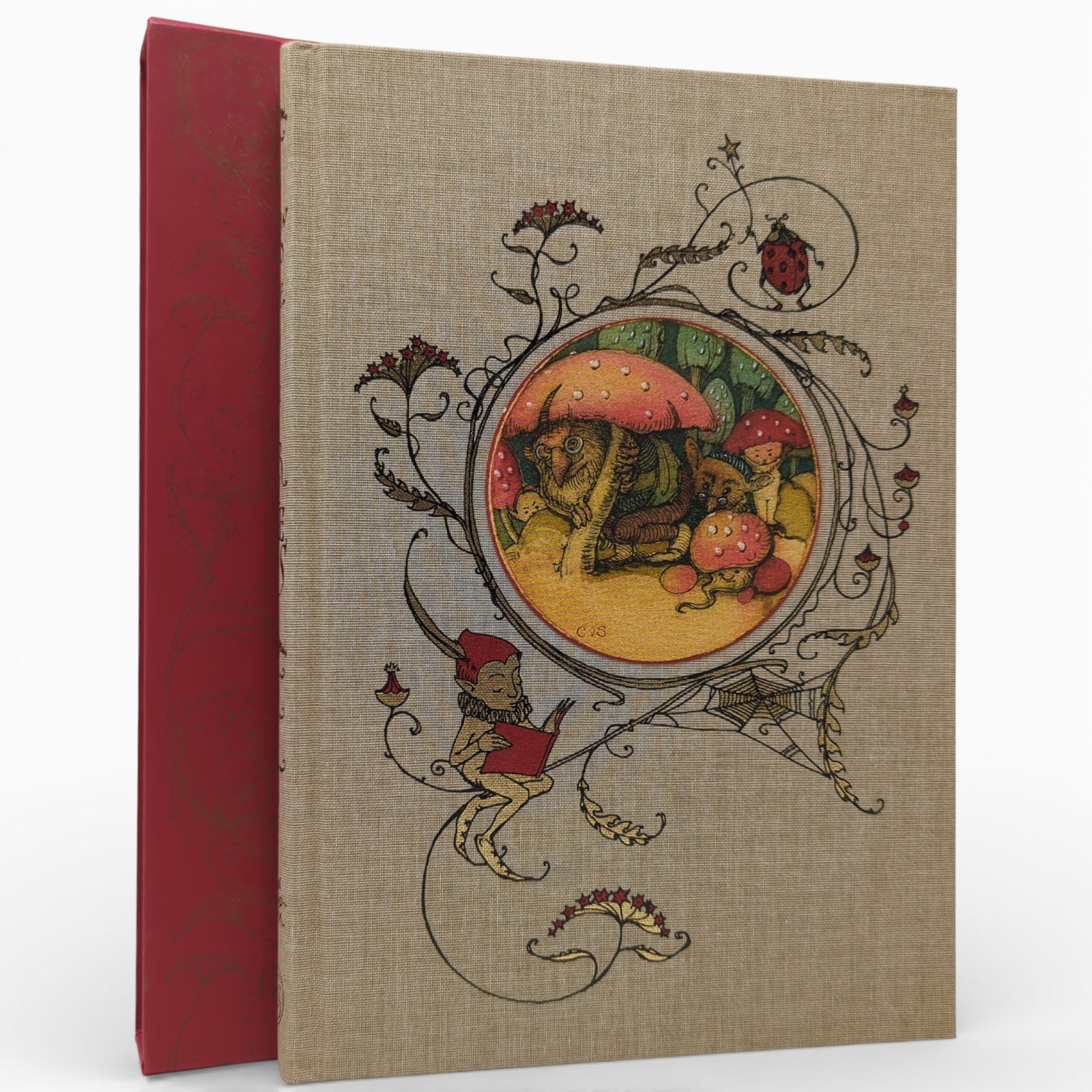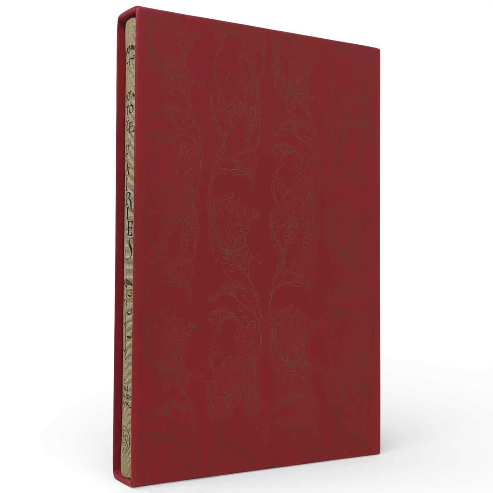 SANDWYK, Charles van. How to See Fairies, and Other Tales. Illustrated by Charles van Sandwyk. London: The Folio Society, 2018. Fourth printing thus, 2020. 253 × 175 × 16 mm. Pp. [1–4] 5–123 [124–128]. Type: Caslon with hand-drawn lettering. Printed and bound by L.E.G.O. in full brown cloth blocked in red, gold and black with a printed inset illustration; printed endleaves. Red slip case printed with repeat design in gold. A fold-out is tipped in on page [93] and extends to three colour pages.