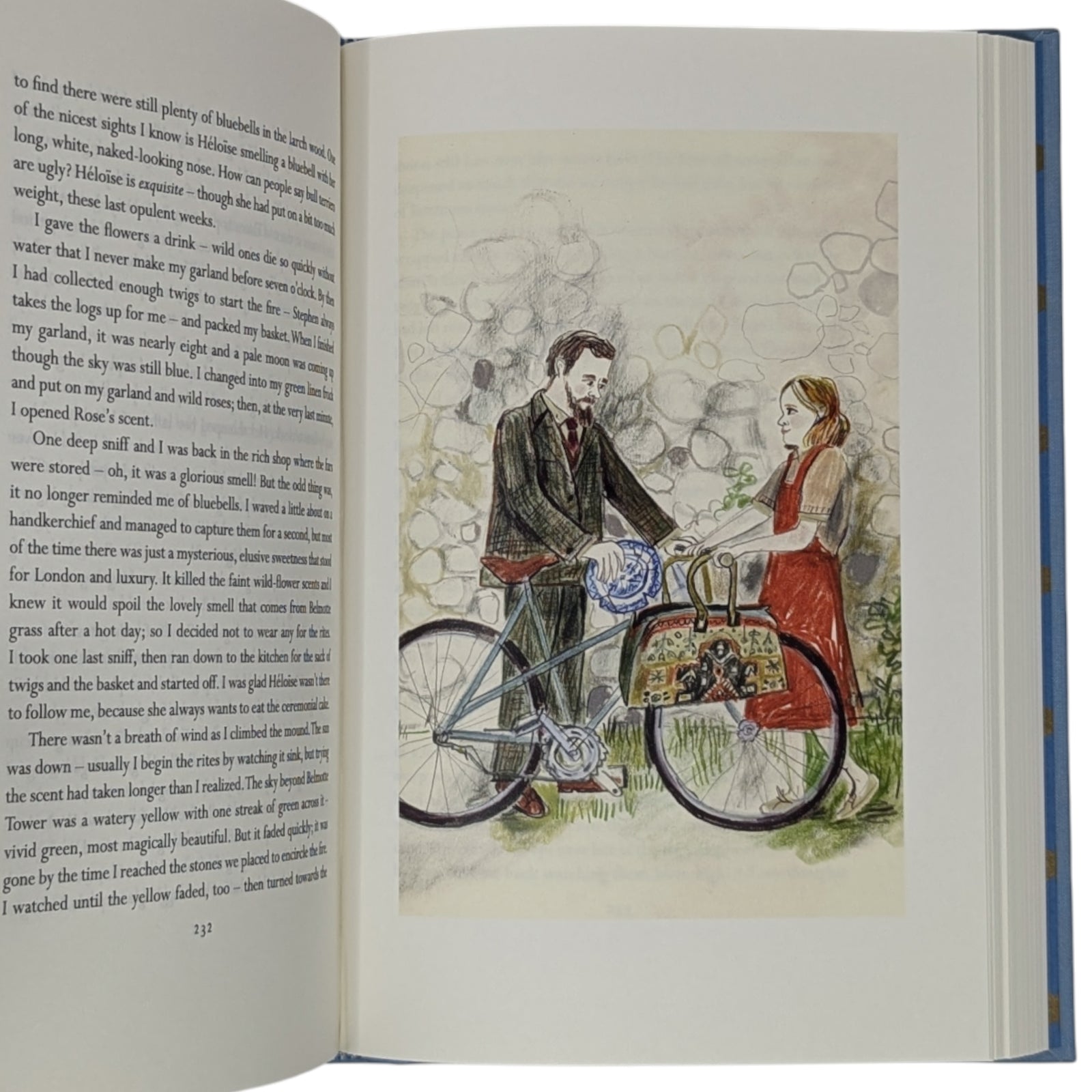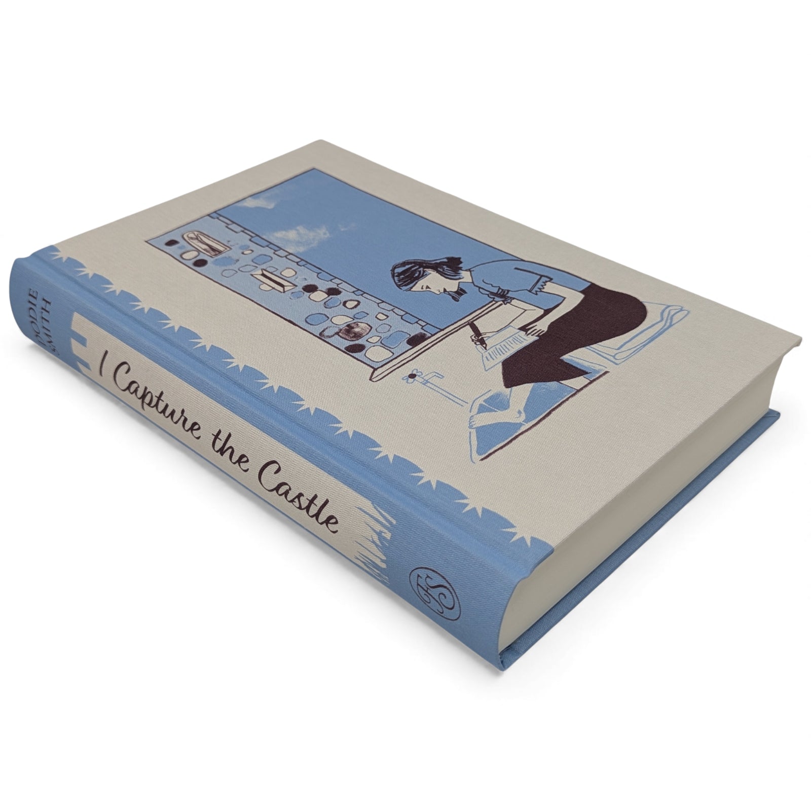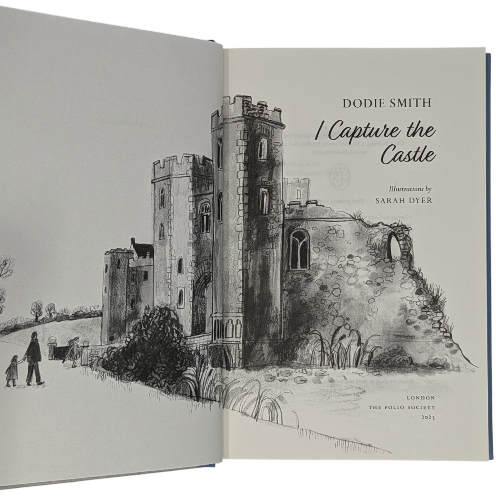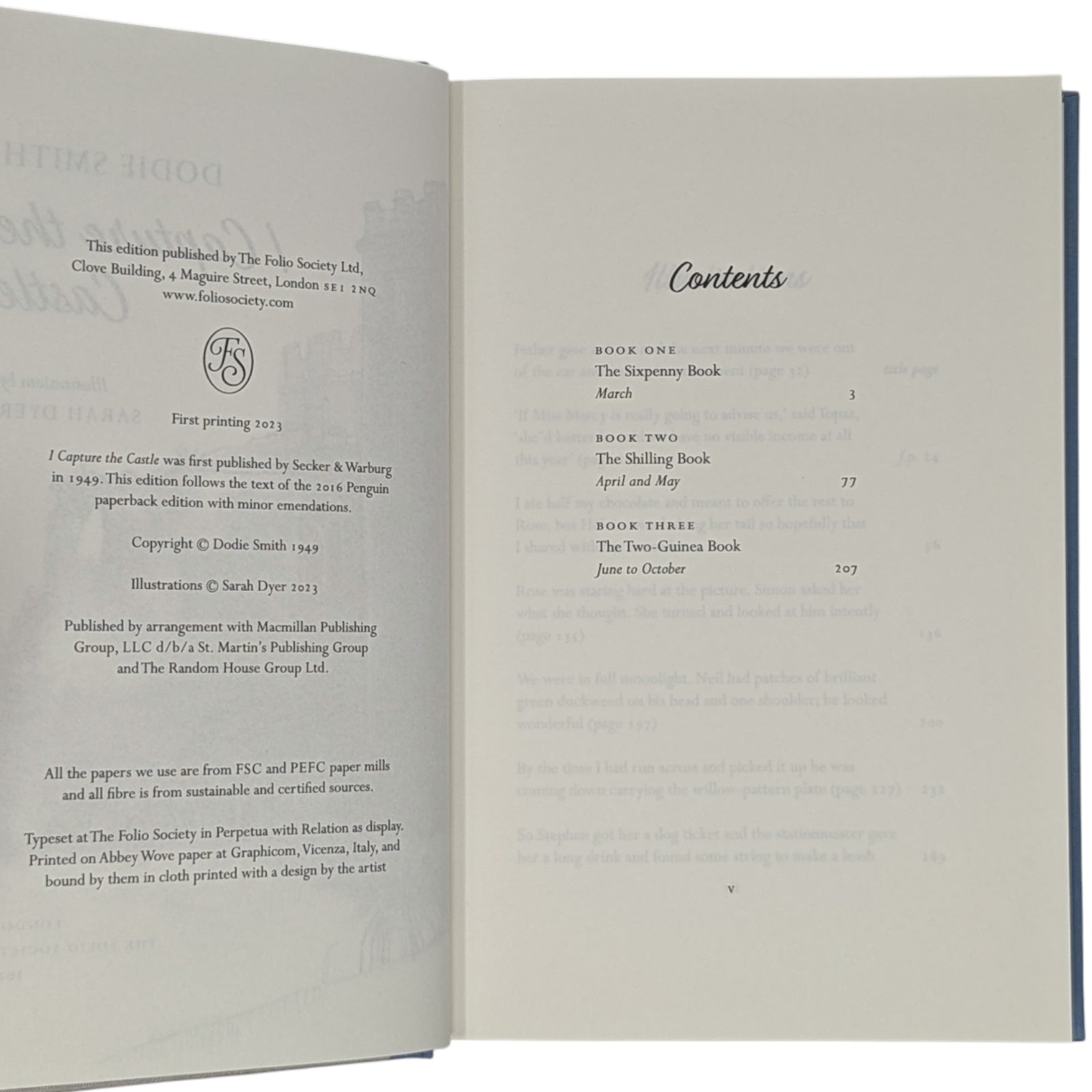 SMITH, Dodie. I Capture the Castle. London: The Folio Society, 2023. First printing thus. Illustrations by Sarah Dyer. 240 × 163 × 33 mm. Pp. [i–iv] v–vii [viii], [1–4] 5–383 [384]: [6] leaves of colour plates (facing pp. 24, 56, 136, 200, 232 and 289). Type: Perpetua with Relation for display. Printed and bound by Graphicom in full printed cloth with design by Dyer; blue end leaves printed with repeat stars in gold. Dark purple slip case. Dyer has also provided a title-page spread.