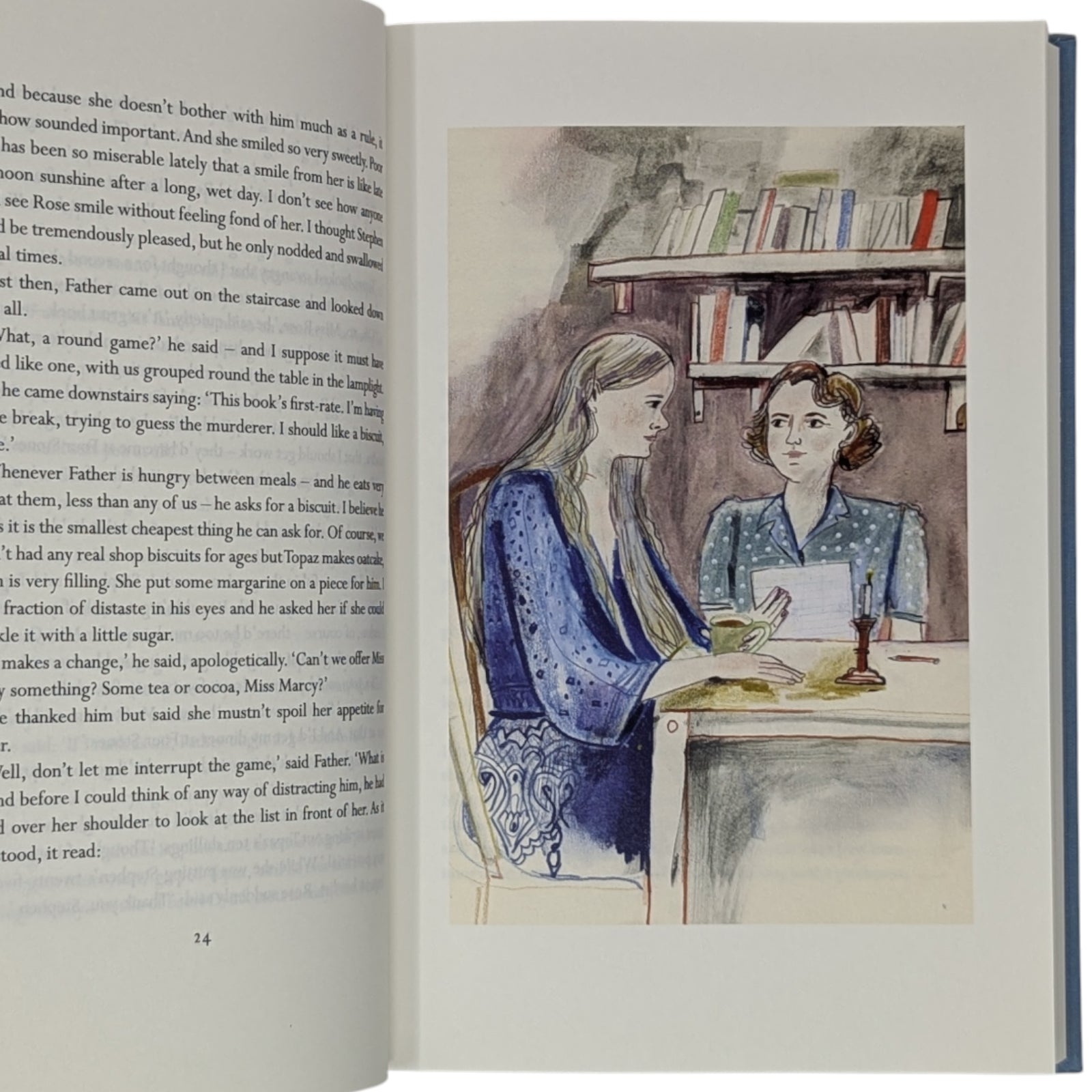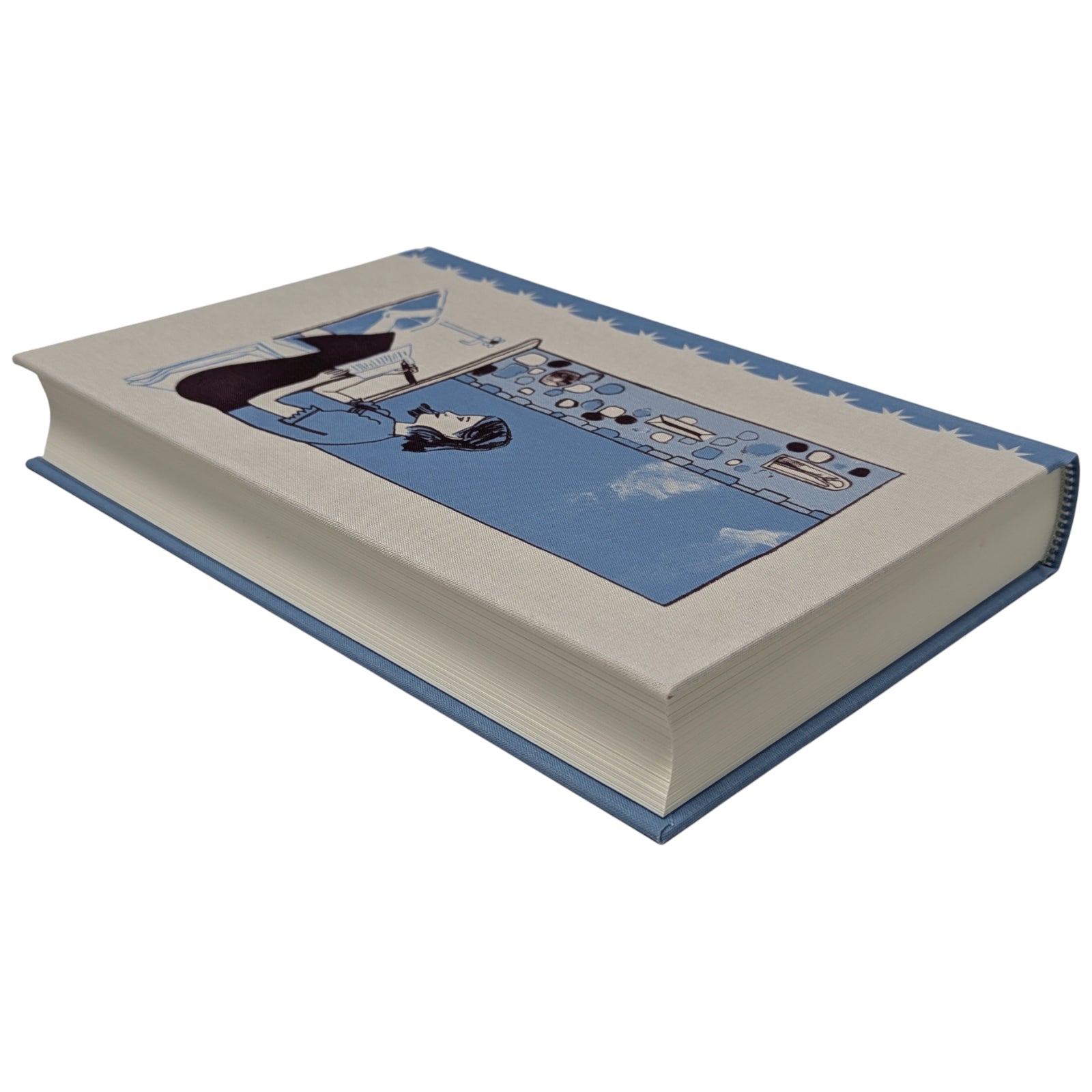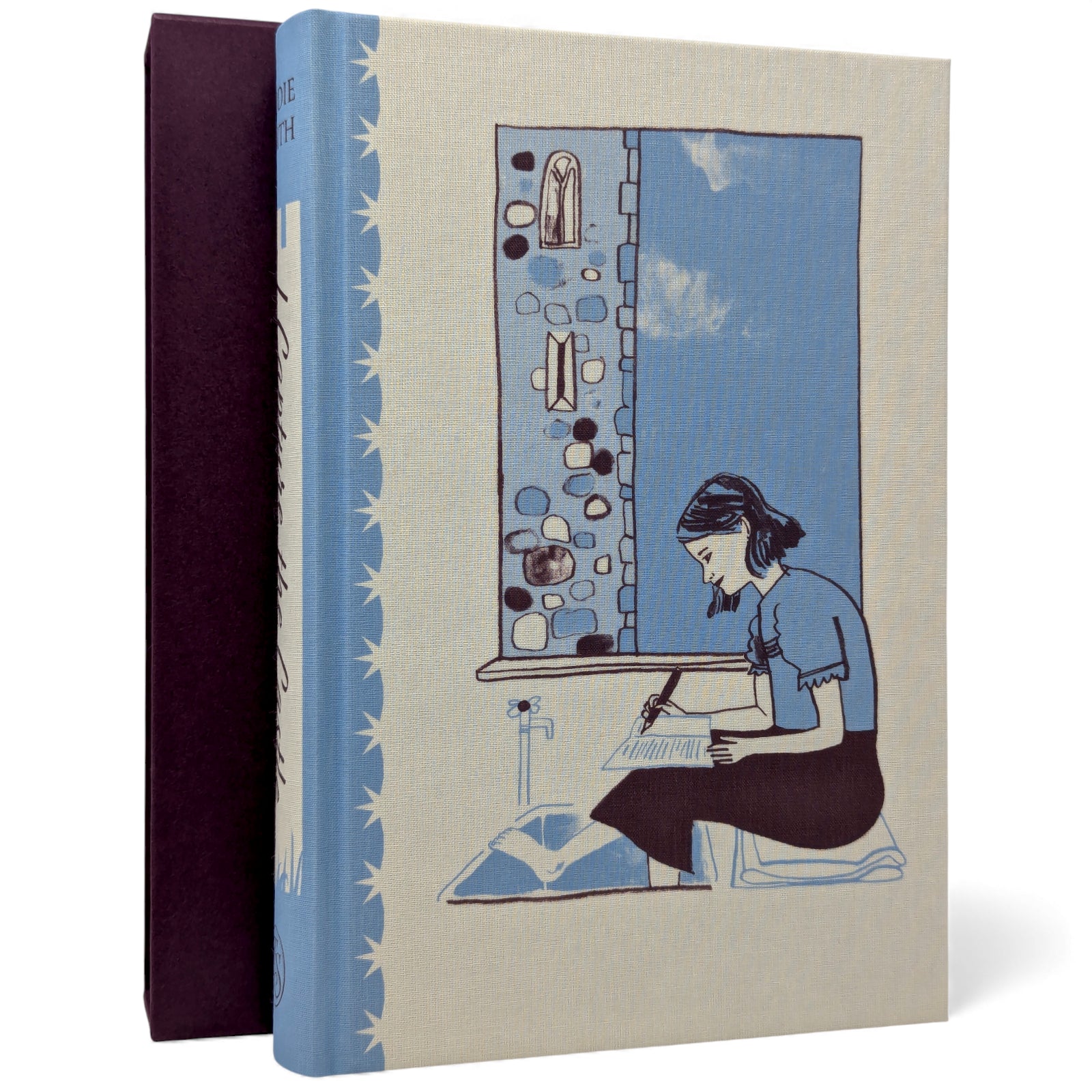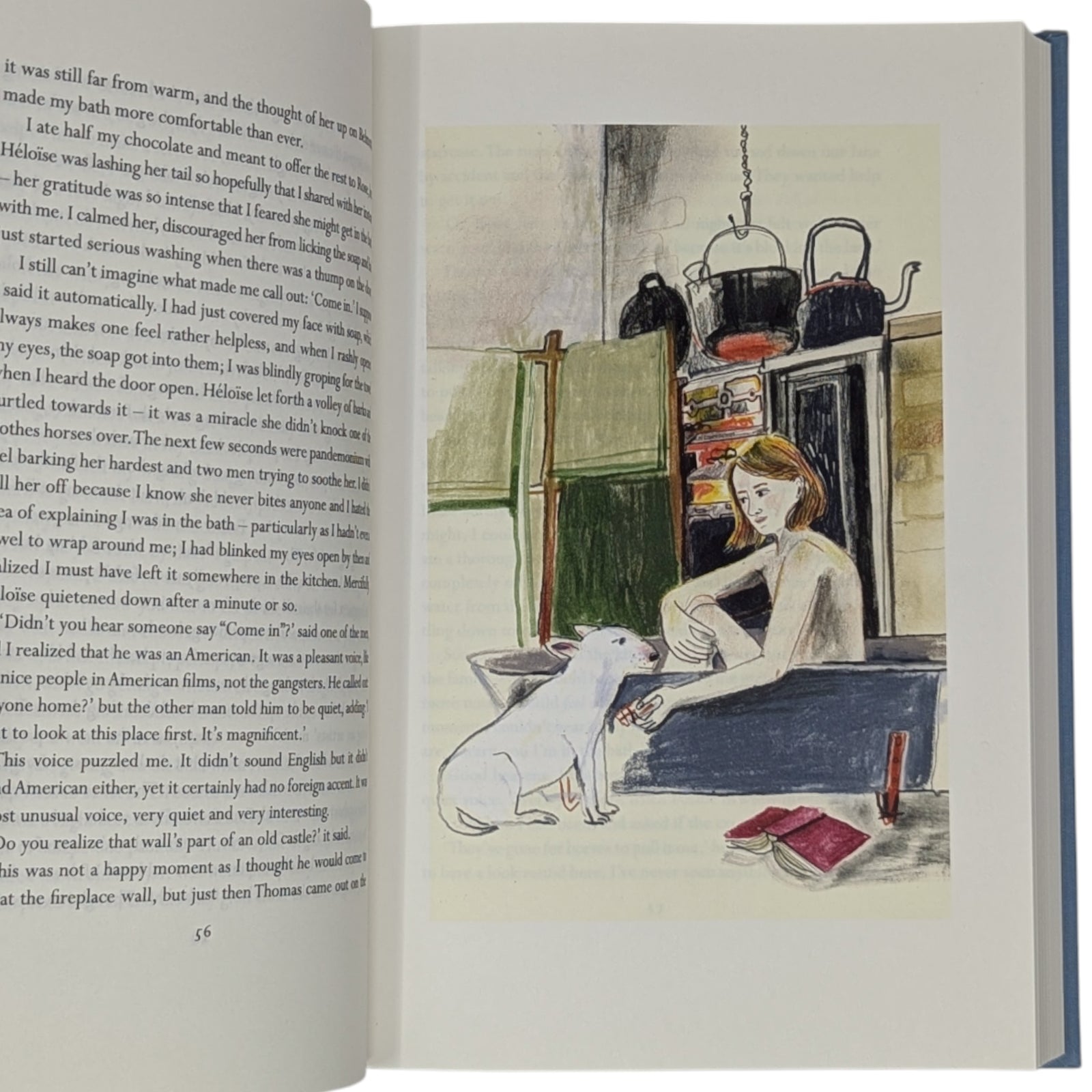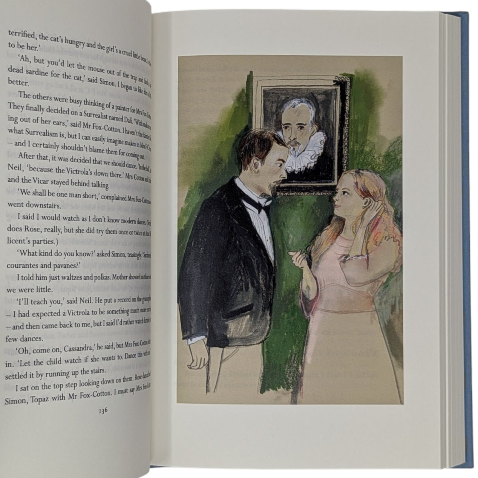 SMITH, Dodie. I Capture the Castle. London: The Folio Society, 2023. First printing thus. Illustrations by Sarah Dyer. 240 × 163 × 33 mm. Pp. [i–iv] v–vii [viii], [1–4] 5–383 [384]: [6] leaves of colour plates (facing pp. 24, 56, 136, 200, 232 and 289). Type: Perpetua with Relation for display. Printed and bound by Graphicom in full printed cloth with design by Dyer; blue end leaves printed with repeat stars in gold. Dark purple slip case. Dyer has also provided a title-page spread.
