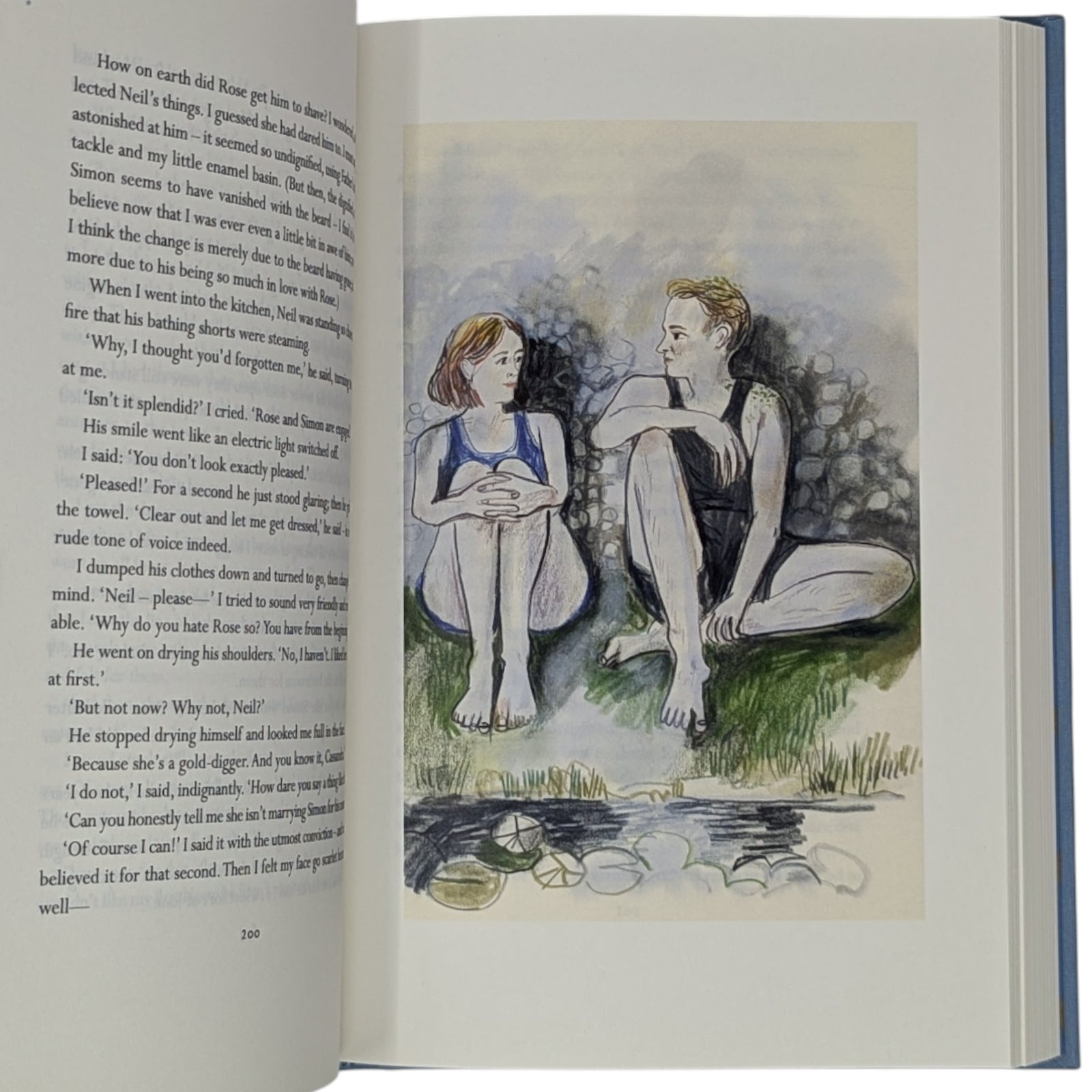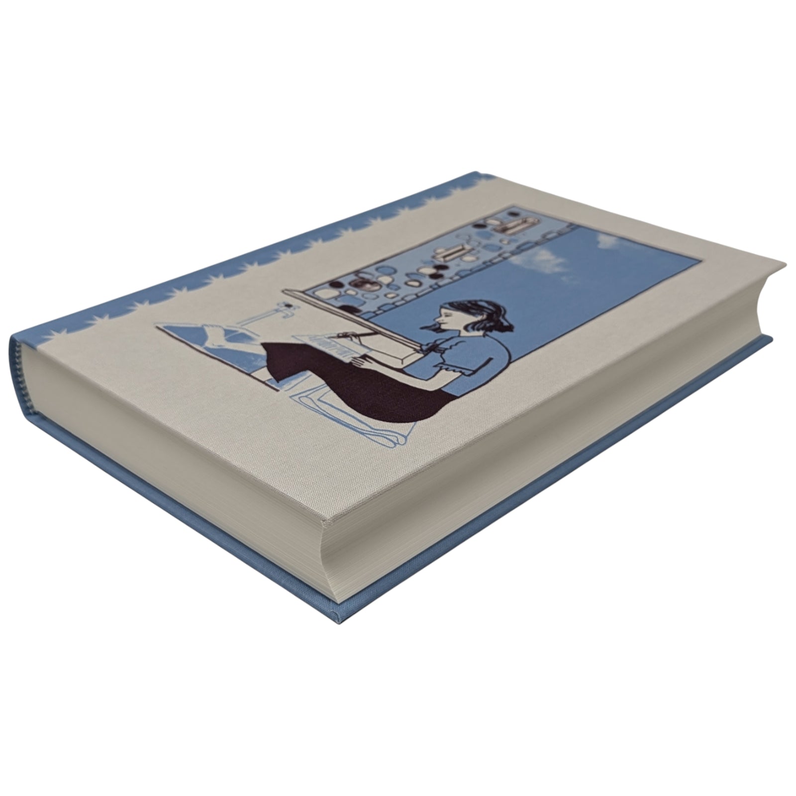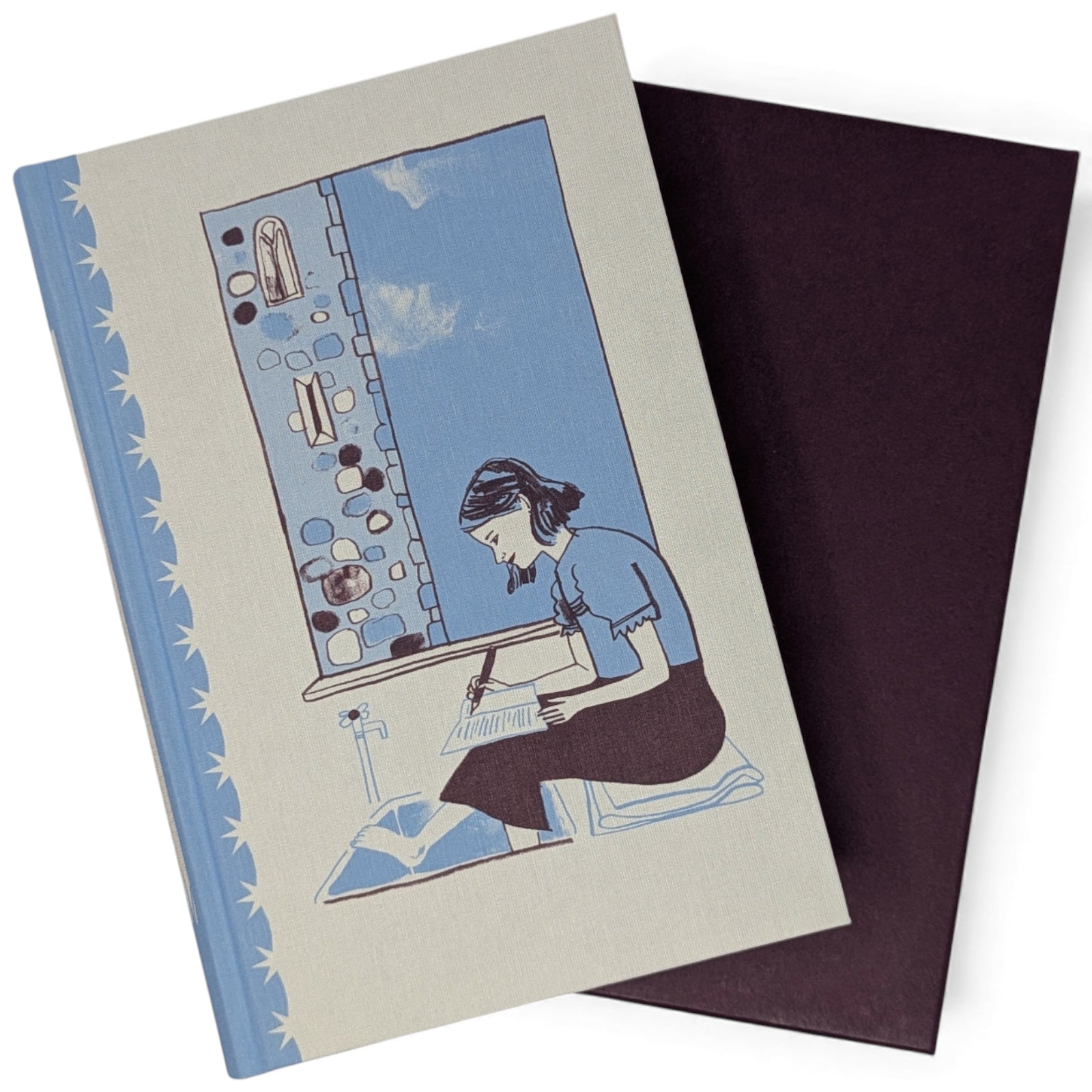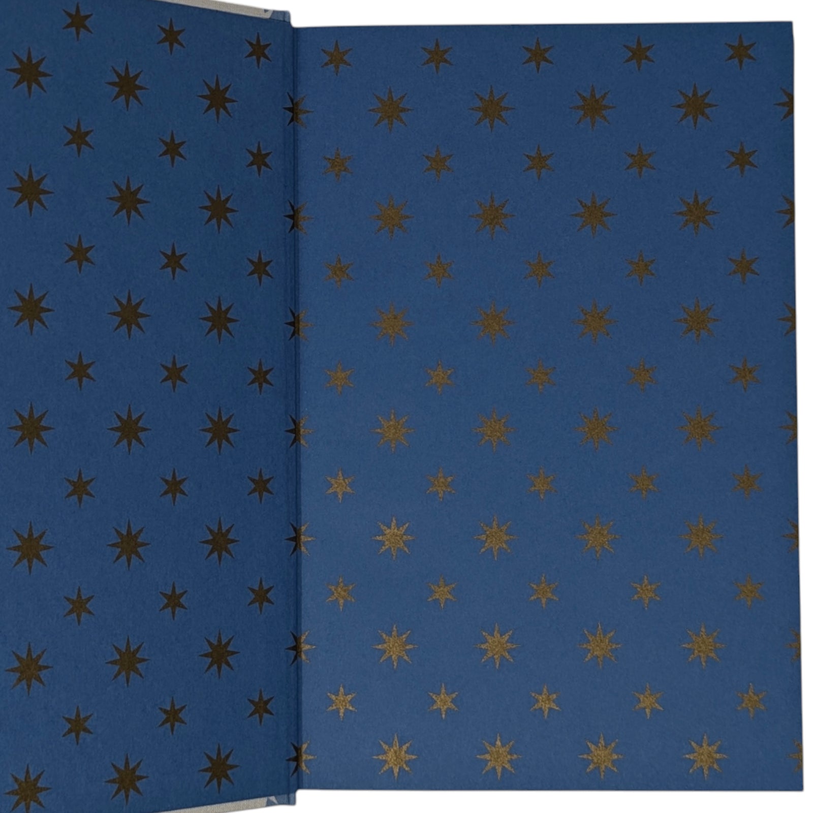 SMITH, Dodie. I Capture the Castle. London: The Folio Society, 2023. First printing thus. Illustrations by Sarah Dyer. 240 × 163 × 33 mm. Pp. [i–iv] v–vii [viii], [1–4] 5–383 [384]: [6] leaves of colour plates (facing pp. 24, 56, 136, 200, 232 and 289). Type: Perpetua with Relation for display. Printed and bound by Graphicom in full printed cloth with design by Dyer; blue end leaves printed with repeat stars in gold. Dark purple slip case. Dyer has also provided a title-page spread.