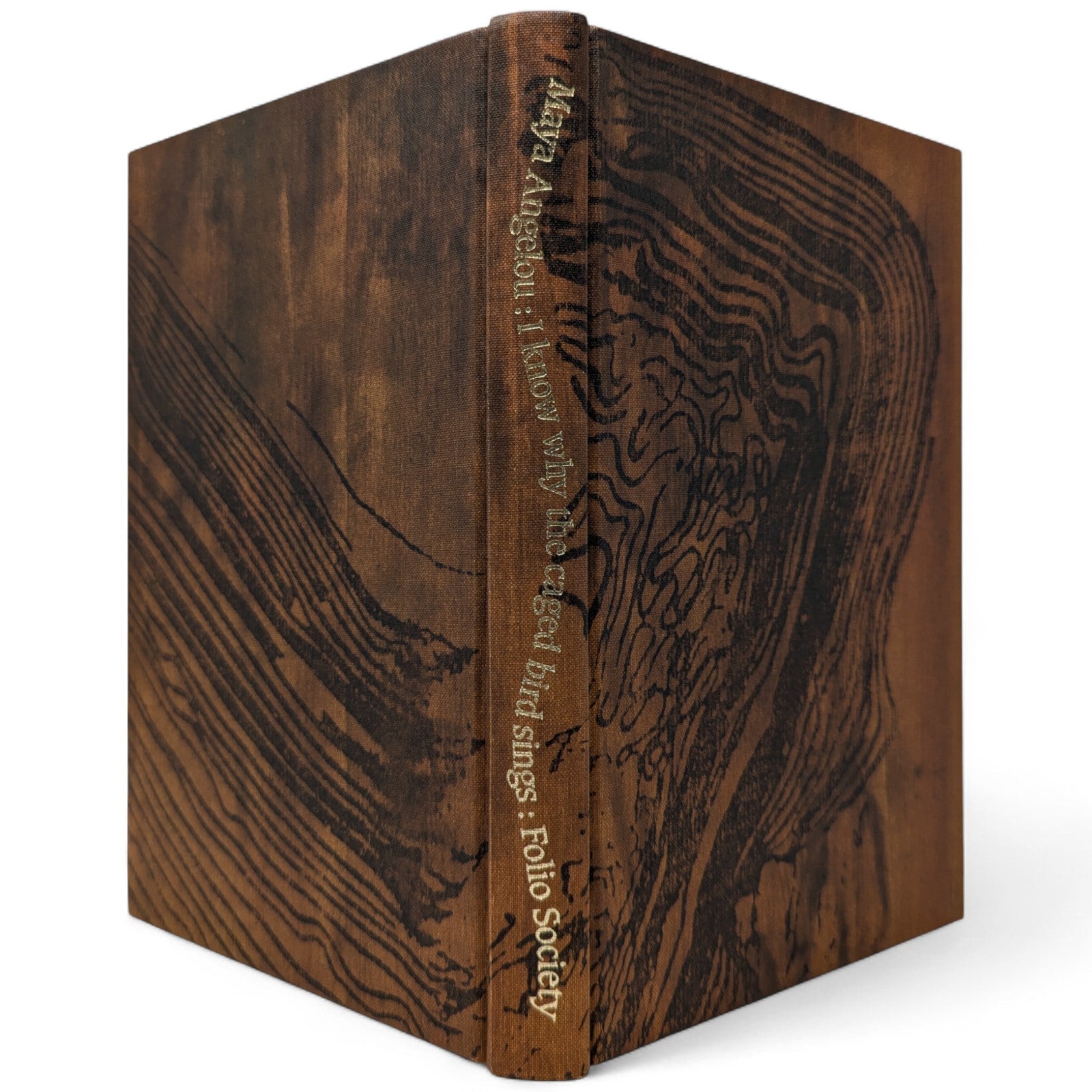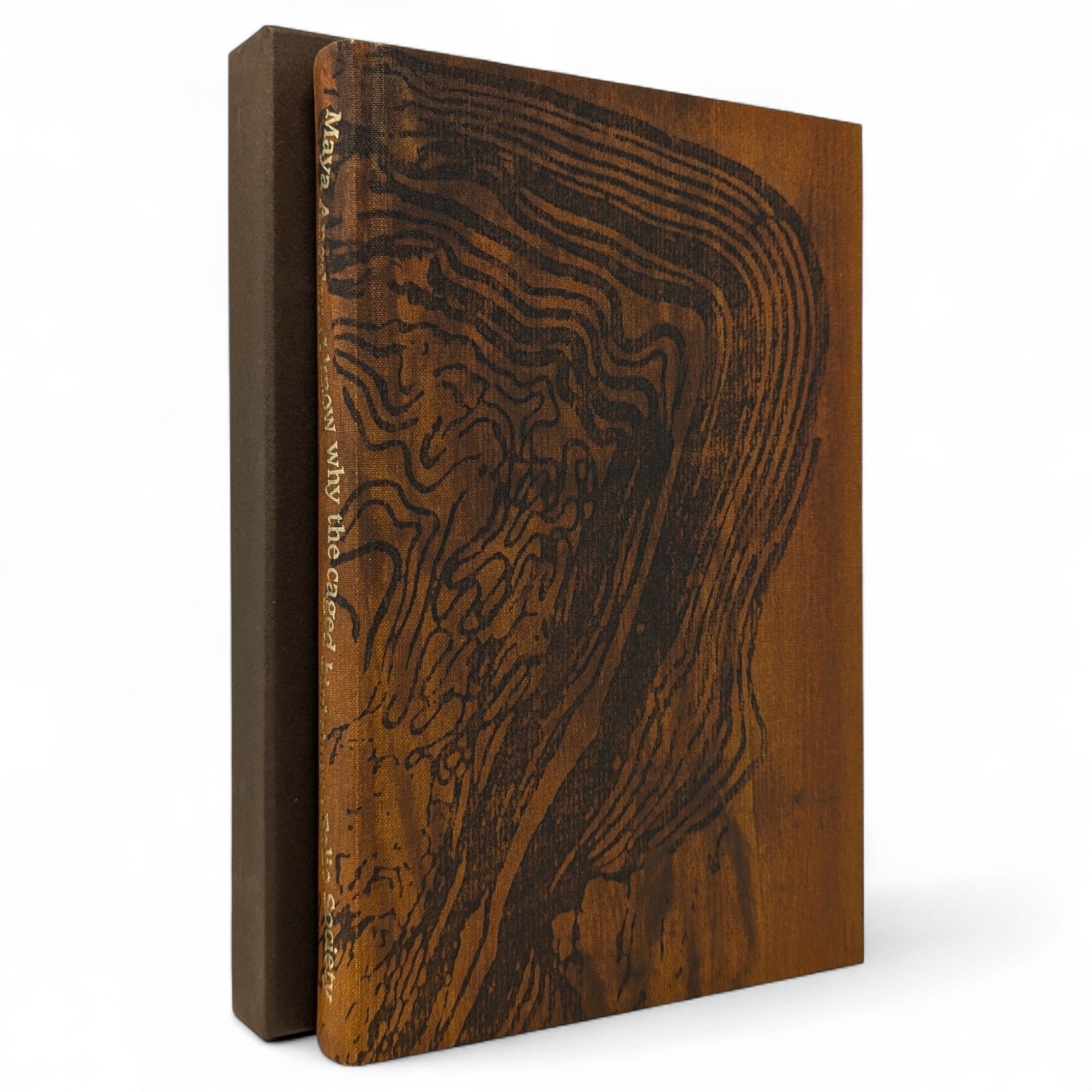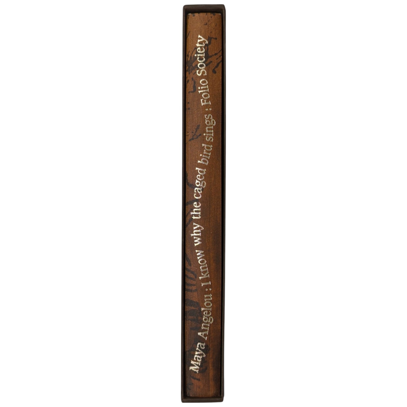 Maya Angelou, I Know Why the Caged Bird Sings. London: The Folio Society, 2000. Second printing thus, 2001. 252 × 167 × 25 mm. Pp. [1–10] 11–254 [255–256]. Type: Caxton. Printed by the Saint Edmundsbury Press. Bound by Cambridge University Press in full brown cloth with a design in dark brown by David Sellars; brown endleaves. Dark brown slip case. A rare unillustrated volume from Folio.