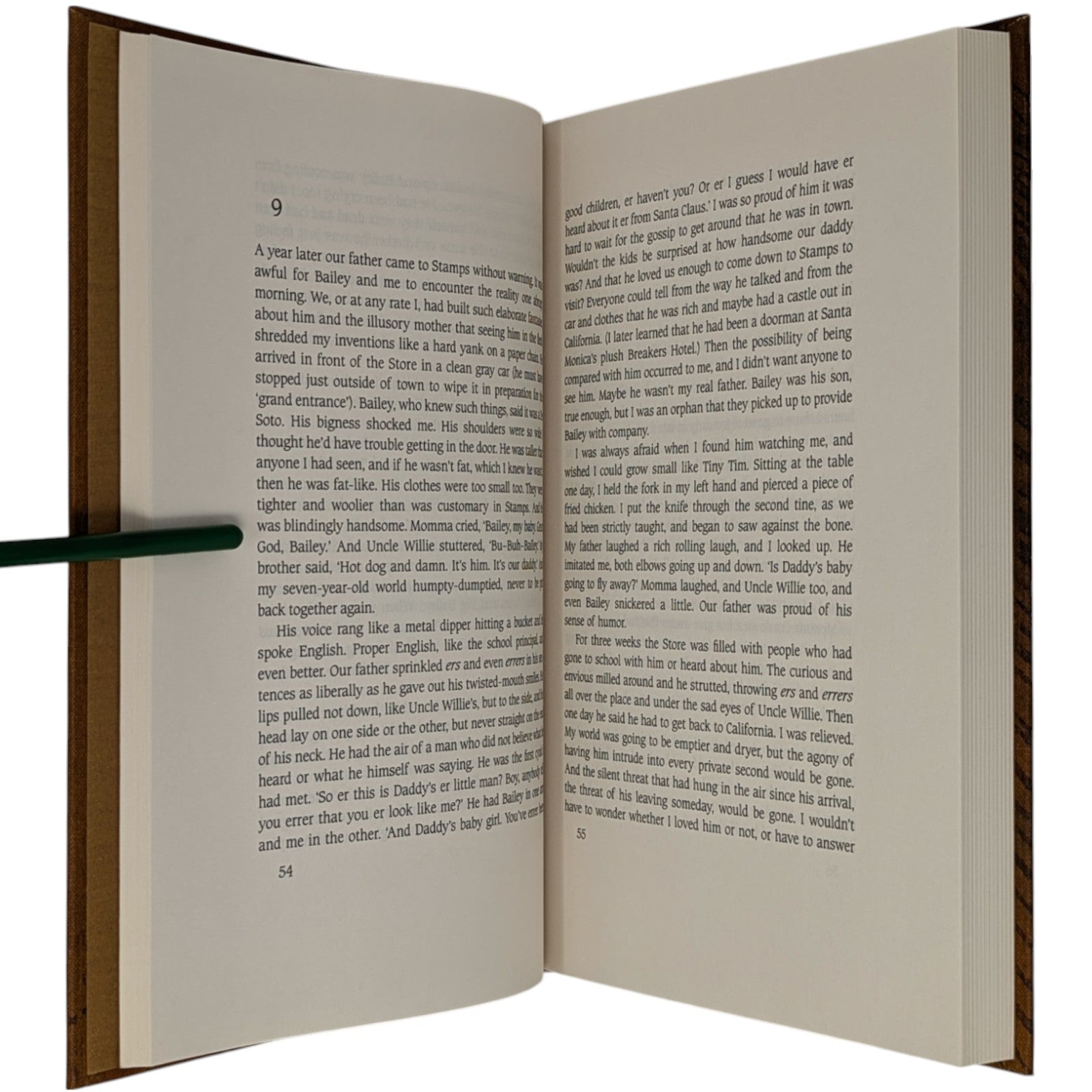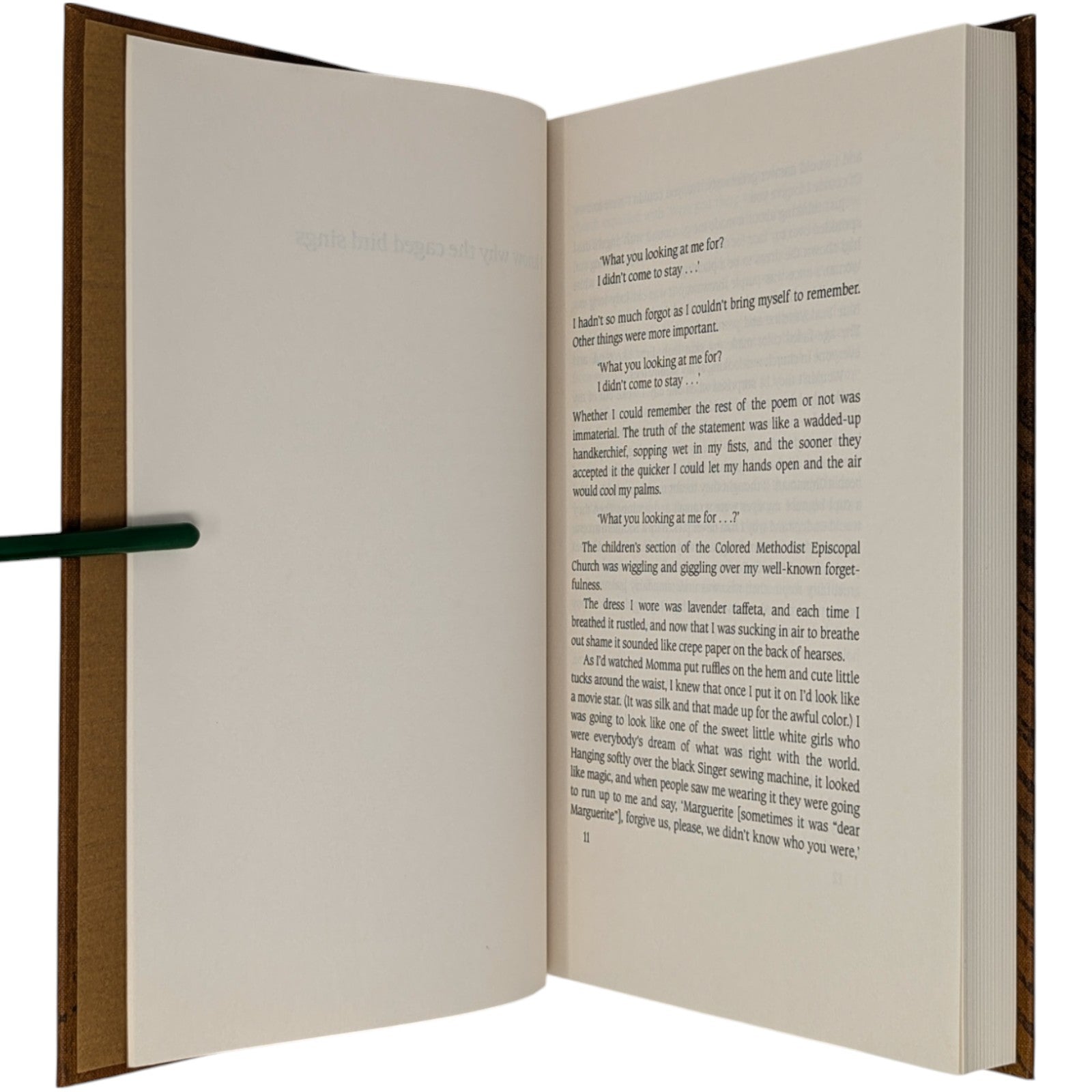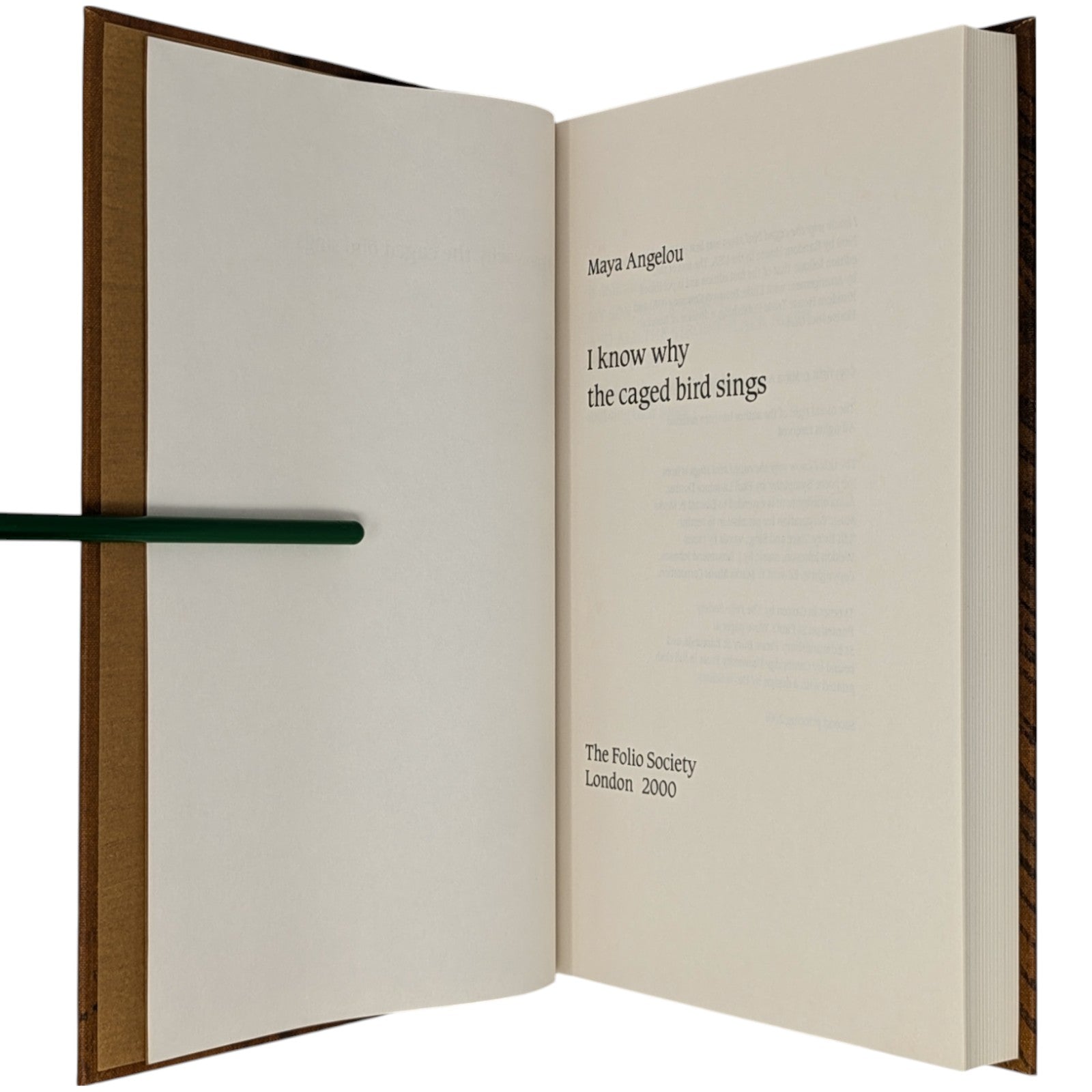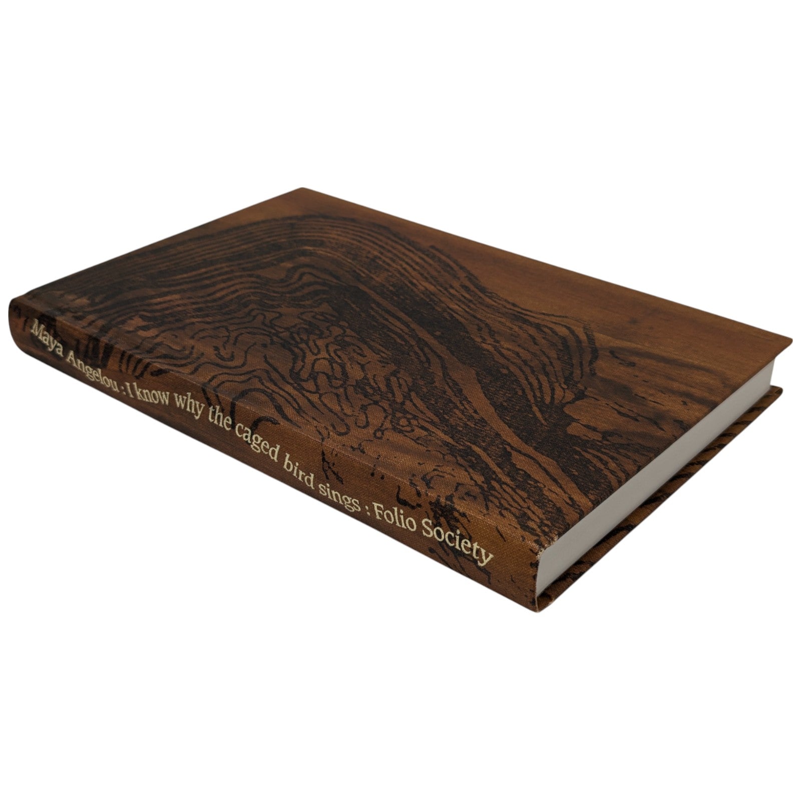 Maya Angelou, I Know Why the Caged Bird Sings. London: The Folio Society, 2000. Second printing thus, 2001. 252 × 167 × 25 mm. Pp. [1–10] 11–254 [255–256]. Type: Caxton. Printed by the Saint Edmundsbury Press. Bound by Cambridge University Press in full brown cloth with a design in dark brown by David Sellars; brown endleaves. Dark brown slip case. A rare unillustrated volume from Folio.