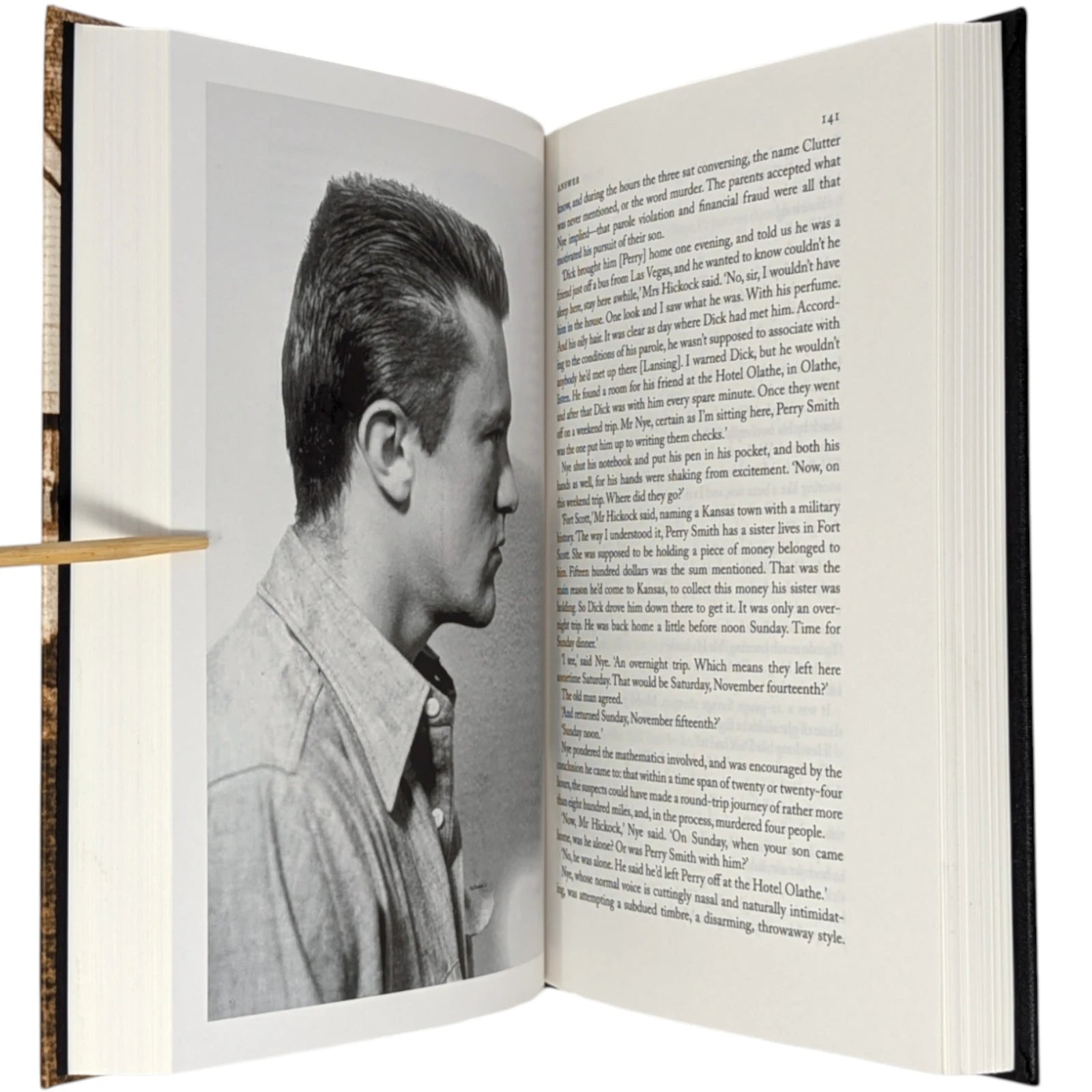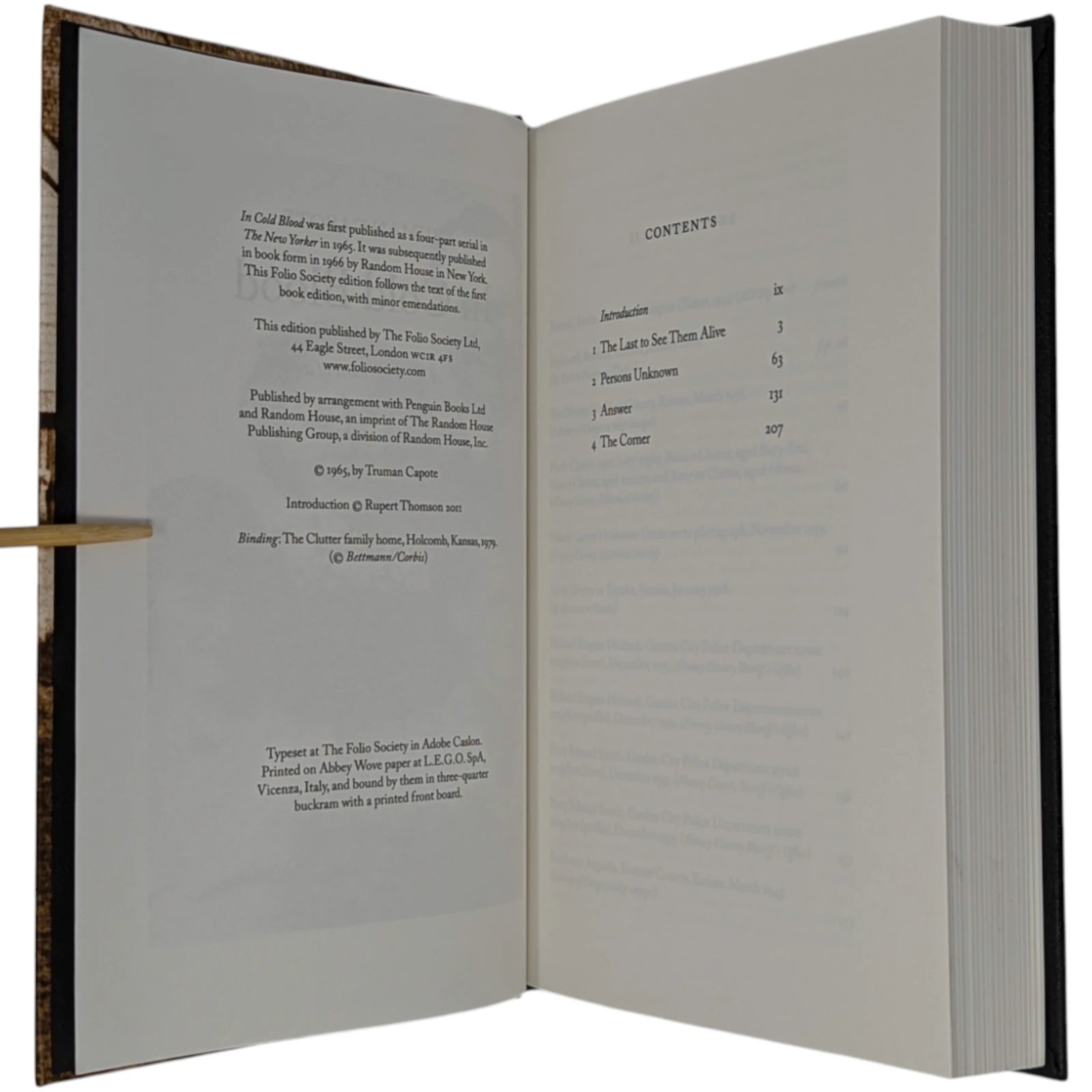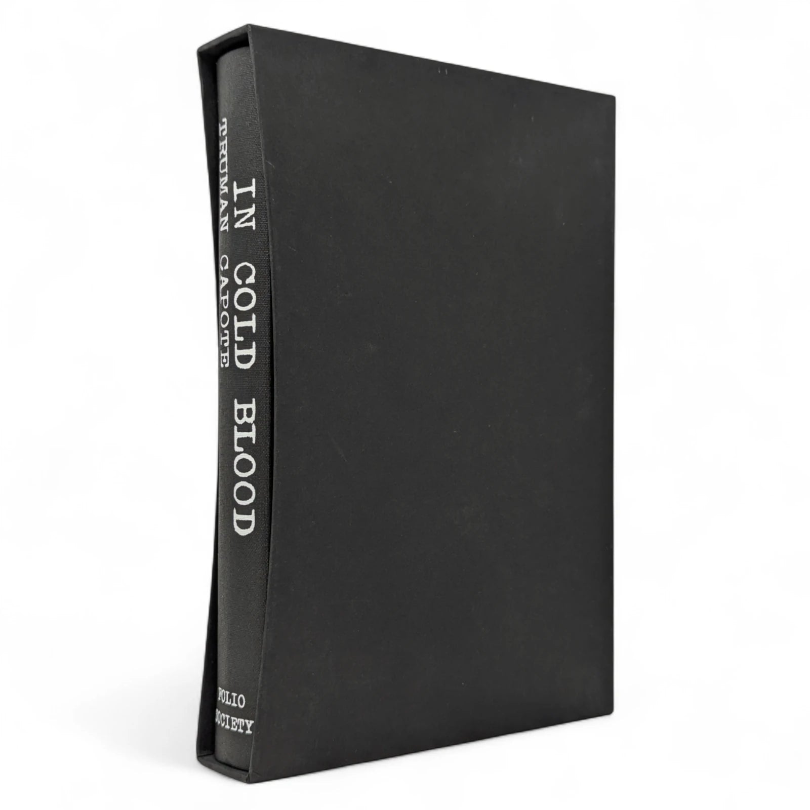 Truman Capote, In Cold Blood, A true account of a multiple murder and its consequences. London: The Folio Society, 2011. First printing thus. Introduced by Rupert Thomson. 241 × 162 × 31 mm. Pp. [i–vii] viii–xiv [xv–xx], [1–5] 6–284: [13] leaves of plates. Type: Caslon. Printed and bound by L.E.G.O. in three-quarter black buckram with printed front board; black endleaves. Black slip case. The plates reproduce contemporary photographs.