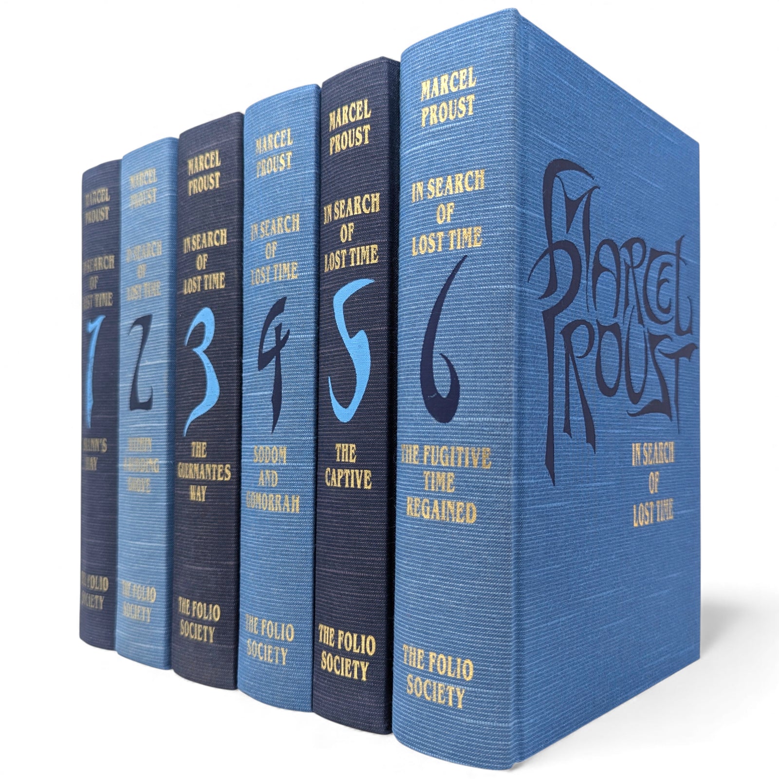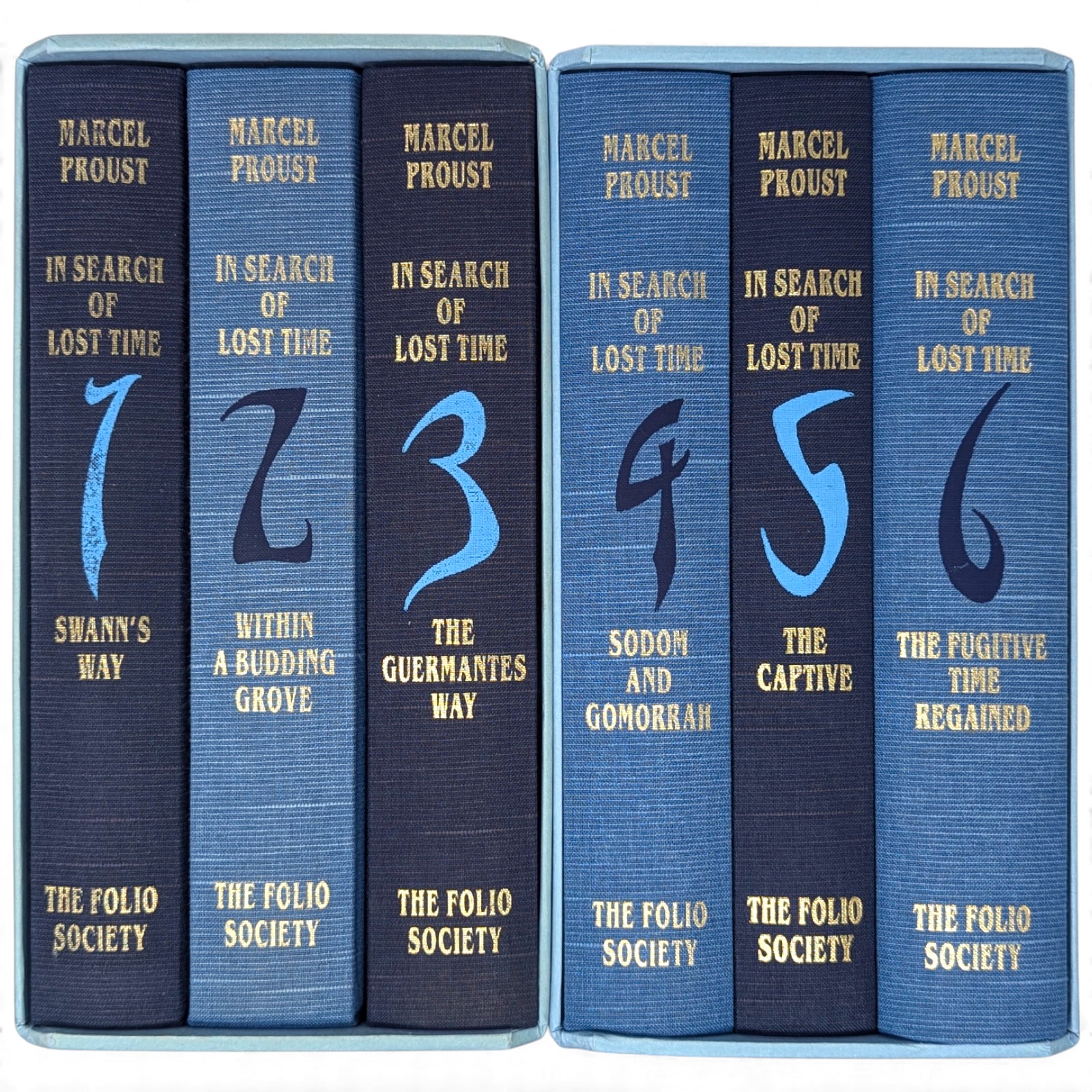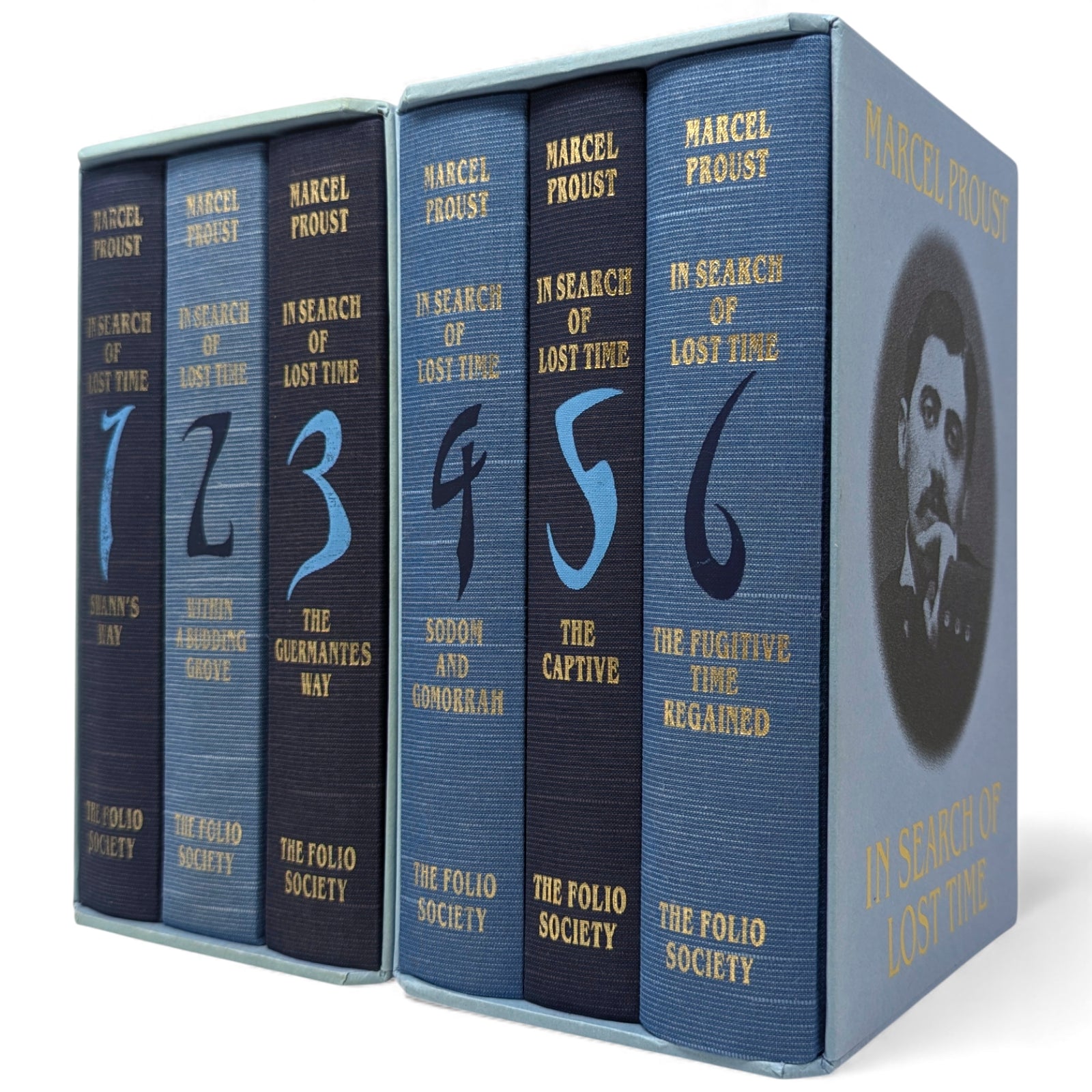 Marcel Proust, In Search of Lost Time. London: The Folio Society, 2000. First printing thus. 239 × 159 × 35–47 mm. 6 vols (see below). Type: Fournier. Printed and bound by the Bath Press. Full dark or pale blue cloth, decorated and titled in dark or pale blue and gold to a design by Malcolm Harvey Young; dark blue endleaves. Two pale blue three-volume slip cases, printed with a portrait of Proust and titled (as above) in gold. The first Folio edition was published as Remembrance of Things Past in 1981 with the same translation, only in three volumes, and the same translation has been used here, with revisions by D.J. Enright. Each volume is illustrated with a portrait frontispiece of Proust, and reproductions of photographs taken by Eugène Atget between around 1896 and 1926. The six volumes are as follows: