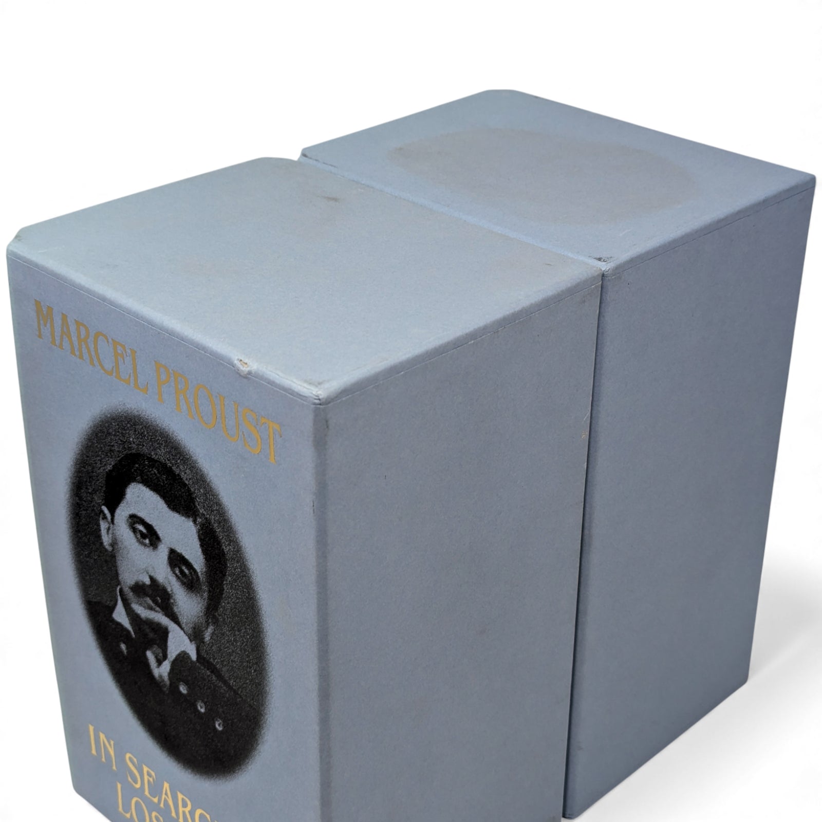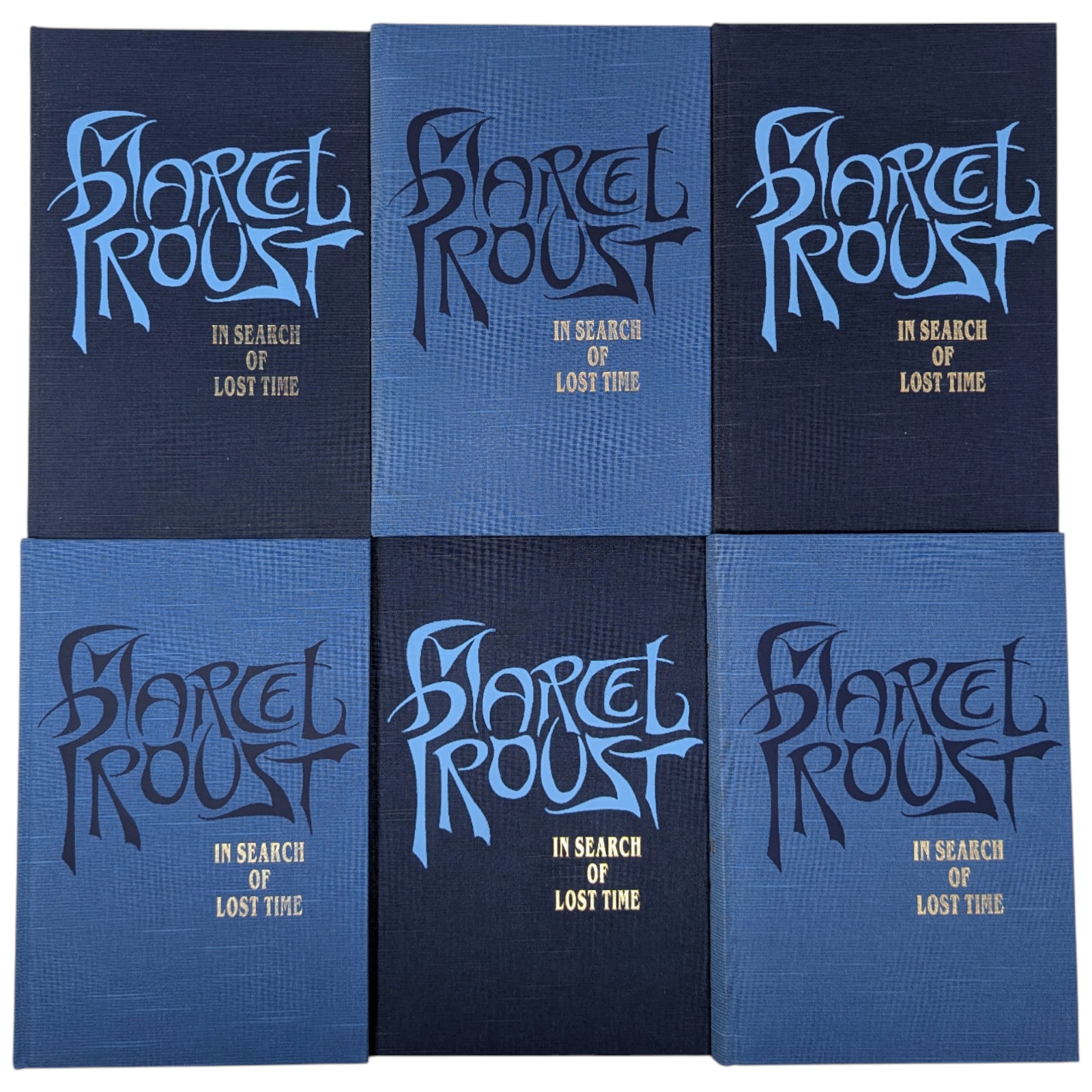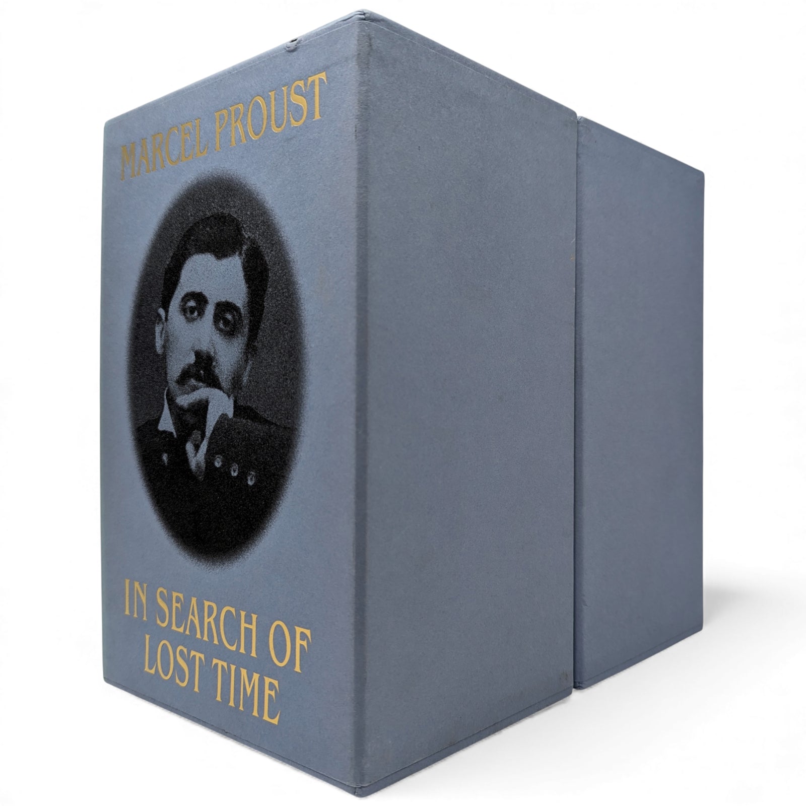 Marcel Proust, In Search of Lost Time. London: The Folio Society, 2000. First printing thus. 239 × 159 × 35–47 mm. 6 vols (see below). Type: Fournier. Printed and bound by the Bath Press. Full dark or pale blue cloth, decorated and titled in dark or pale blue and gold to a design by Malcolm Harvey Young; dark blue endleaves. Two pale blue three-volume slip cases, printed with a portrait of Proust and titled (as above) in gold. The first Folio edition was published as Remembrance of Things Past in 1981 with the same translation, only in three volumes, and the same translation has been used here, with revisions by D.J. Enright. Each volume is illustrated with a portrait frontispiece of Proust, and reproductions of photographs taken by Eugène Atget between around 1896 and 1926. The six volumes are as follows: