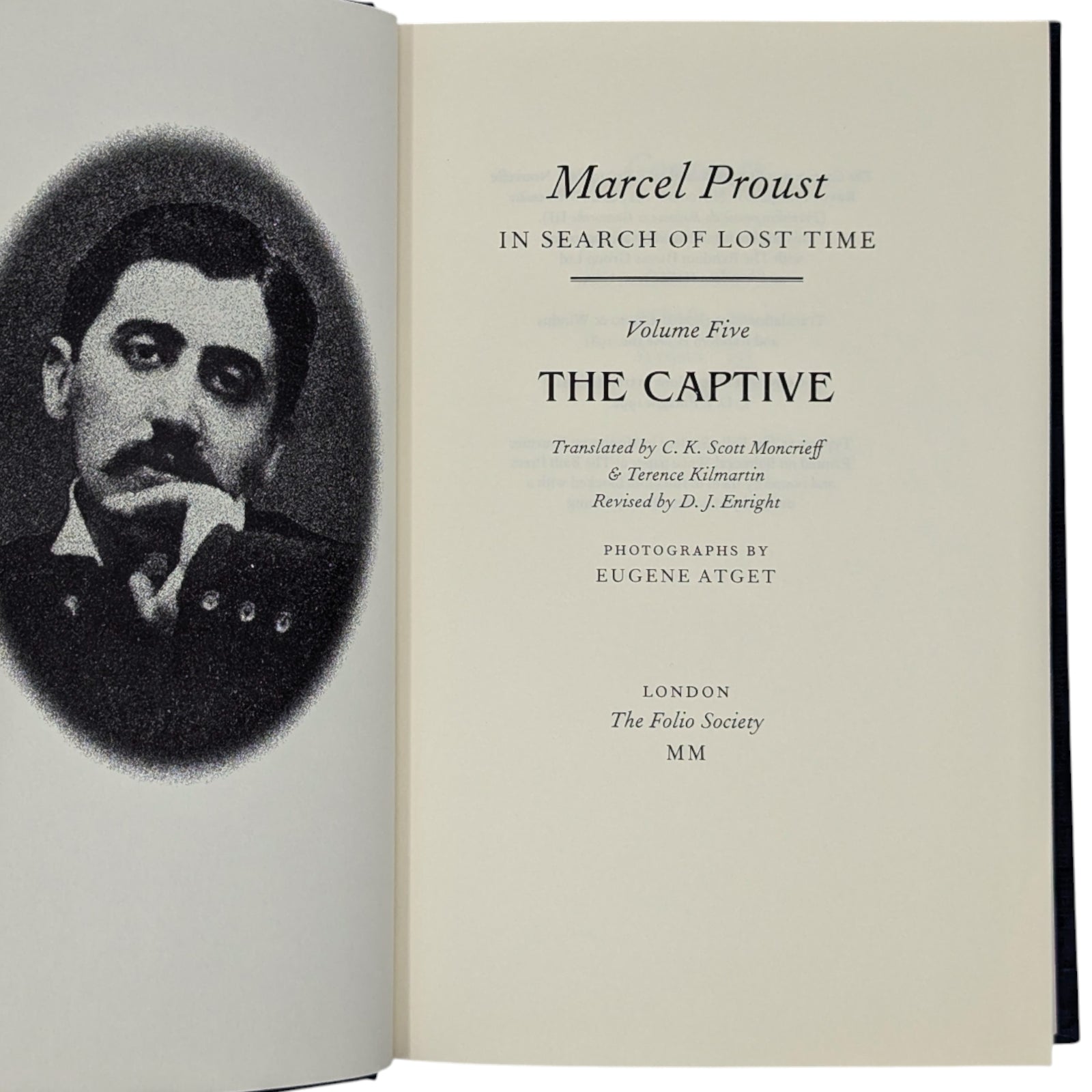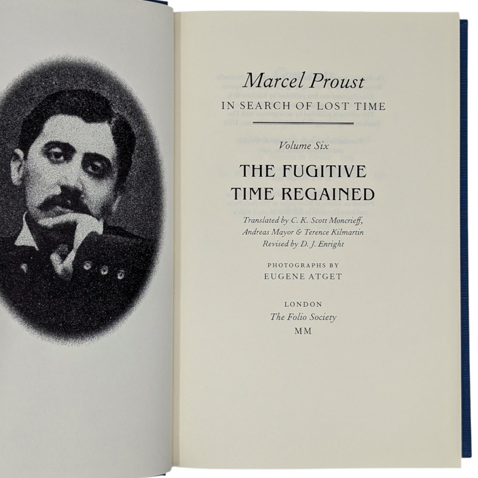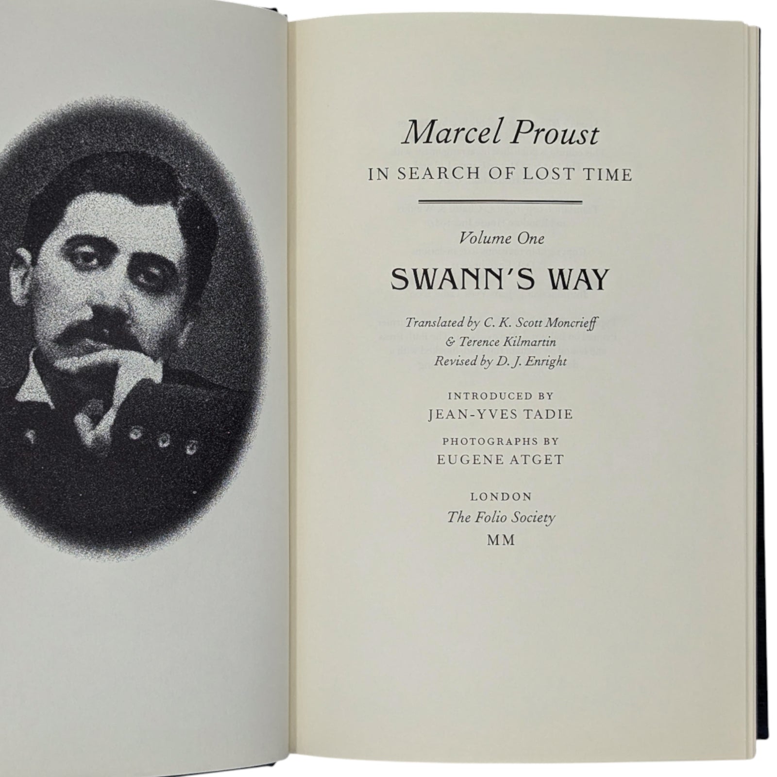 1. Marcel Proust, In Search of Lost Time, volume one, Swann’s Way, translated by C.K. Scott Moncrieff & Terence Kil martin, revised by D.J. Enright, introduction by Jean-Yves Tadié, photographs by Eugène Atget. Pp. [i–viii] ix–xxiv [xxv–xxvi], 1–429 [430]: [8] leaves of photographic plates (facing pp. 70, 87, 150, 167, 198, 215, 390 and 407). Bound in dark blue cloth.