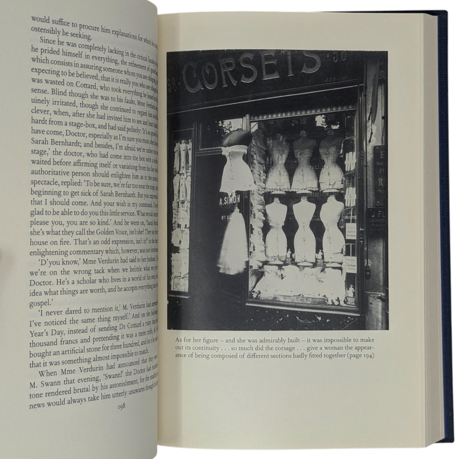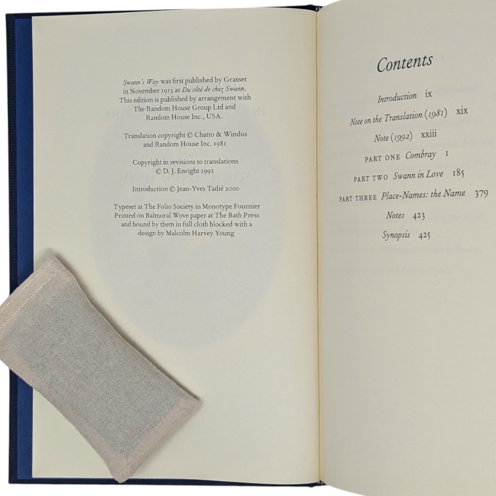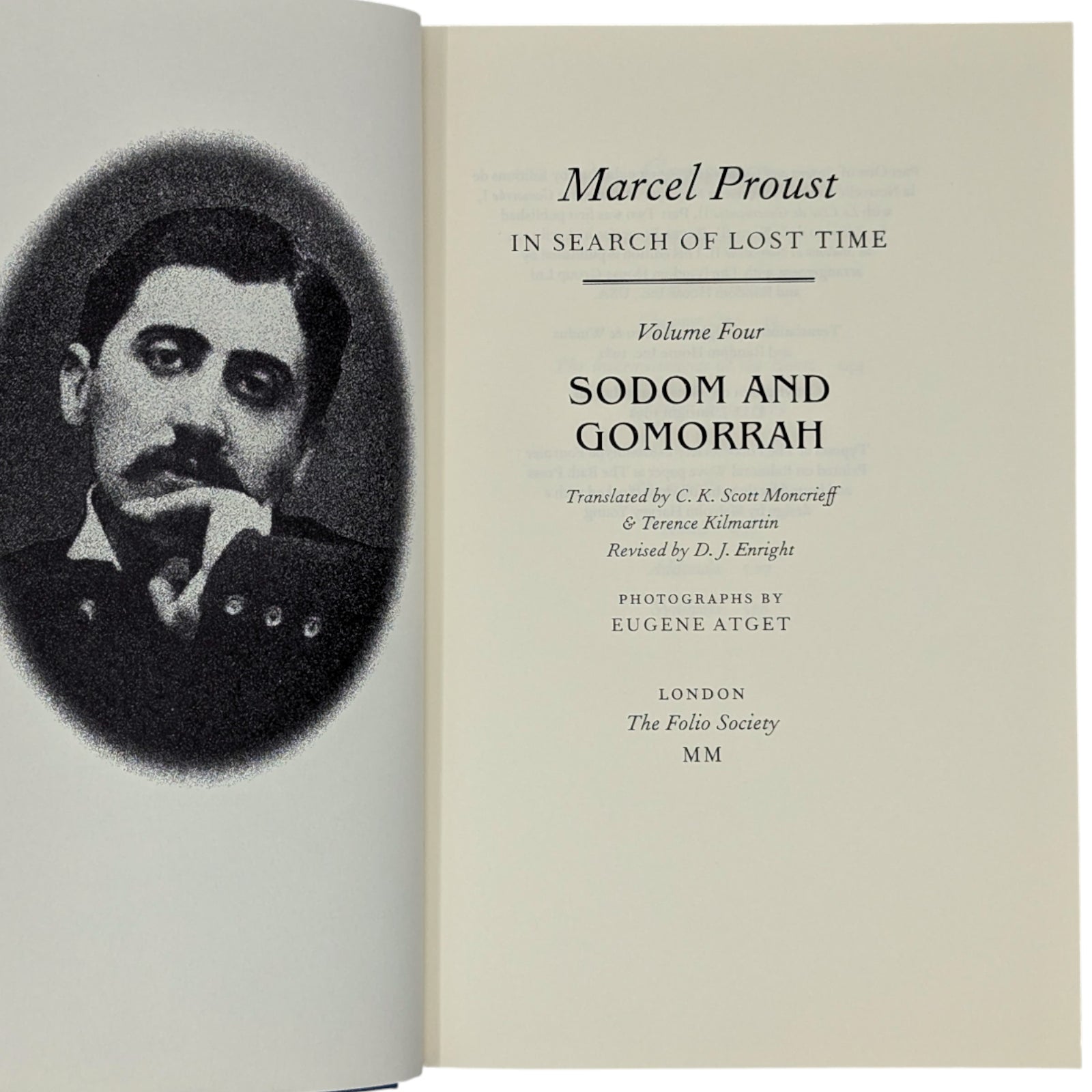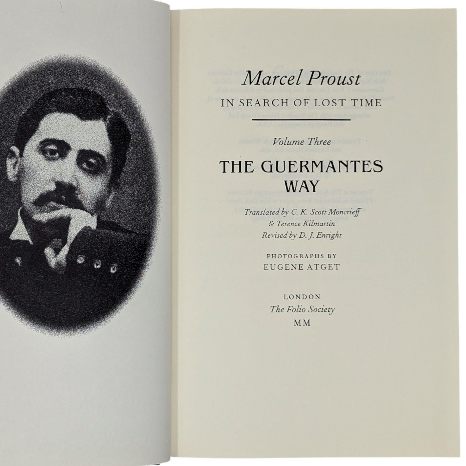 1. Marcel Proust, In Search of Lost Time, volume one, Swann’s Way, translated by C.K. Scott Moncrieff & Terence Kil martin, revised by D.J. Enright, introduction by Jean-Yves Tadié, photographs by Eugène Atget. Pp. [i–viii] ix–xxiv [xxv–xxvi], 1–429 [430]: [8] leaves of photographic plates (facing pp. 70, 87, 150, 167, 198, 215, 390 and 407). Bound in dark blue cloth.