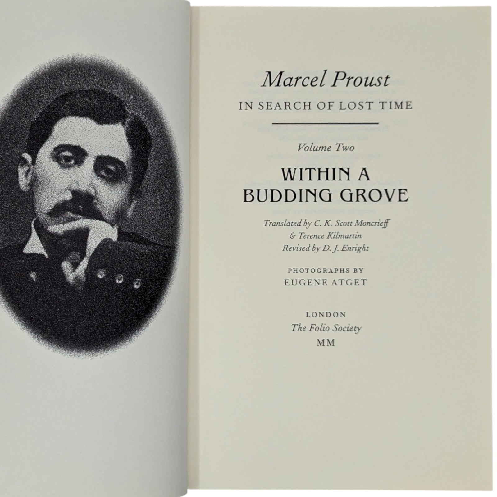 2. Marcel Proust, In Search of Lost Time, volume two, Within a Budding Grove, translated by C.K. Scott Moncrieff & Terence Kilmartin, revised by D.J. Enright, photographs by Eugène Atget. Pp. [i–viii], 1–521 [522–528]: [8] leaves of pho tographic plates (facing pp. 56, 73, 152, 169, 232, 249, 392 and 409). Bound in pale blue cloth.