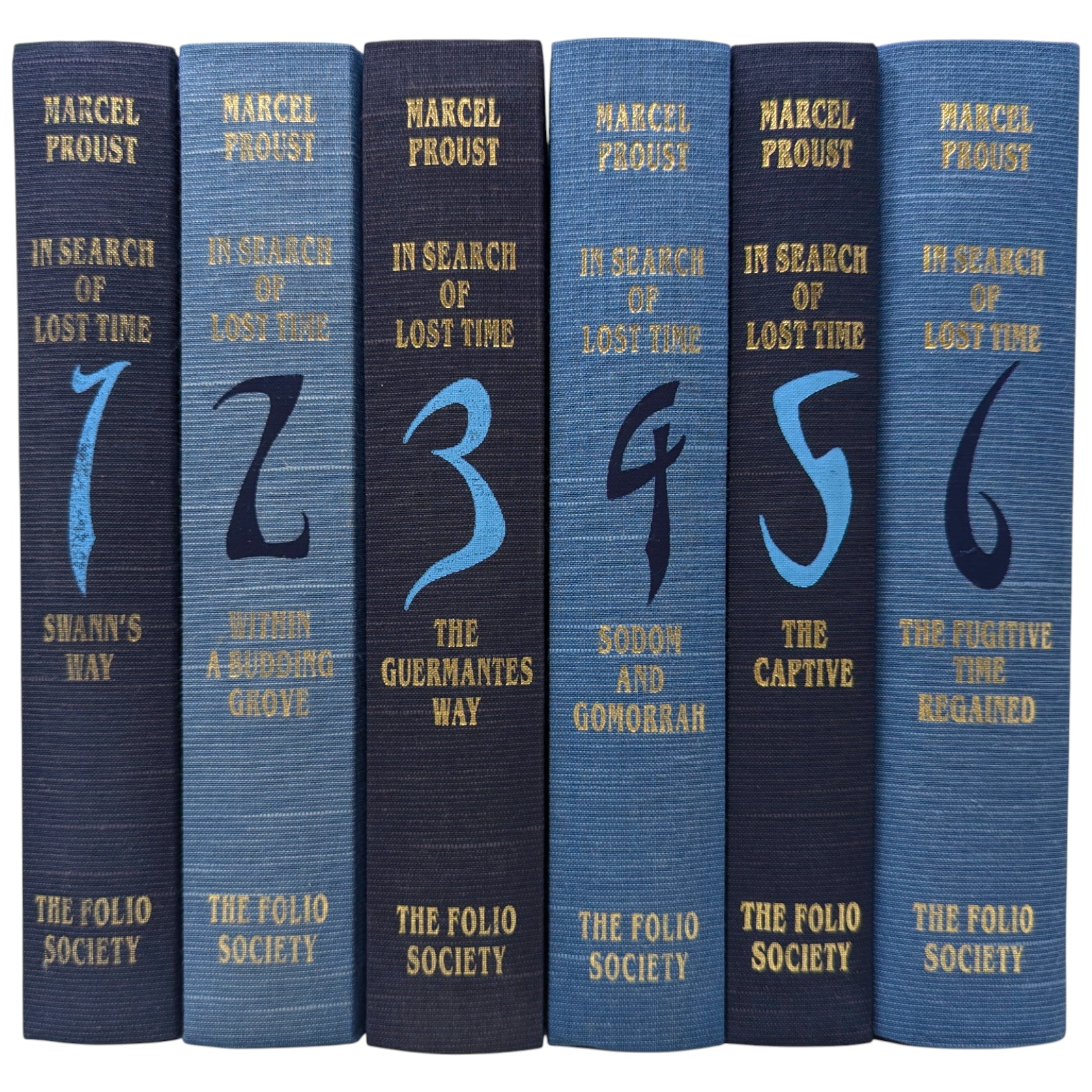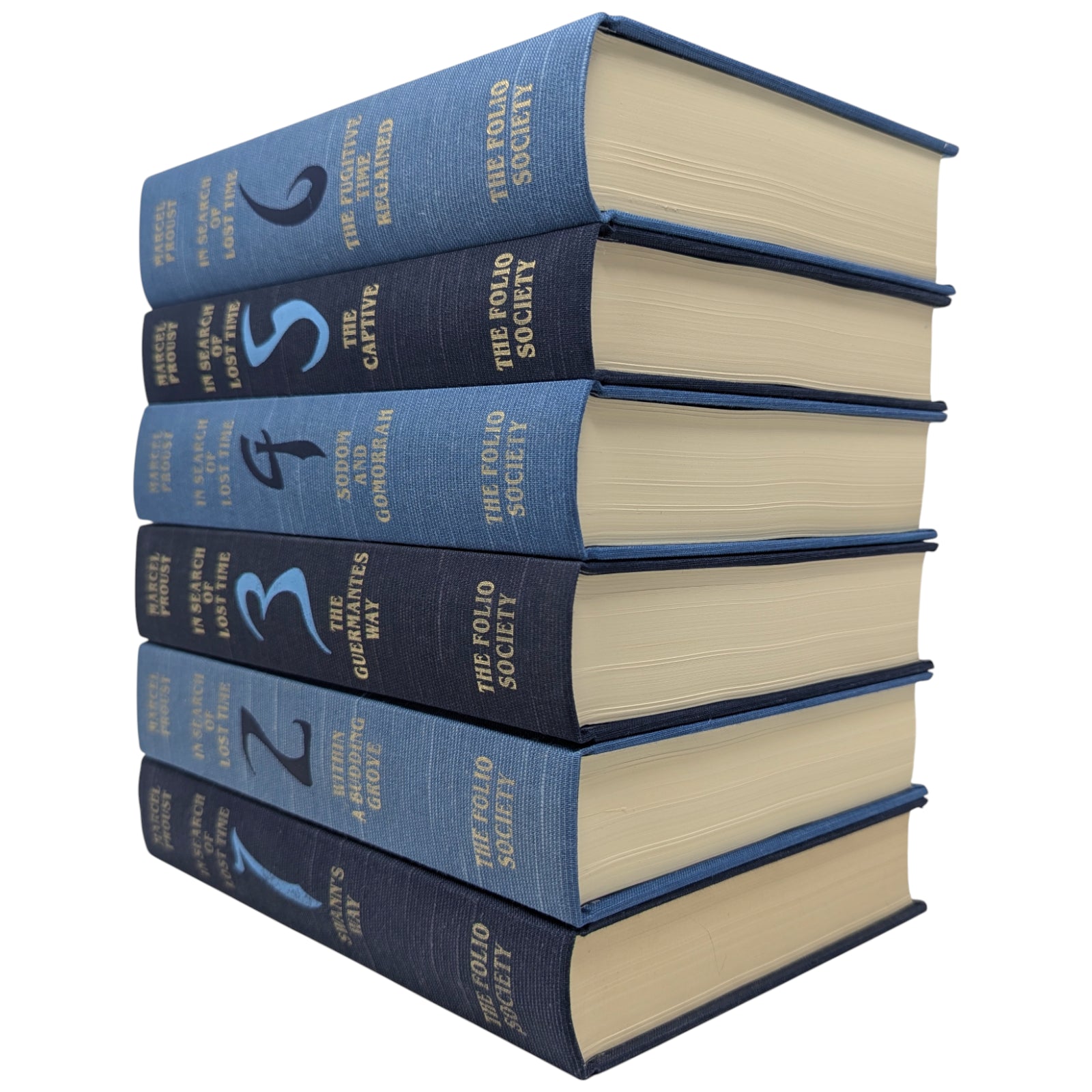 6. Marcel Proust, In Search of Lost Time, volume six, The Fugitive, Time Regained . . . Pp. [i–viii], [1–2] 3–649 [650–656]: [8] leaves of photographic plates (facing pp. 56, 73, 392, 409, 440, 457, 568 and 585). Bound in pale blue cloth.