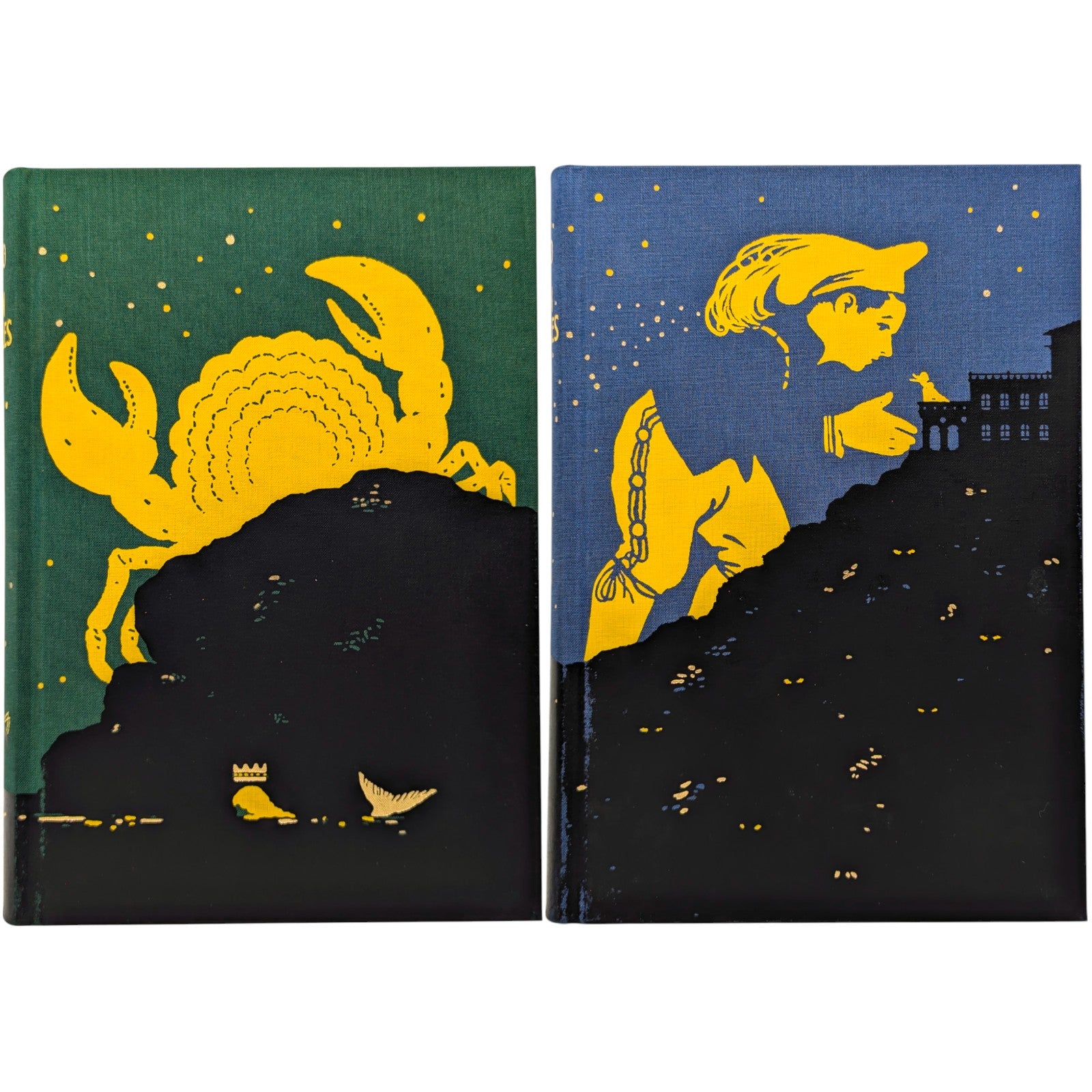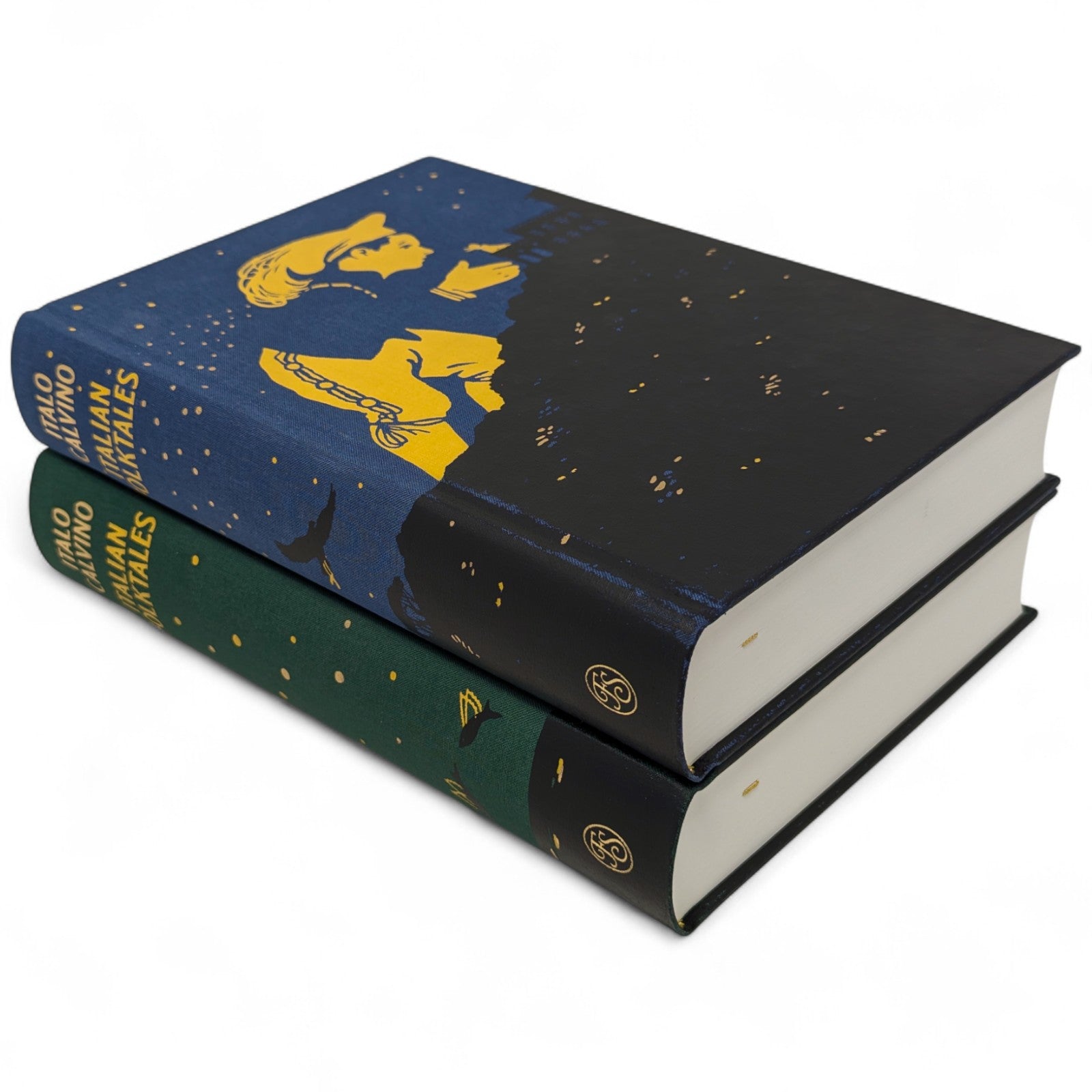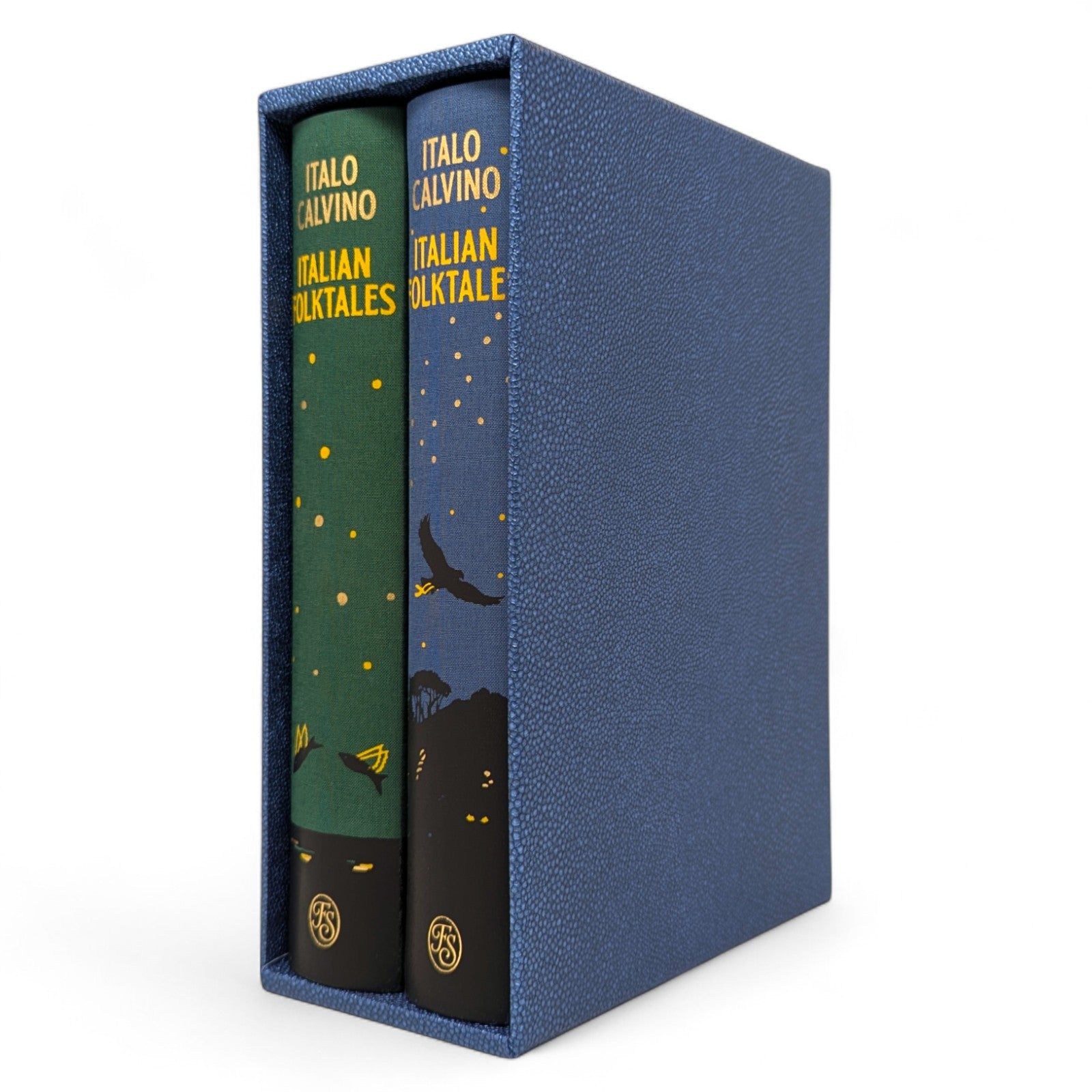 Italo Calvino, Italian Folktales. London: The Folio Society, 2019. First printing thus. 252 × 178 × 43–44 mm. 2 vols (see below). Type: Jenson. Printed and bound by Kösel in full cloth blocked in gold, yellow and black with a different design for each volume; printed cream endleaves with a map at the back. Two-volume blue imitation snakeskin slip case. Contains 200 tales. Illustrated by 16 plates (two double-page), plus black and white tail-pieces. The two volumes are as follows: