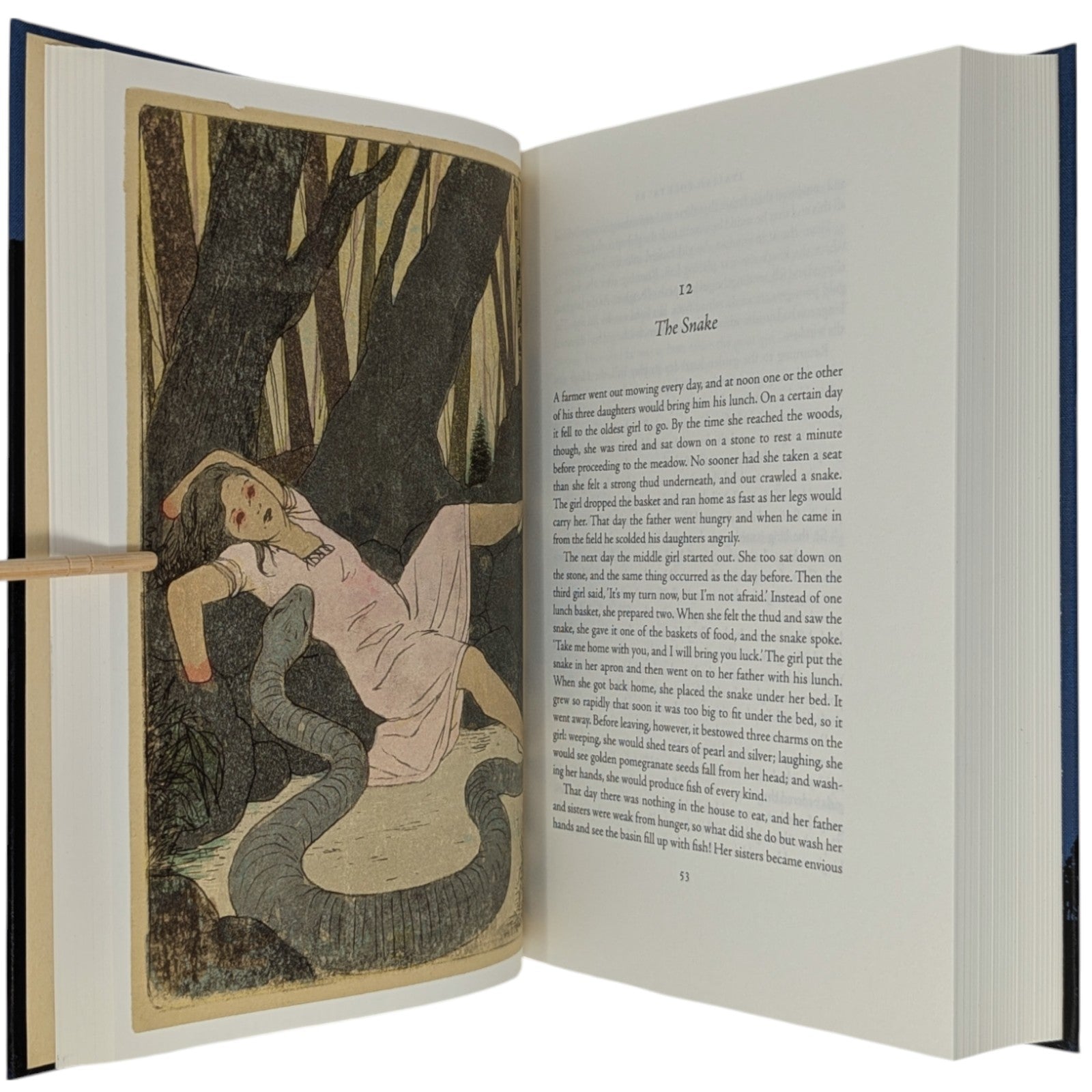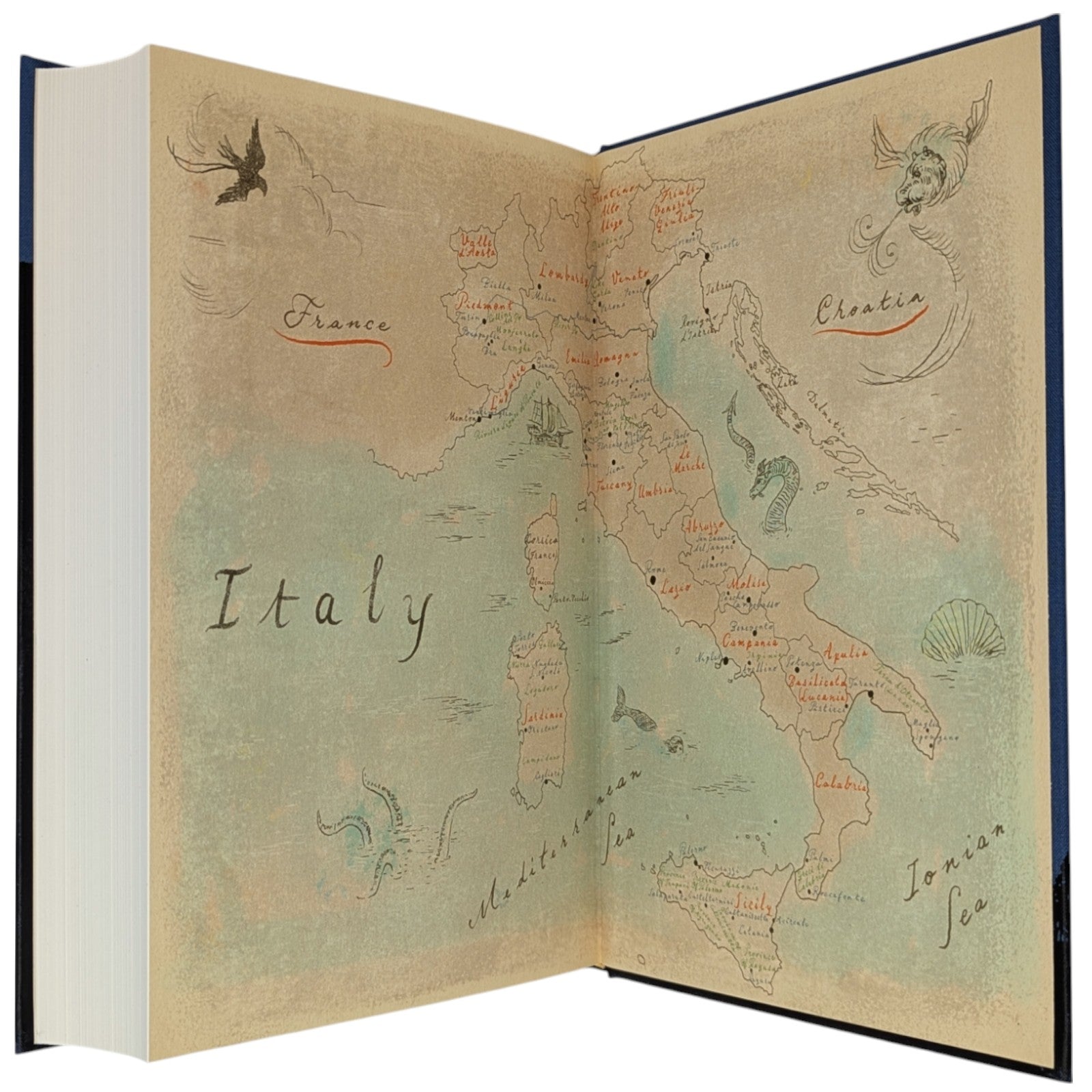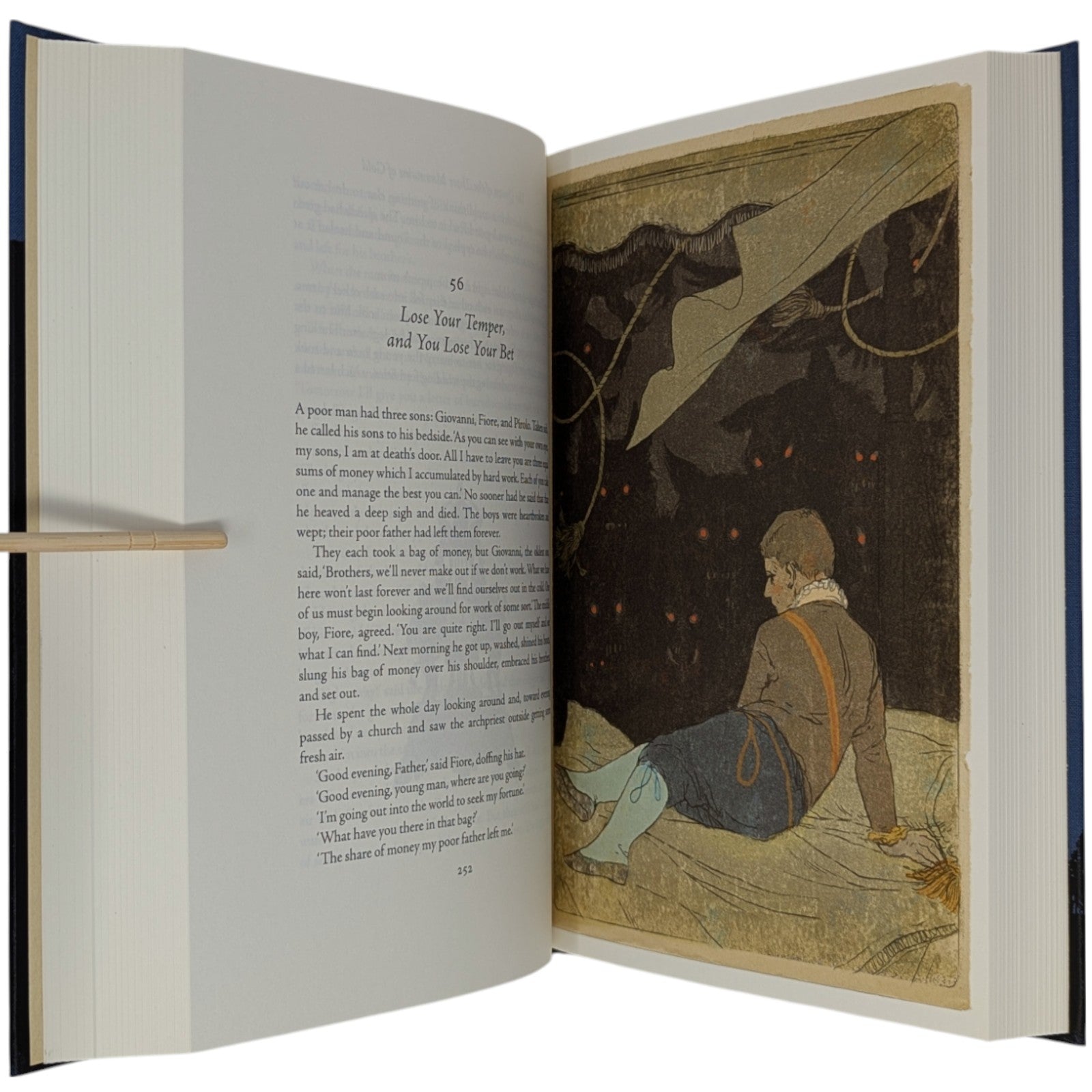 Italo Calvino, Italian Folktales. London: The Folio Society, 2019. First printing thus. 252 × 178 × 43–44 mm. 2 vols (see below). Type: Jenson. Printed and bound by Kösel in full cloth blocked in gold, yellow and black with a different design for each volume; printed cream endleaves with a map at the back. Two-volume blue imitation snakeskin slip case. Contains 200 tales. Illustrated by 16 plates (two double-page), plus black and white tail-pieces. The two volumes are as follows: