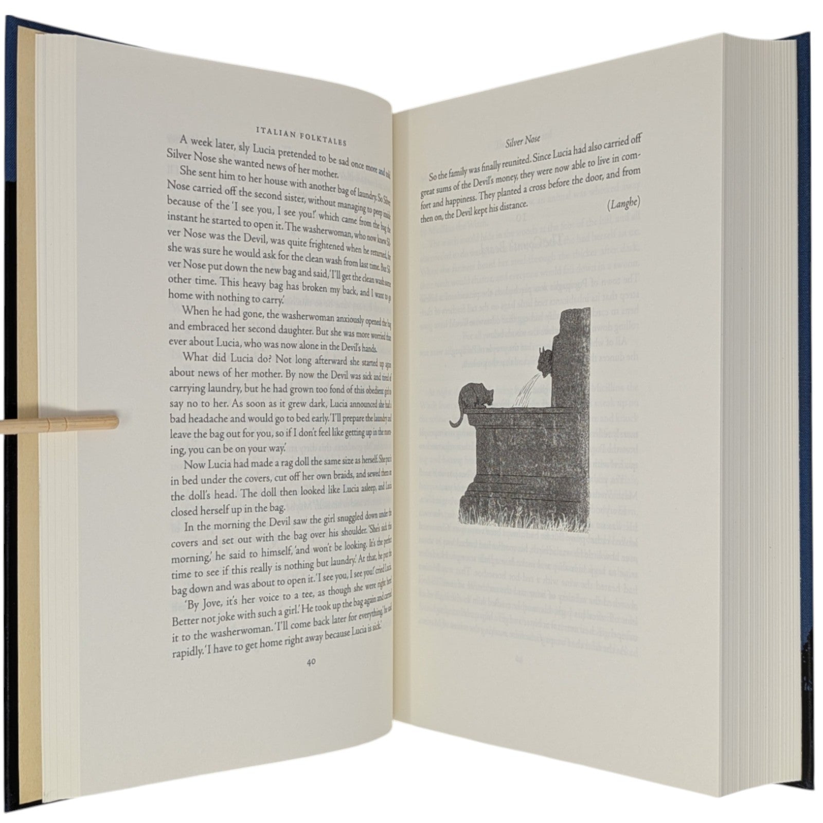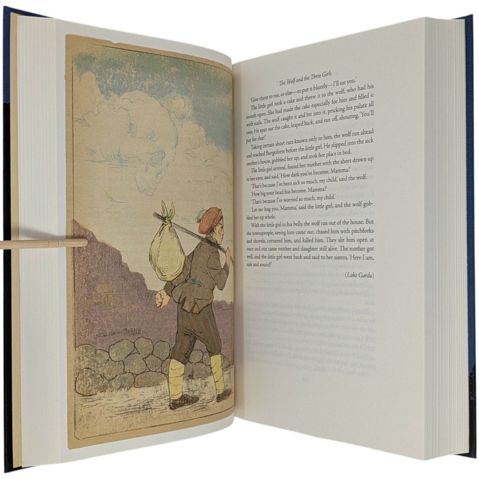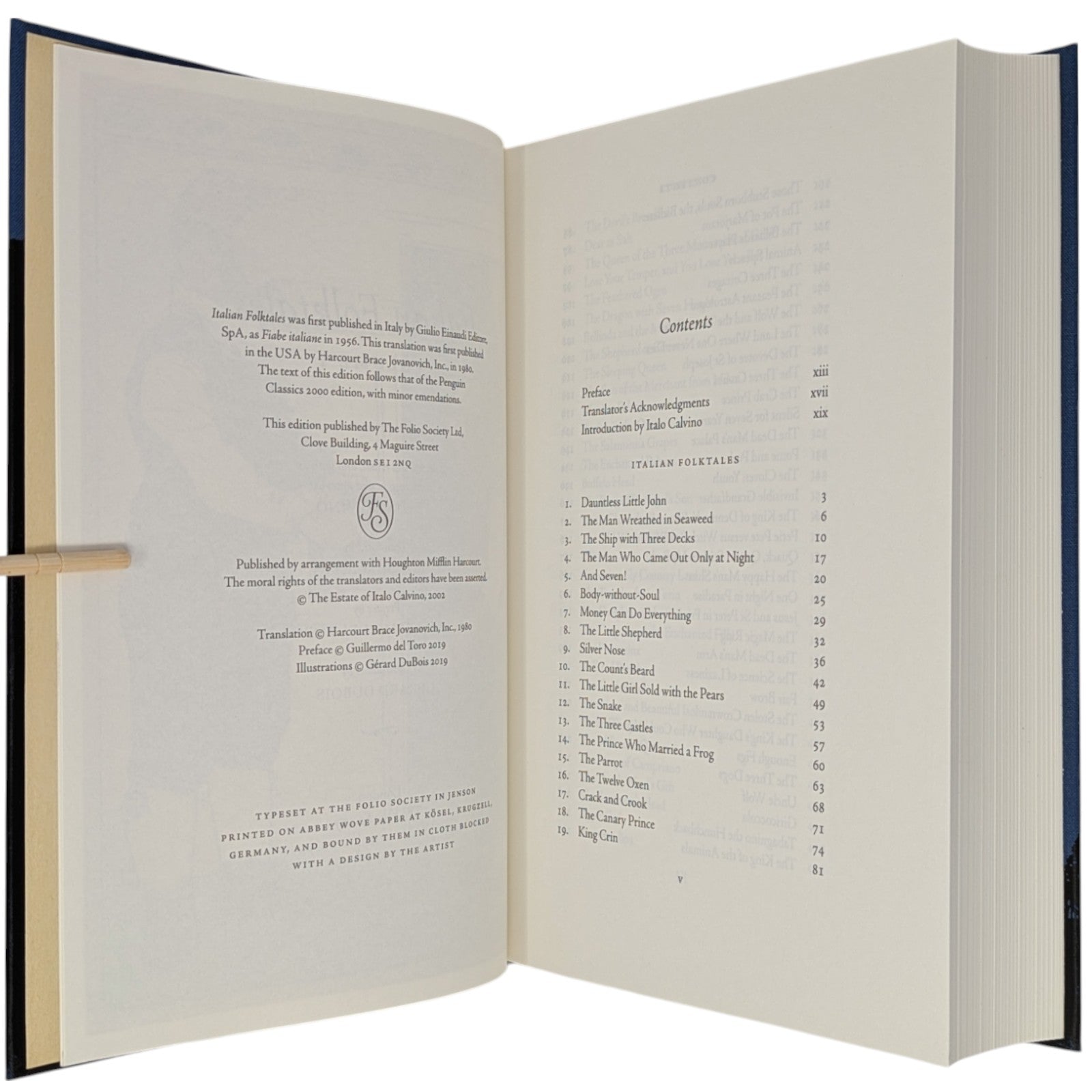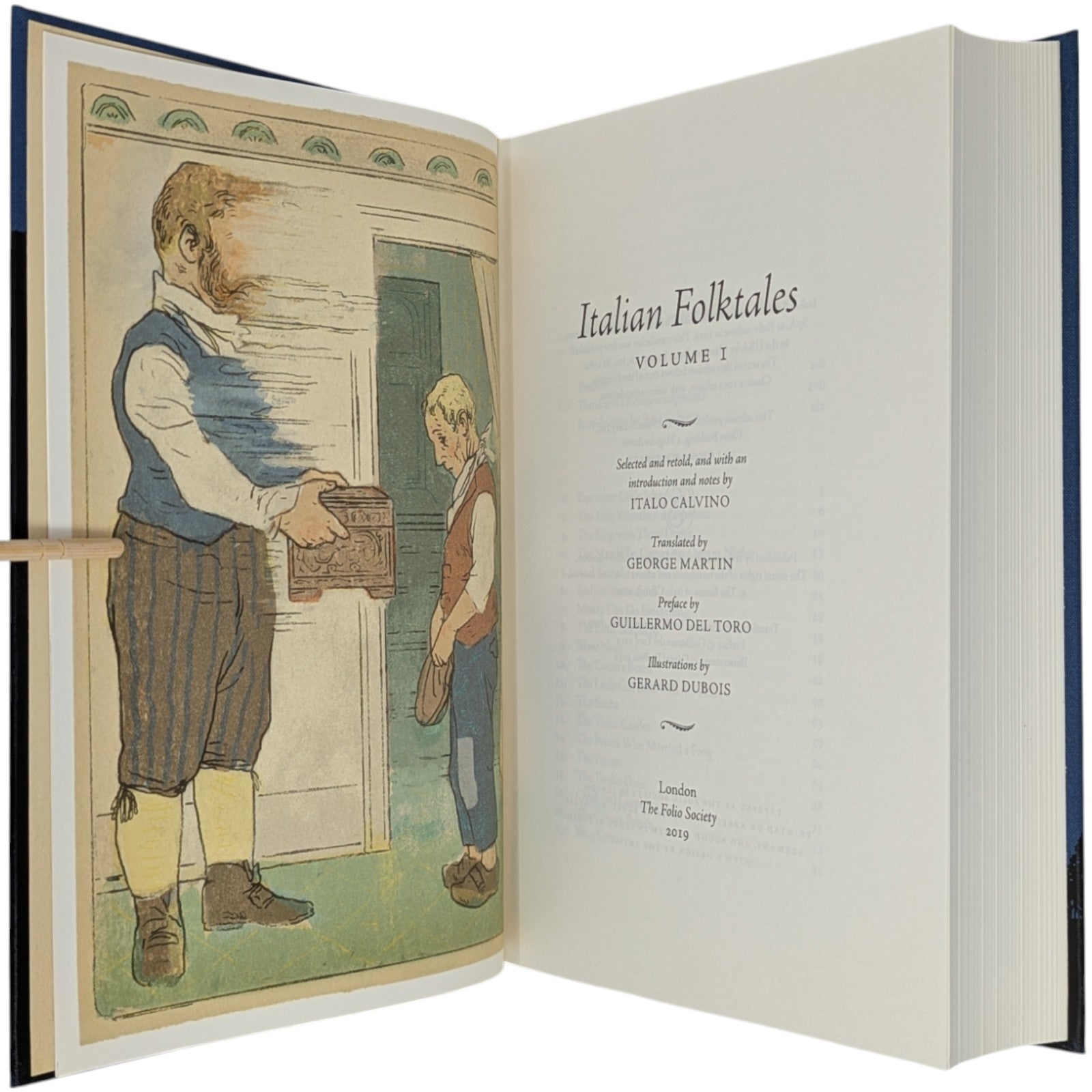 [1] Italian Folktales, volume 1, selected and retold, and with an introduction and notes by Italo Calvino, translated by George Martin, preface by Guillermo del Toro, illustrations by Gerard Dubois. Pp. [i–iv] v–xliv, [1–2] 3–502 [503–504], [1–4]: [9] leaves of colour plates (facing pp. [iii], 53, [109], 252, 364, [428], [493], and between pp. [188]–189). Bound in blue cloth.