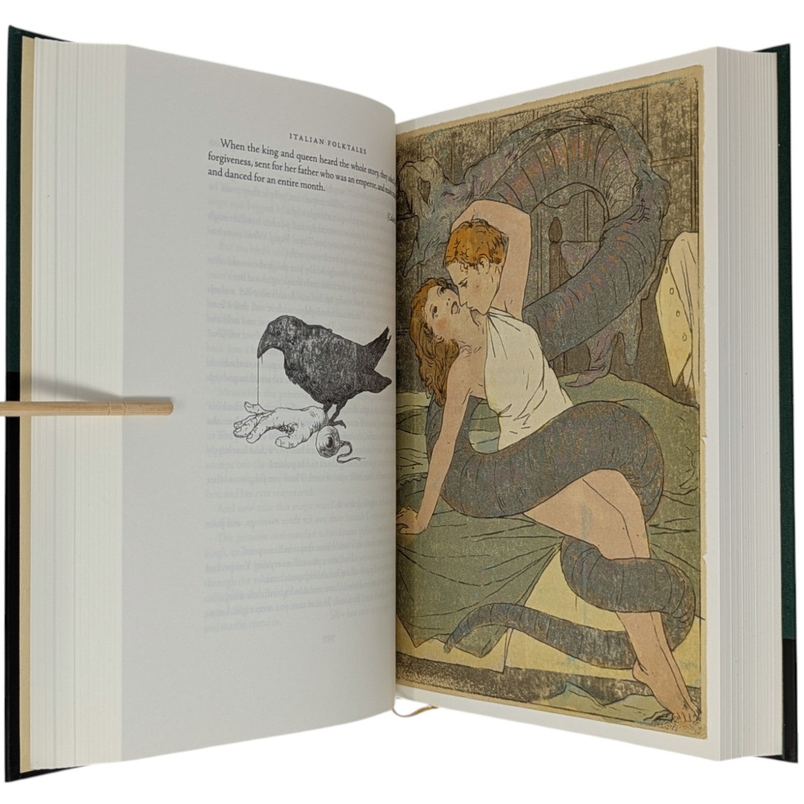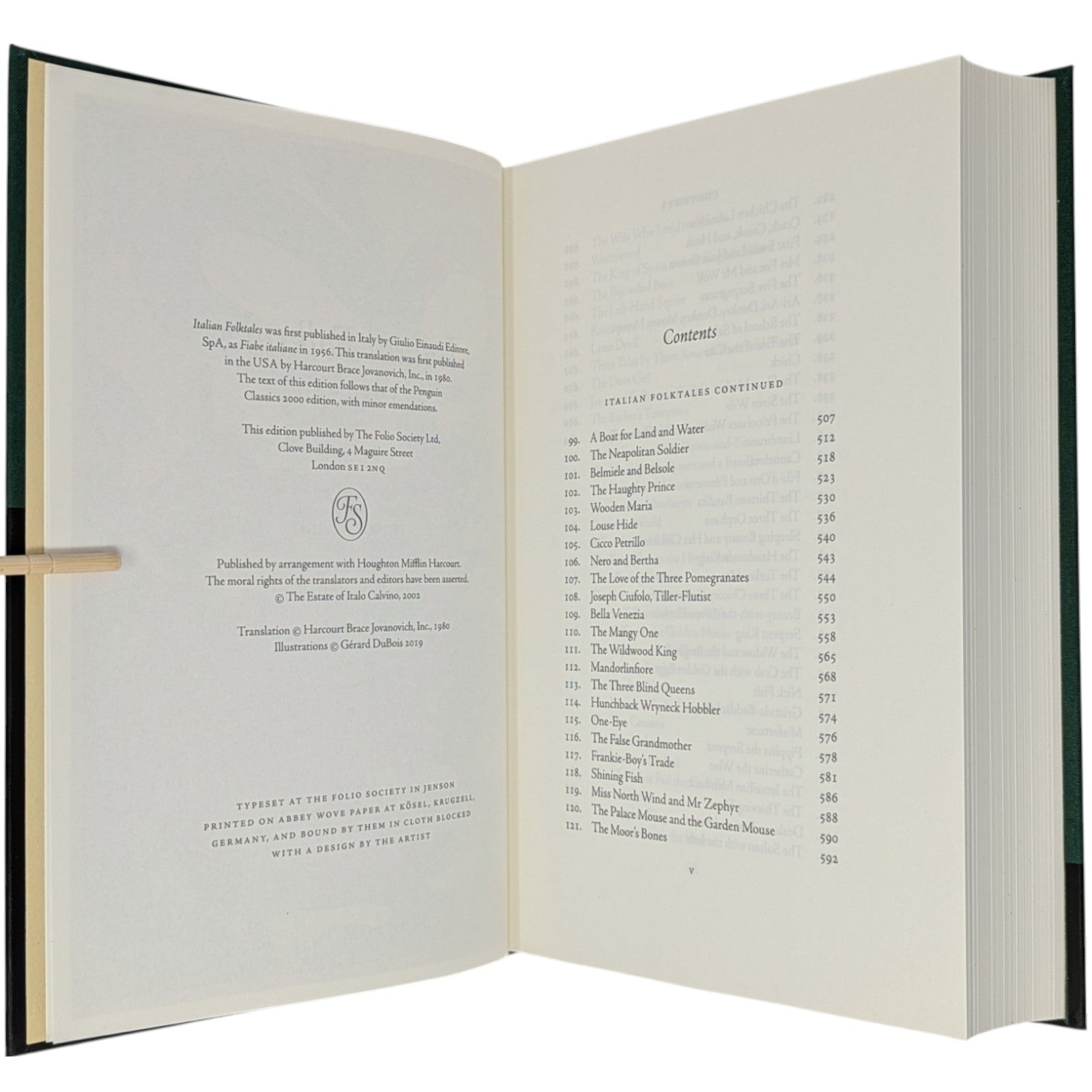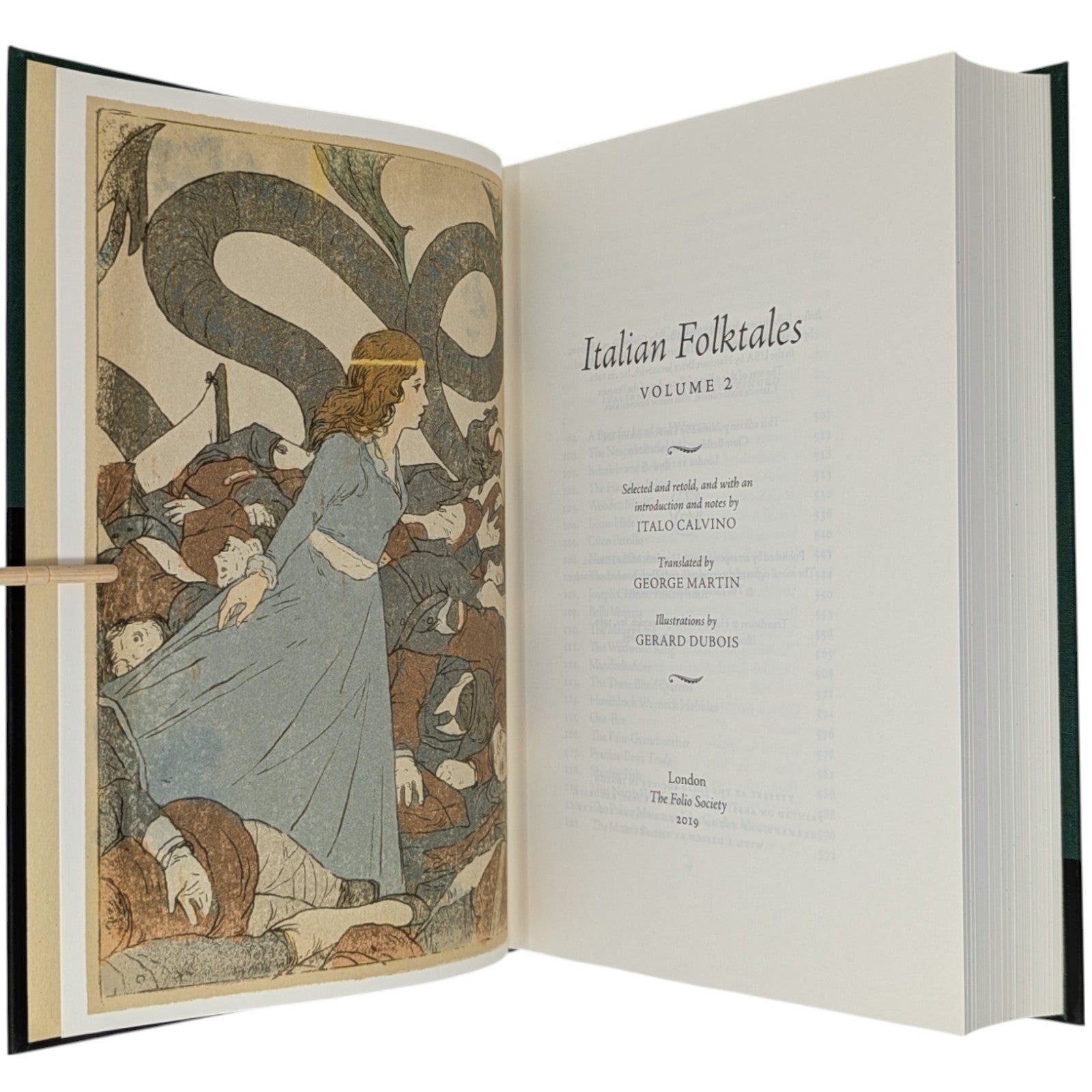 [2] Italian Folktales, volume 2, selected and retold, and with an introduction and notes by Italo Calvino, translated by George Martin, illustrations by Gerard Dubois. Pp. [i–iv] v–ix [x], [505–506] 507–1048 [1049–1054]: [9] leaves of colour plates (facing pp. [iii], 543, [591], [718], 790, 863, 943, and between pp. 622–623). Bound in green cloth.