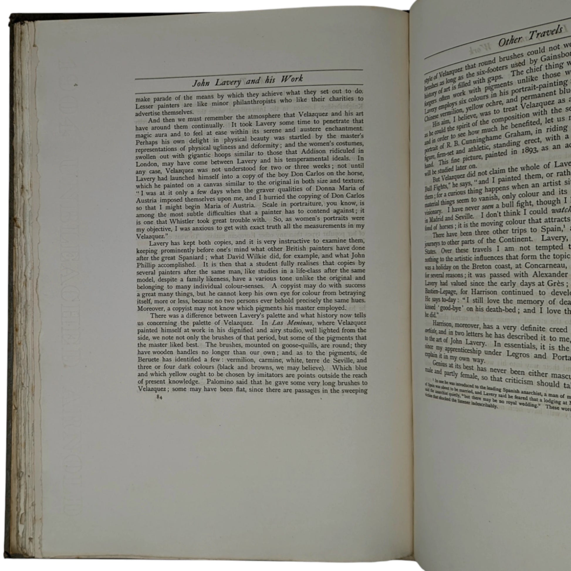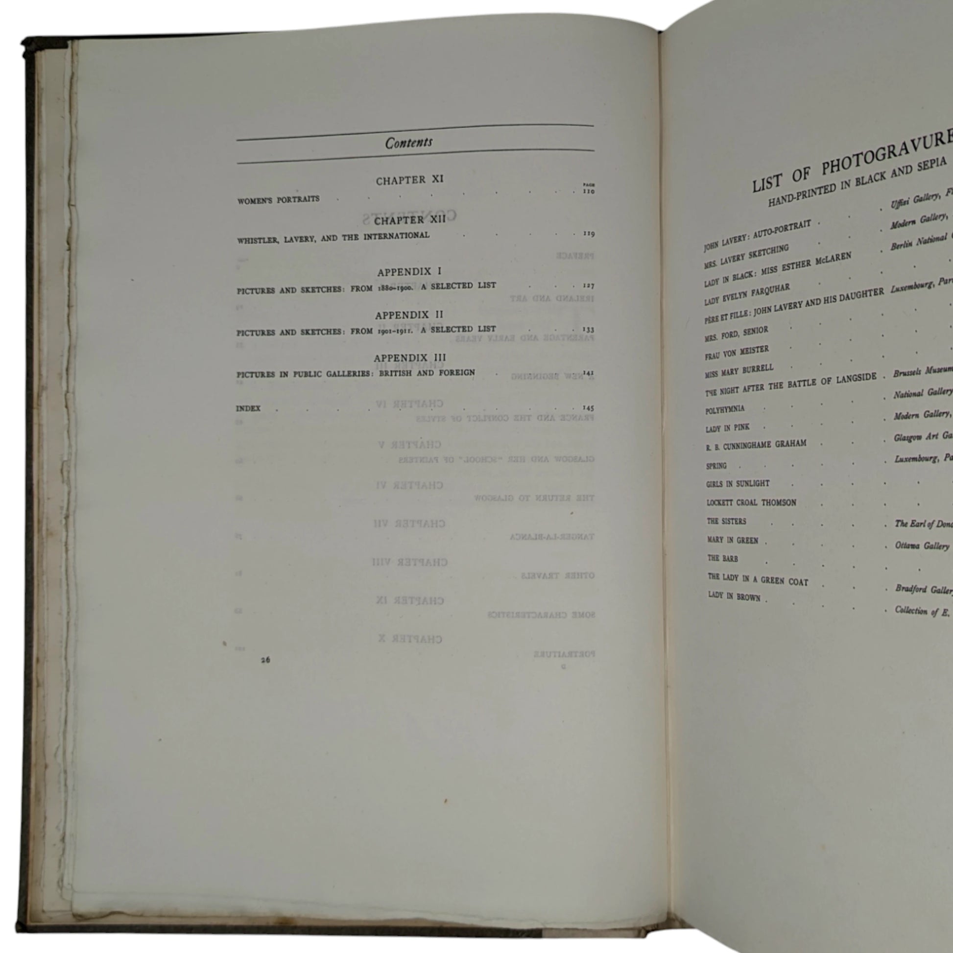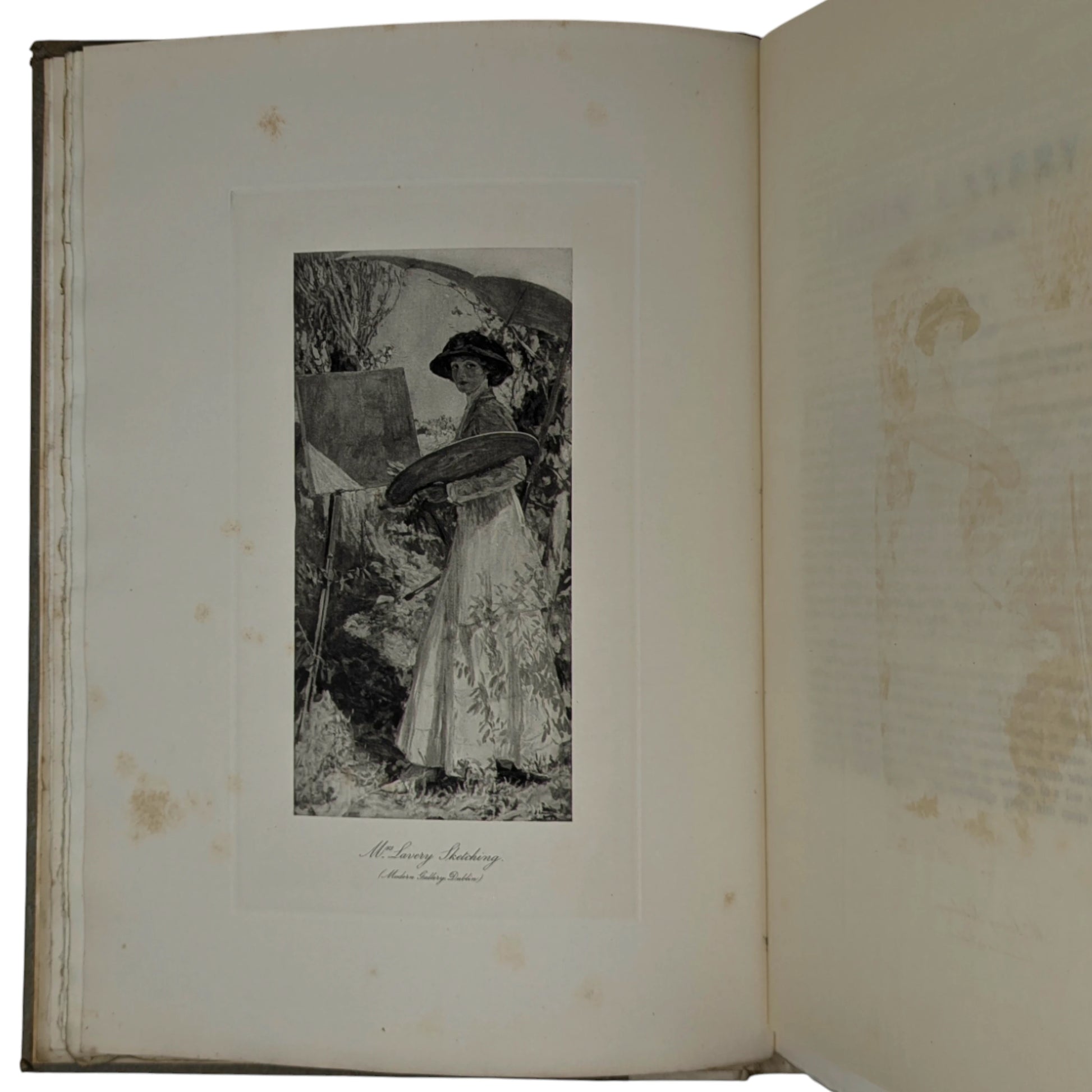 Number 91 of a limited edition of 160. Folio, 410 x 294 mm. Printed on lovely thick watermarked paper, with 20 tissue protected photogravure plates including the frontis. Vellum spine printed in gilt, gray boards, 150 pages. Together with two early 1990s newspaper cut-outs, loosely inserted, one on the life of Lavery and the other one on Lavery's 'The Terrace, Cap d'Ail' painting recently sold at Philips Auction for £130,000.