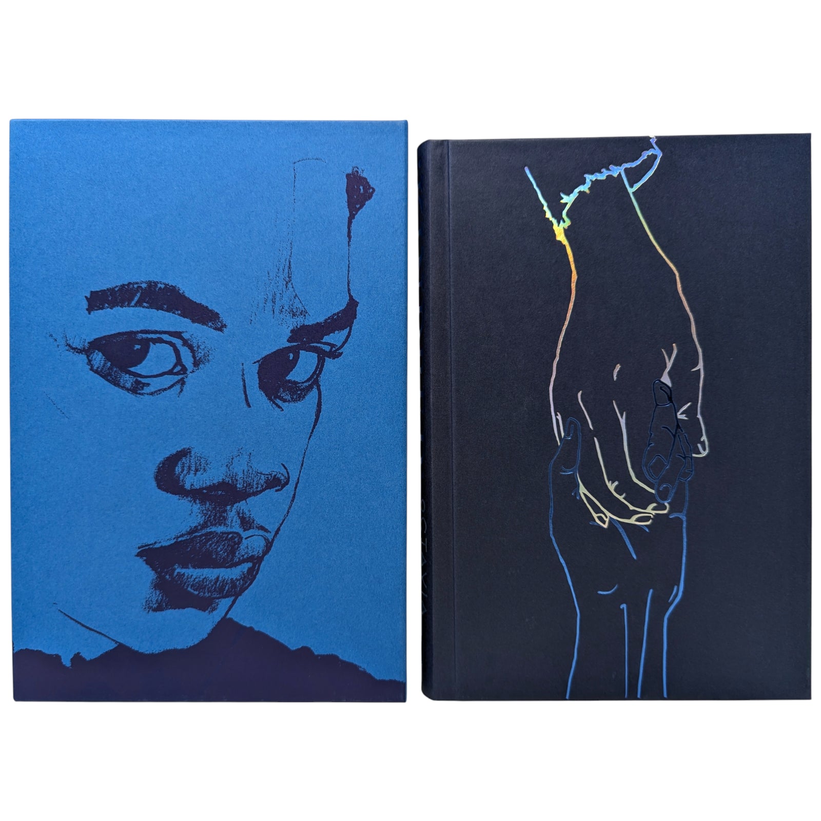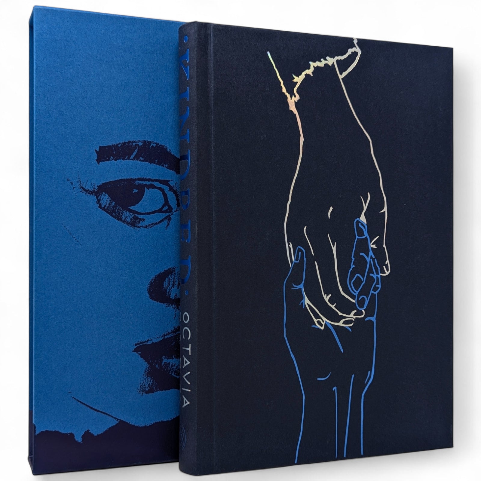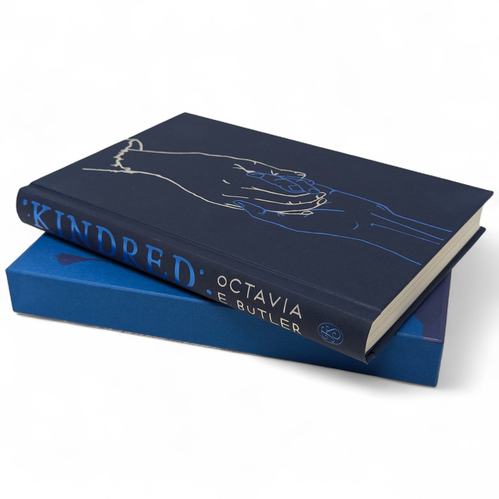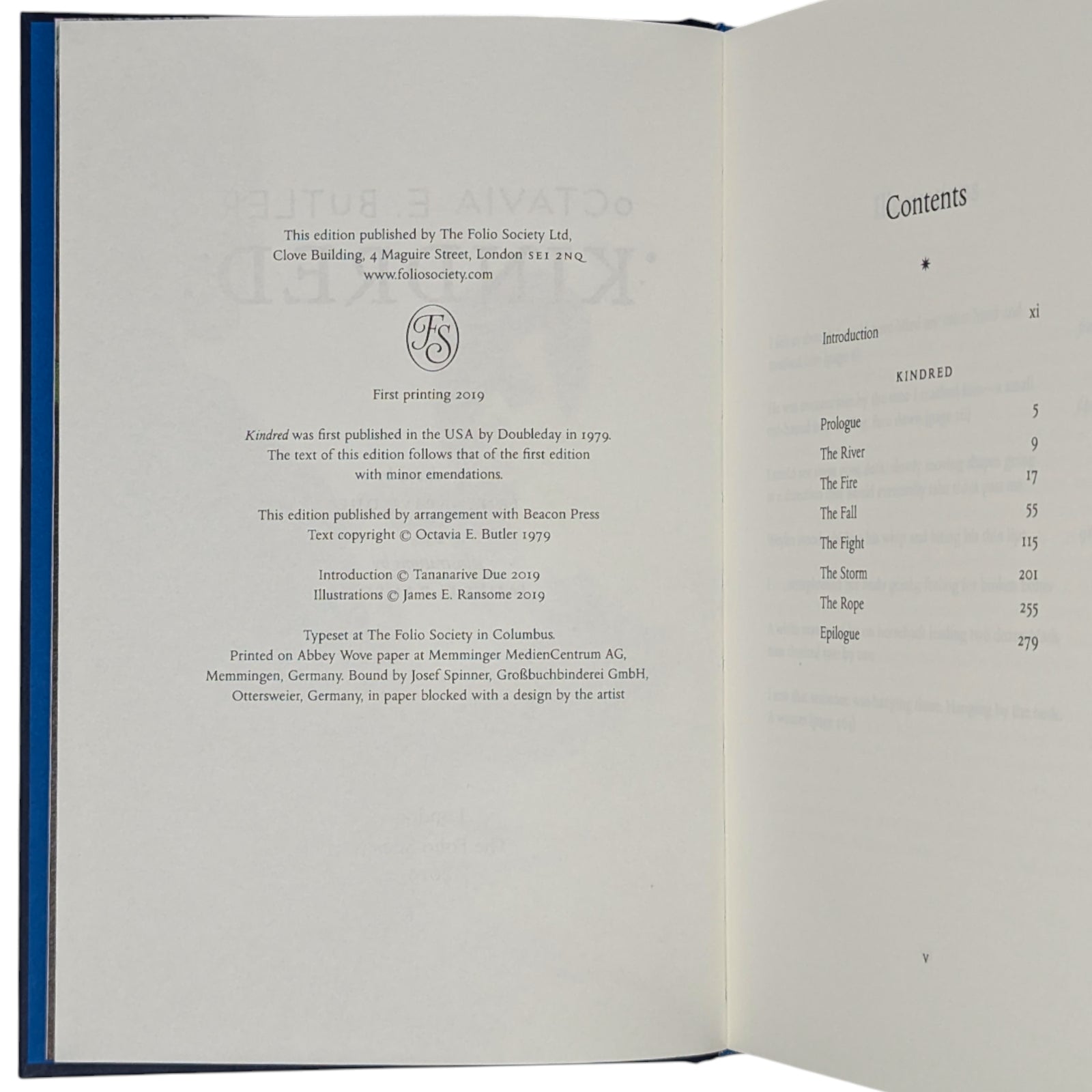 BUTLER, Octavia E. Kindred. London: The Folio Society, 2019. First printing thus. Introduced by Tananarive Due, illustrations by James E. Ransome. 239 × 164 × 27 mm. Pp. [i–iv] v–xiv, [1–4] 5–281 [282]: [8] leaves of colour plates (facing pp. [iii], 19, 34, 155, 235, 266 and between pp. 98–99). Type: Columbus. Printed by Memminger MedienCentrum. Bound by Josef Spinner in full dark blue paper blocked in silver and metallic blue with a design by Ransome; blue endleaves. Blue slip case printed with double image of a face. Ransome’s work was shortlisted in the 2020 V&A Illustration Awards.