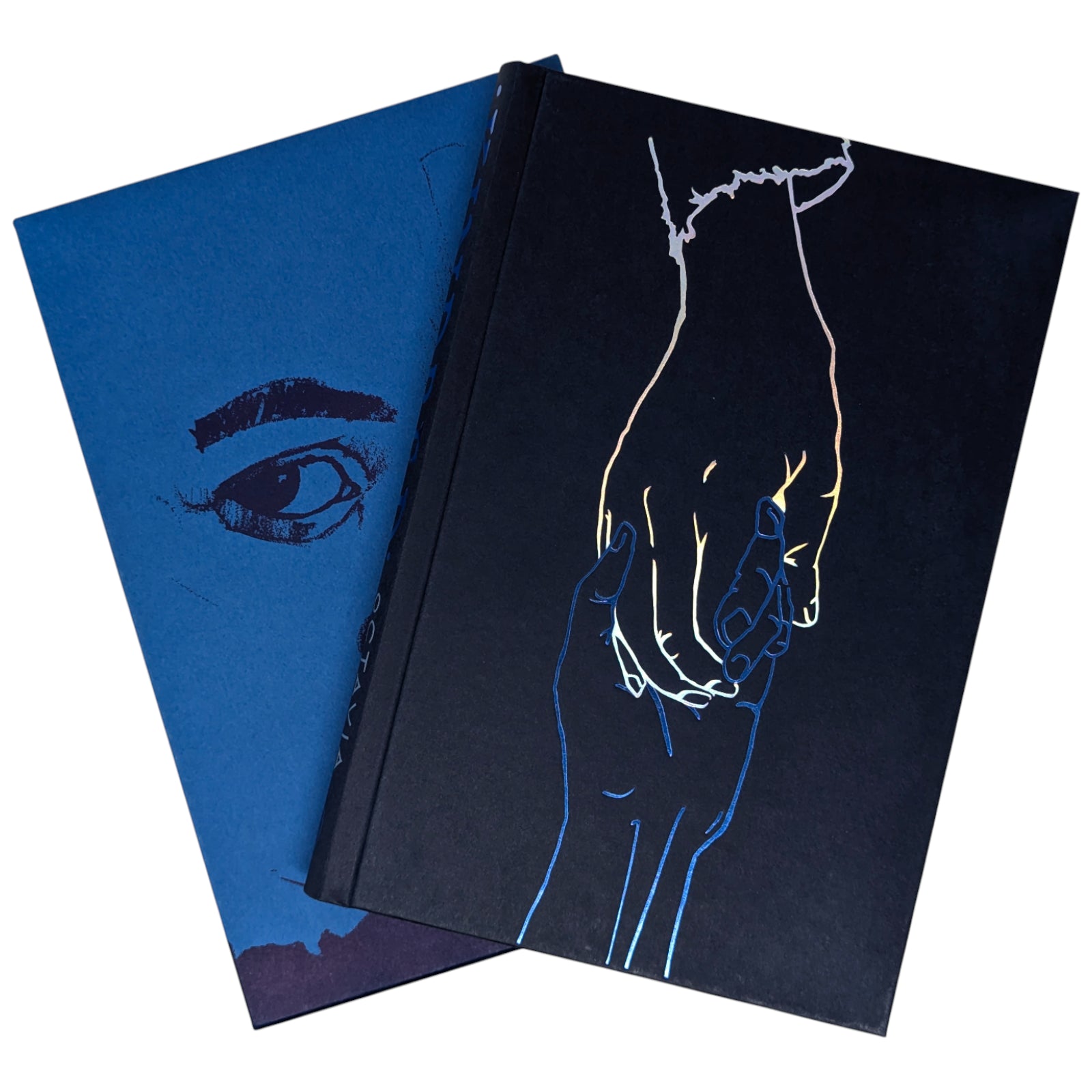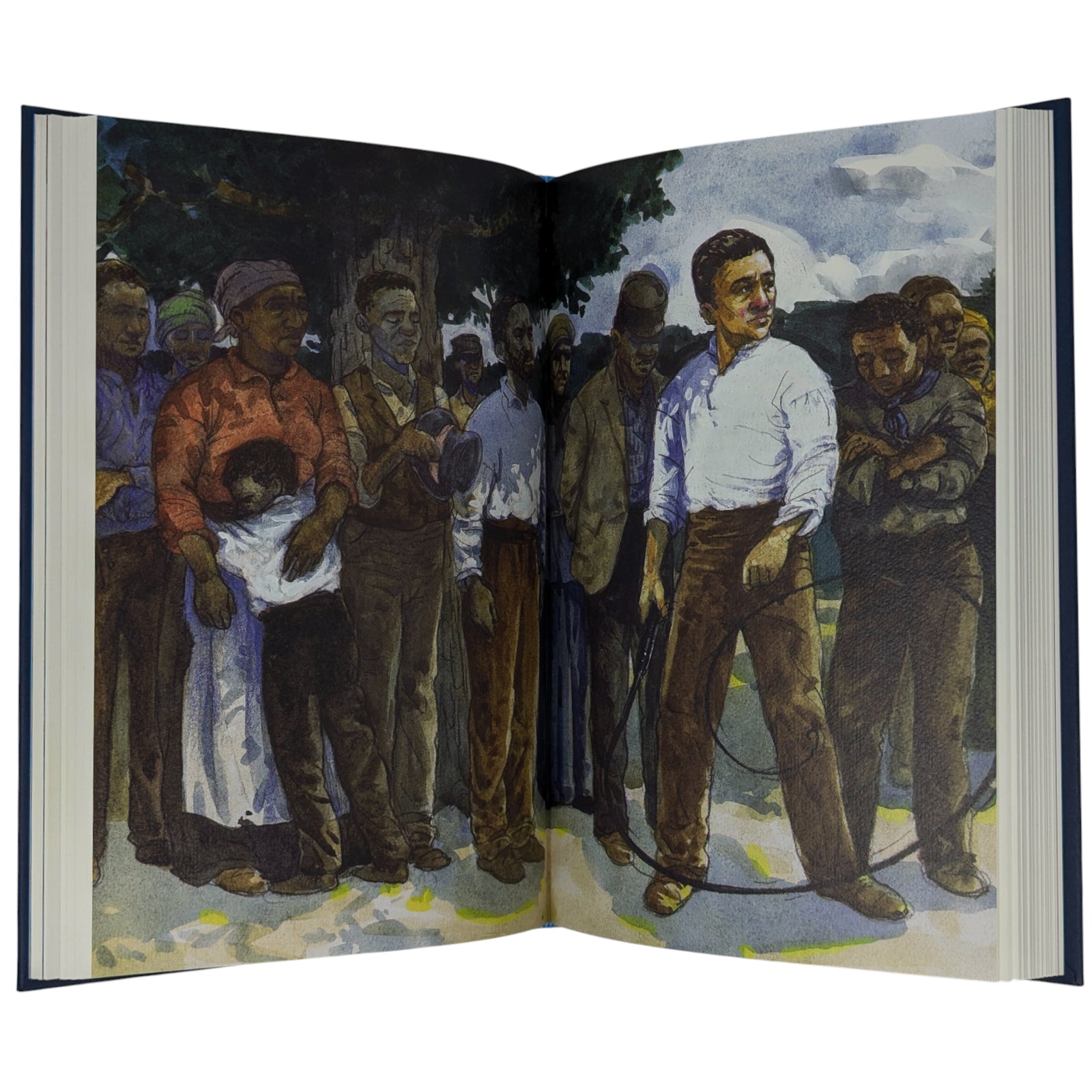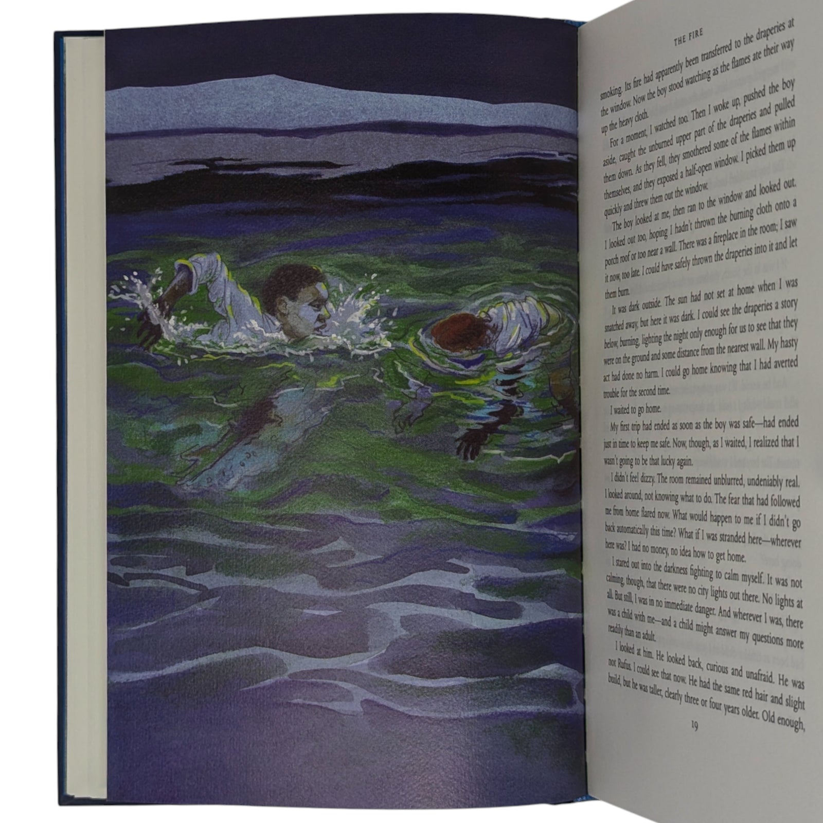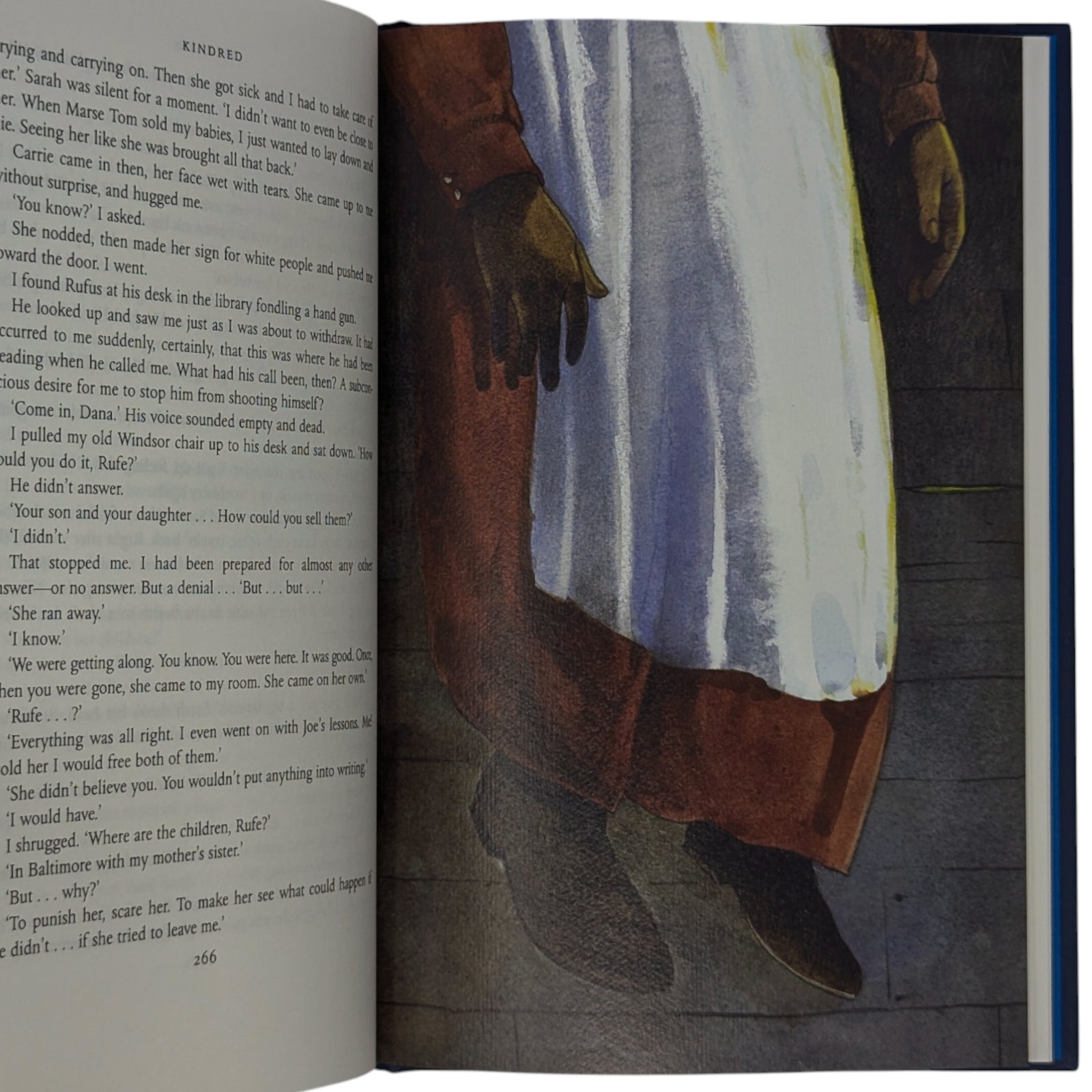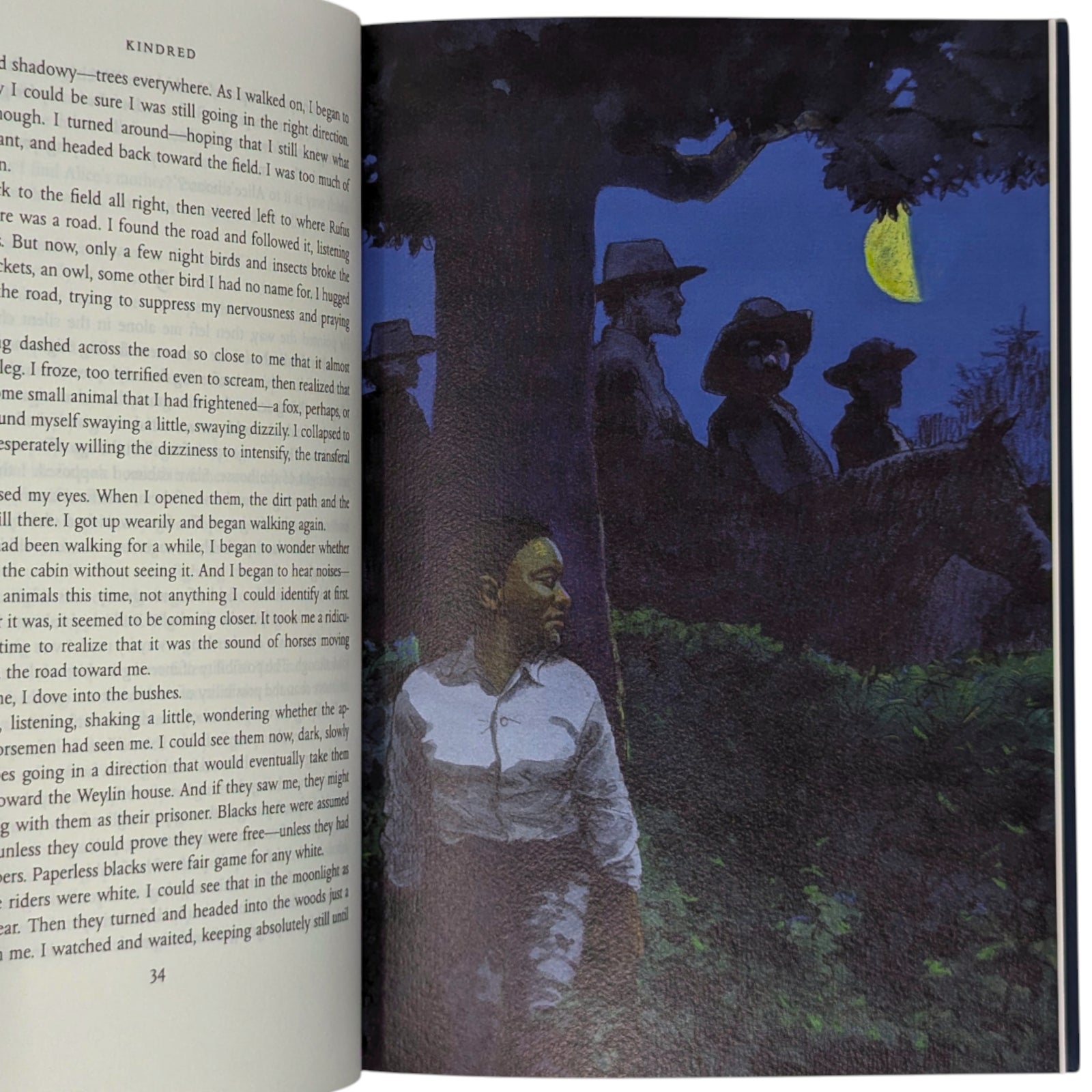 BUTLER, Octavia E. Kindred. London: The Folio Society, 2019. First printing thus. Introduced by Tananarive Due, illustrations by James E. Ransome. 239 × 164 × 27 mm. Pp. [i–iv] v–xiv, [1–4] 5–281 [282]: [8] leaves of colour plates (facing pp. [iii], 19, 34, 155, 235, 266 and between pp. 98–99). Type: Columbus. Printed by Memminger MedienCentrum. Bound by Josef Spinner in full dark blue paper blocked in silver and metallic blue with a design by Ransome; blue endleaves. Blue slip case printed with double image of a face. Ransome’s work was shortlisted in the 2020 V&A Illustration Awards.