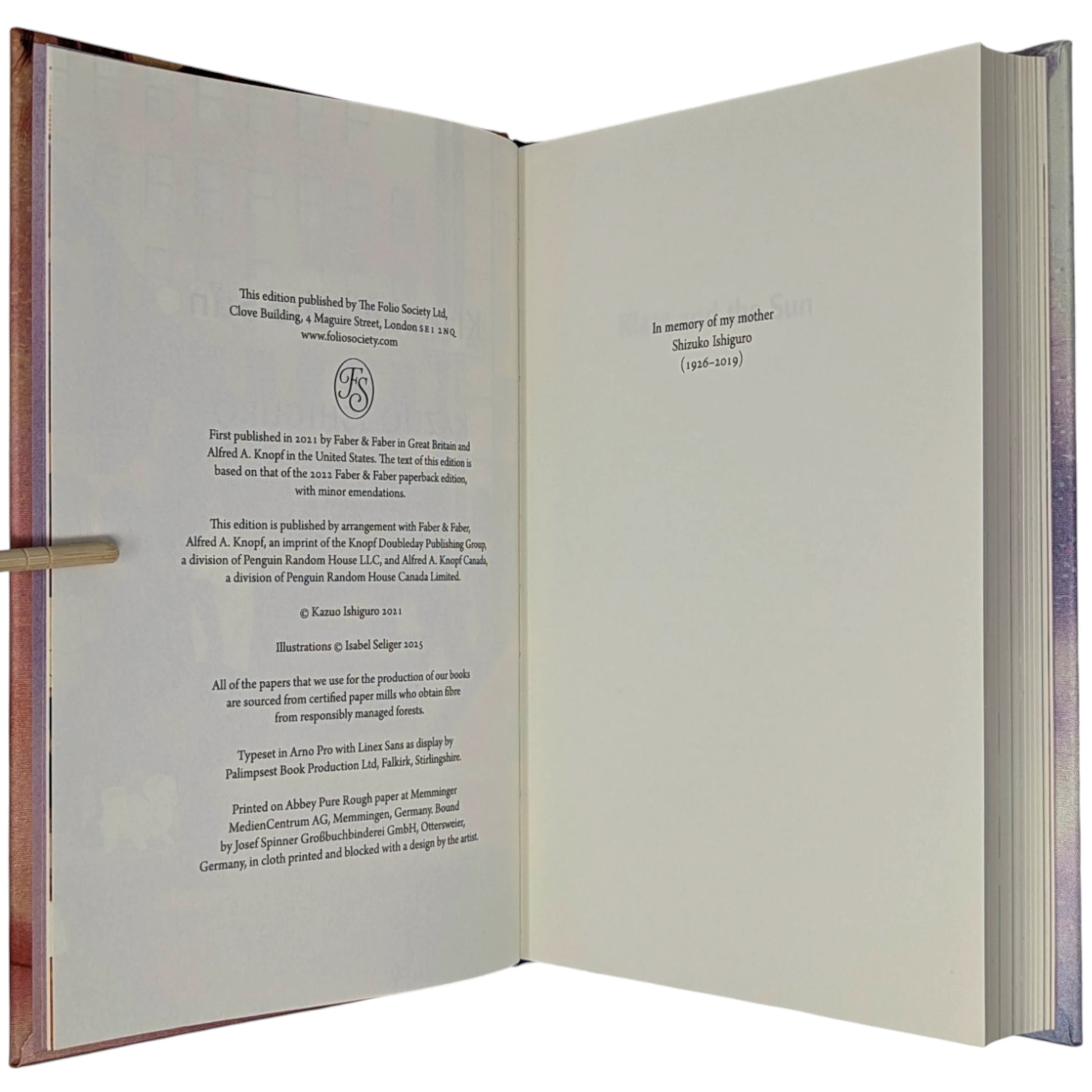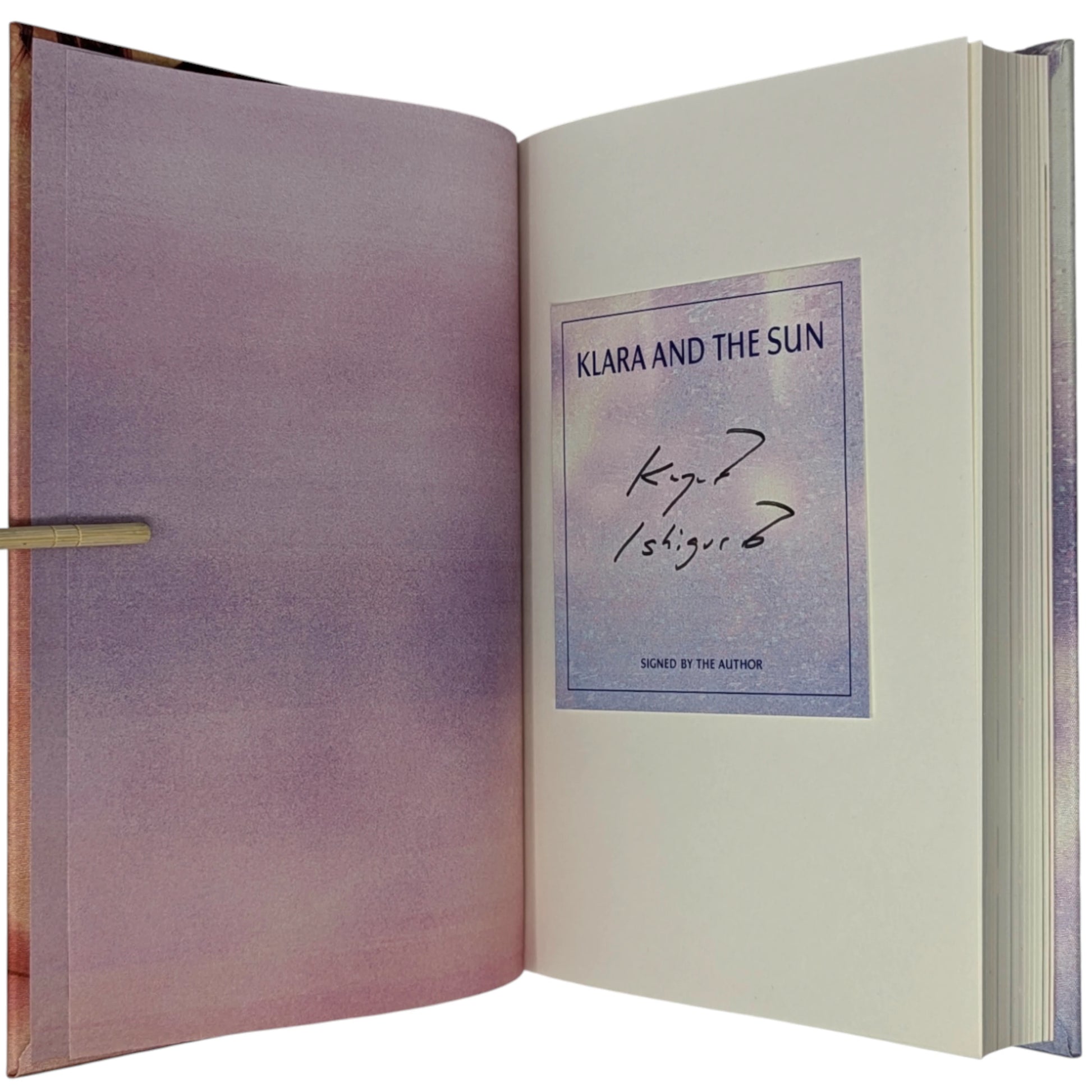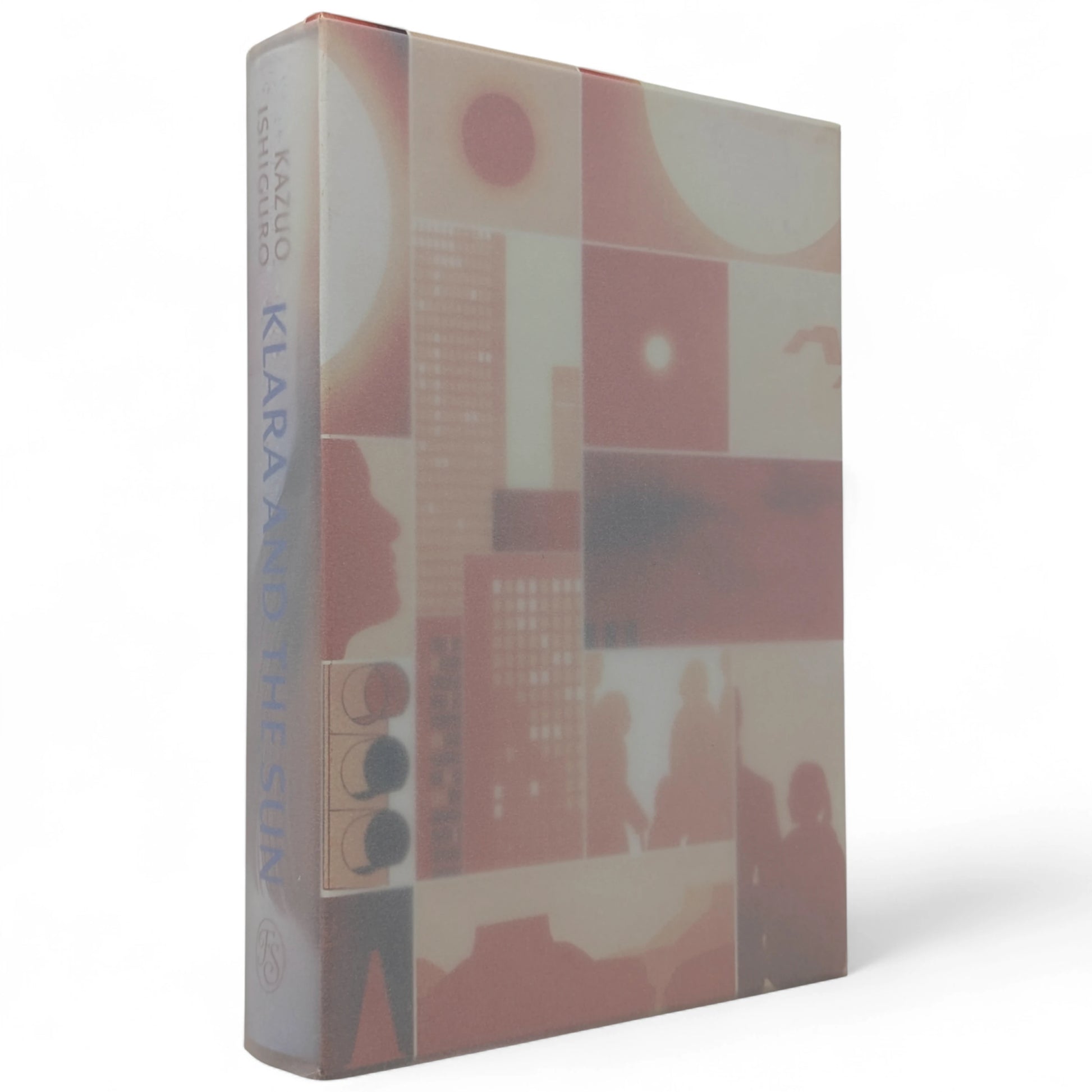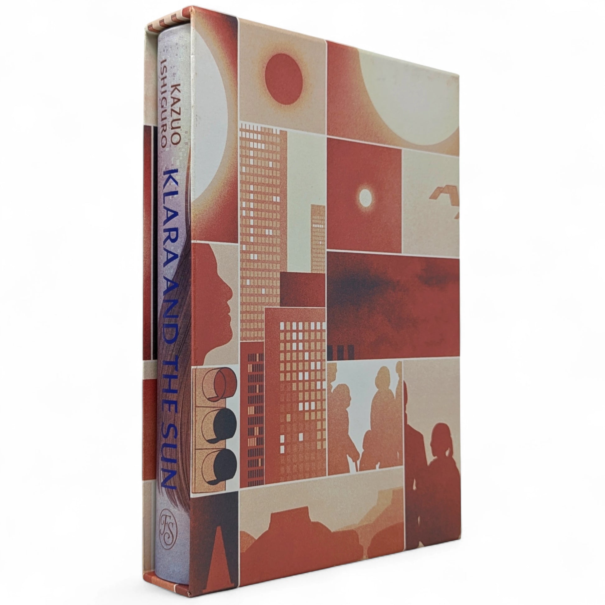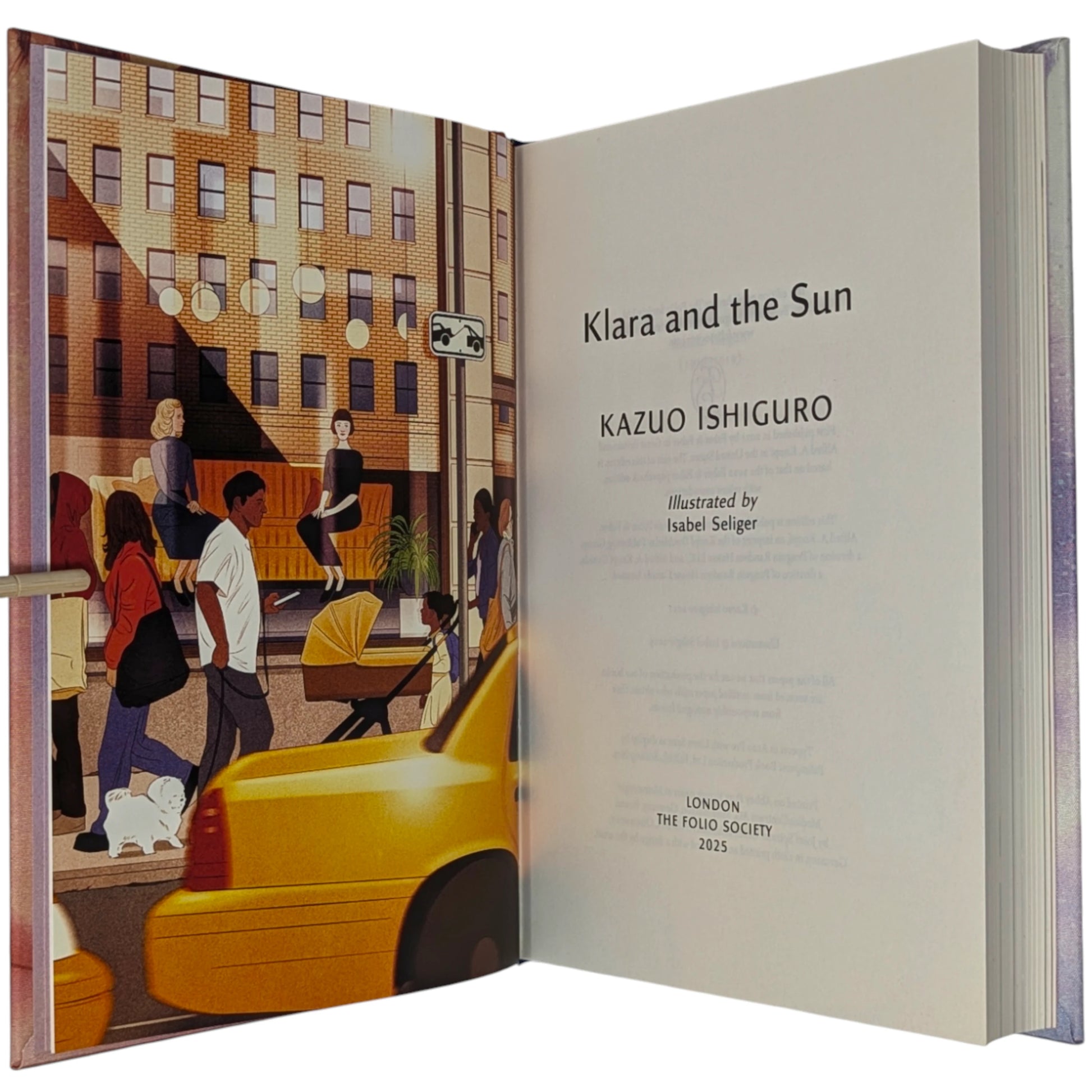 ISHIGURO, Kazuo. Klara and the Sun. London: The Folio Society, 2025. First printing thus. 288pp. 22.9x15.9cm. Bound in pixel-detailed colour picture printed and blocked cloth. Printed metallic paper endpapers in shades of pink and purple. Housed in a colour pattern printed metallic paper slipcase. With seven colour illustrations, including 2 double-page spreads by Isabel Seliger.