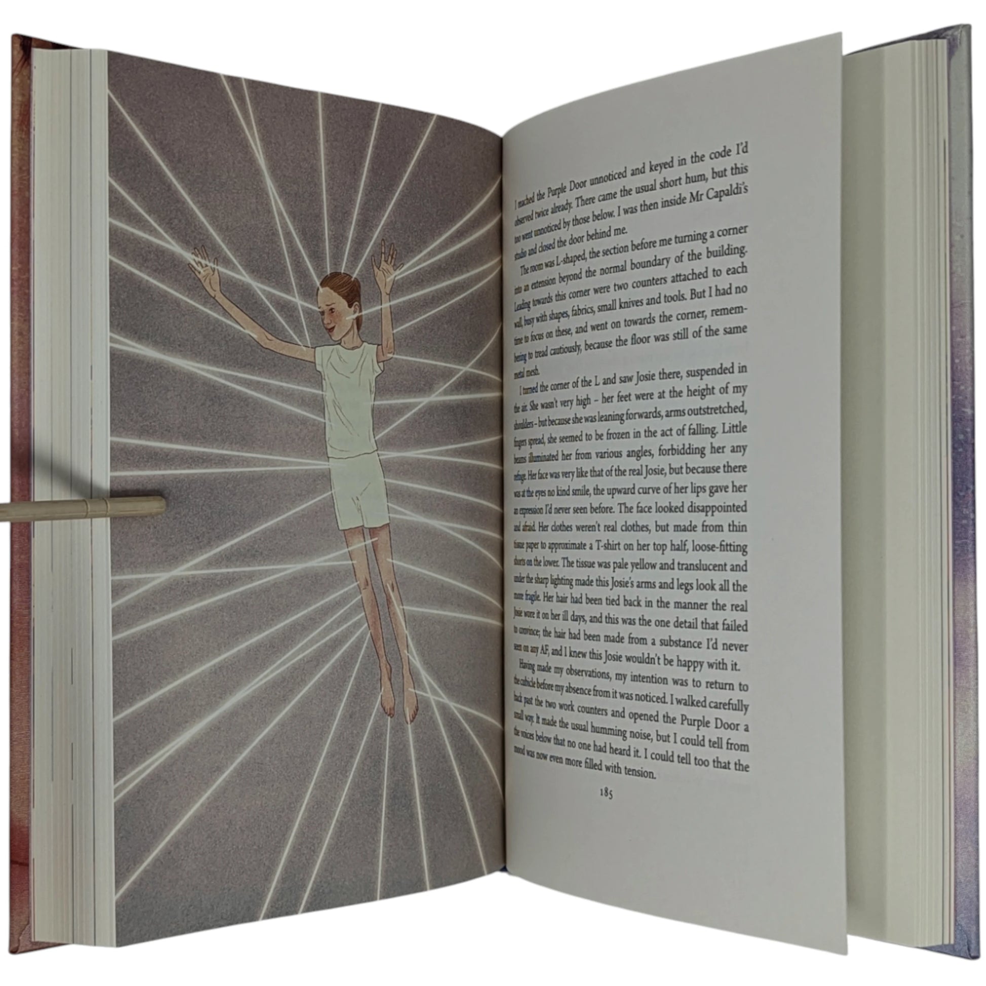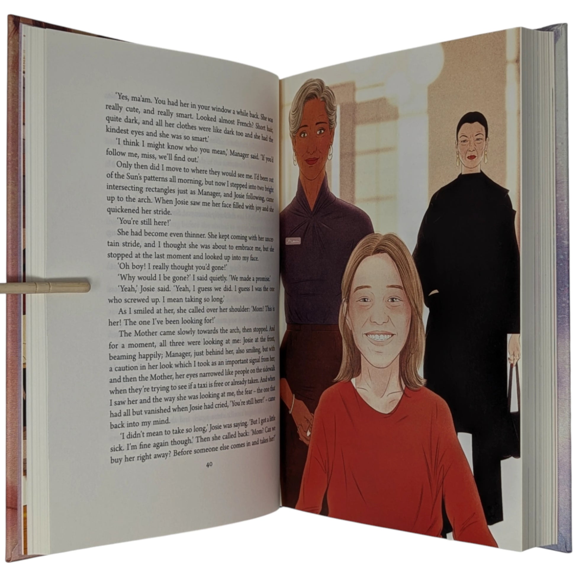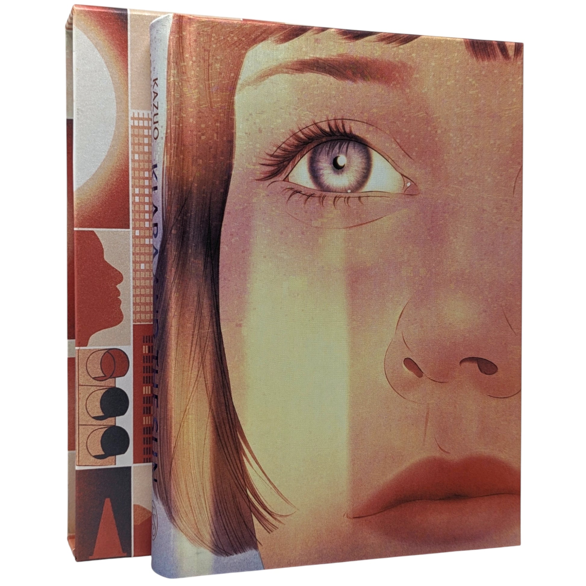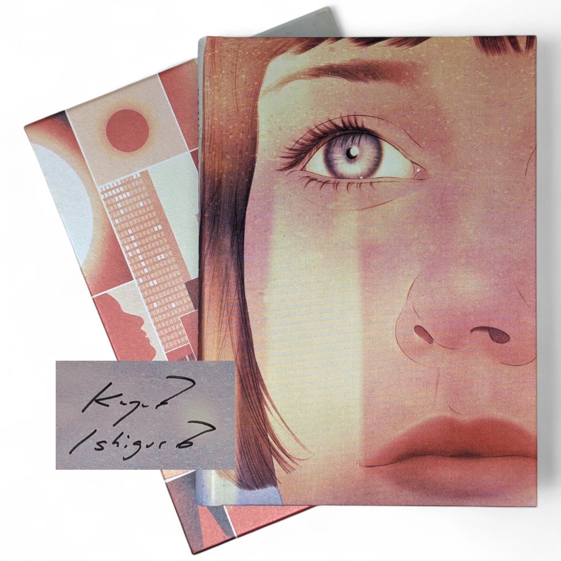 ISHIGURO, Kazuo. Klara and the Sun. London: The Folio Society, 2025. First printing thus. 288pp. 22.9x15.9cm. Bound in pixel-detailed colour picture printed and blocked cloth. Printed metallic paper endpapers in shades of pink and purple. Housed in a colour pattern printed metallic paper slipcase. With seven colour illustrations, including 2 double-page spreads by Isabel Seliger.