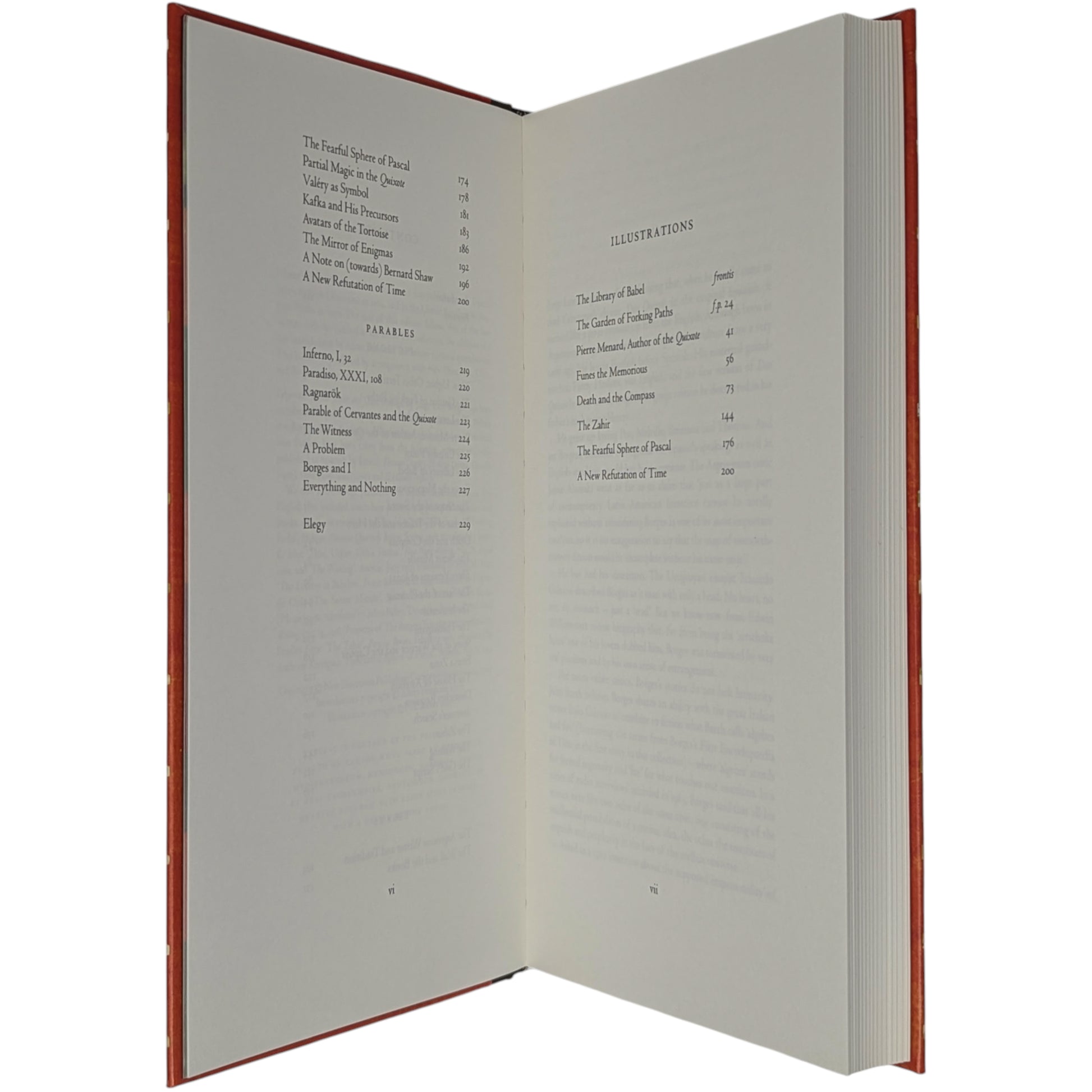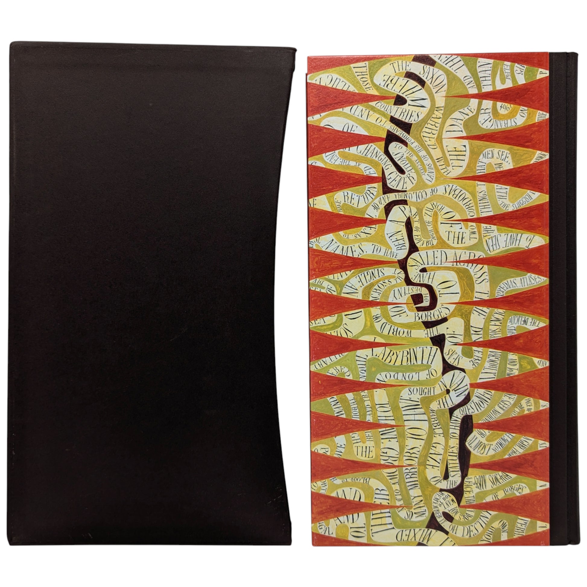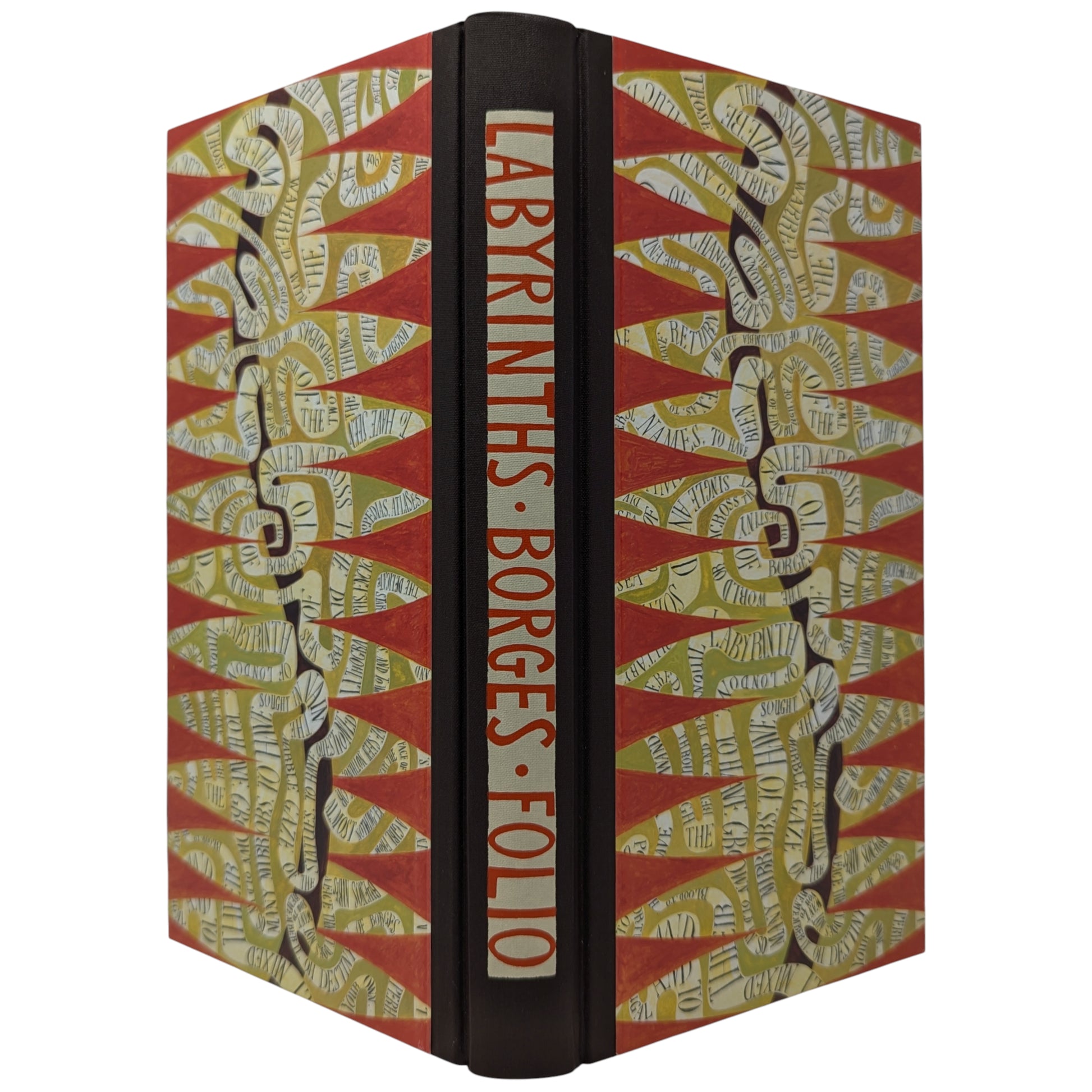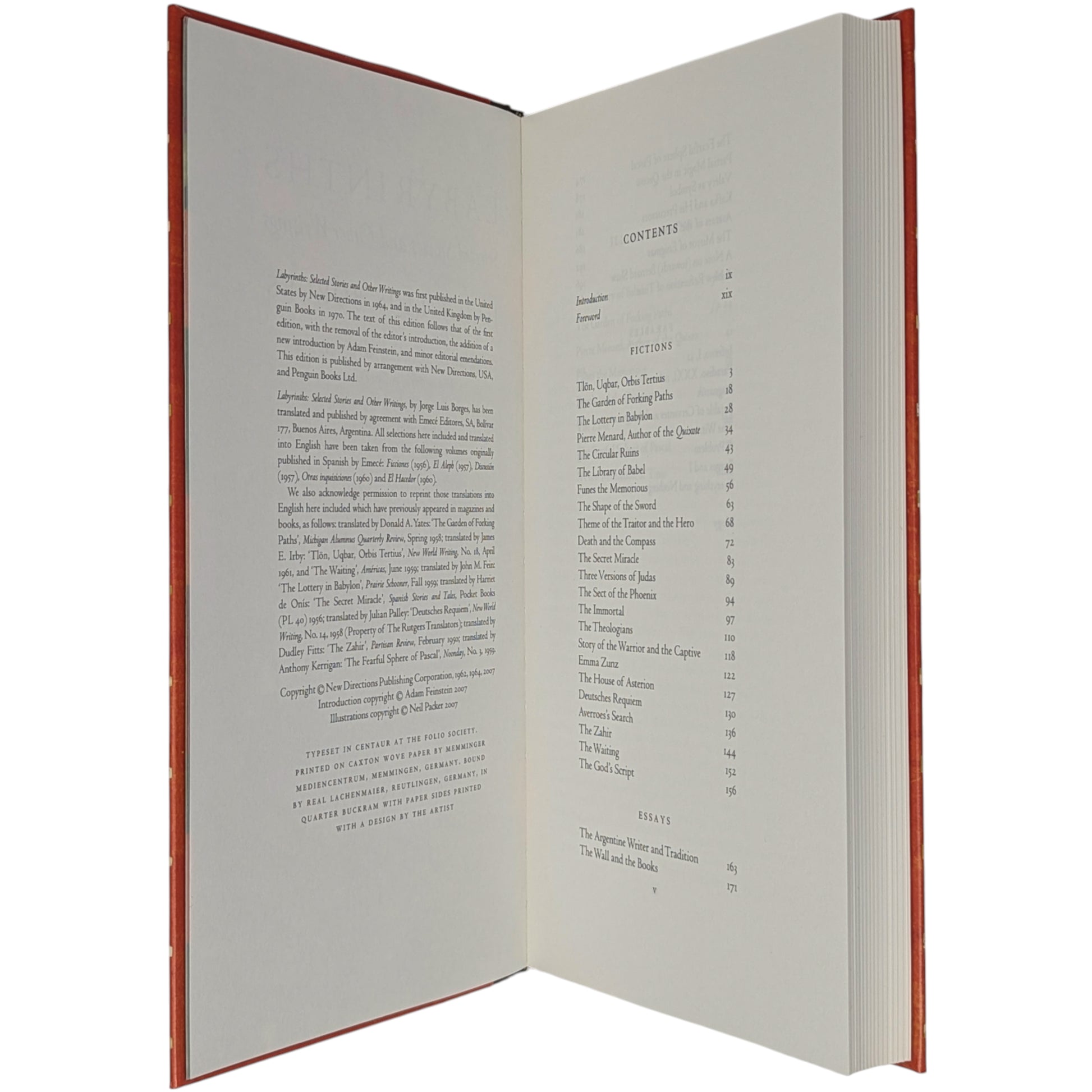 BORGES, Jorge Luis. Labyrinths, Selected Stories and Other Writings. London: The Folio Society, 2007. First printing thus. Edited by Donald A. Yates and James E. Irby, introduction by Adam Feinstein, foreword by André Maurois, illustrated by Neil Packer. 278 × 154 × 26 mm. Pp. [i–iv] v–xxiv, [1–2] 3–229 [230–232]: [8] leaves of colour plates (facing pp. [iii], 24, 41, 56, 73, 144, 176 and 200). Type: Centaur. Printed by Memminger MedienCentrum. Bound by Real Lachenmaier in quarter dark brown cloth with boards printed with design by Packer; dark brown endleaves. Dark brown slip case. A transparent plastic coated paper guard leaf is inserted between the frontispiece and title-page.