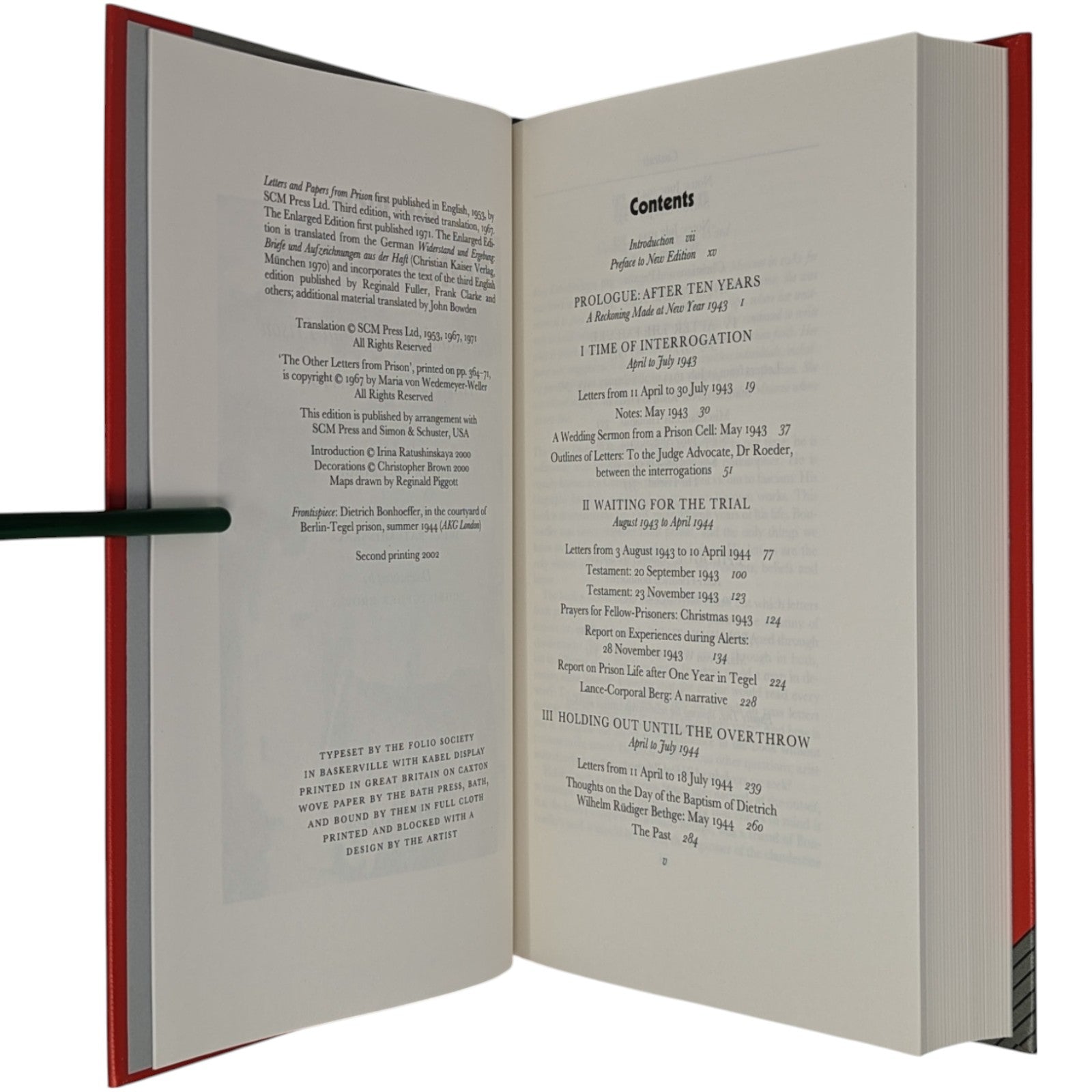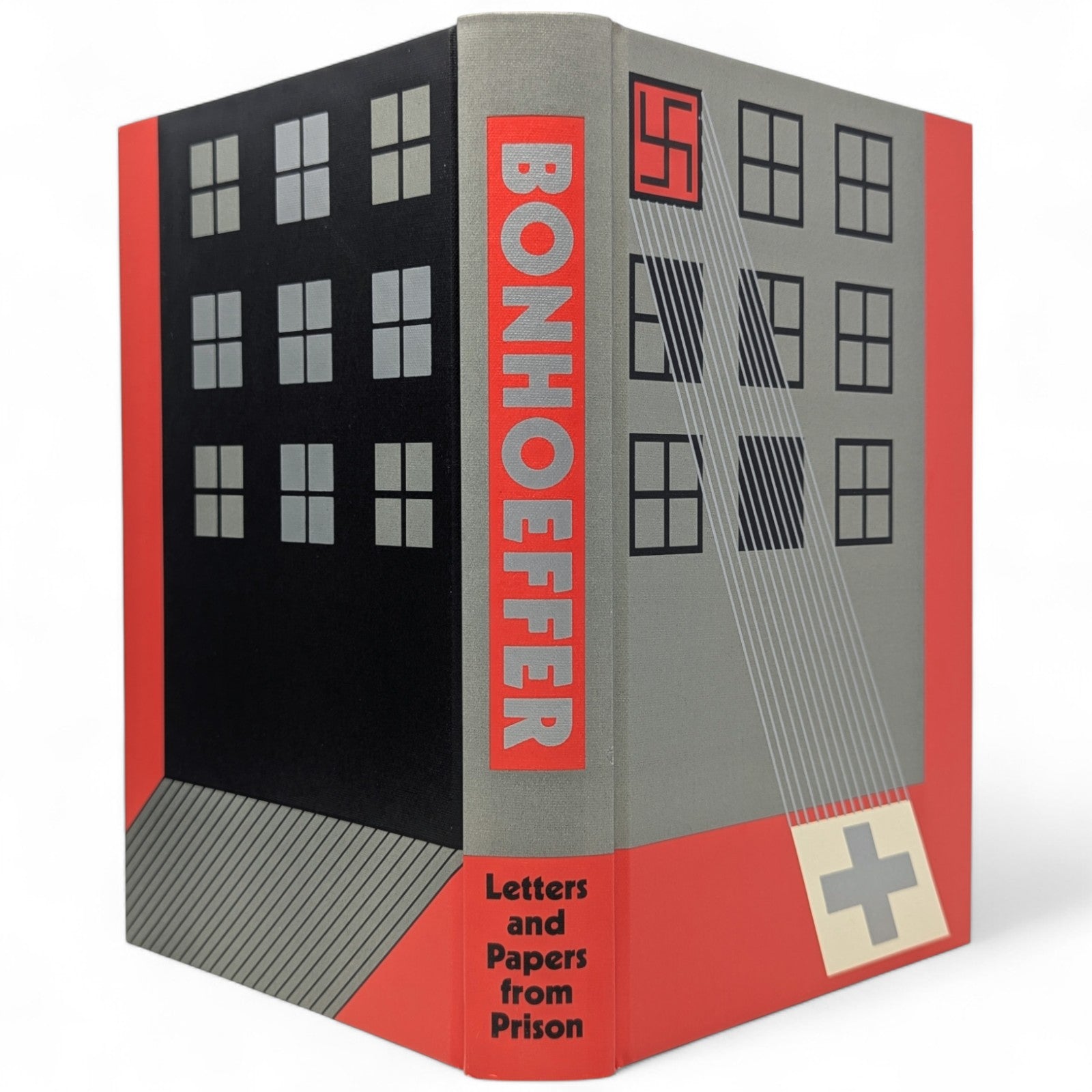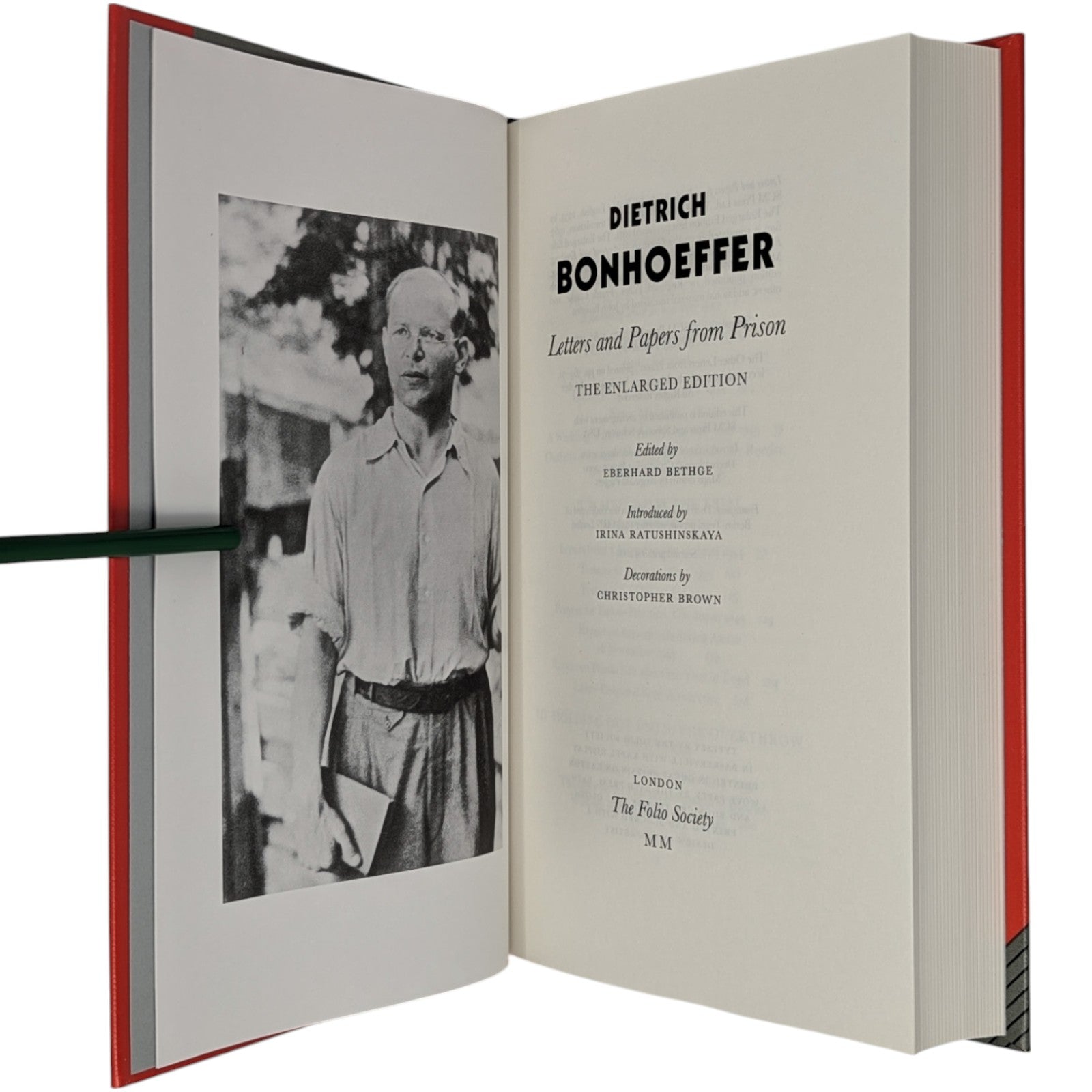 Dietrich Bonhoeffer, Letters and Papers from Prison. London: The Folio Society, 2000. Second printing thus, 2002. The enlarged edition, edited by Eberhard Bethge, introduced by Irina Ratushinskaya, decorations by Christopher Brown. Map by Reginald Piggott. 252 × 162 × 35 mm. Pp. [i–iv] v–xviii, [1–2] 3–410 [411–414]. Type: Baskerville with Kabel for display. Printed and bound by the Bath Press. Full white artificial cloth with a design in black, silver, red and white by Brown; silver endleaves. Grey slip case. The documents cover the period April 1943–June 1945. Brown’s decorations appear on the divisional-title to each section of the text.