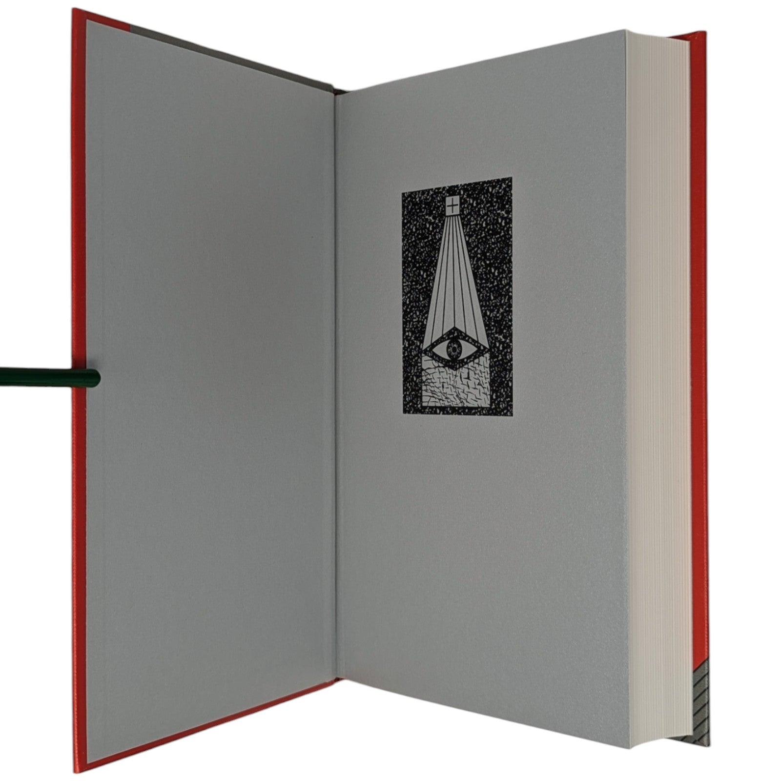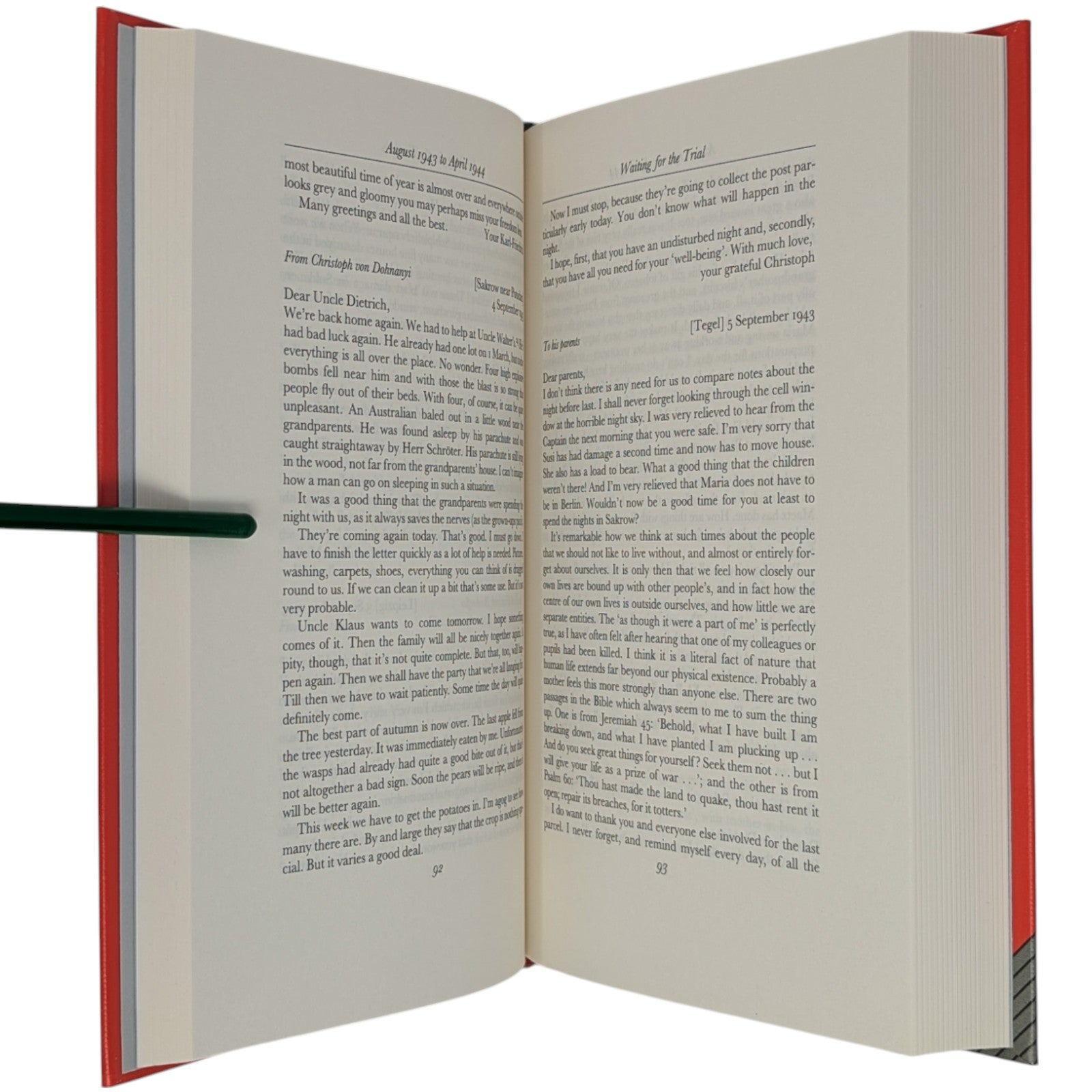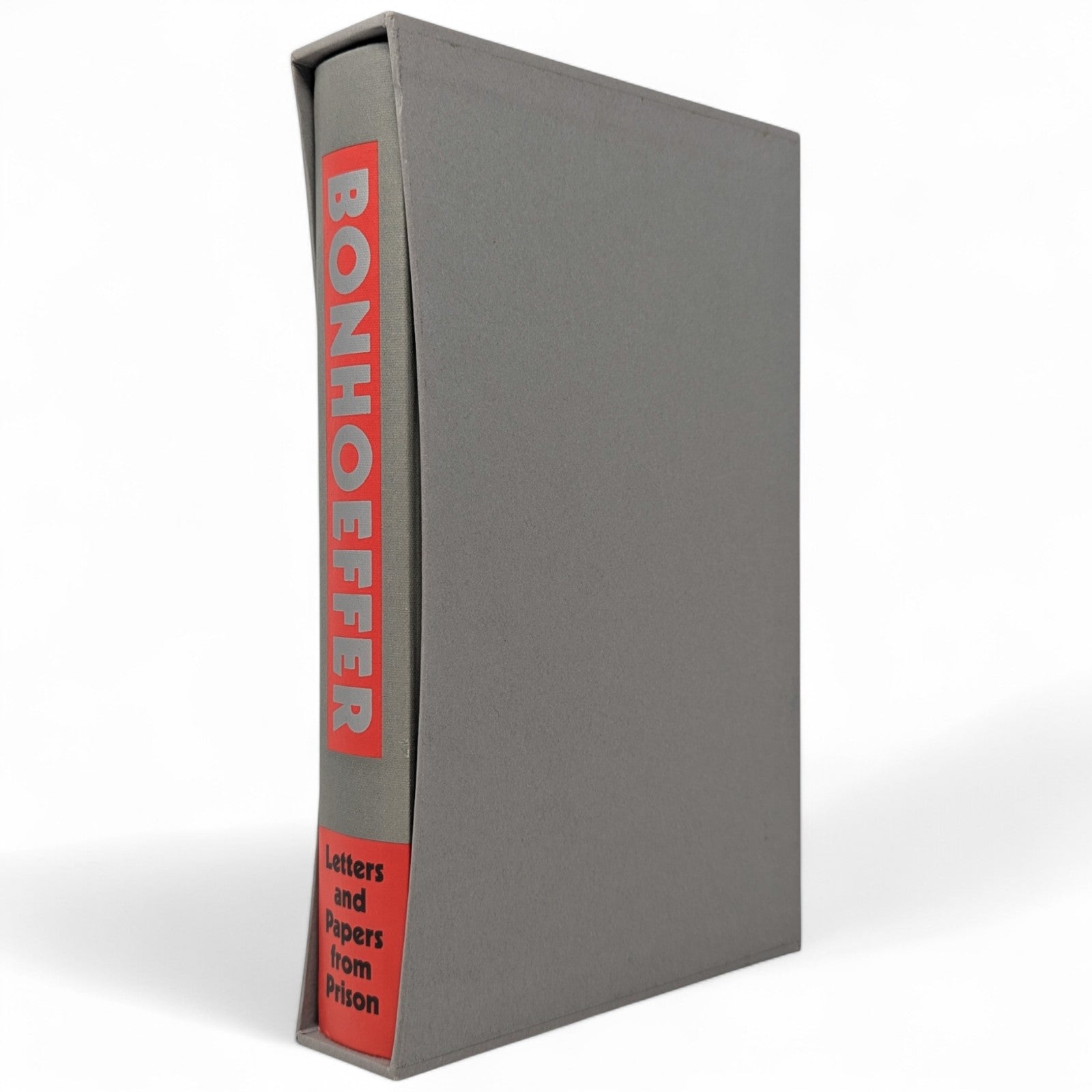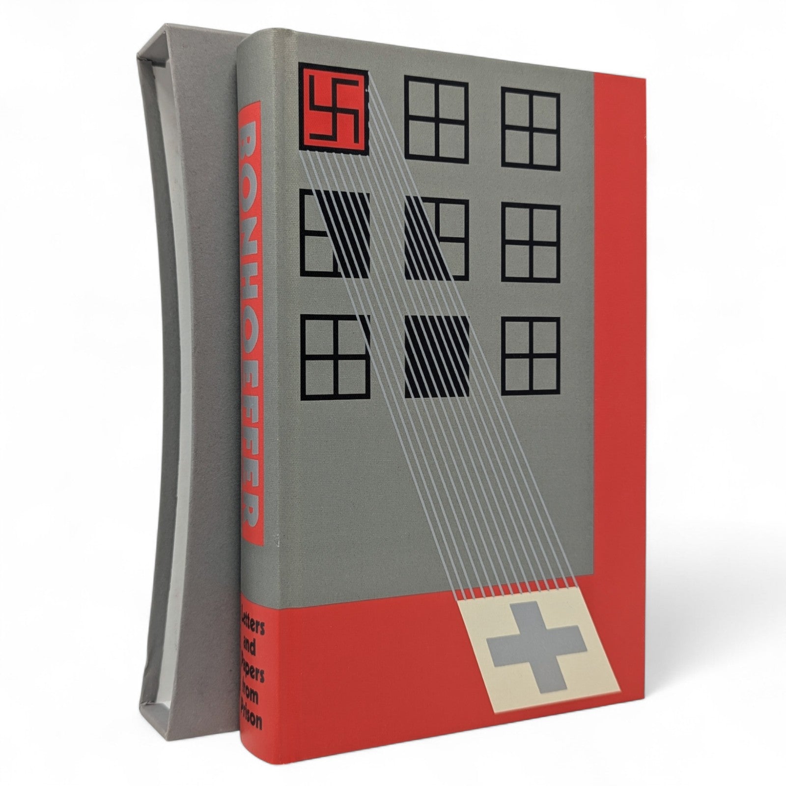 Dietrich Bonhoeffer, Letters and Papers from Prison. London: The Folio Society, 2000. Second printing thus, 2002. The enlarged edition, edited by Eberhard Bethge, introduced by Irina Ratushinskaya, decorations by Christopher Brown. Map by Reginald Piggott. 252 × 162 × 35 mm. Pp. [i–iv] v–xviii, [1–2] 3–410 [411–414]. Type: Baskerville with Kabel for display. Printed and bound by the Bath Press. Full white artificial cloth with a design in black, silver, red and white by Brown; silver endleaves. Grey slip case. The documents cover the period April 1943–June 1945. Brown’s decorations appear on the divisional-title to each section of the text.