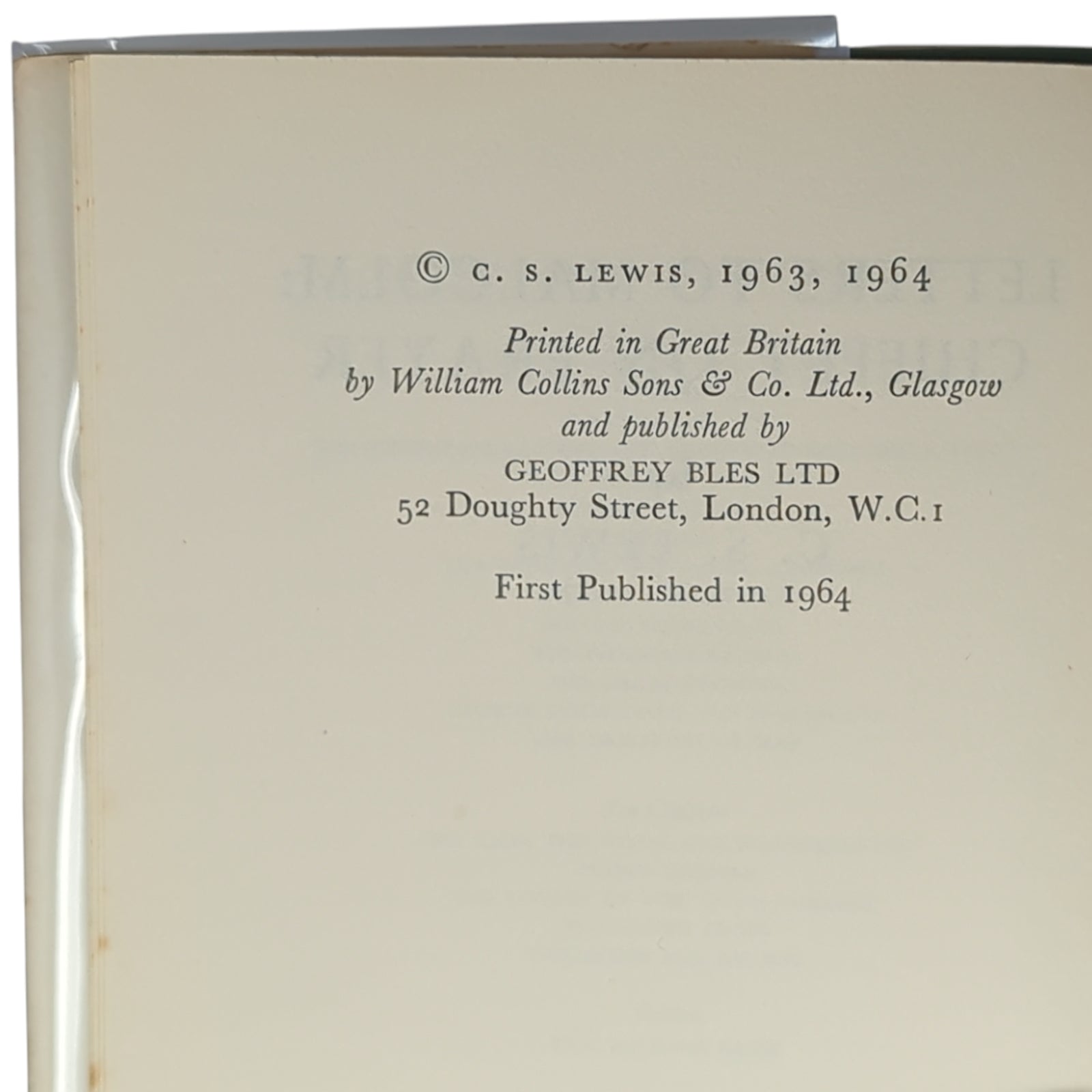 LEWIS, C. S. Letters to Malcolm: Chiefly on Prayer. London: Geoffrey Bles, 1964. First edition, first printing. Publisher's green binding, gilt titles to spine, plain endpapers; in price-clipped dust wrapper.